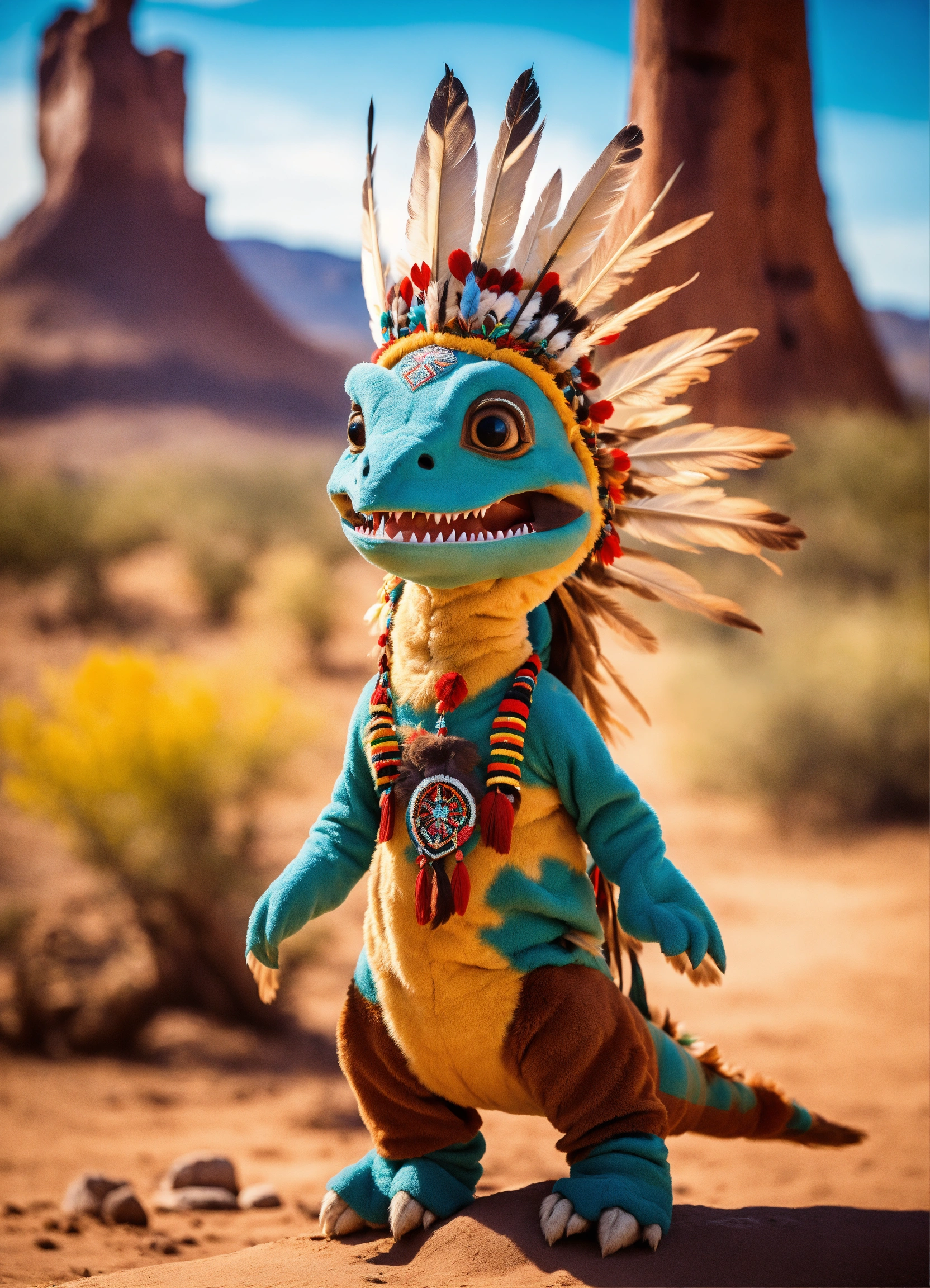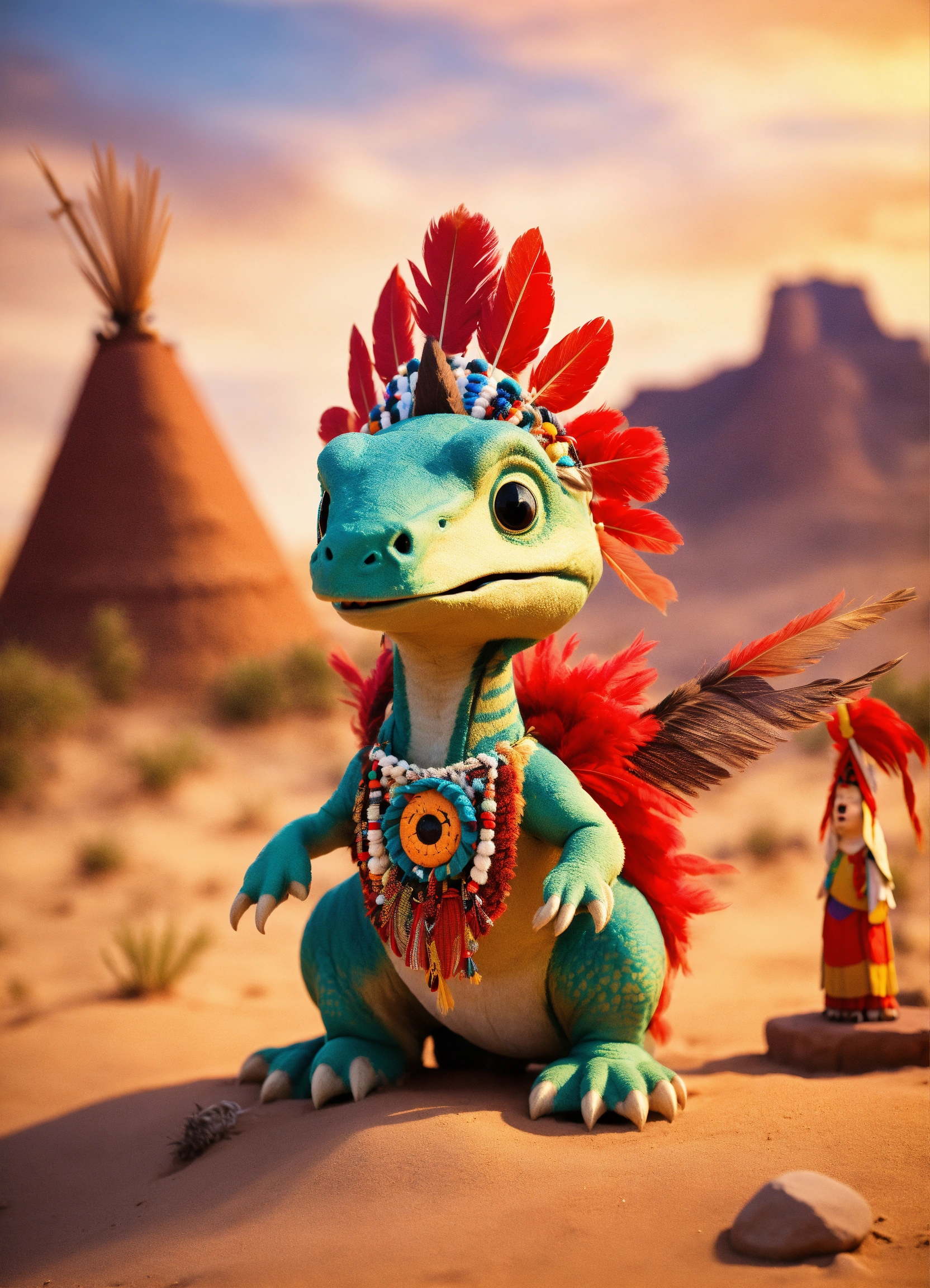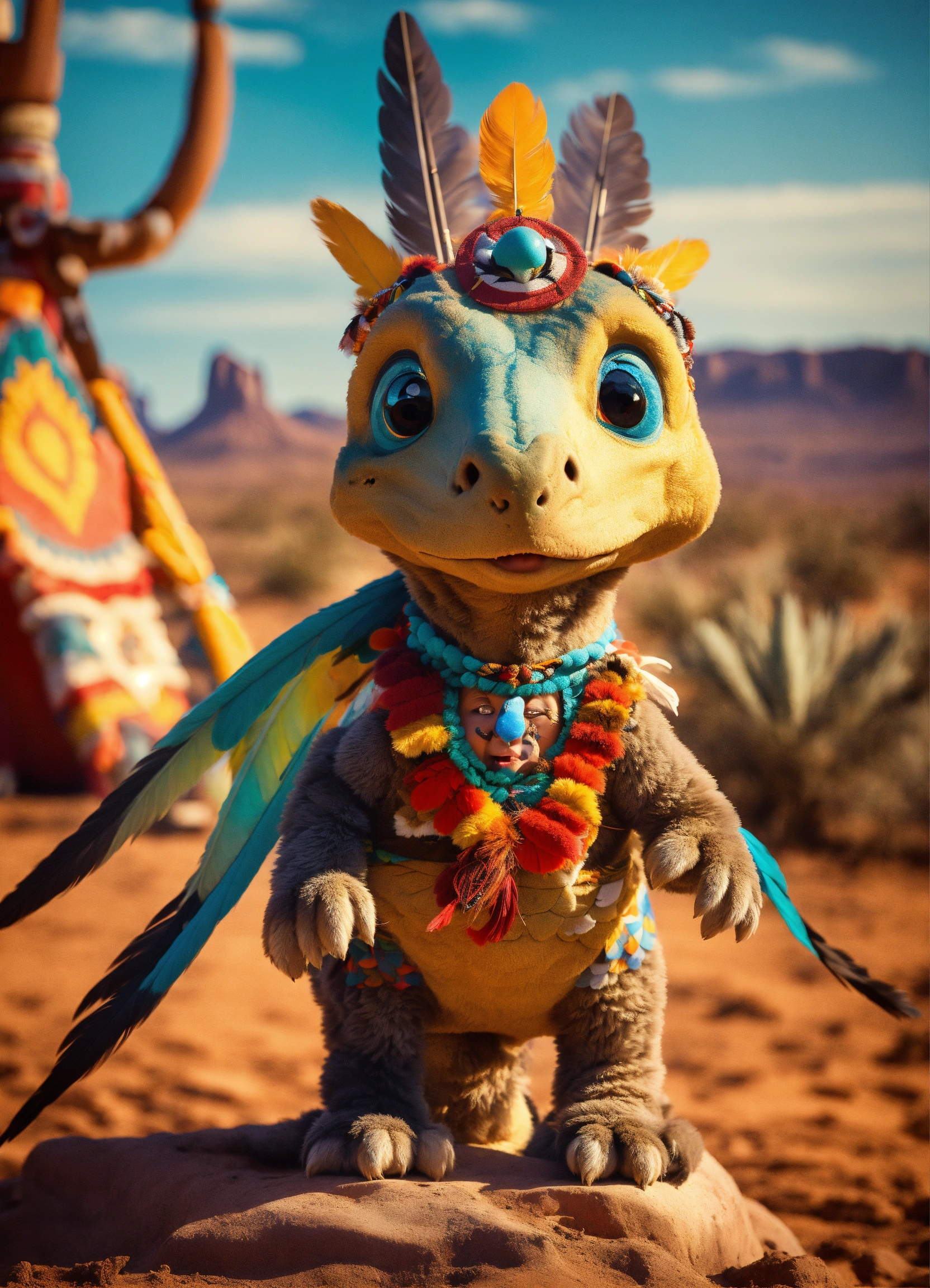 An adorable and fluffy baby dinosaur with big color eyes and indiana clothes next to a totem pole, with soft feathers and wings flying, roaring screaming, camp fire, indian dress, native american theme, teepee and totem pole, bow and arrow and big indian headdress, desert, monument valley, with blur background, high quality, 8k