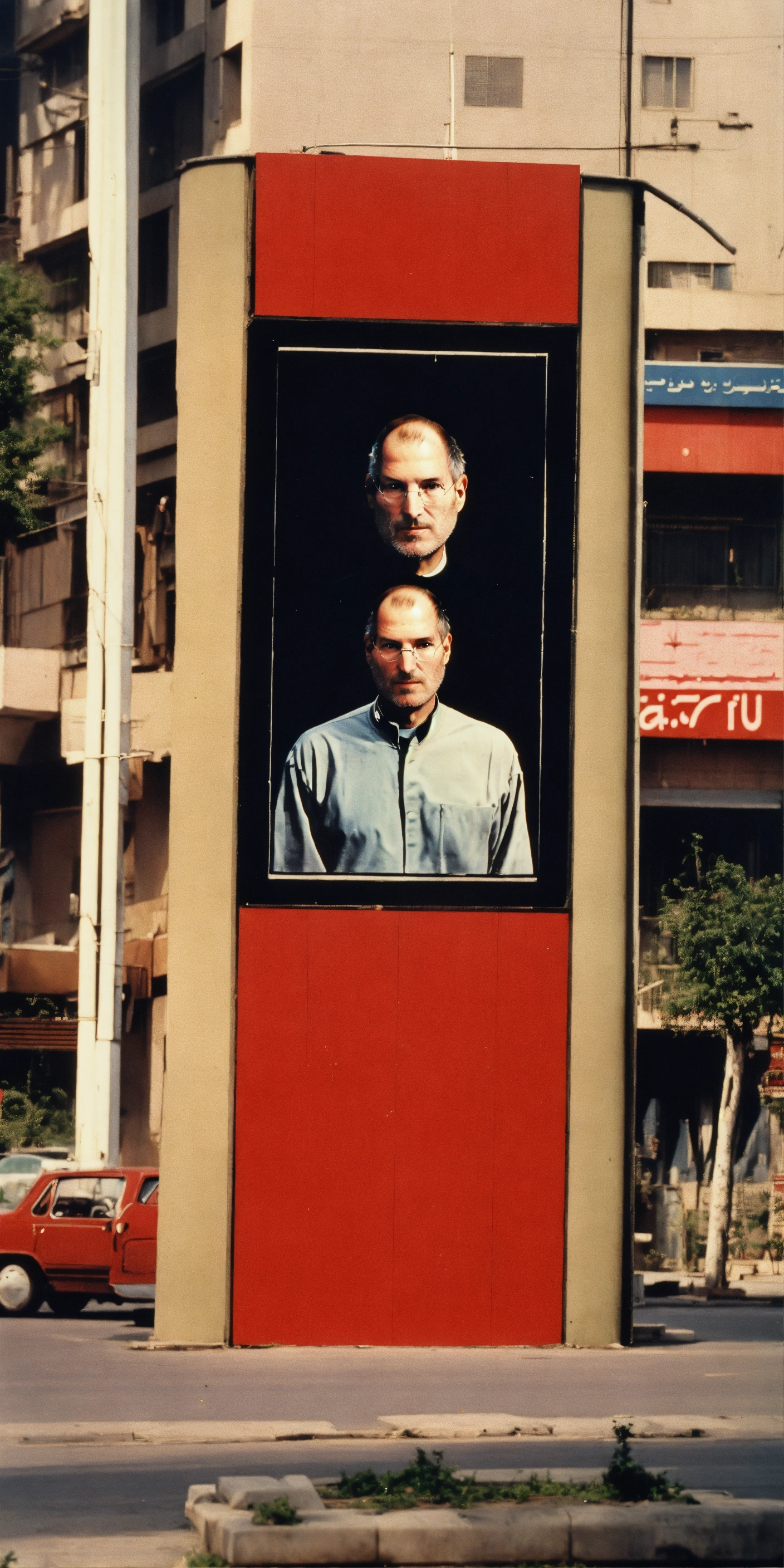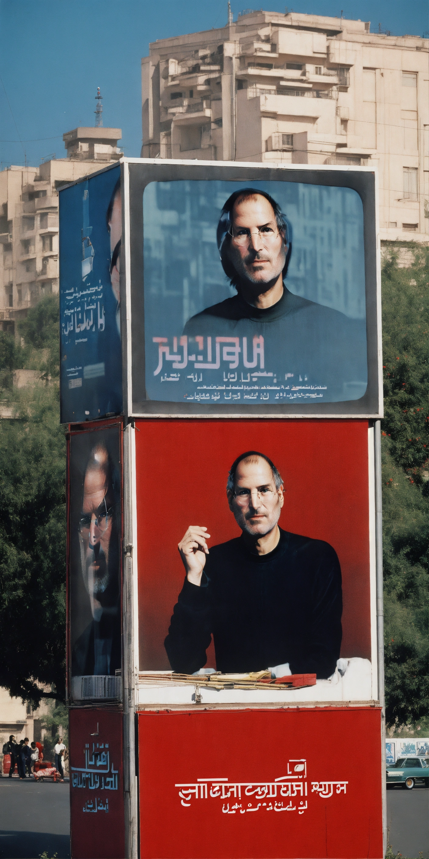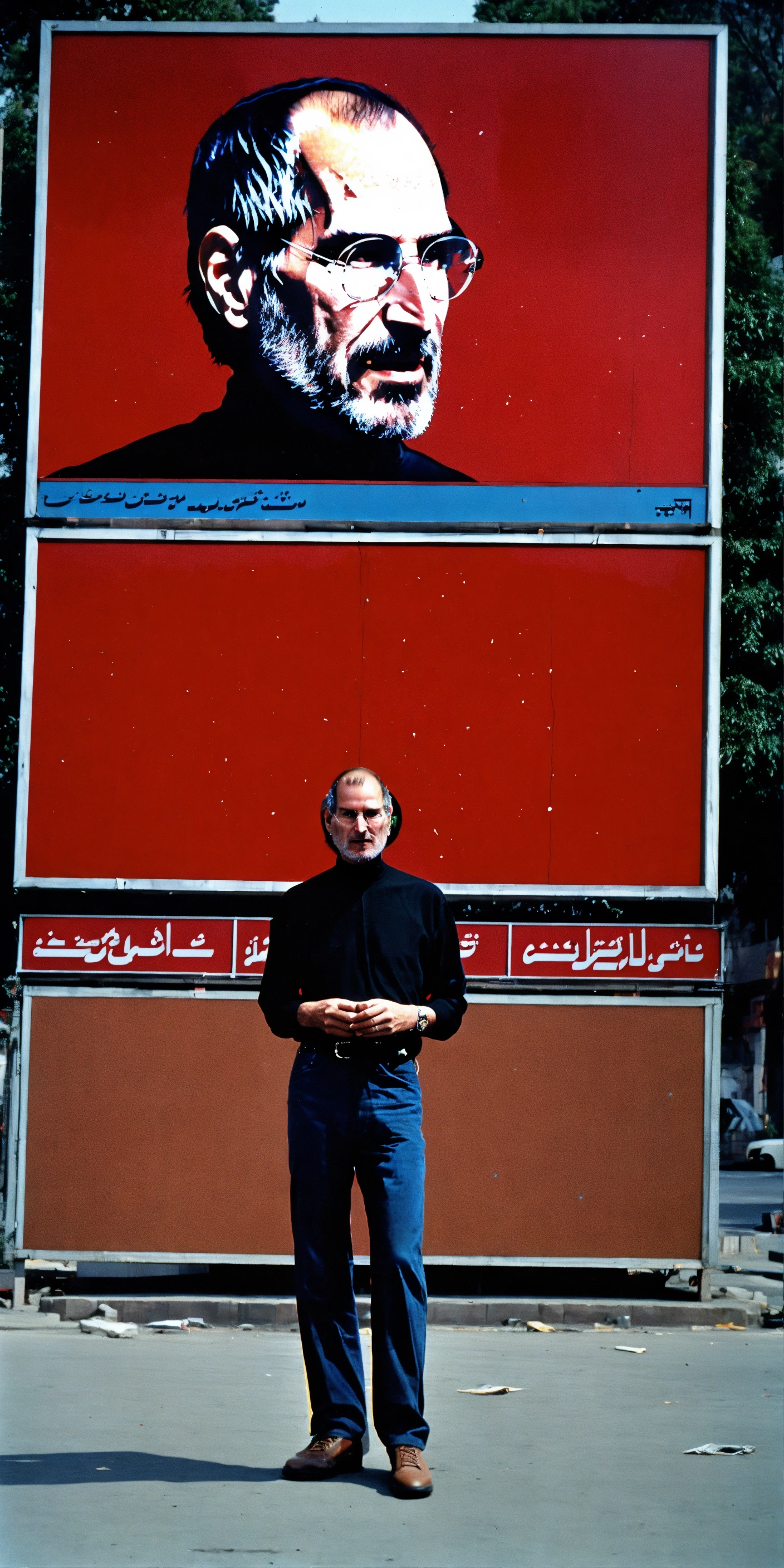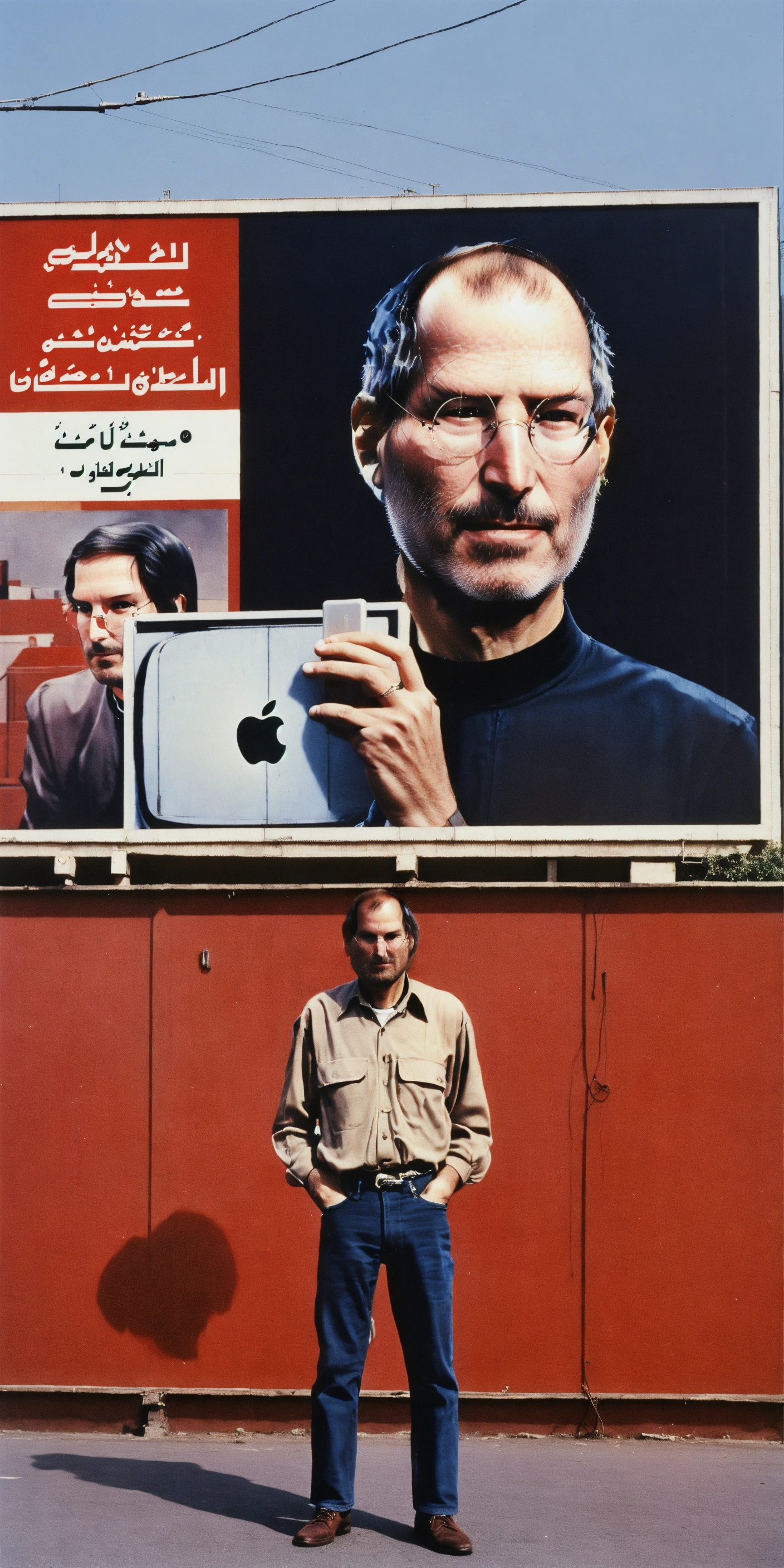 Steve jobs in tehran in the 1980s next to a empty red billboards 4k realistic