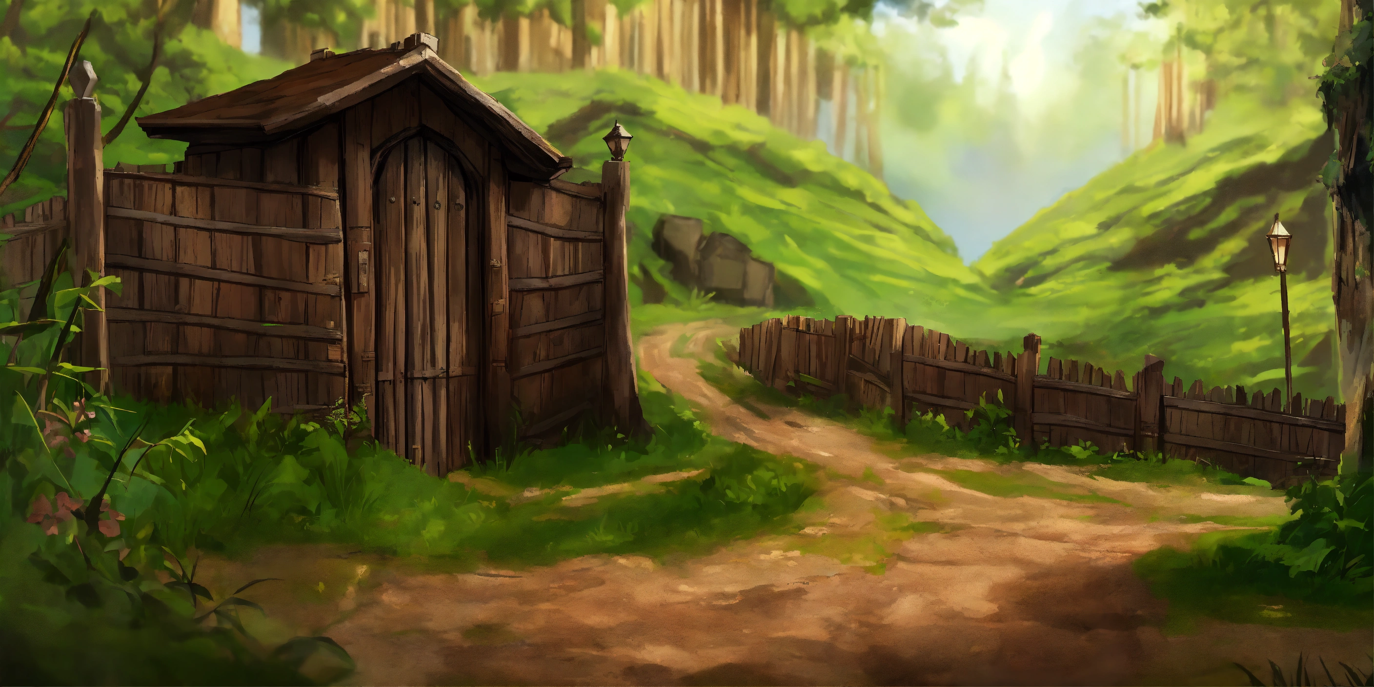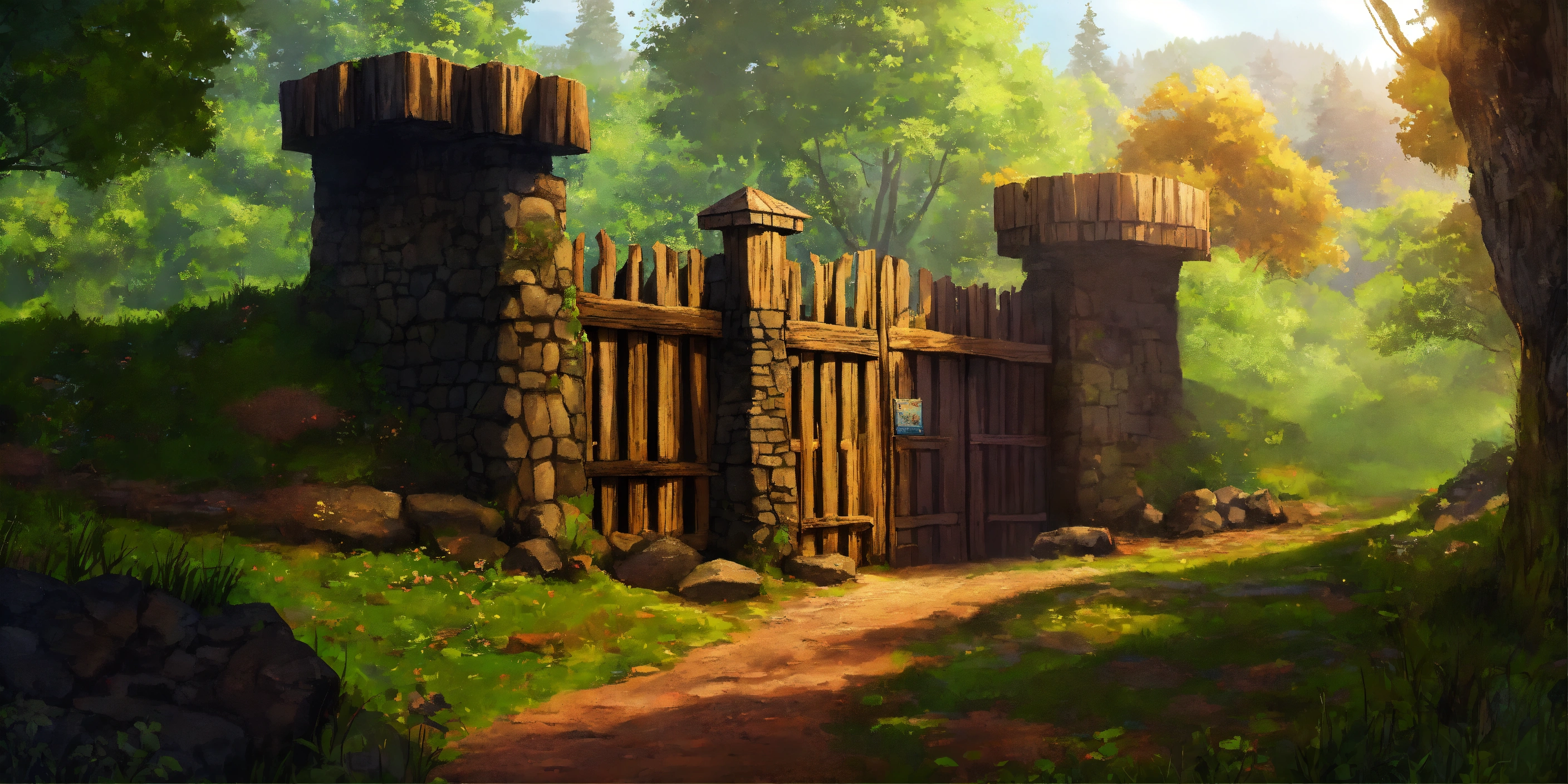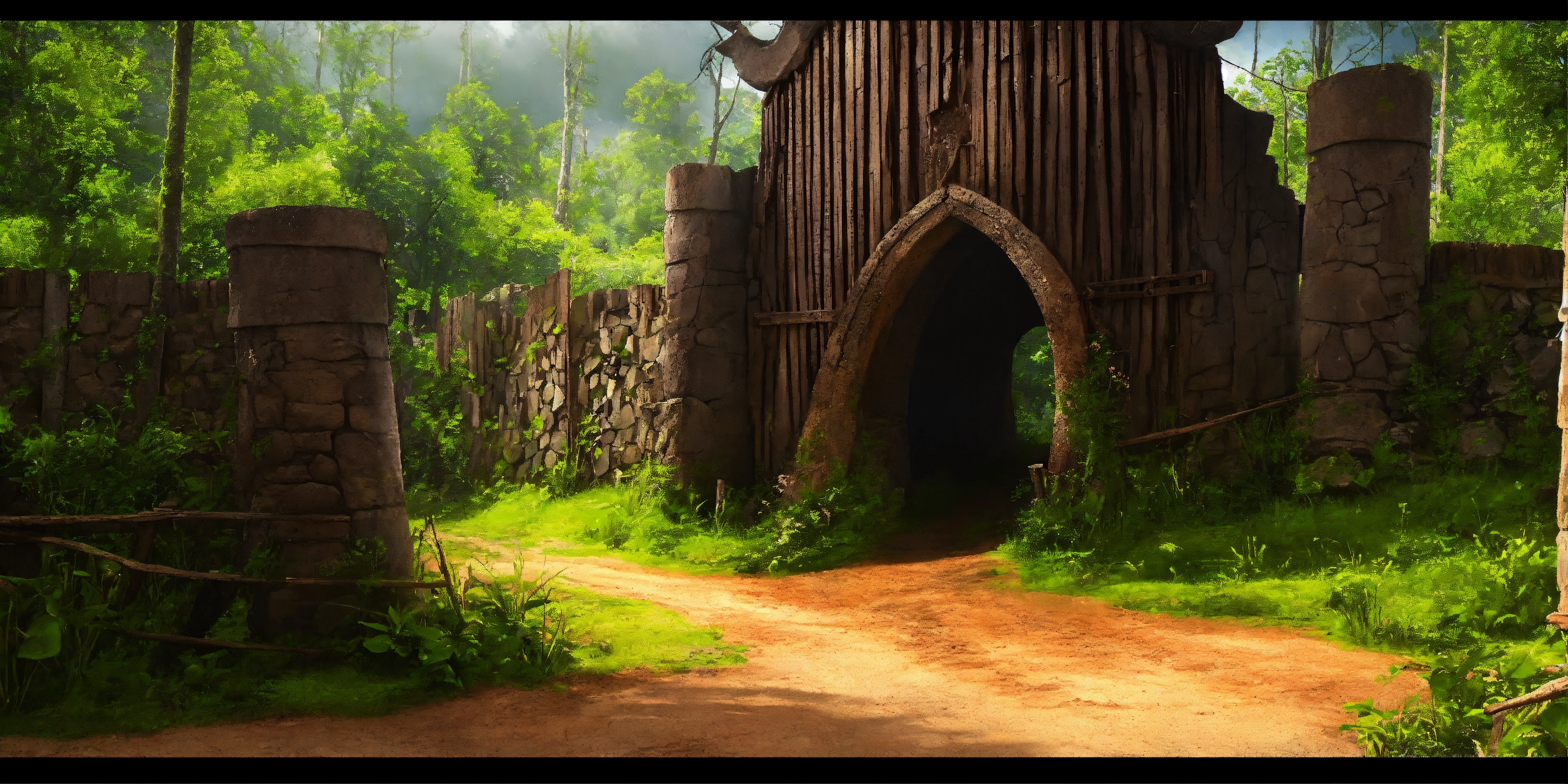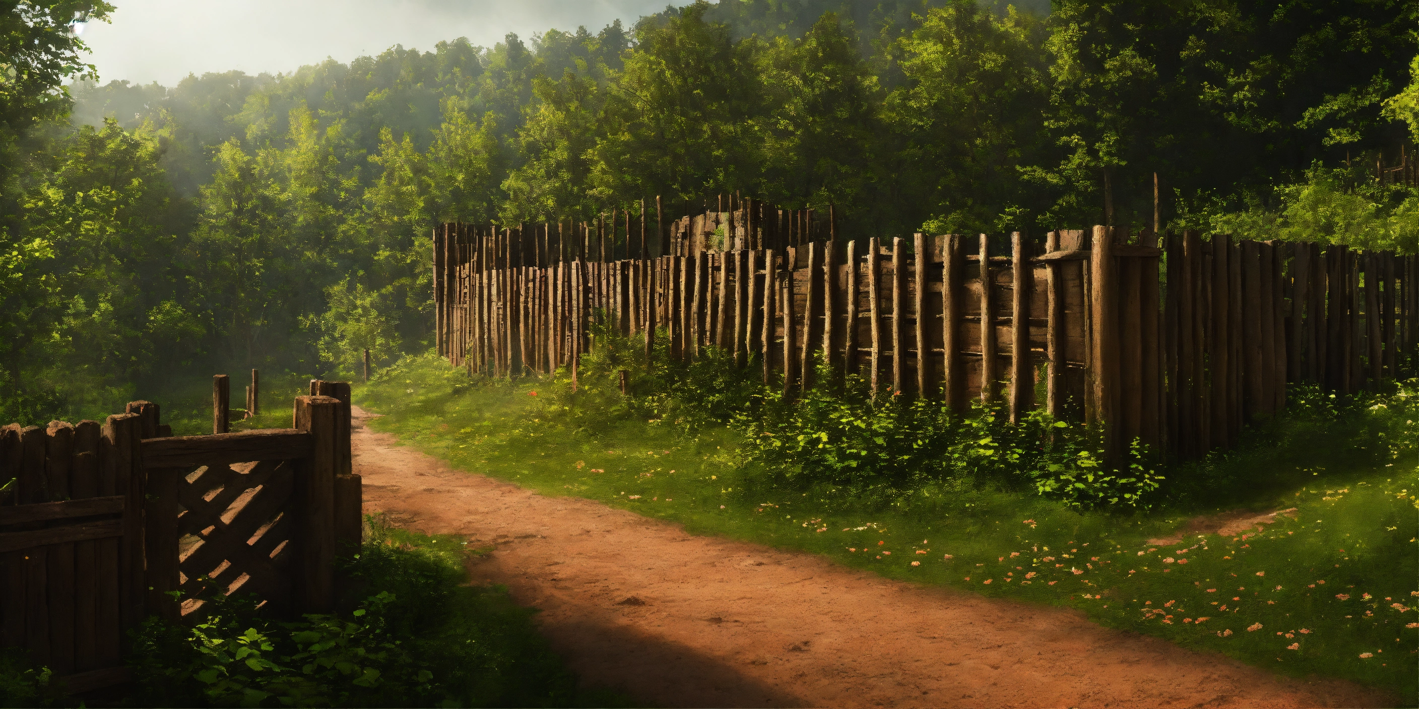 Palisade wall 100 yards away around a fantasy village in the forest, muddy dirt road leading up to the gate