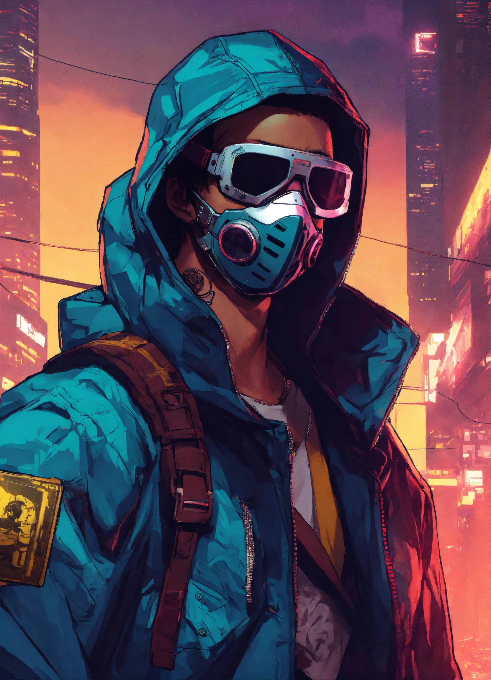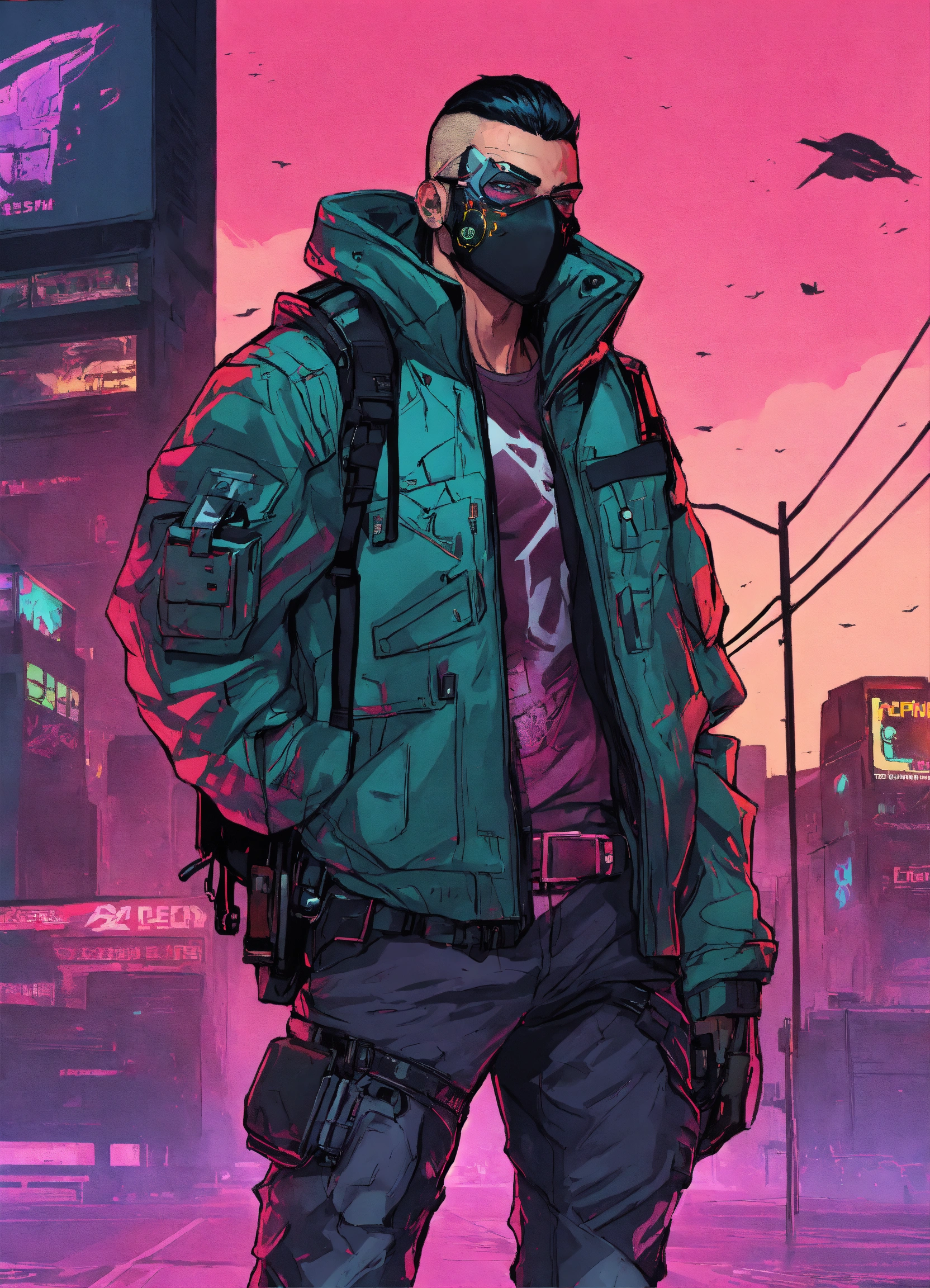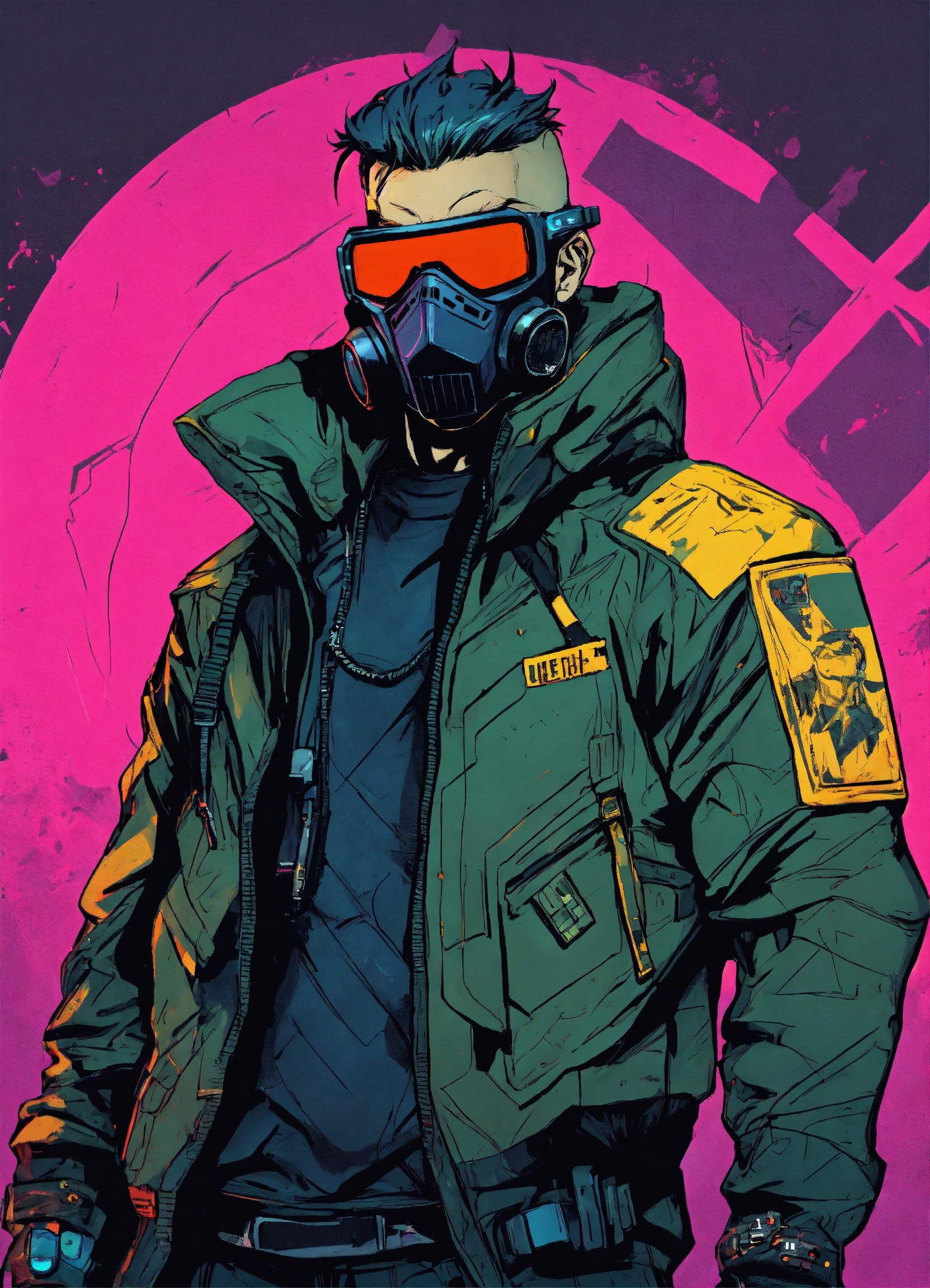 Cyberpunk gang member with a mask and a jacket comic book art style