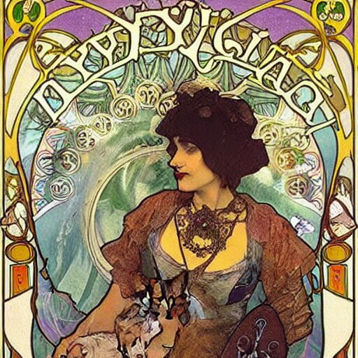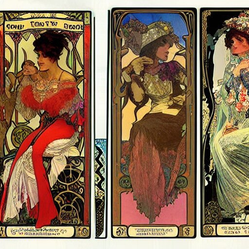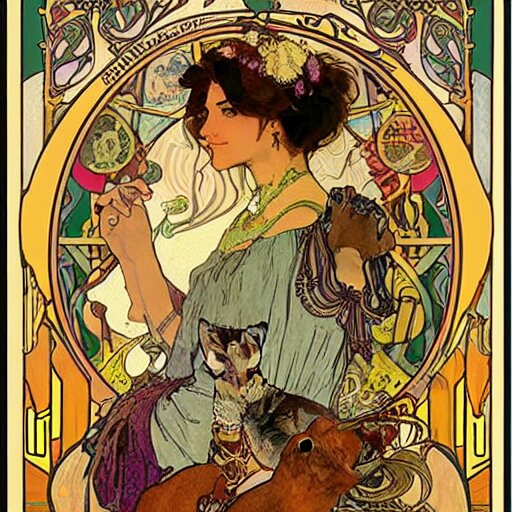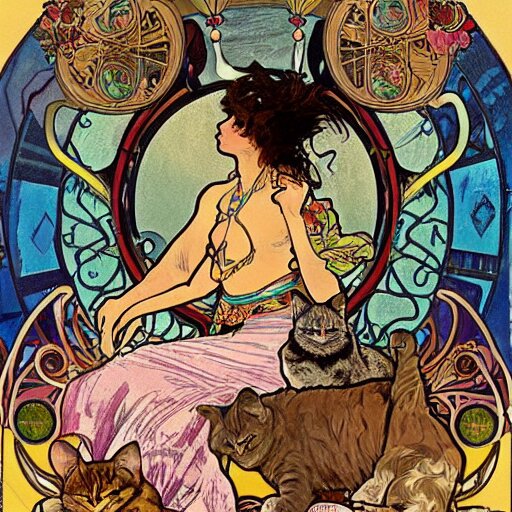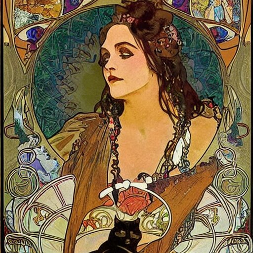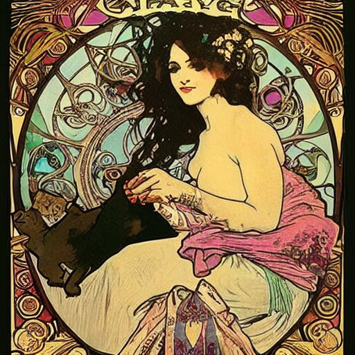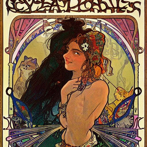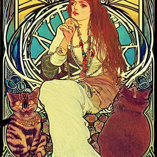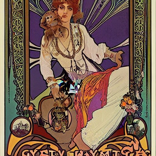 A posters of gypsy lady doing tarot card reading inside a gypsy caravan surrounded by cats in art nouveau from 1878, alphonse mucha, decorative panels, old paper, soft colors