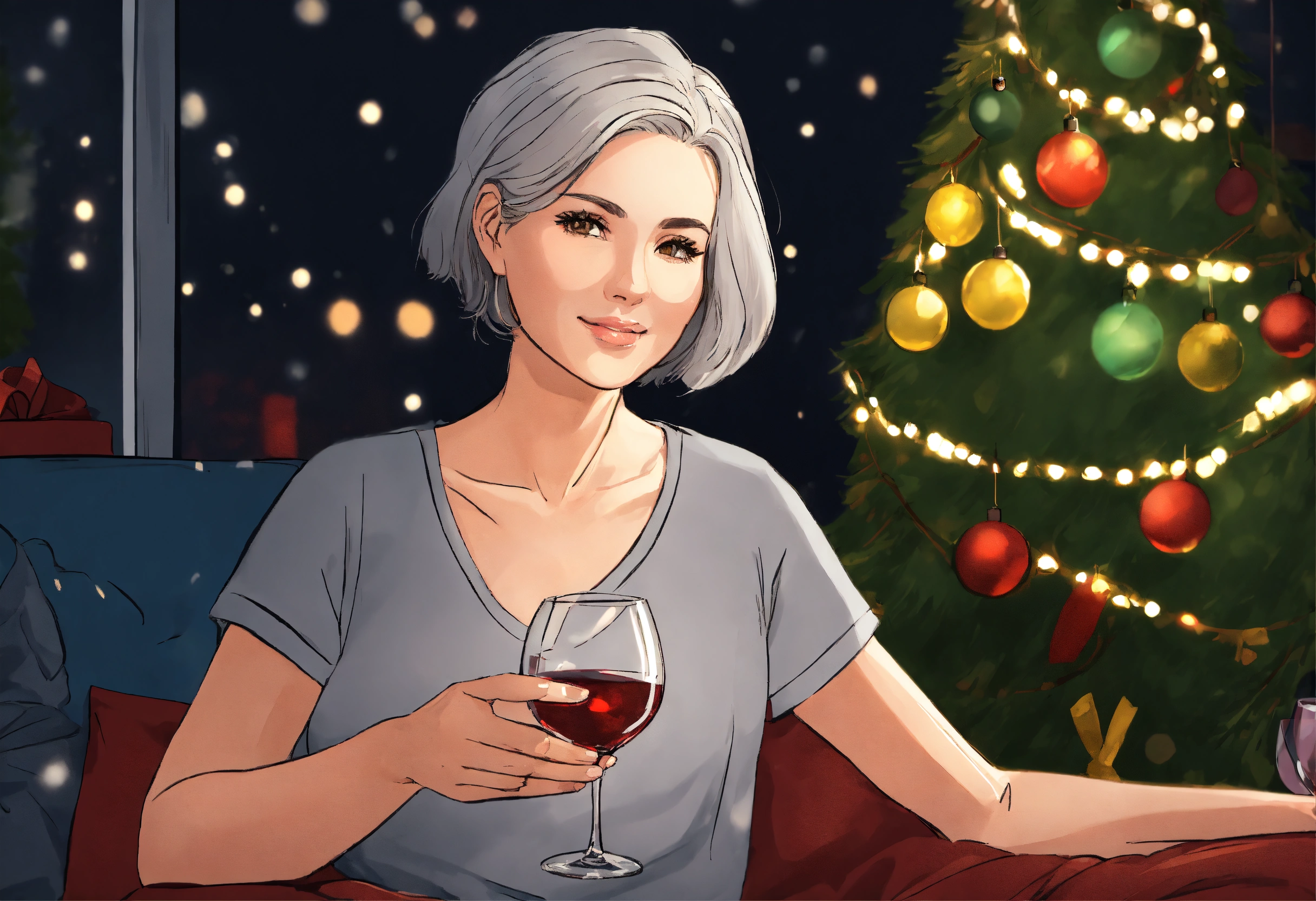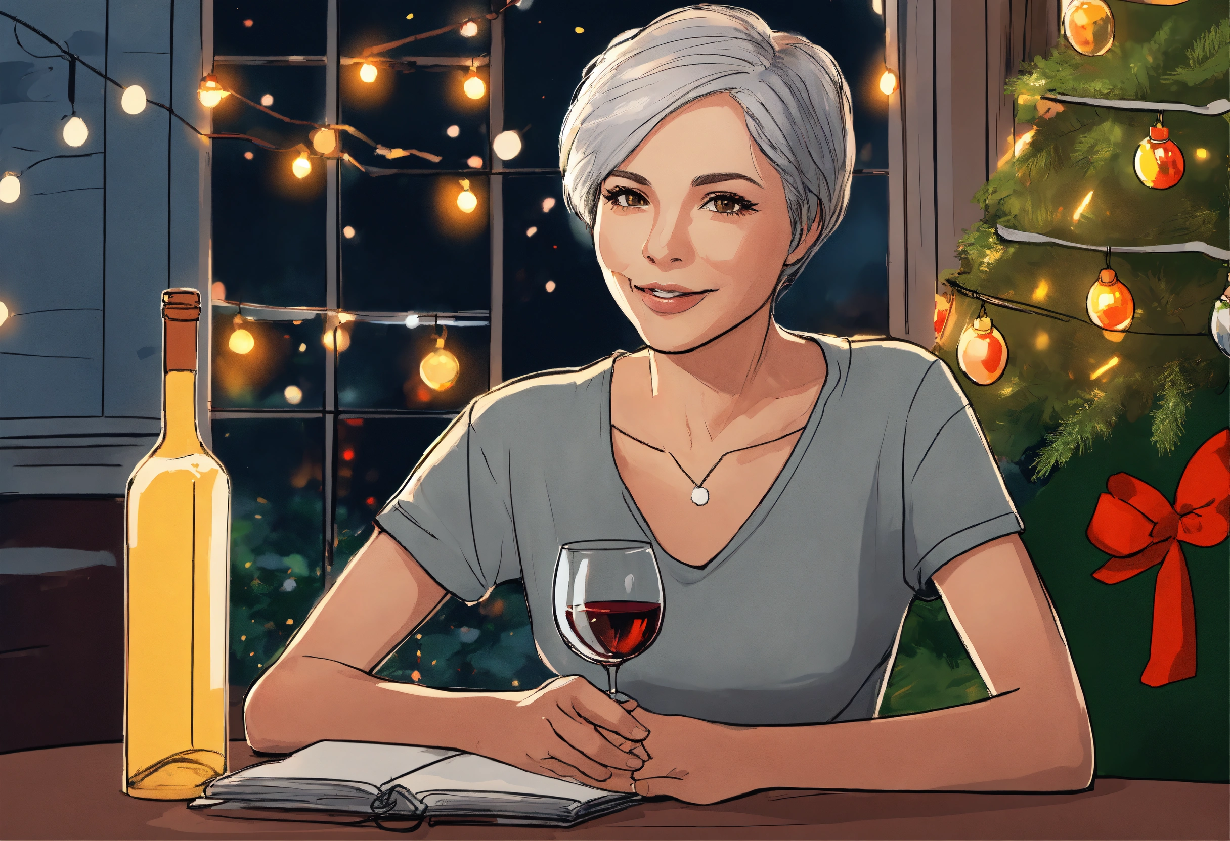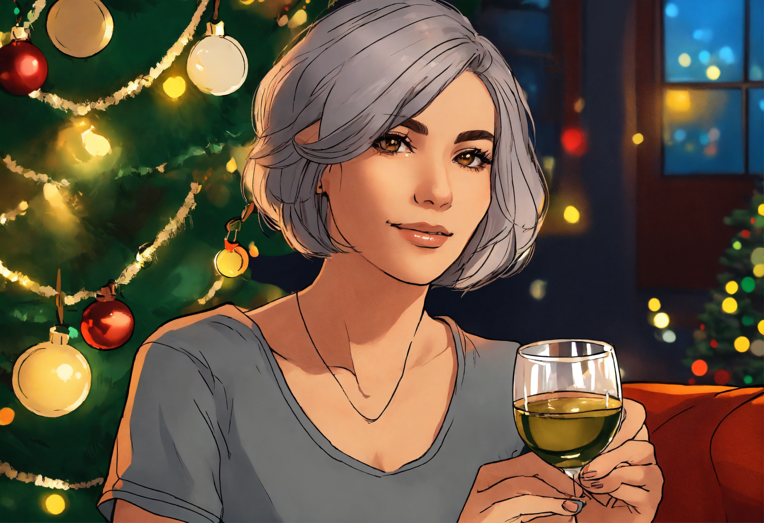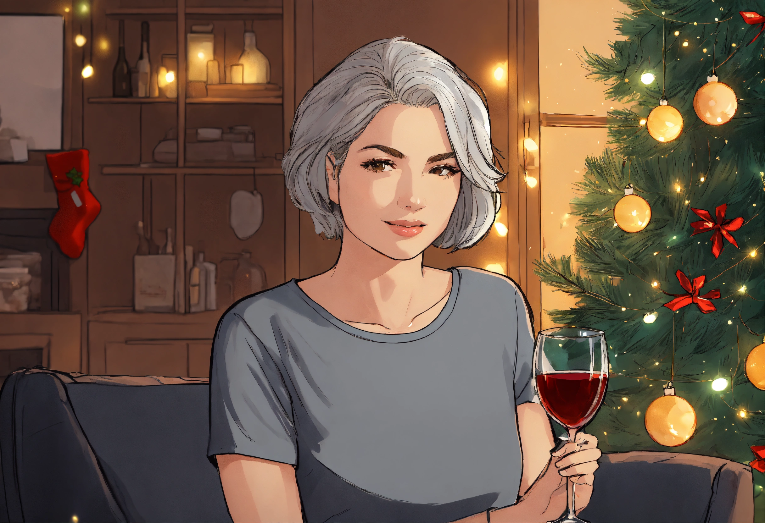 2d graphic illustration drawing woman with light brown eyes, straight short gray hair, holding a glass of wine and wearing a grey t-shirt sitting in front of a christmas tree decorated w lights turned on, illustration drawing