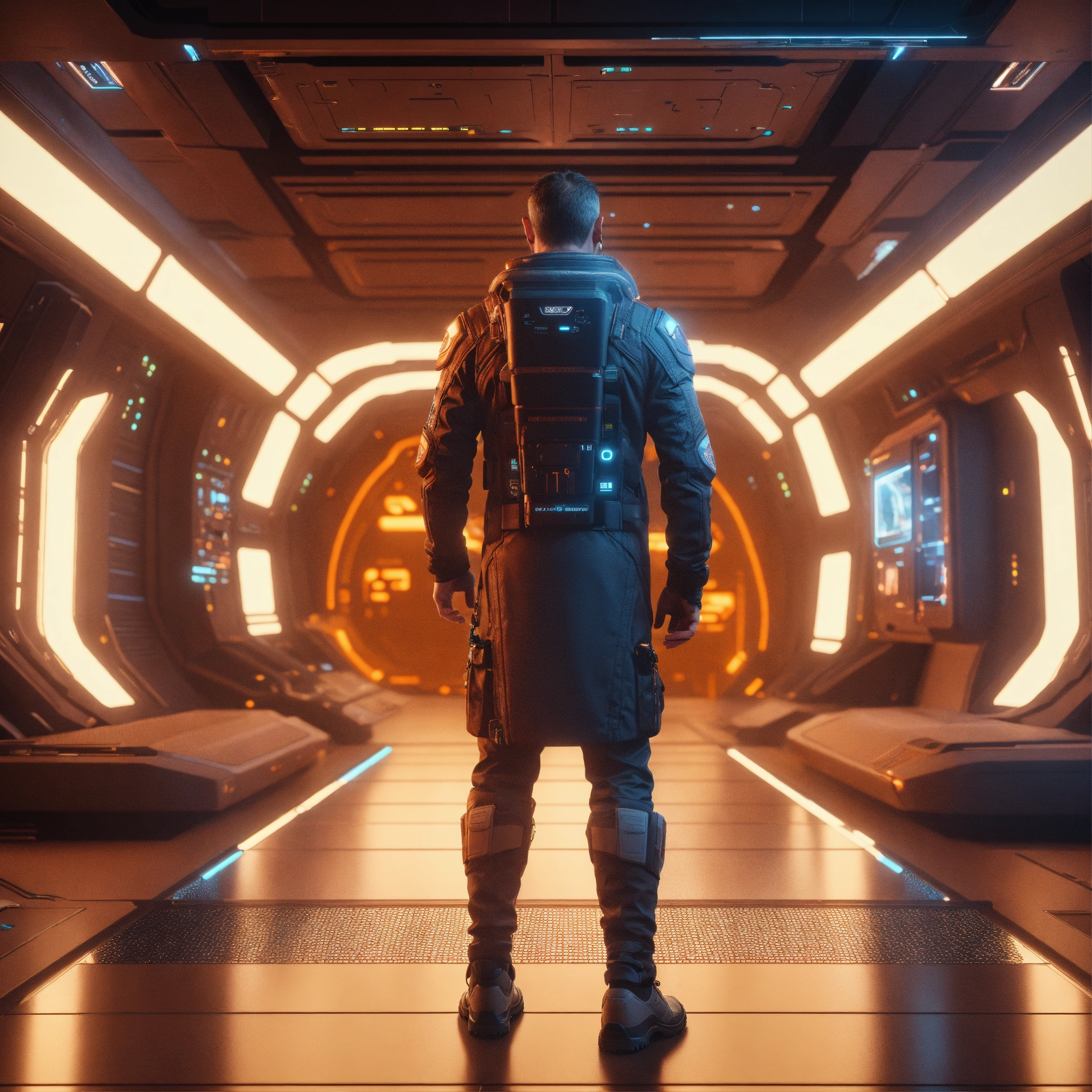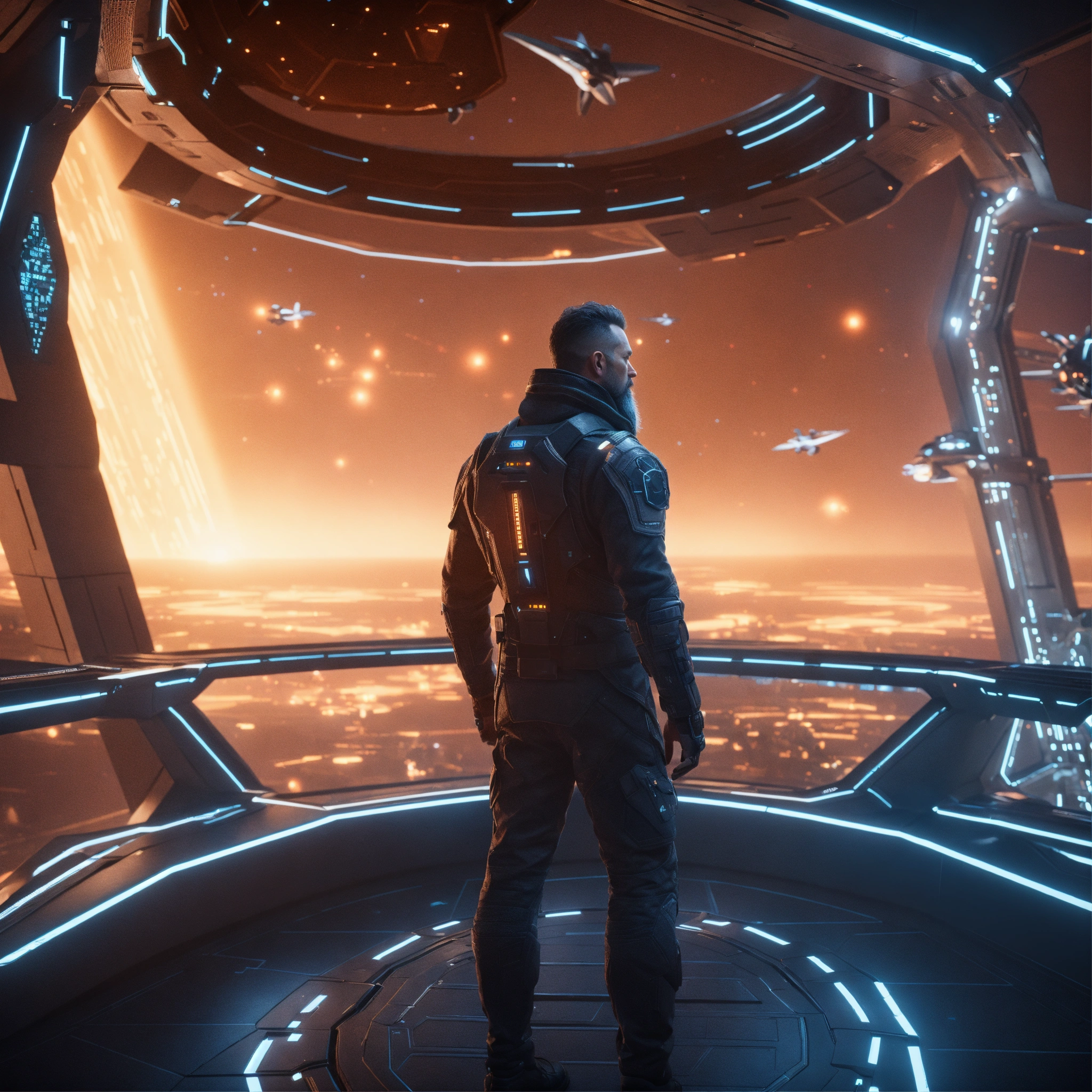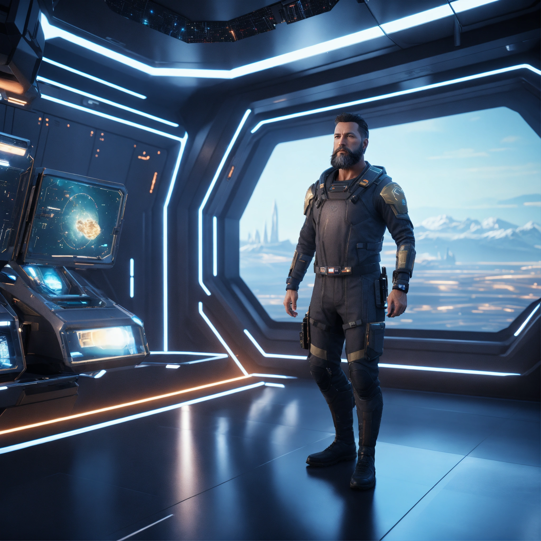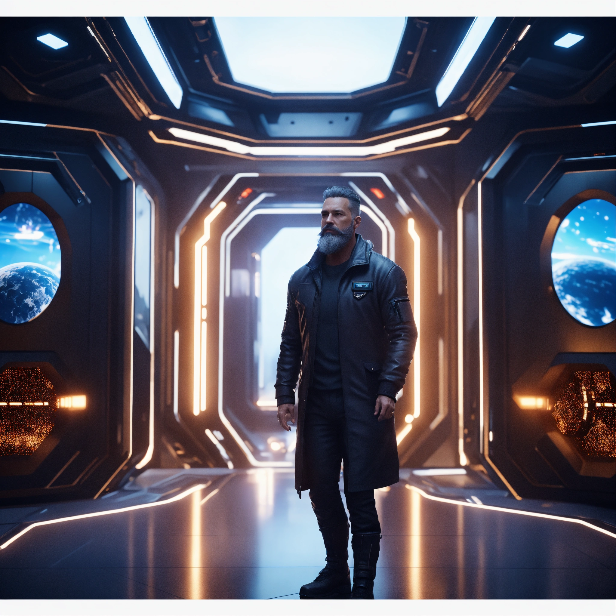45 year old masculine man with trim beard boarding a luxurious hi tech space port, realistic, futuristic, sci-fi, 8k, unreal engine