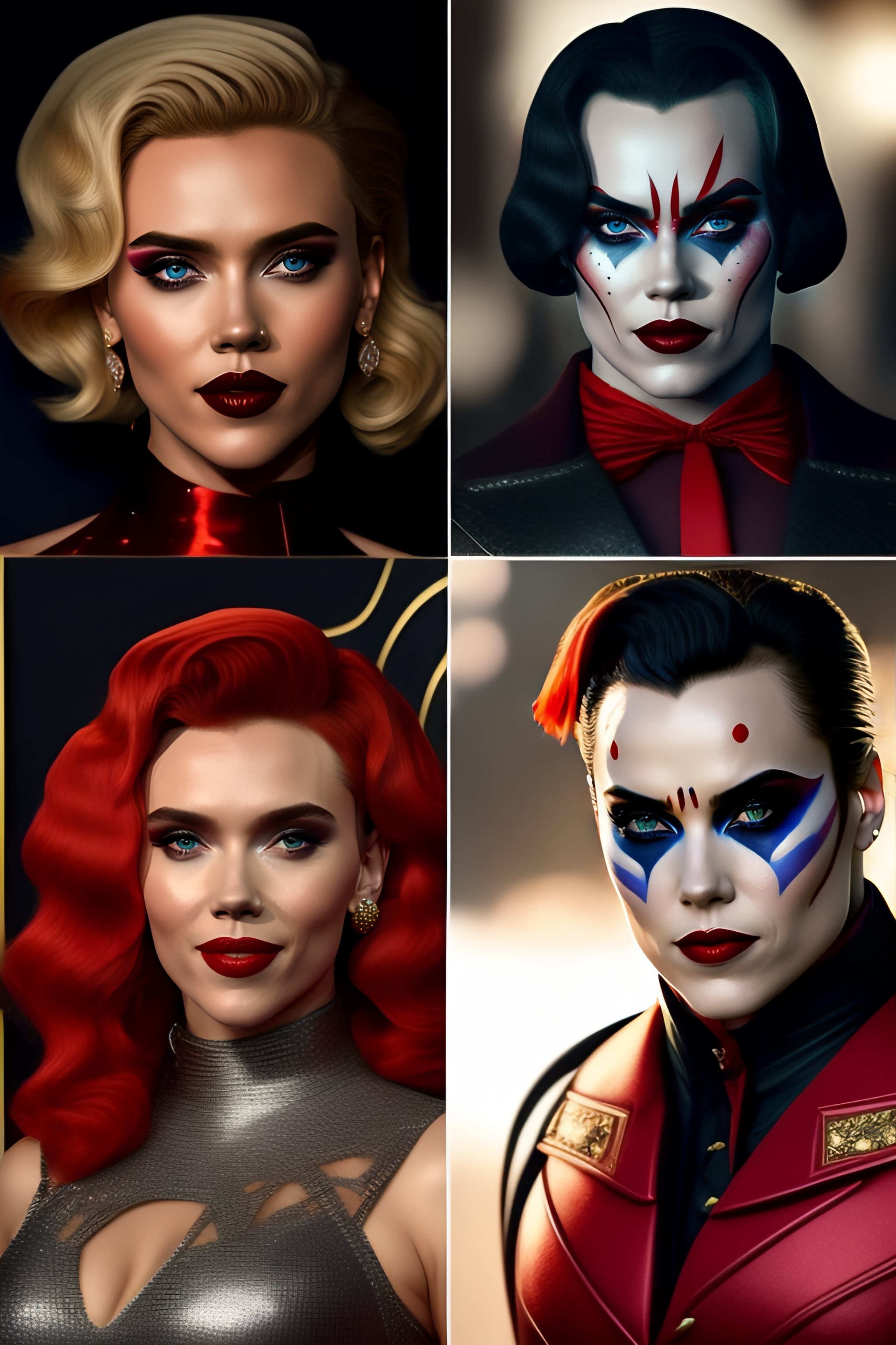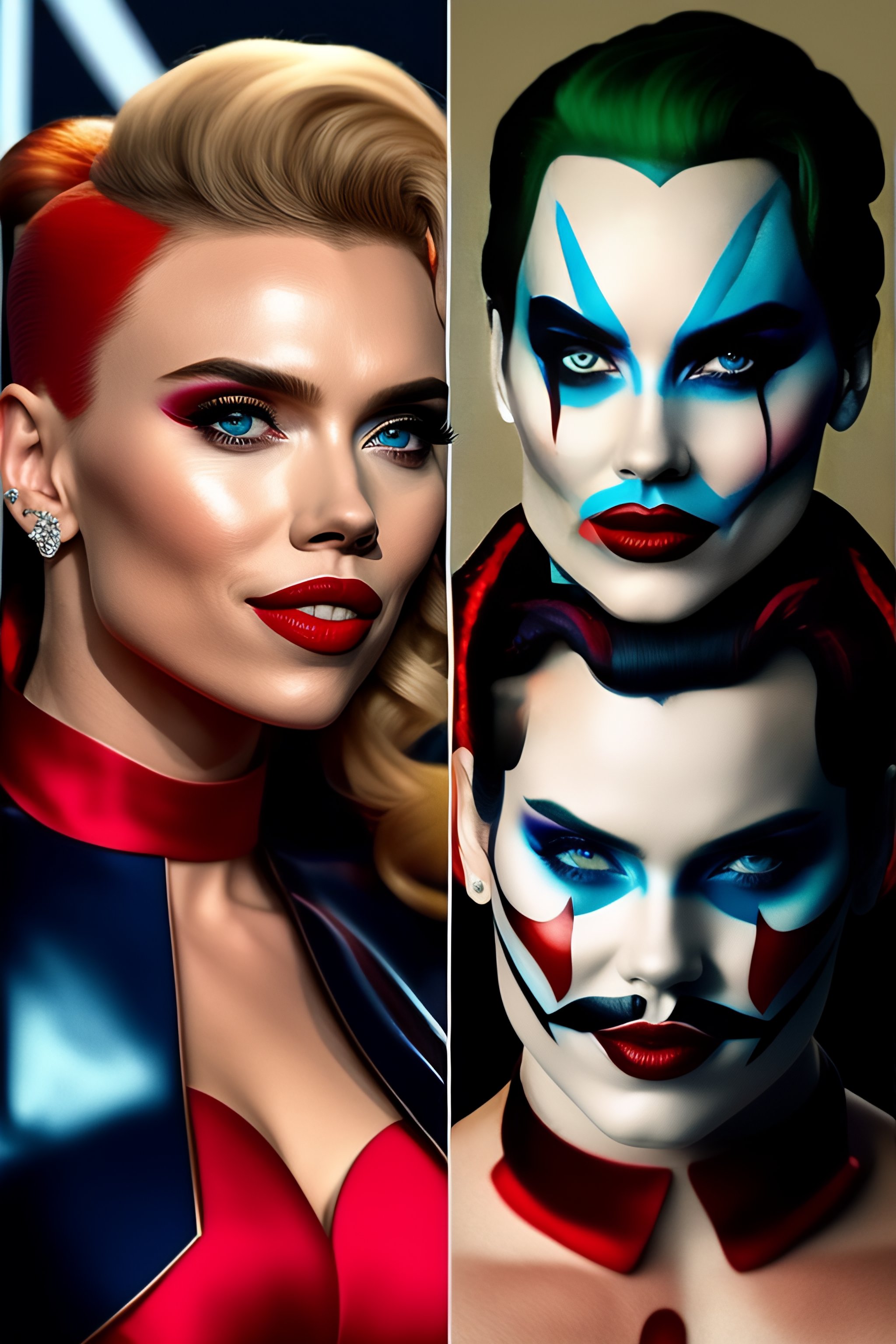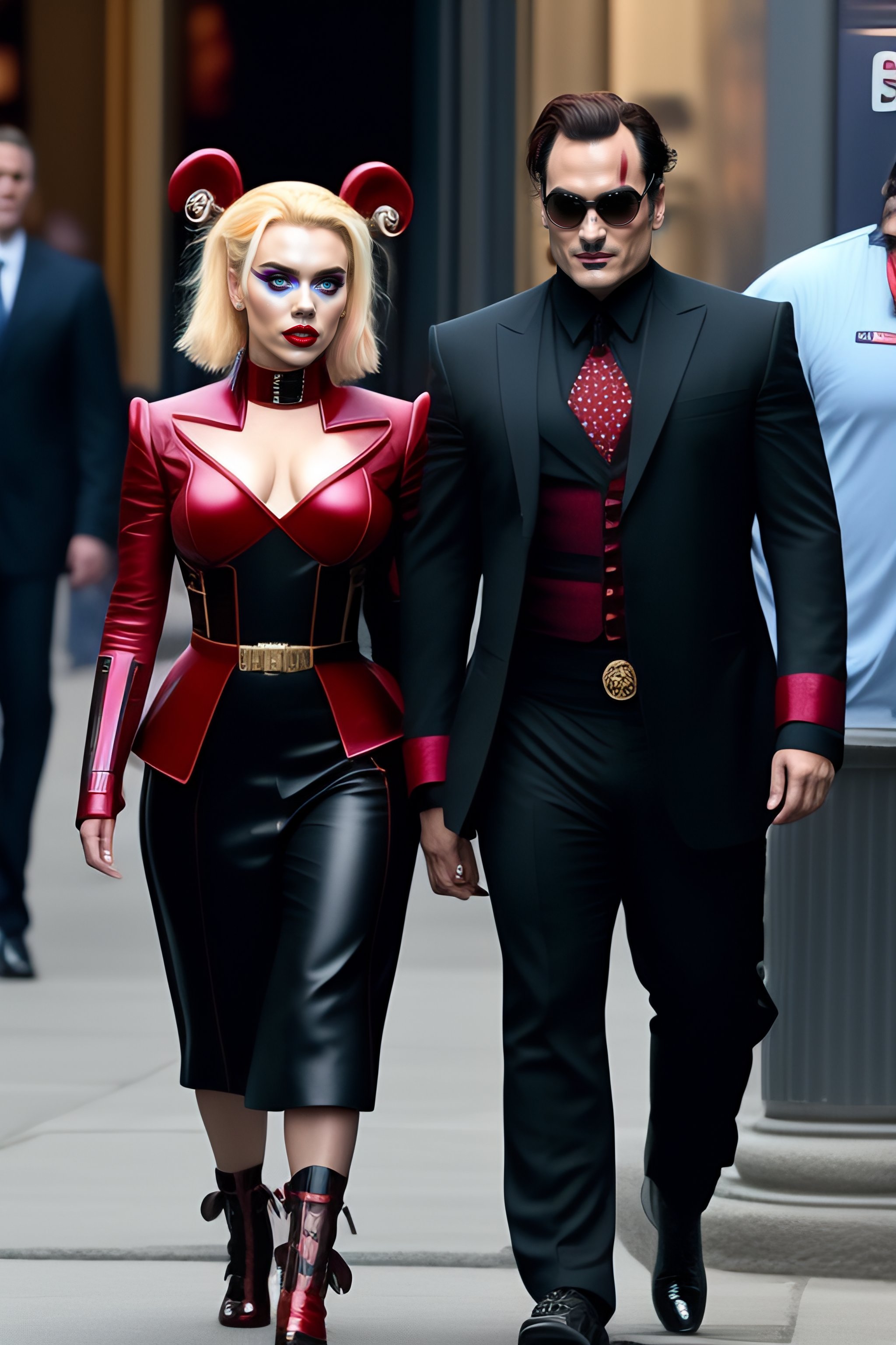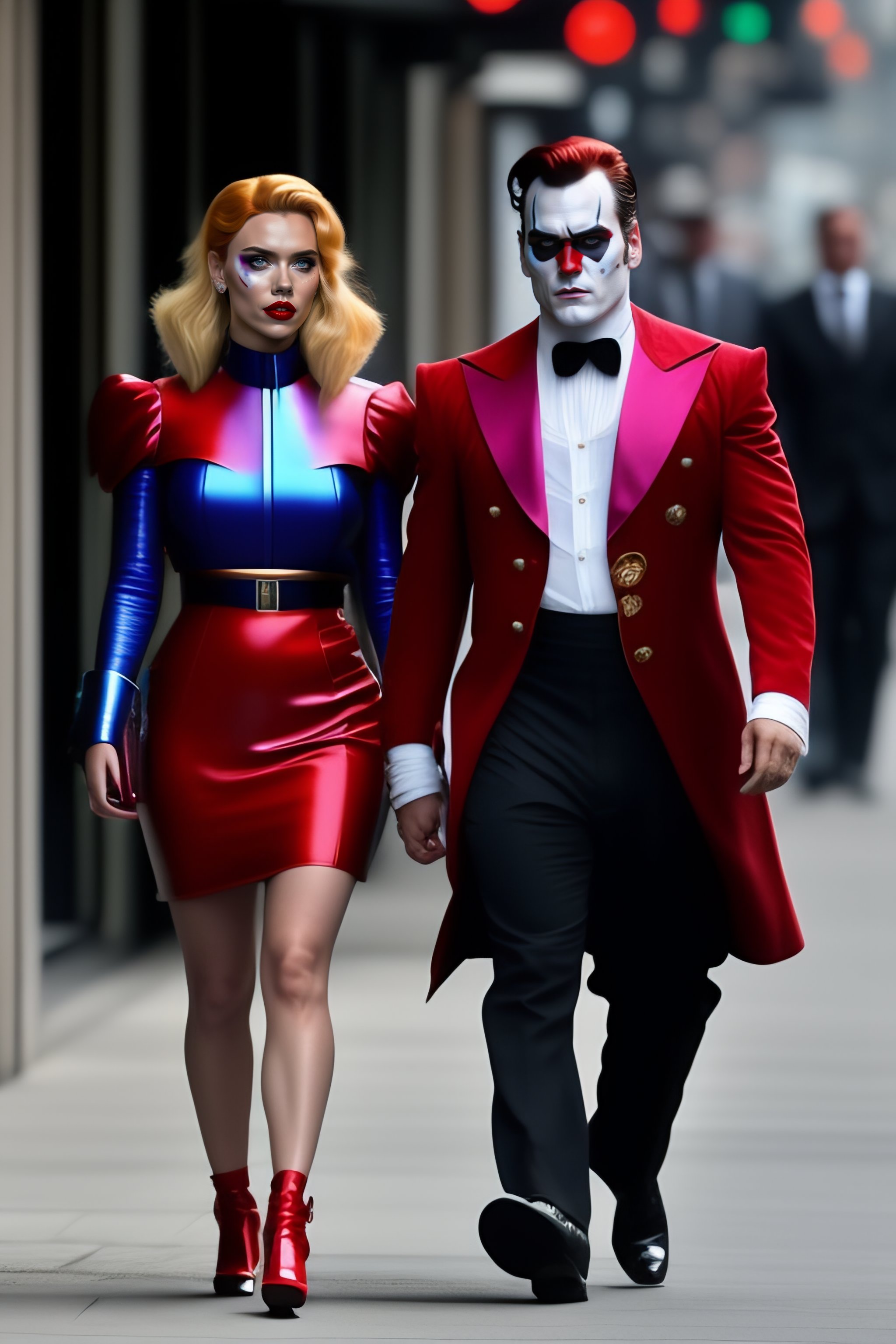 Scarlett johansson as harley quinn walking beside joaquin phoenix joker with face make-up