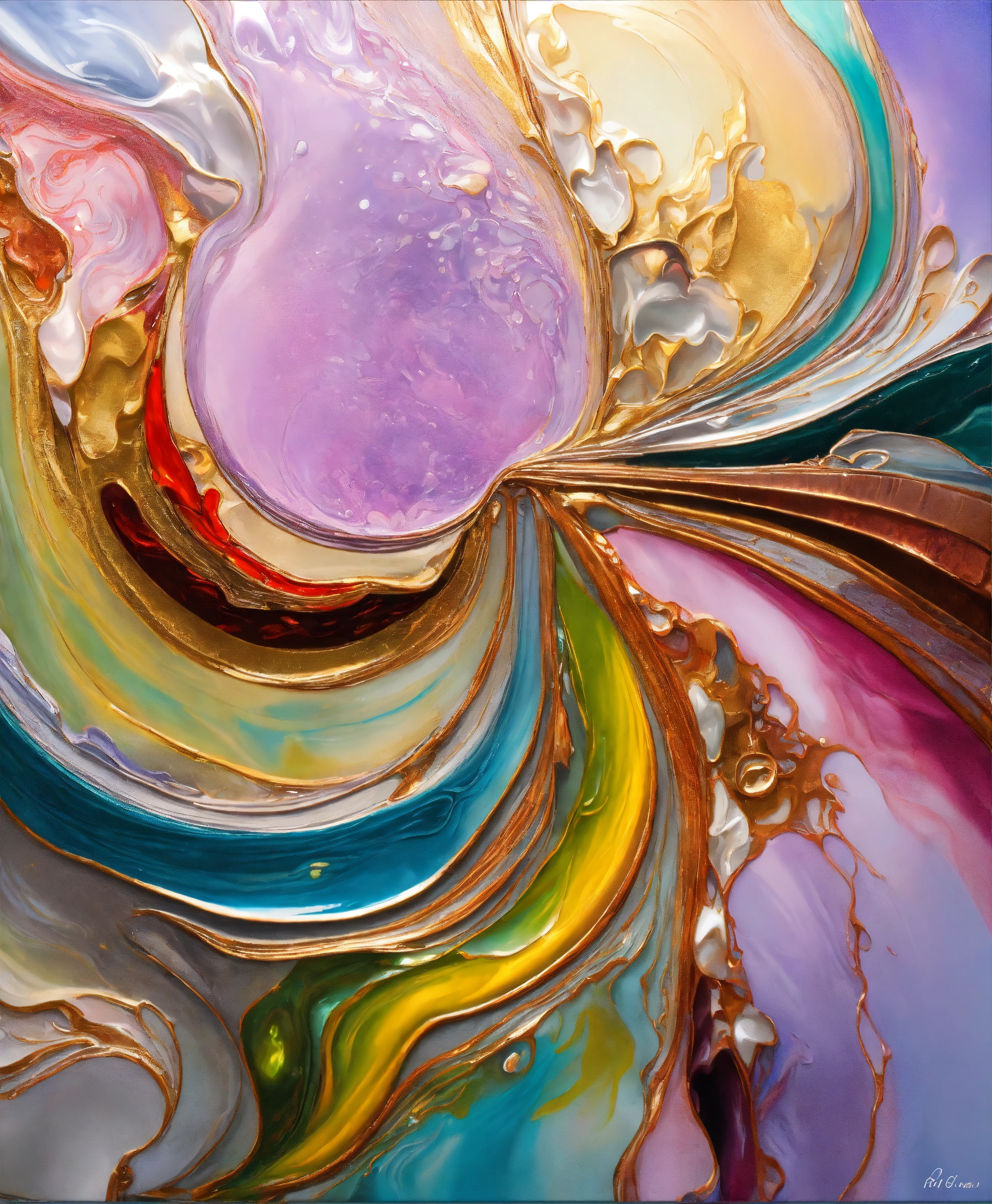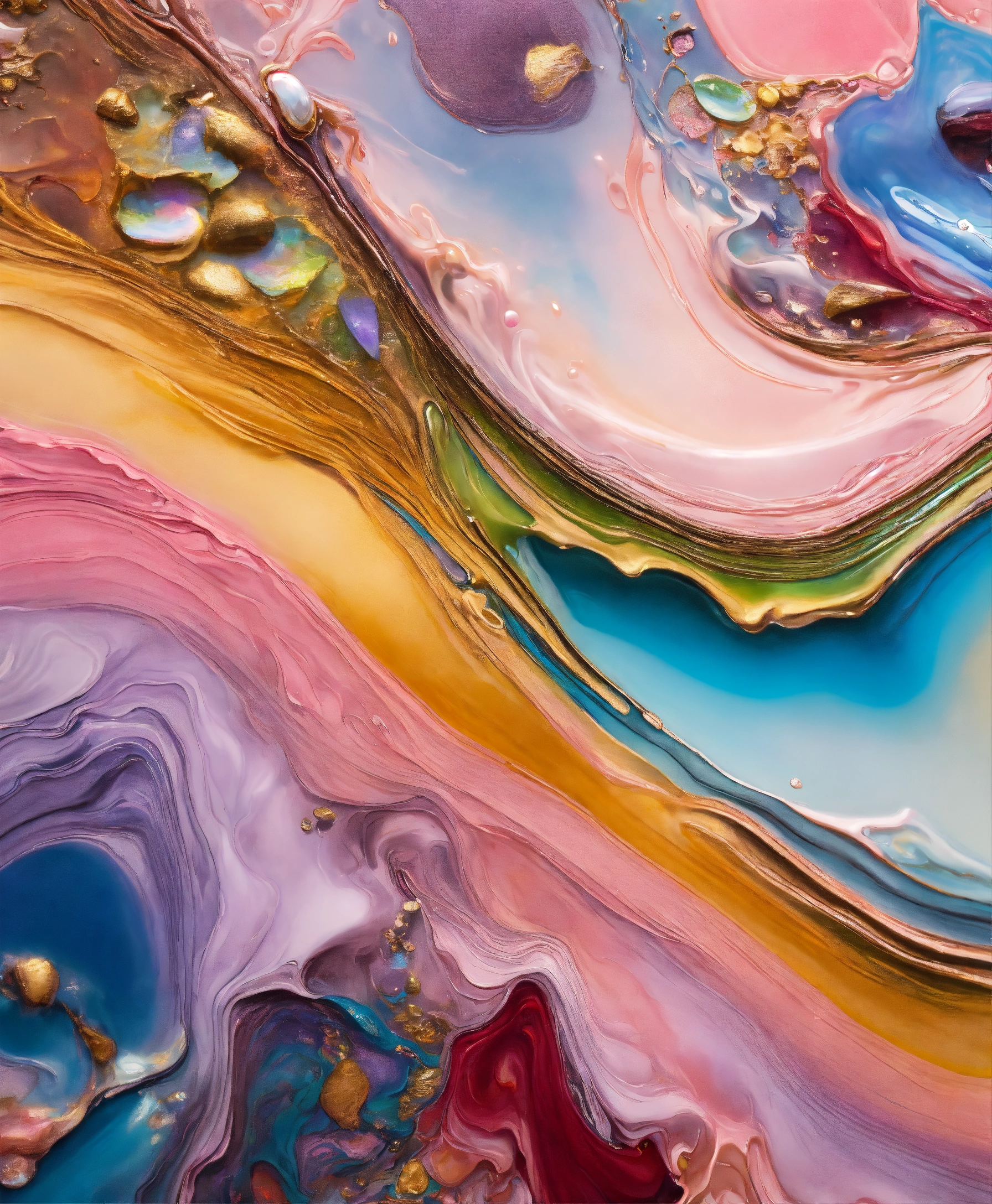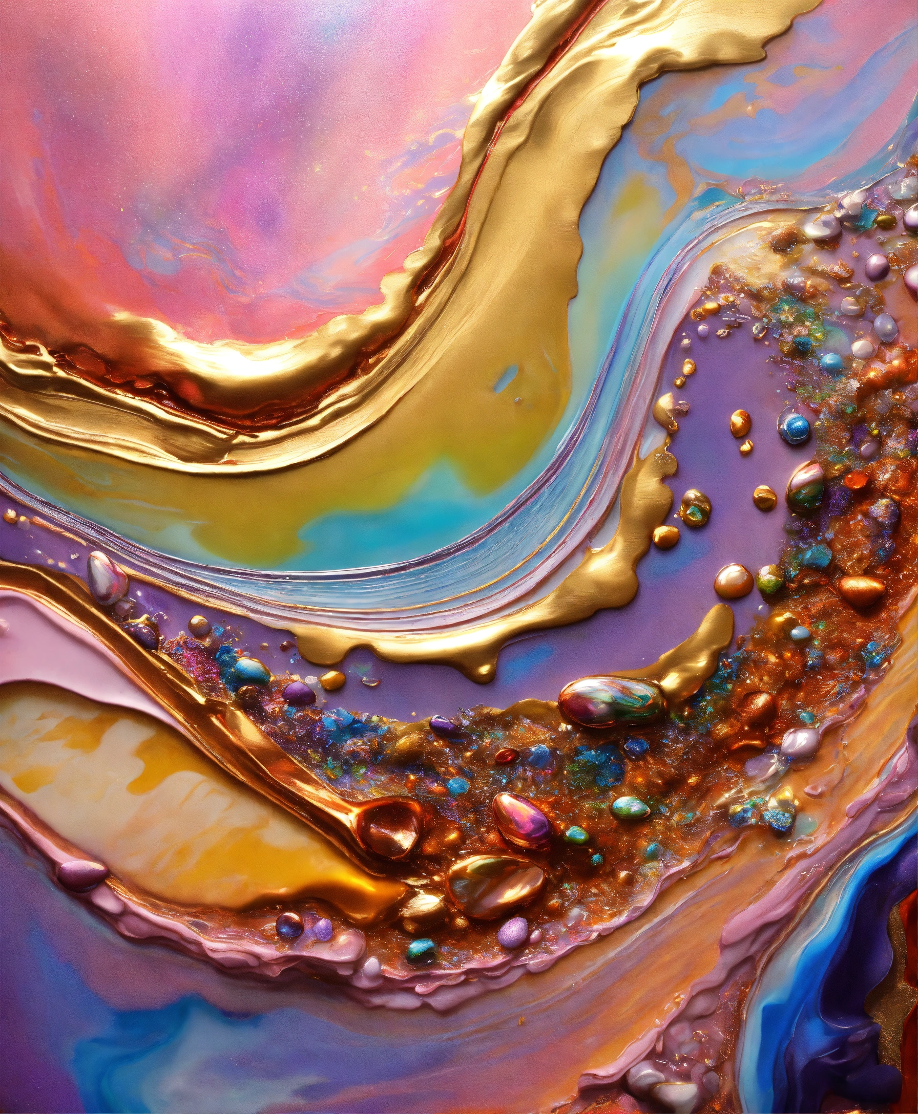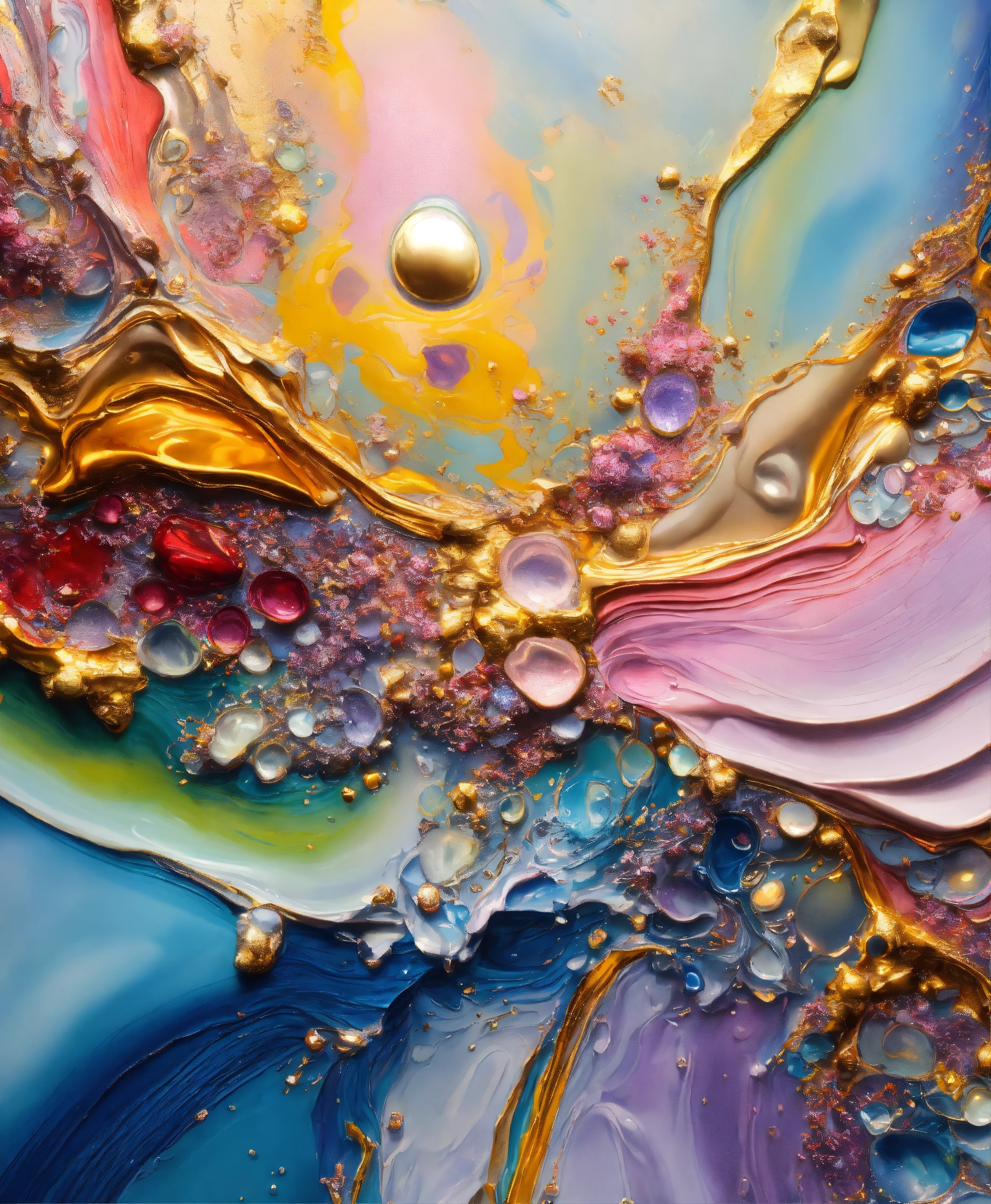 Colorful abstract painting oil and water complex complicated bright vivid colors beautiful opulent heavenly amazing wealthy intricate pink peridot sky blue gray lilac yellow violet green red blue sublime delicate hyperdetailed masterpiece metallic sheen mother of pearl elaborate inspiring ethereal amazing awesome 24k bright shiny gold silver and copper trims throughout oil and water 8k extremely sharp image throughout 3d