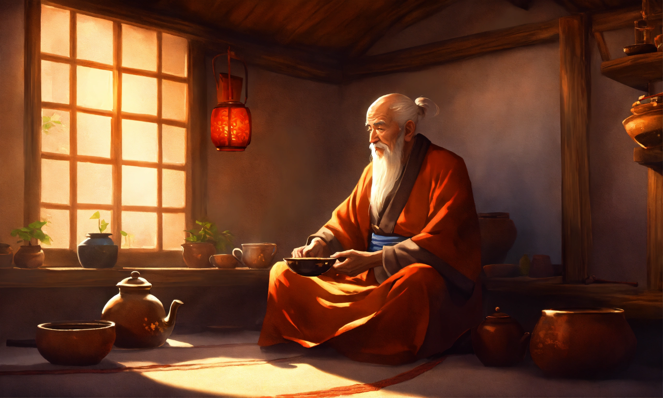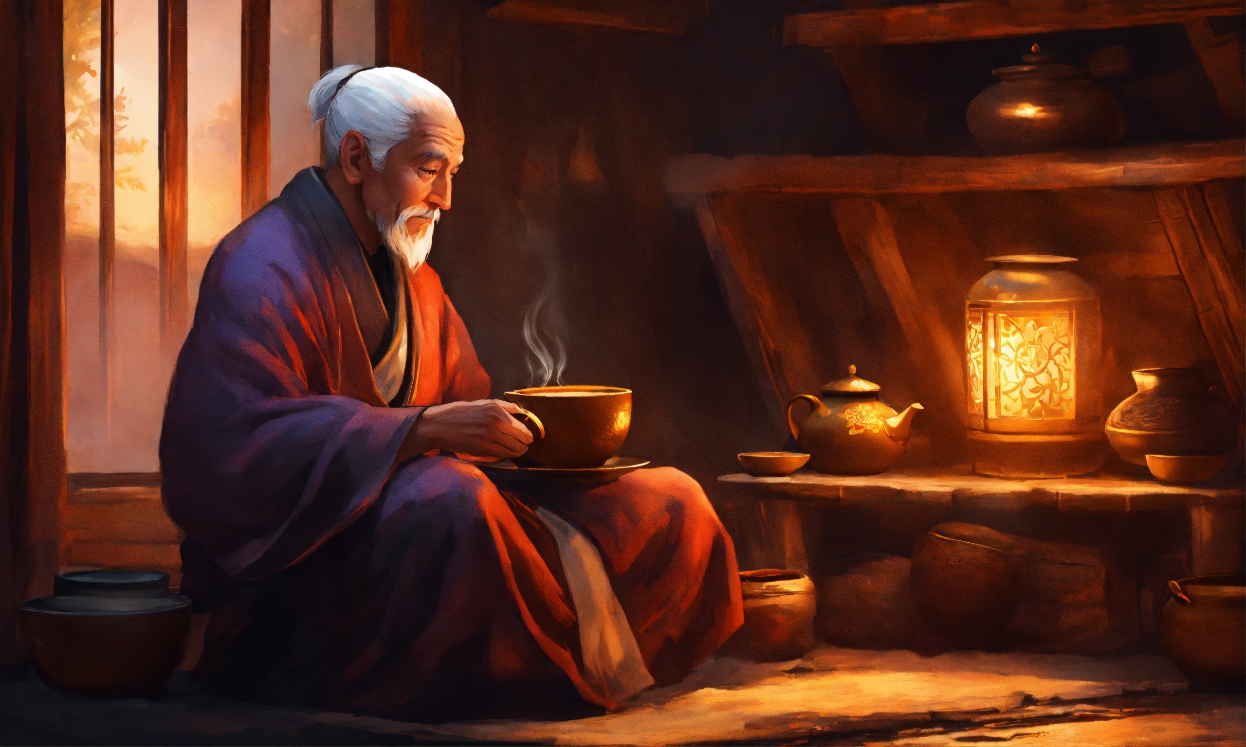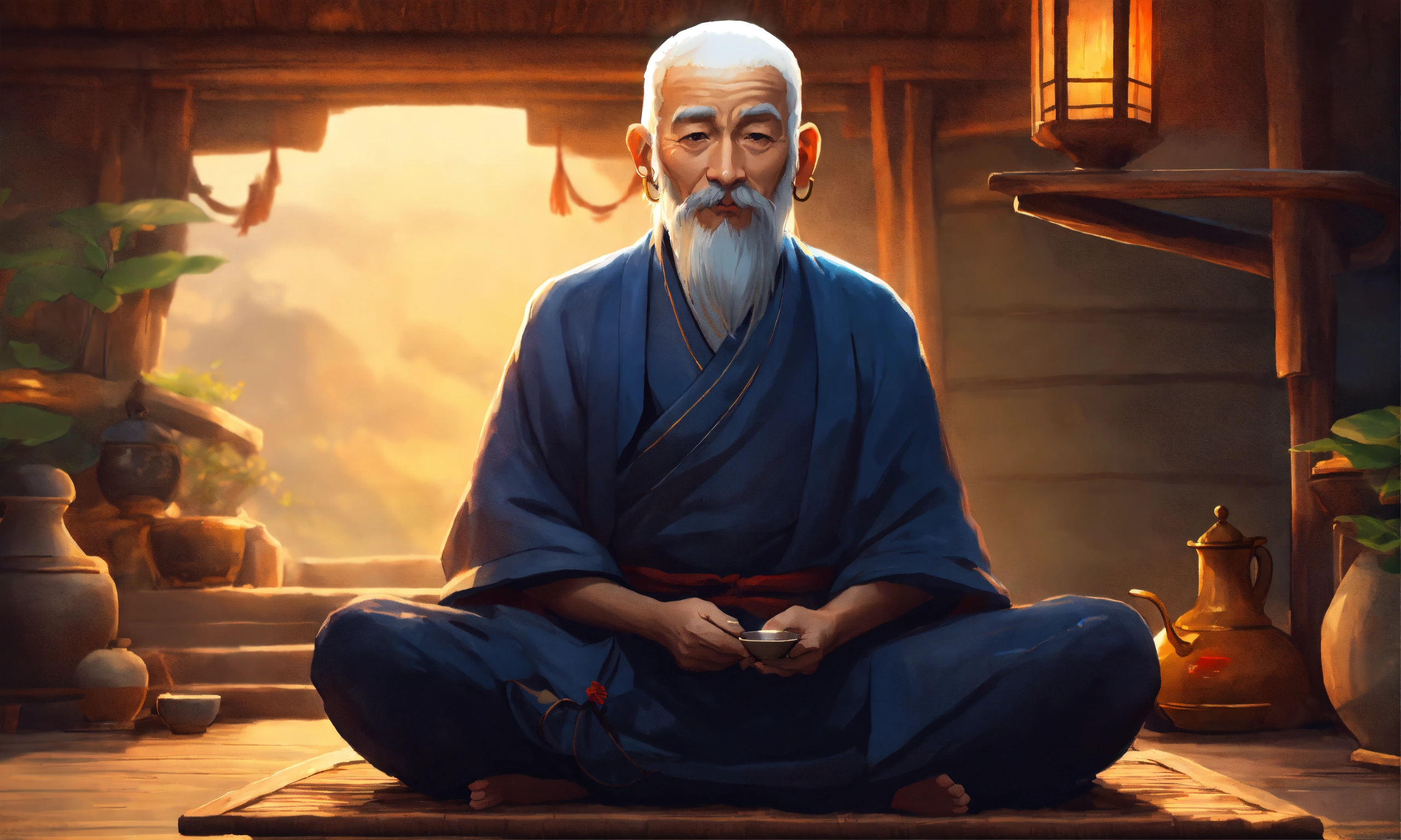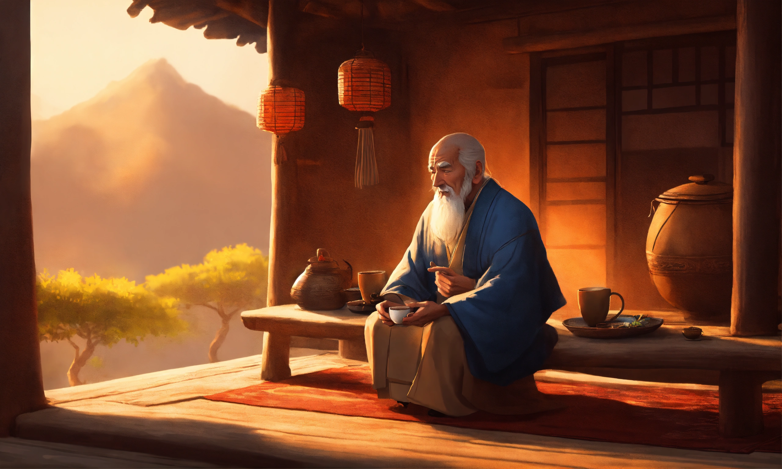 An old zen master sitting in side hut having cup of tea in the style of illustrator donald zolan