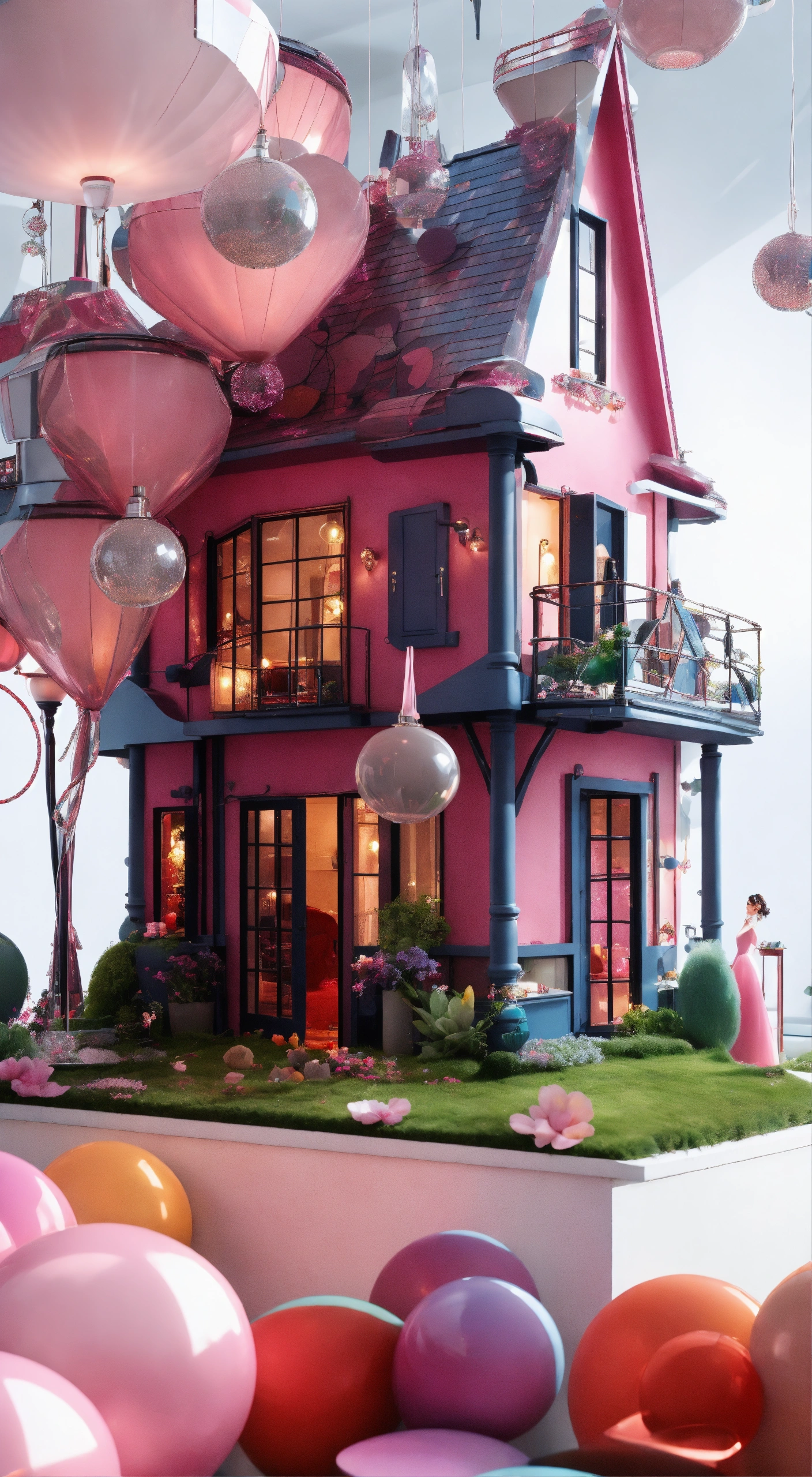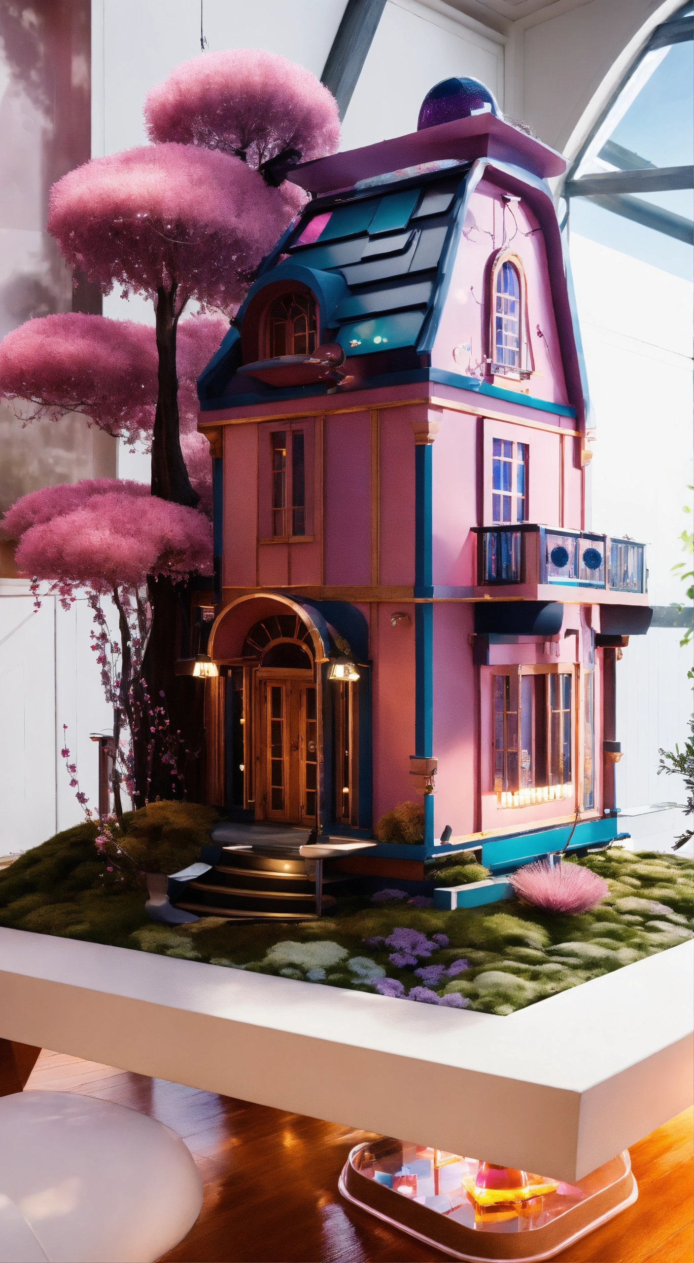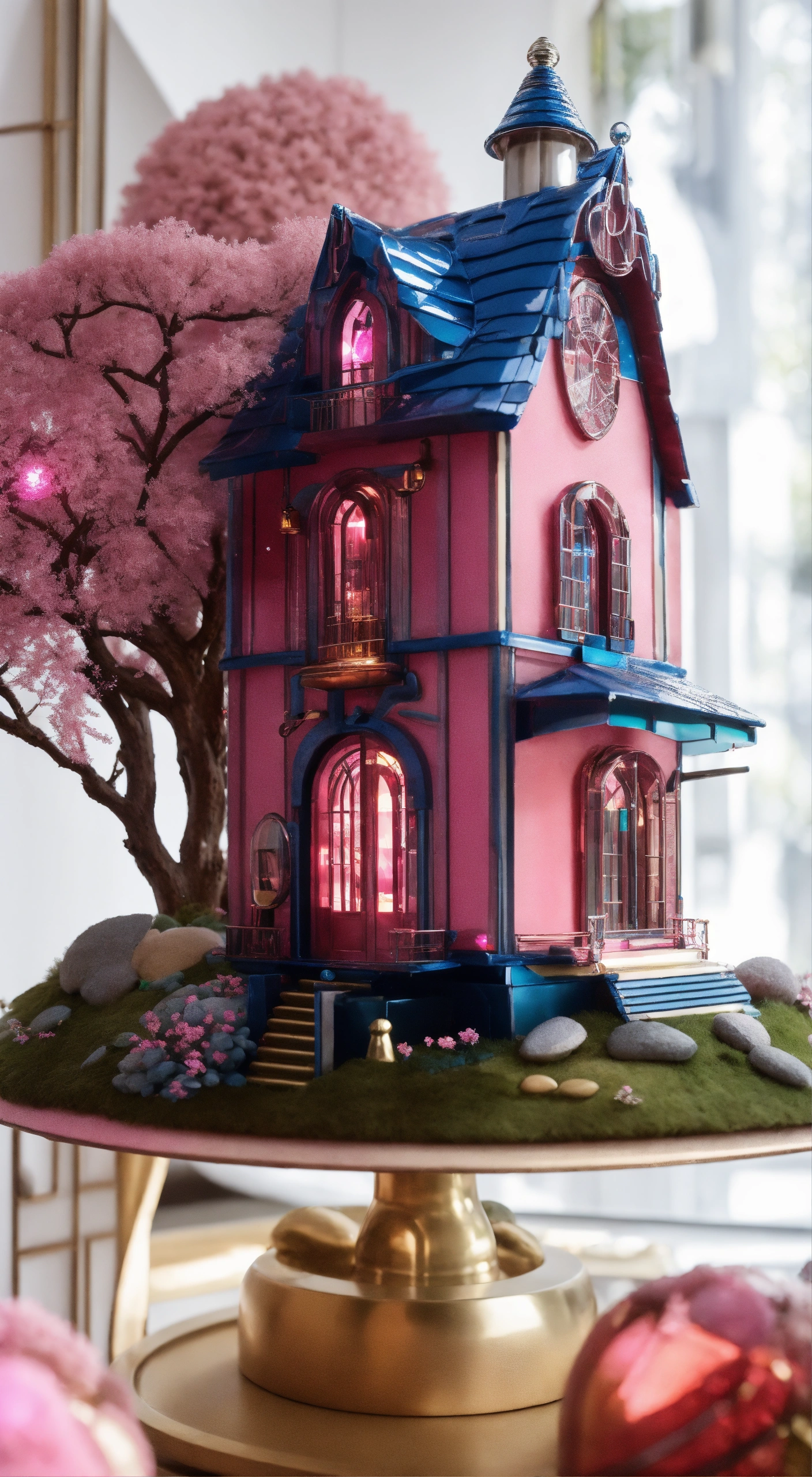 Maison conçue par katherine's collection inspiration. rendu moteur 8k, bel éclairage futuriste, maison sous dôme verre, laine cardée, strass colorés, fourrure, lampe bleue, led pink