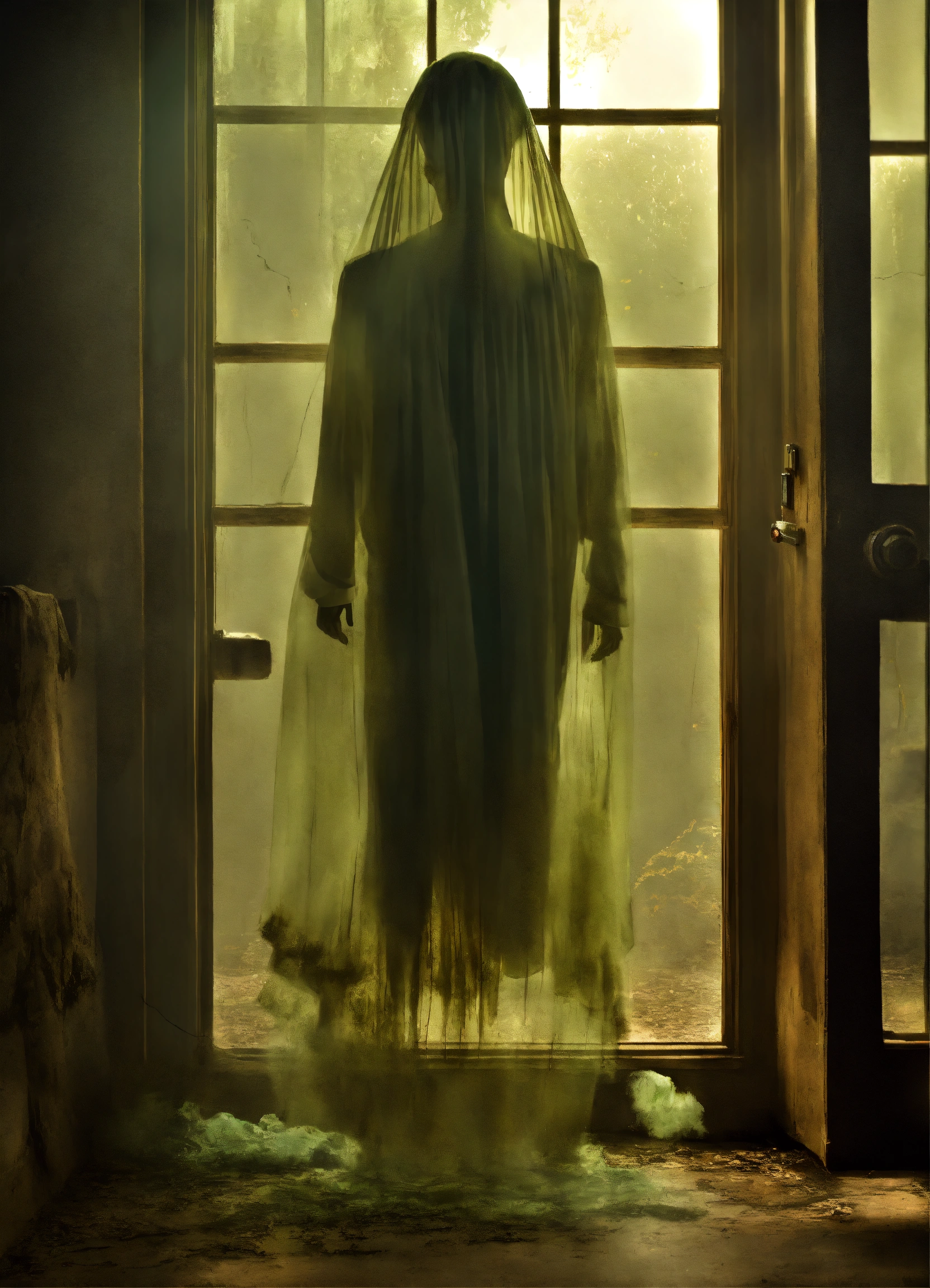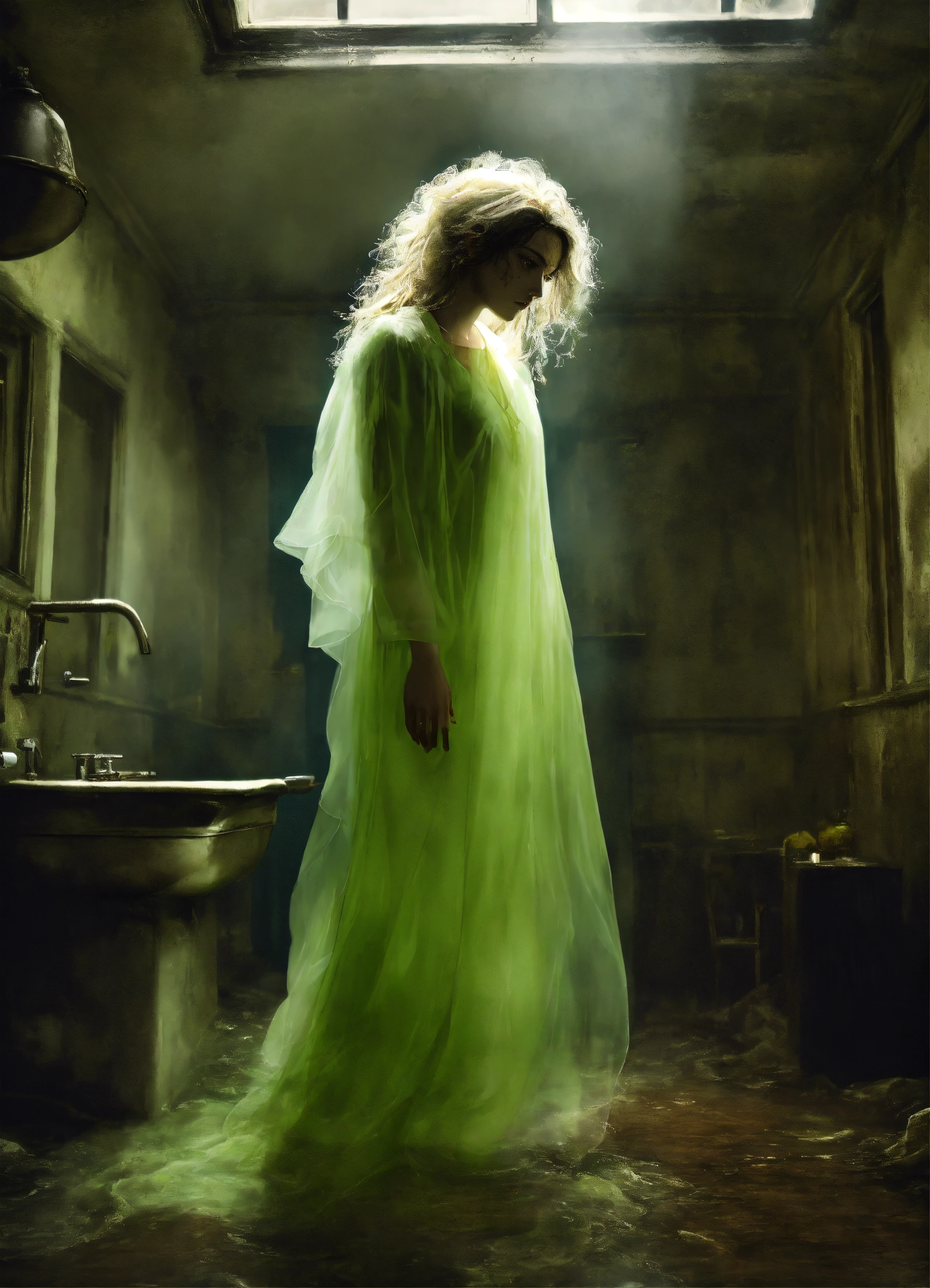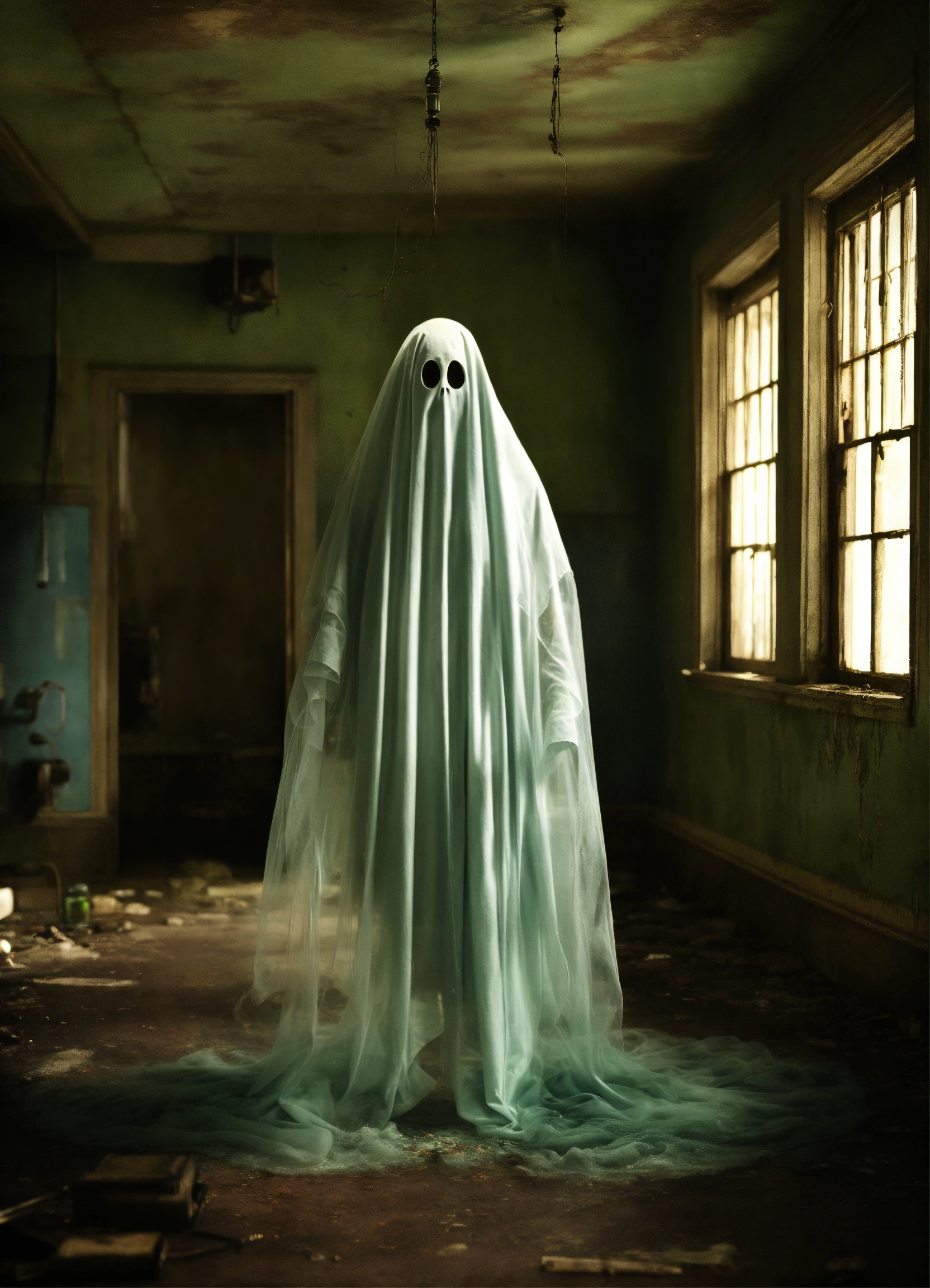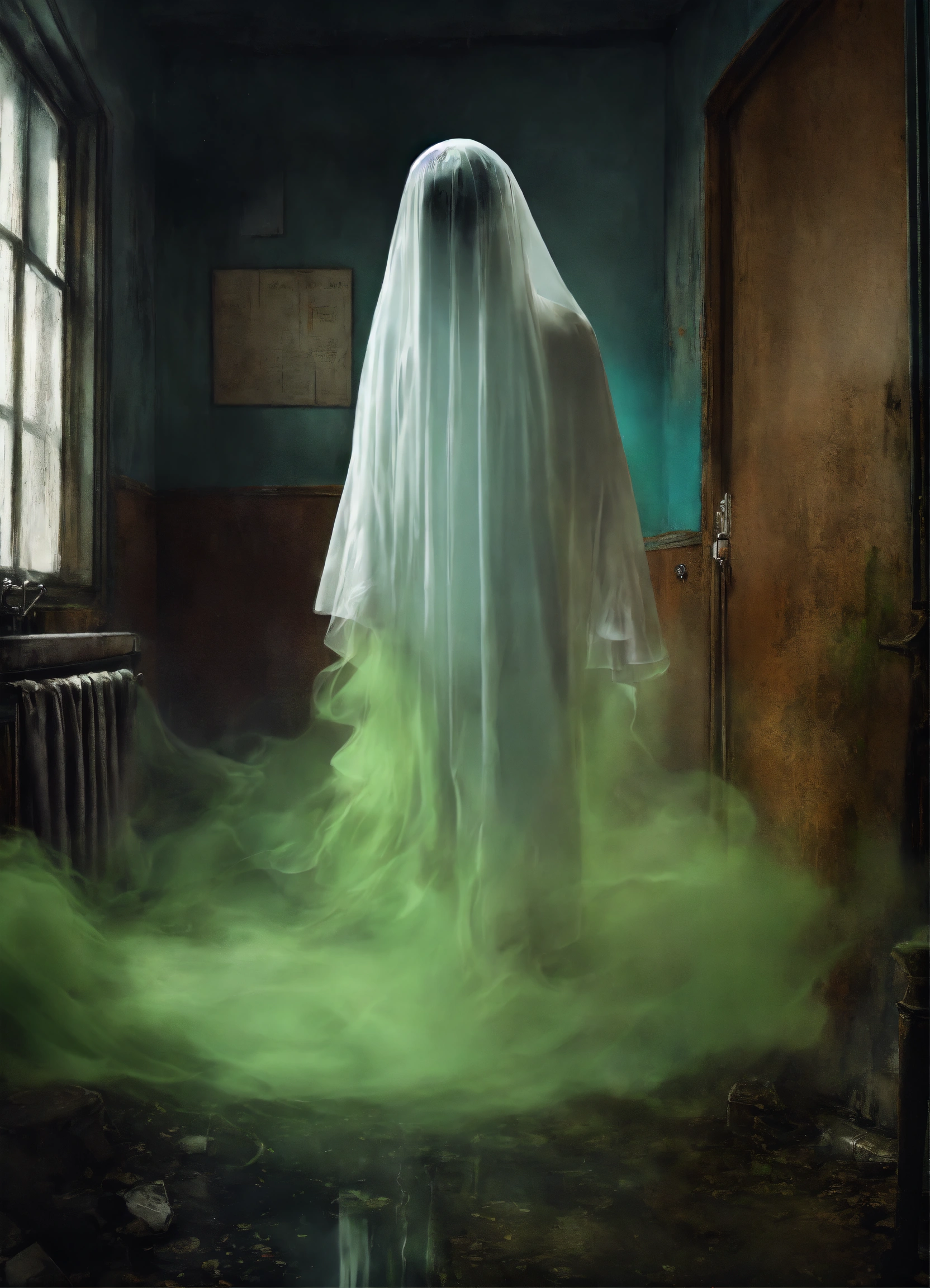 Photo realistic, floating flying ghost see-through, eery, dark, moldy, doctor, dirty water, mental hospital, hair, dishdasha