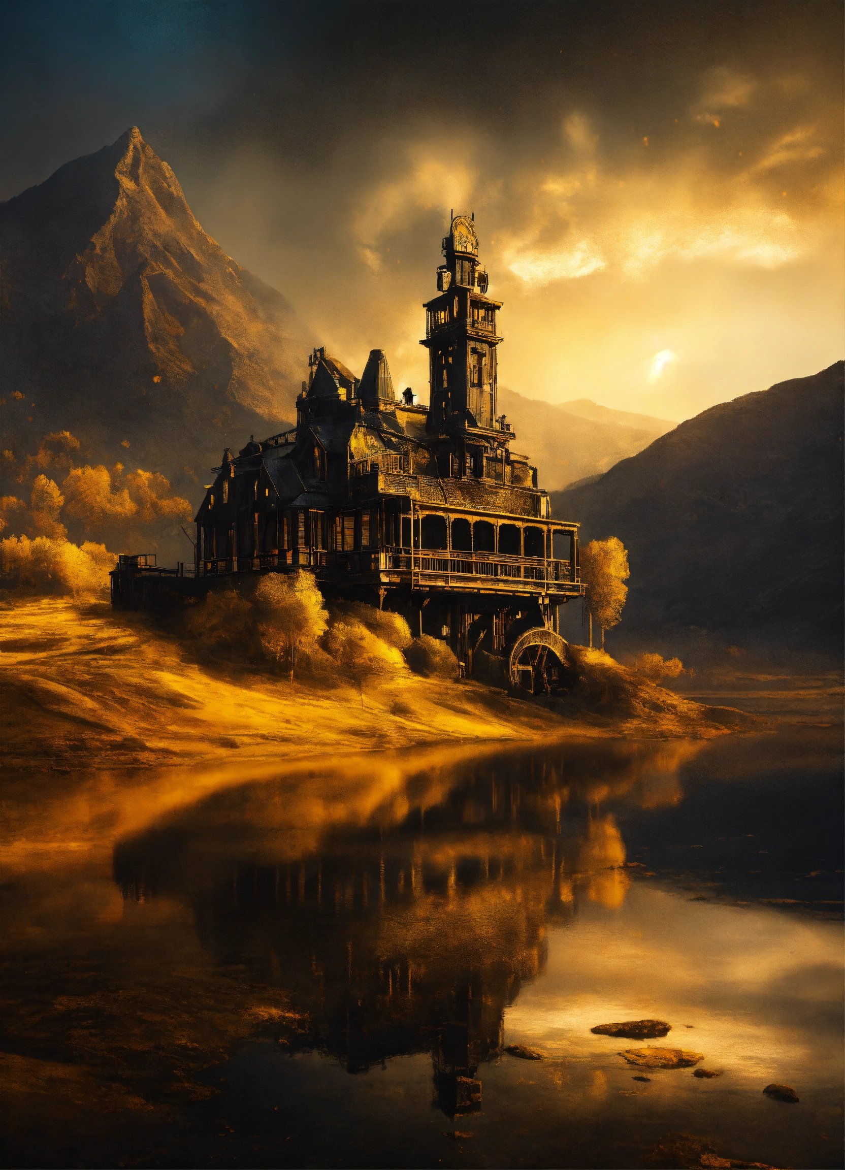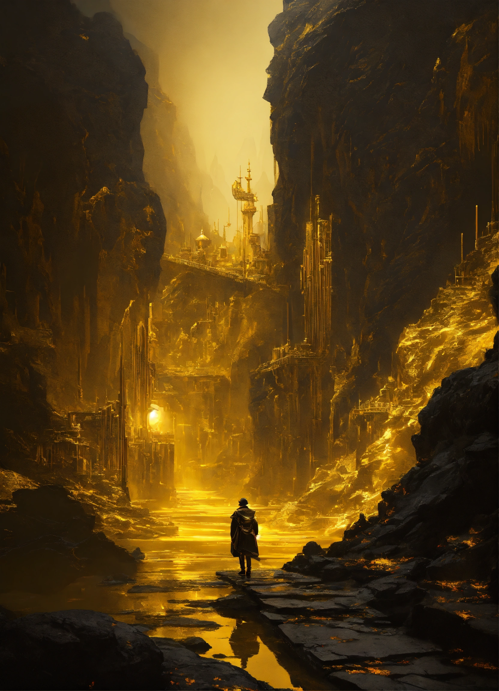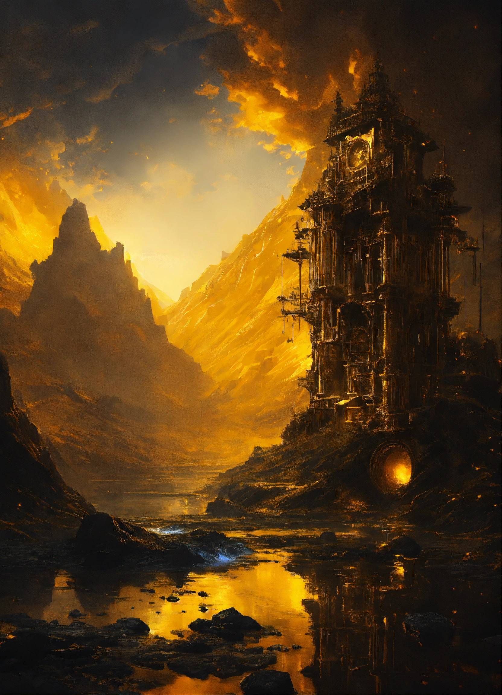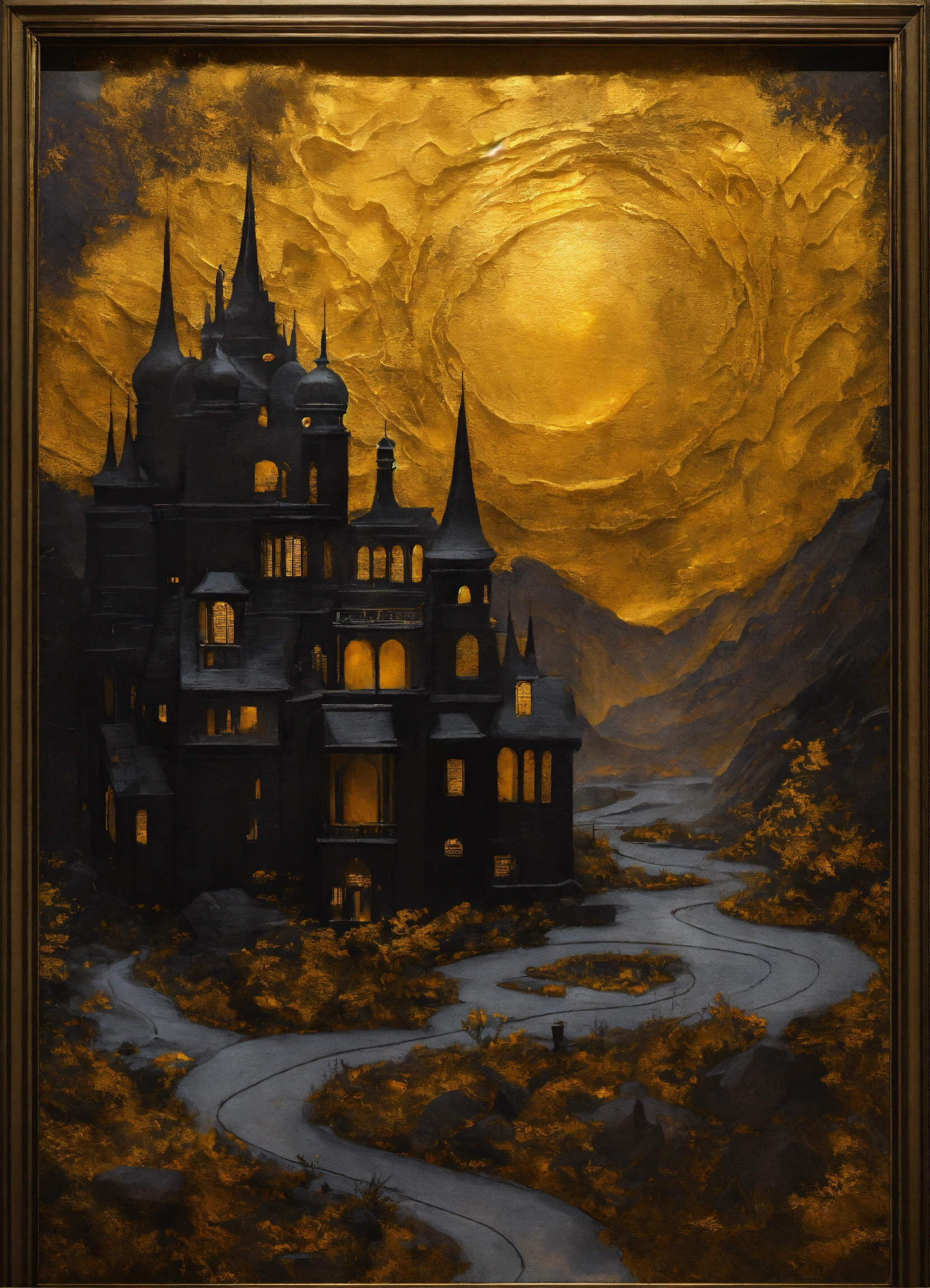 Black is a color associated with mystery and depth, decorated golden backdrop landscape, surreal engine 4