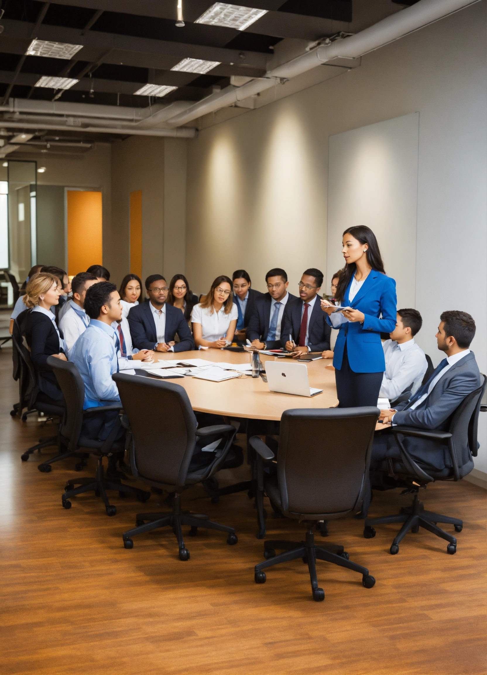 “generate an image of a wise and composed leader standing in a modern office setting, addressing a diverse team of professionals seated around a conference table. the leader should exude confidence and wisdom, perhaps holding notes or pointing towards a presentation. the team members should be engaged, leaning forward attentively, reflecting trust and respect. the overall environment should evoke a sense of mentorship, knowledge sharing, and collaboration.”