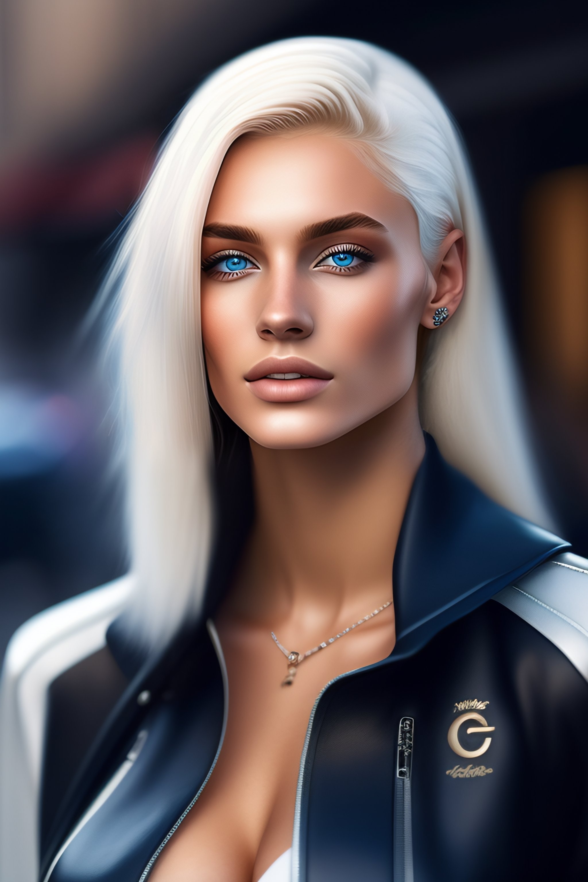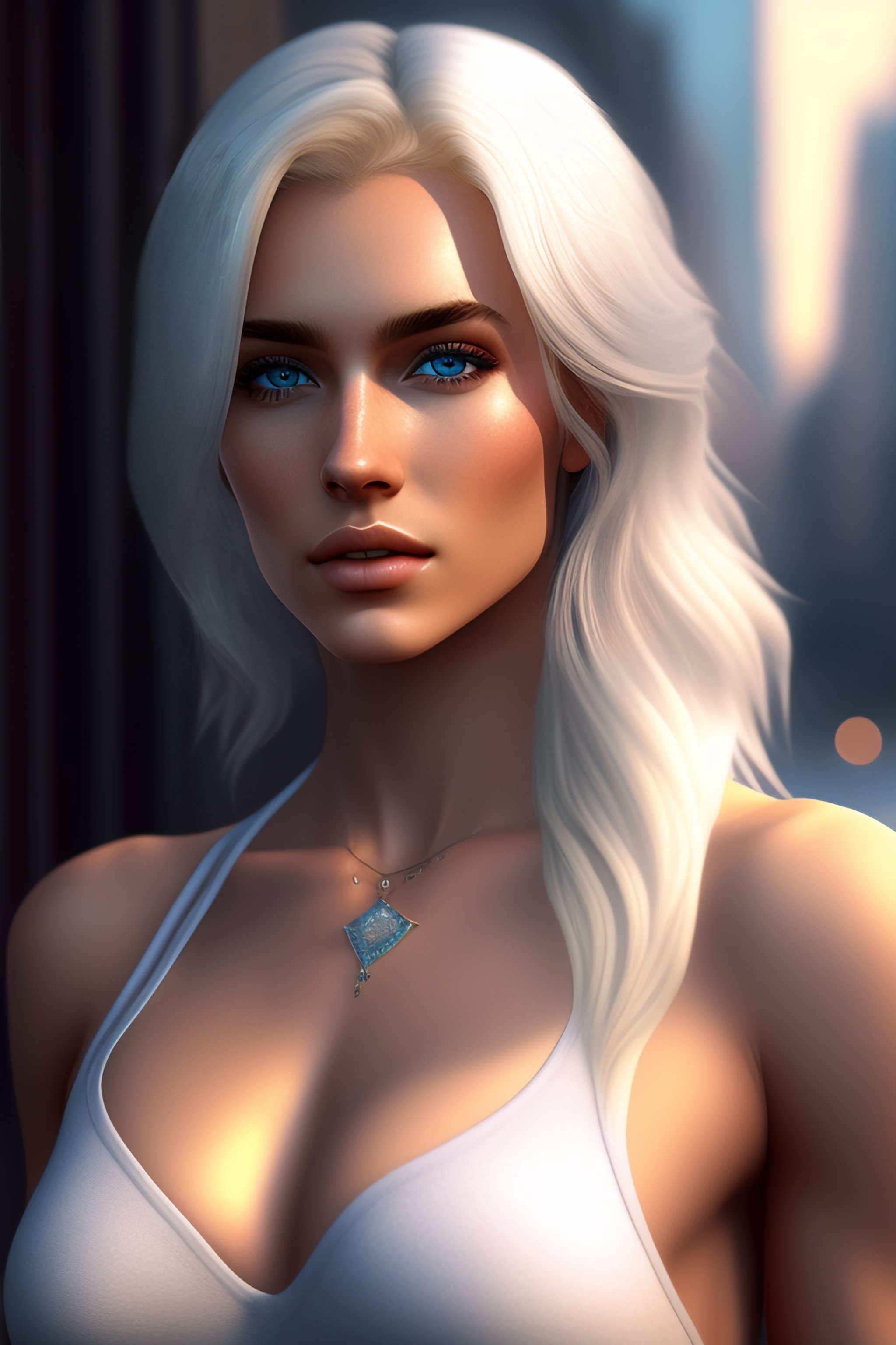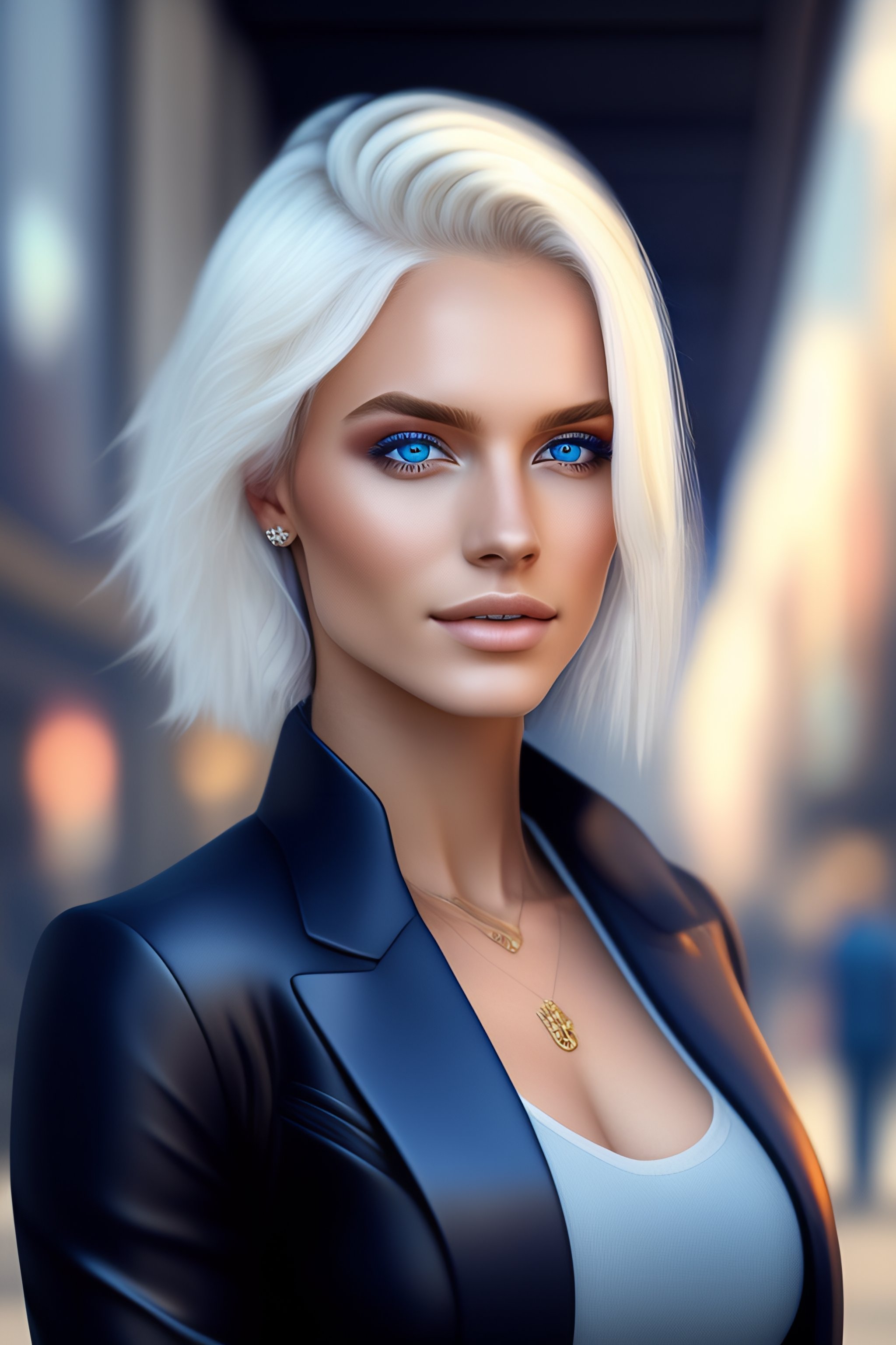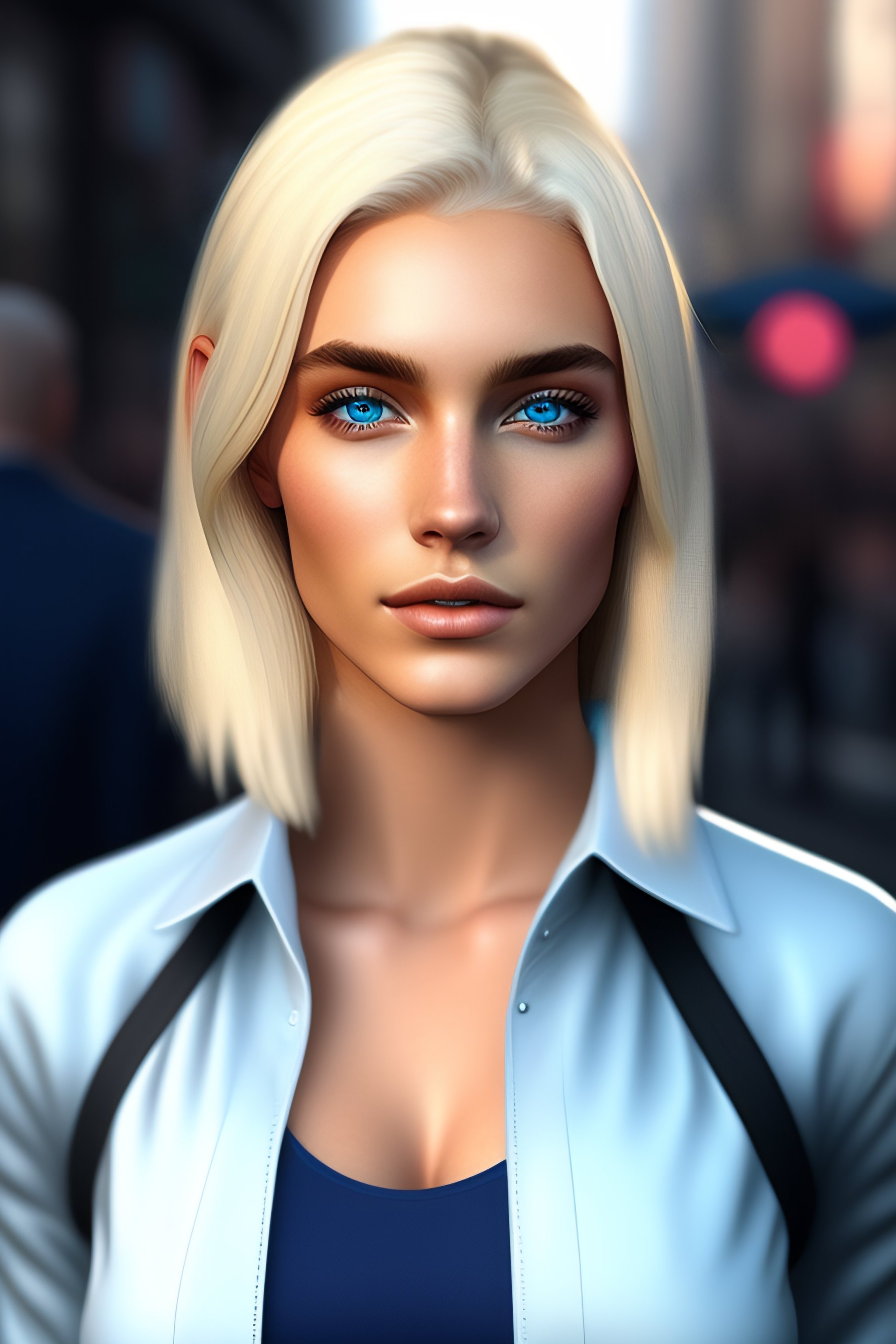 20 year old female, platinum blonde hair, blue eyes, broad shoulders, hyper realistic, urban setting, sexy, wearing cloth
