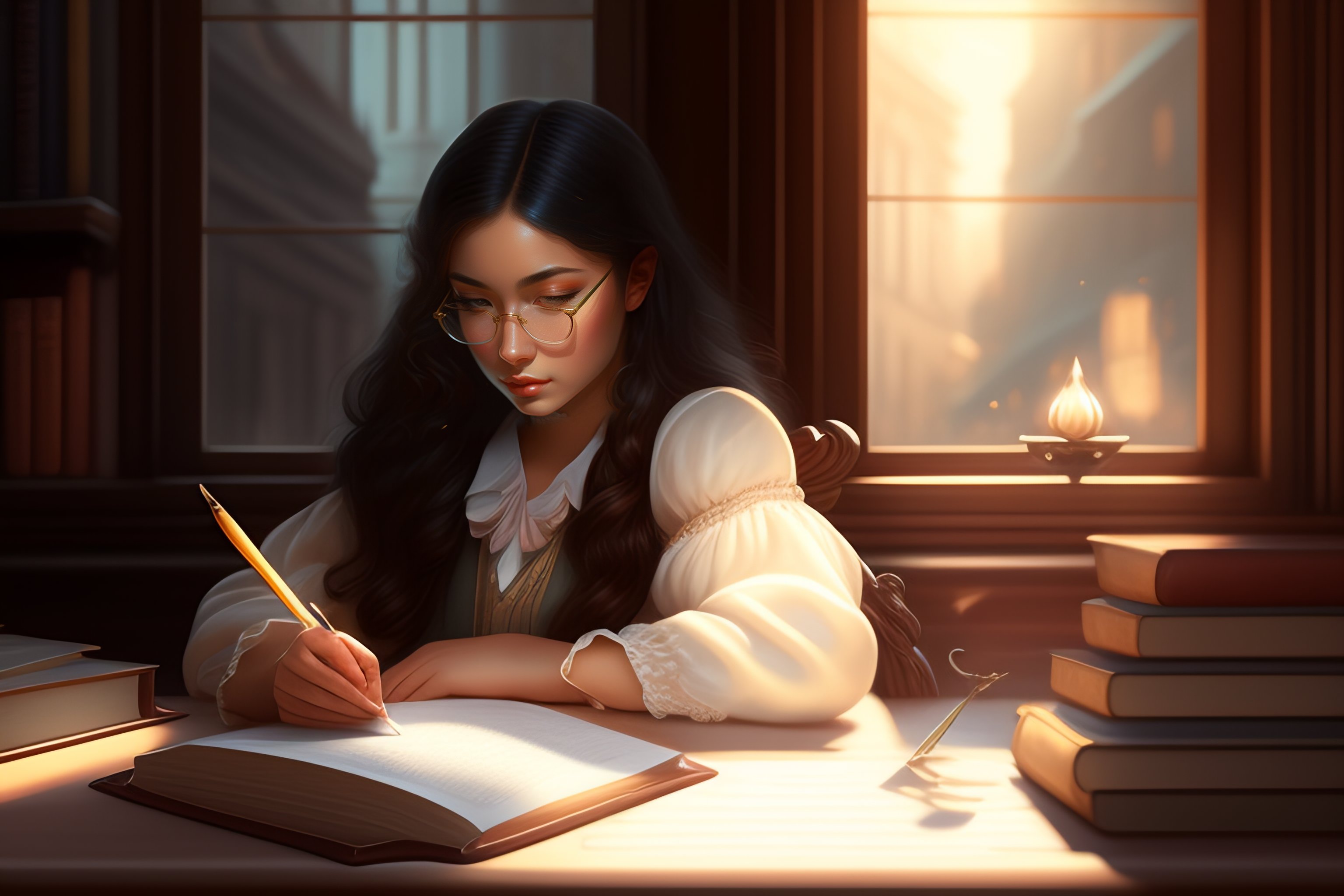 Young female writer, writing a novel, glasses, rococo furniture, window, sun rays, inkwell and quill, vintage books, very detailed, digital painting, artstation, concept art, smooth, sharp focus, illustration, art by wlop, charlie bowater and alexandra fomina