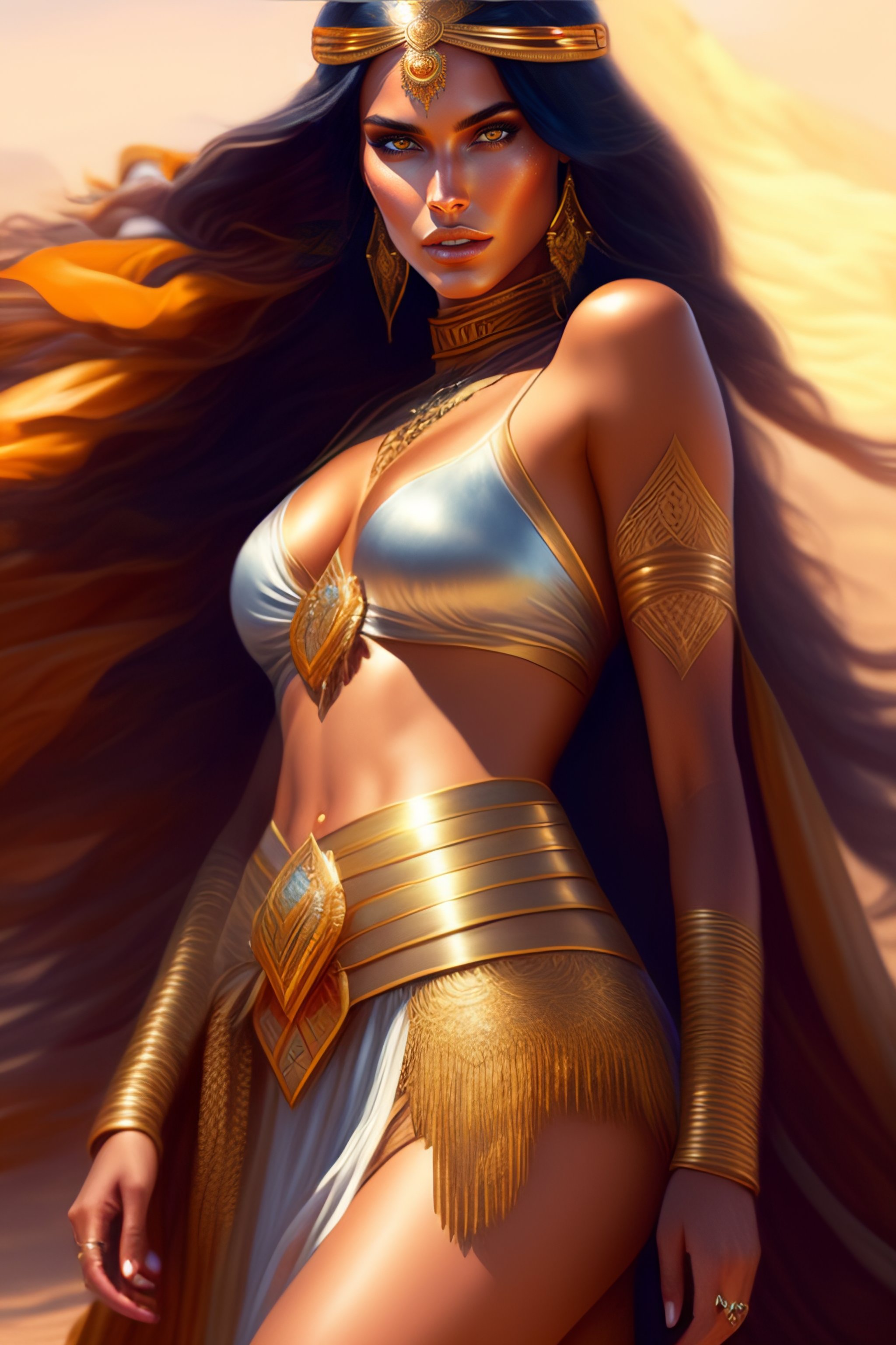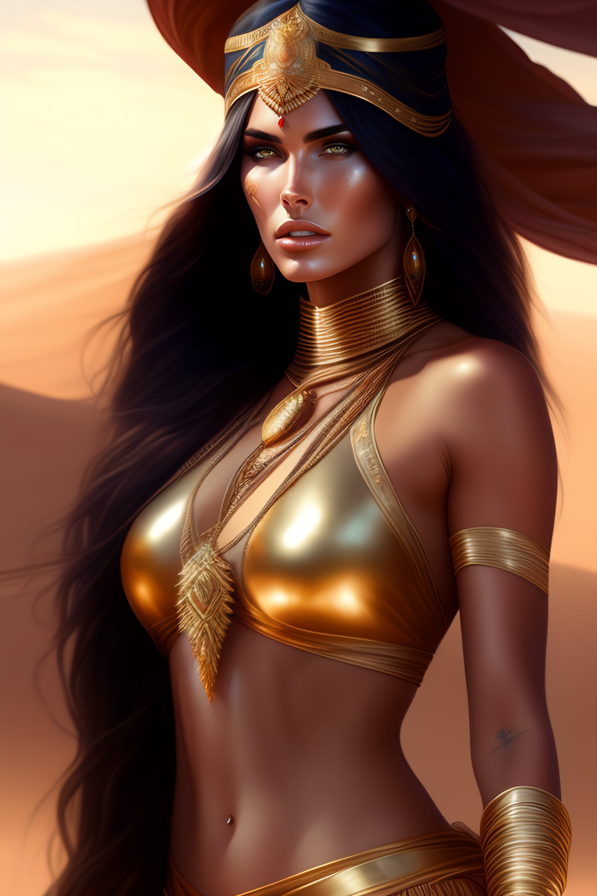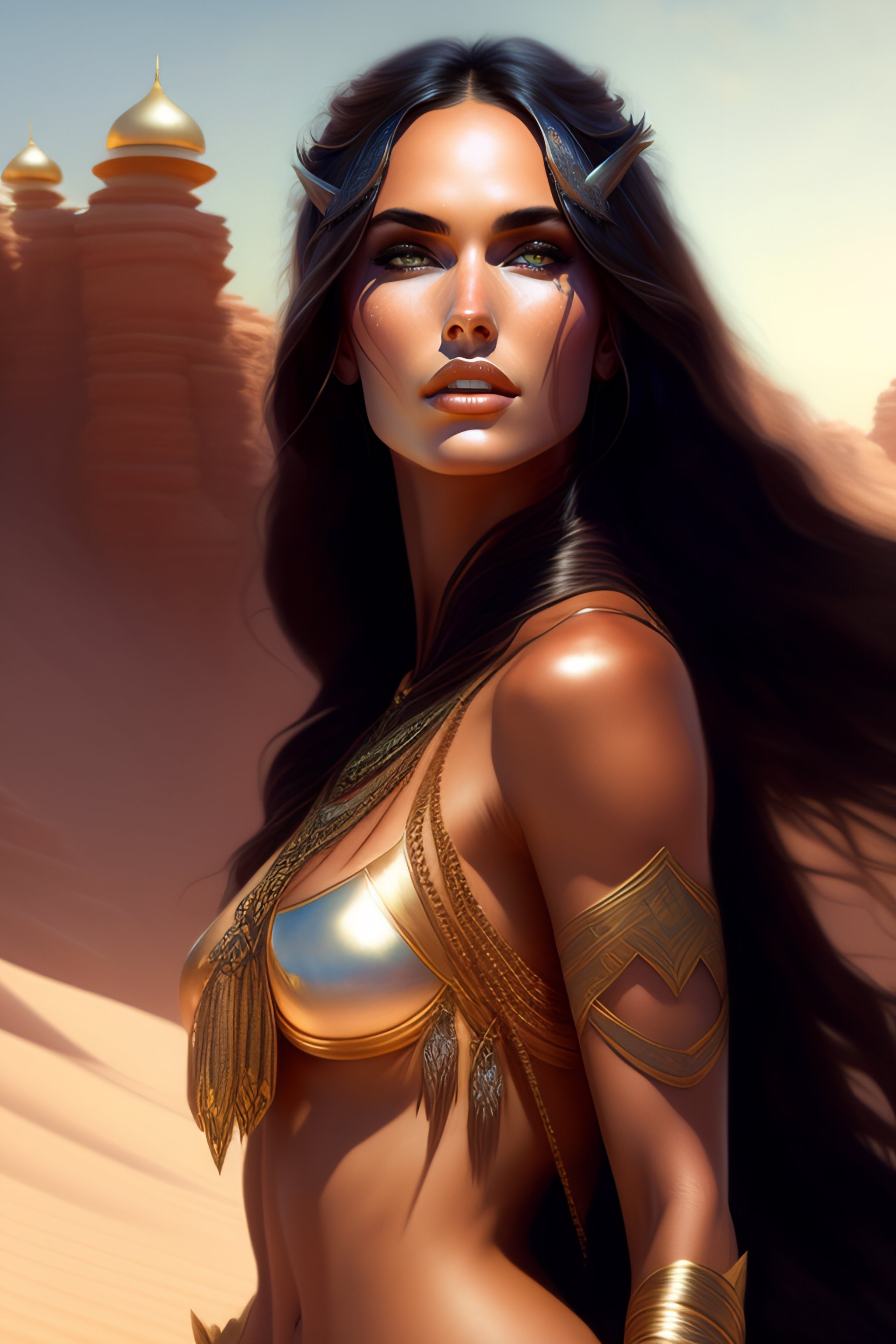 A desert princess megan fox presented as prize to the new king, tanned, sweaty, highly detailed, concept art, smooth, sharp focus, warm cinematic lighting, digital painting by artgerm and greg rutkowski and alphonse mucha
