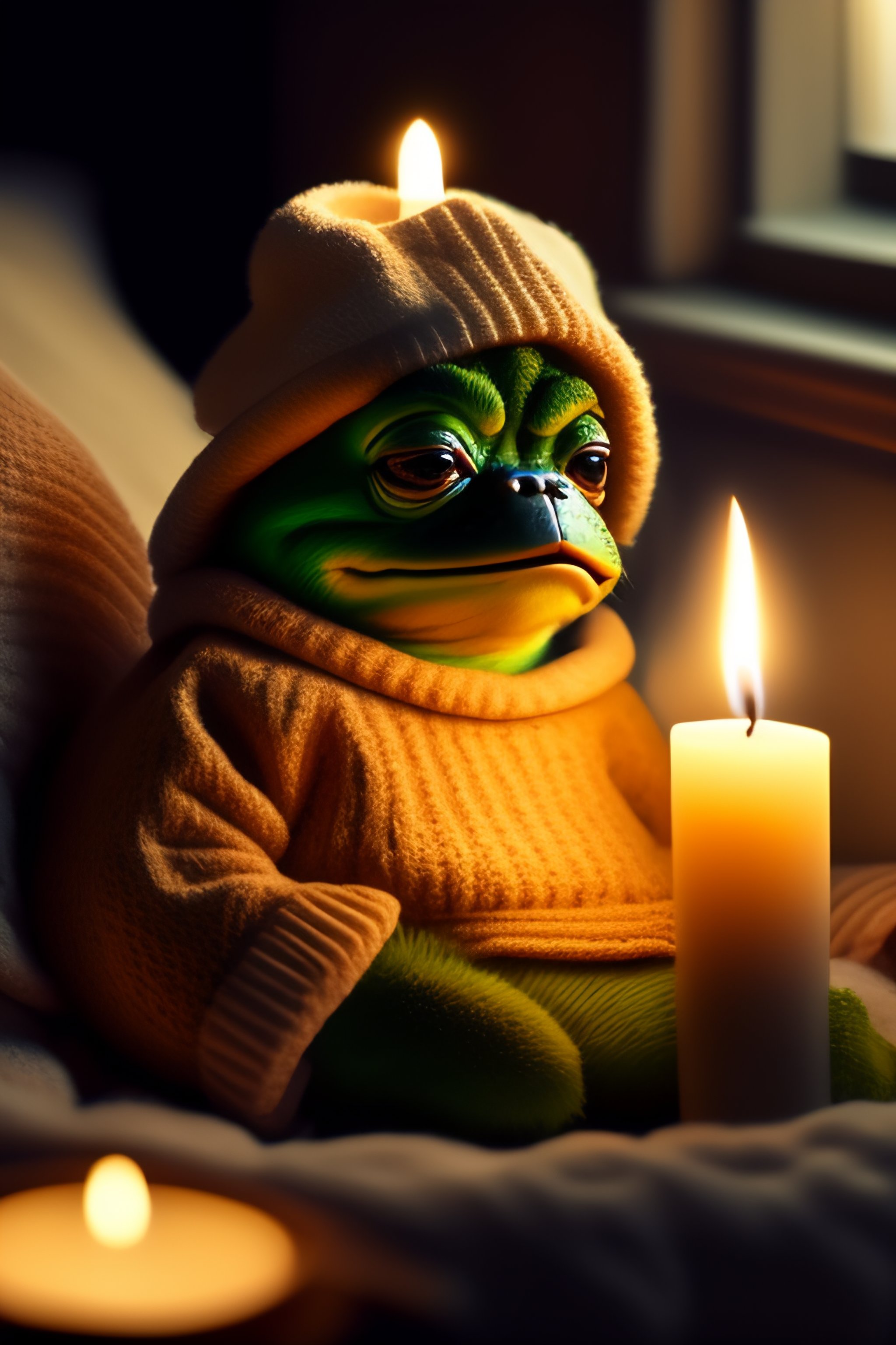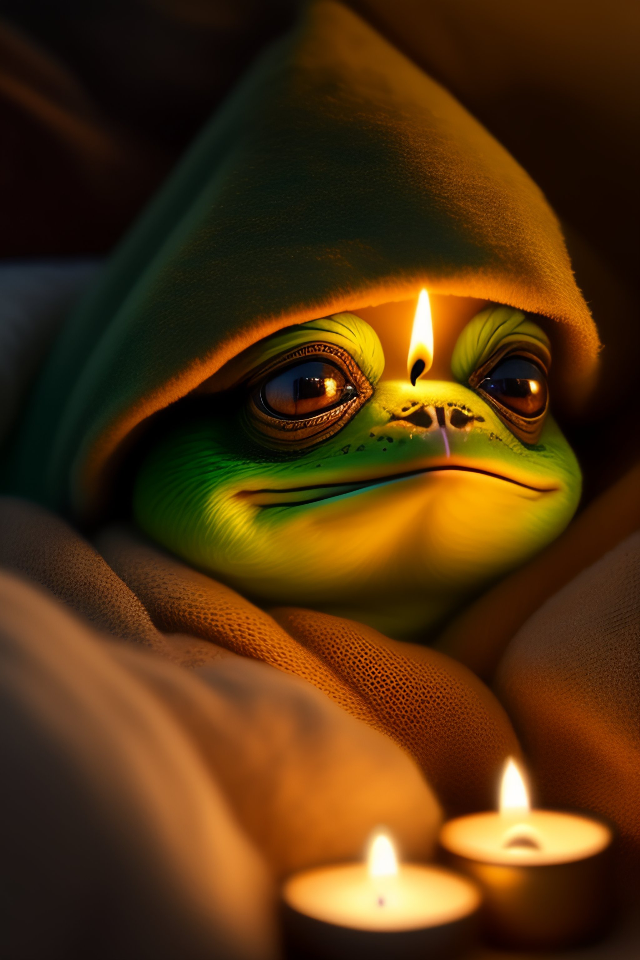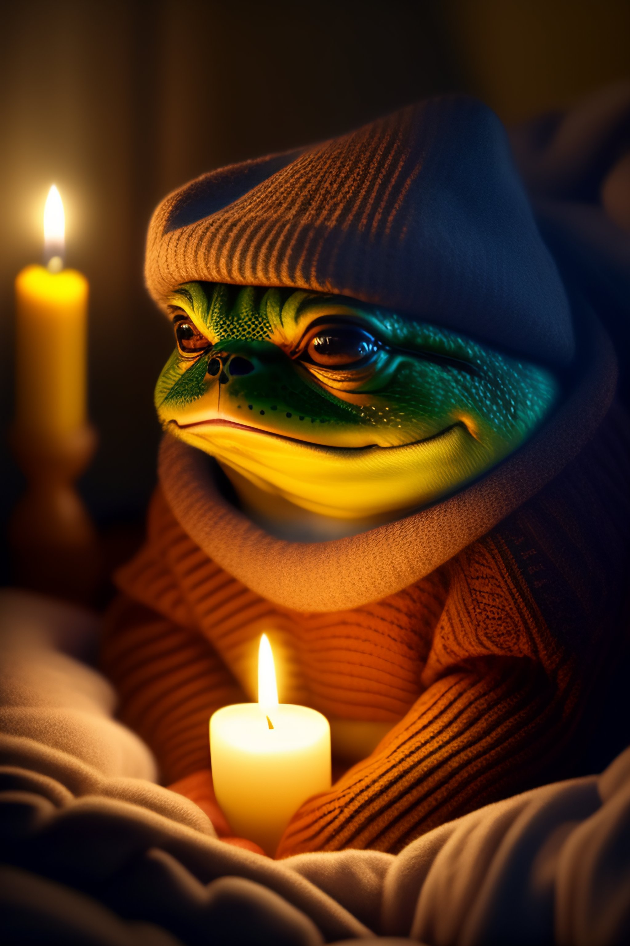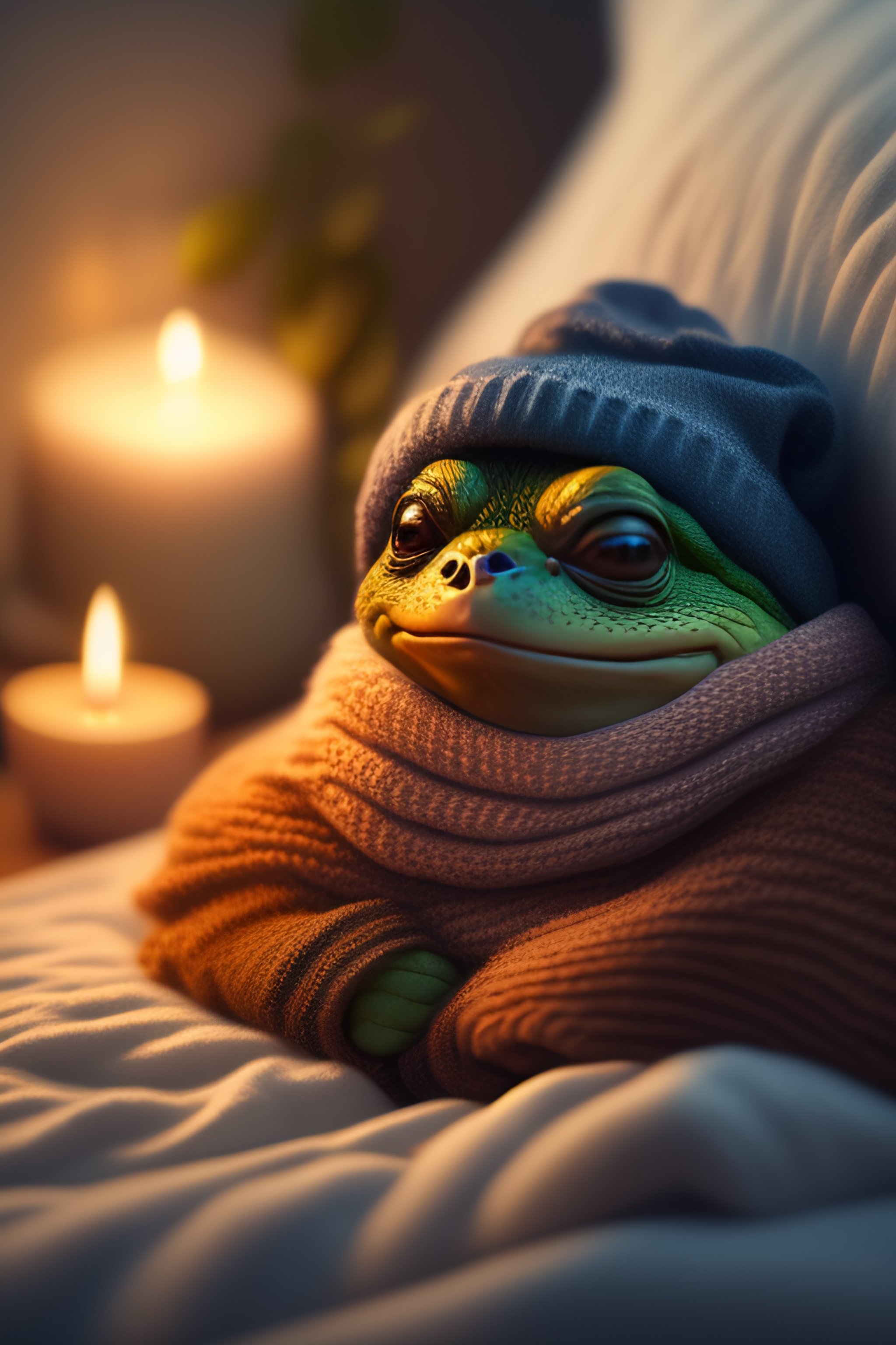 An exhausted pepe the frog in his bed wearing a nightcap, cozy, candlelight, night- key lighting, soft lights, foggy, by steve hanks, by lisa yuskavage, by serov valentin, by tarkovsky, 8 k render, detailed, cute cartoon style, very cute face