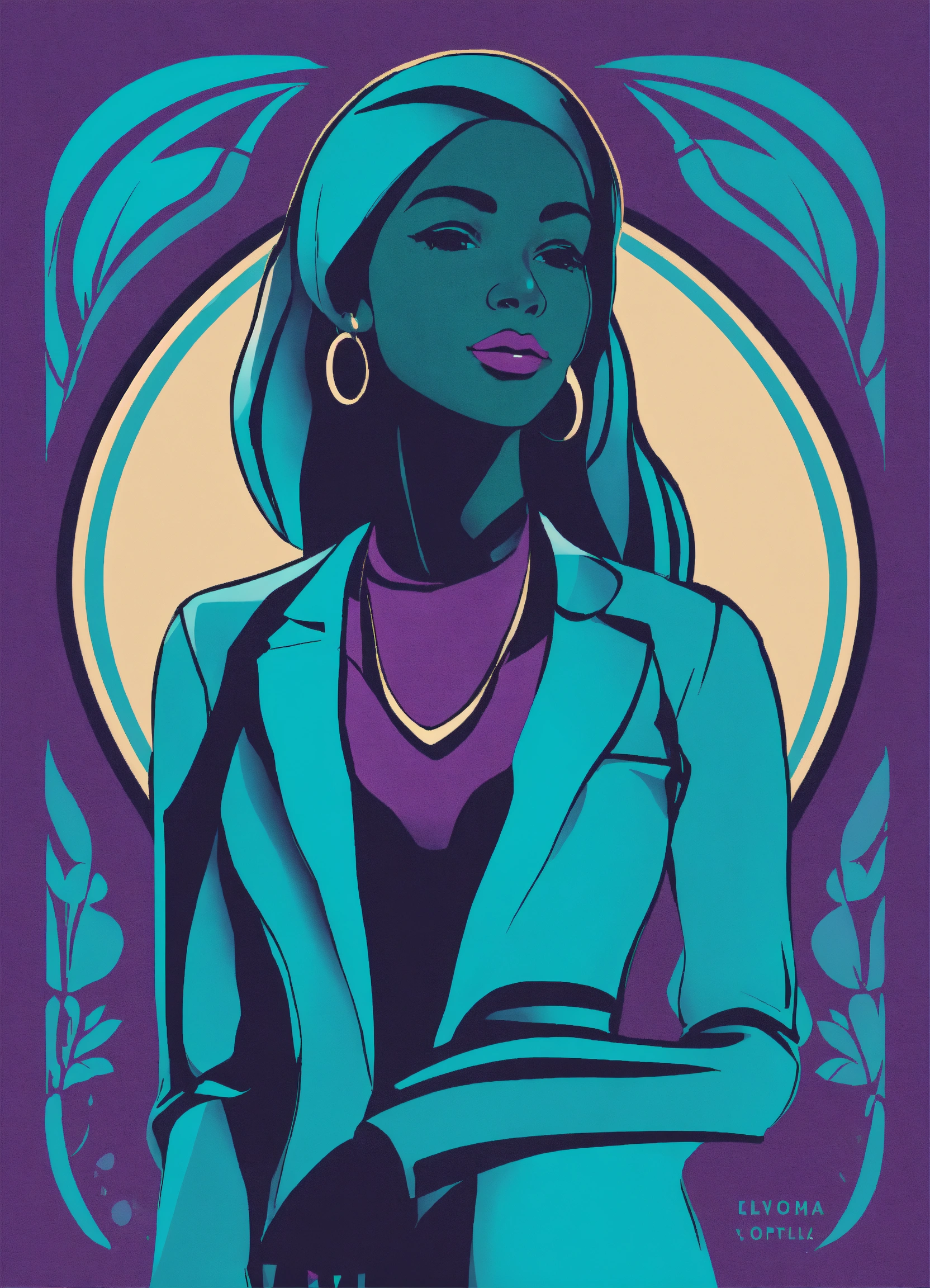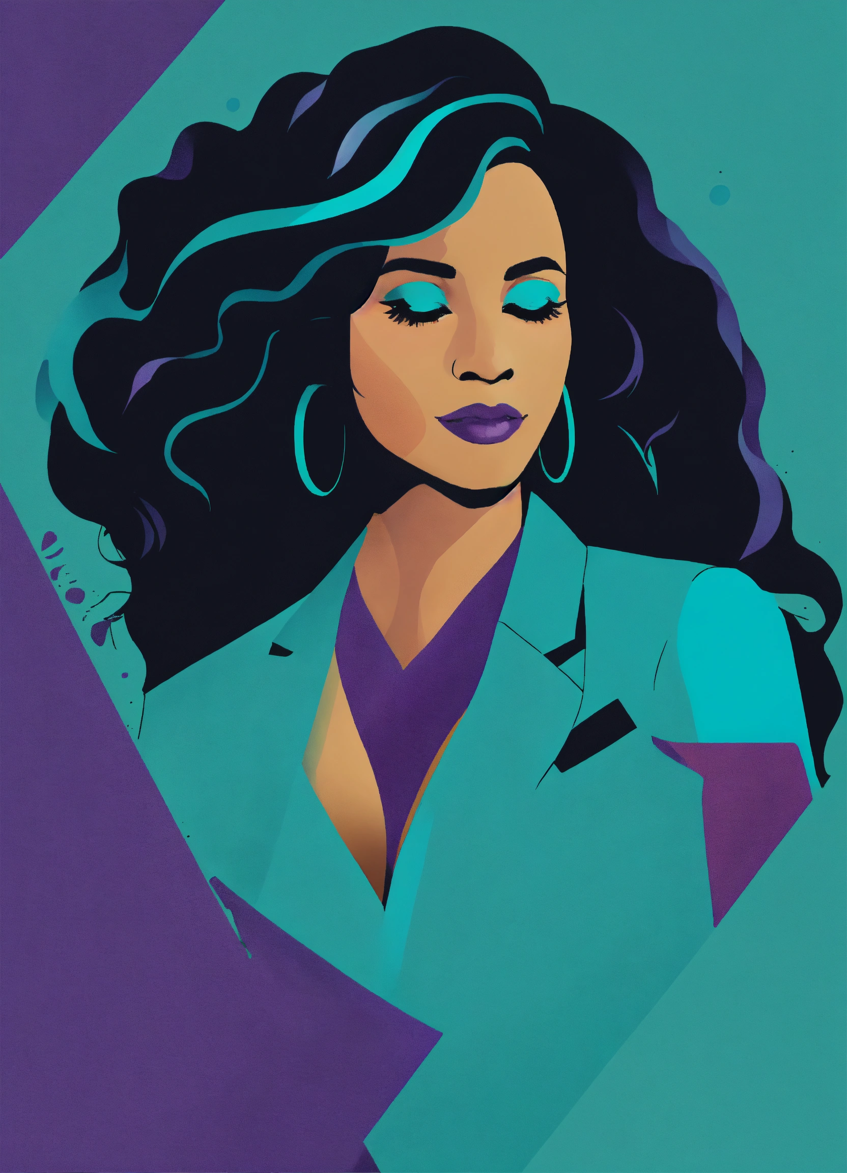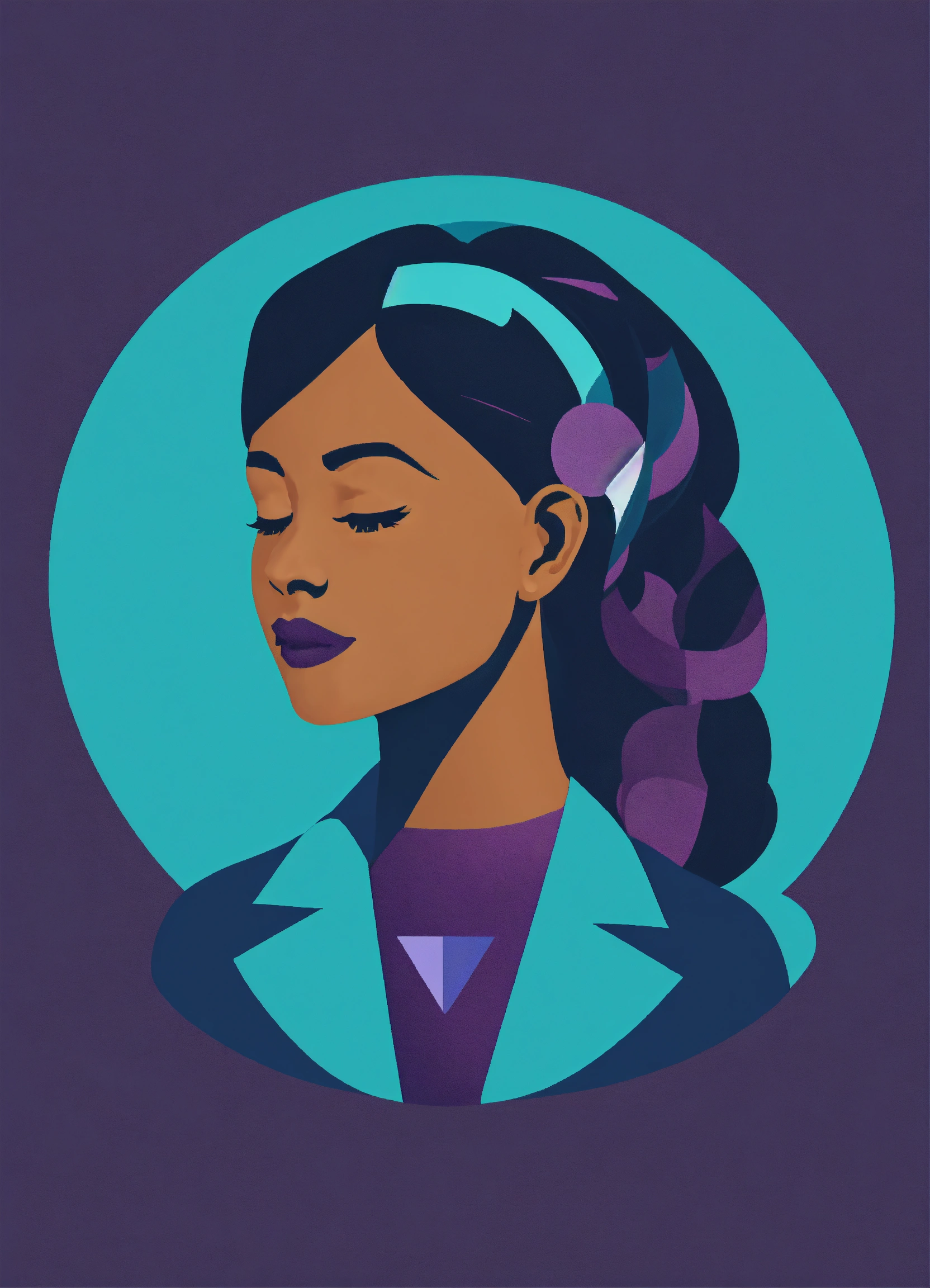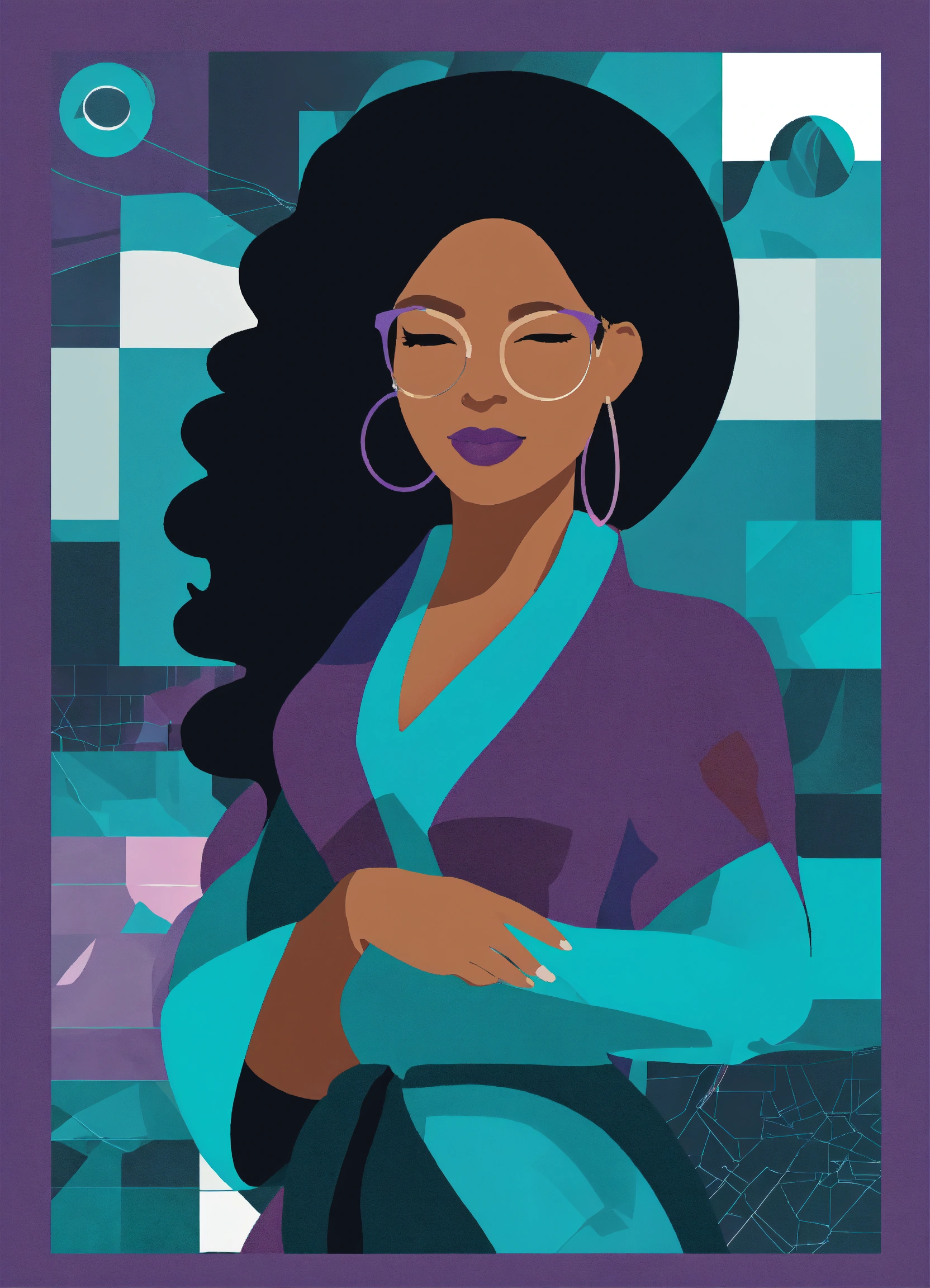 Vector icon that represents a woman of color embracing her value in the stem industries. colors teals. blues, purples and black\