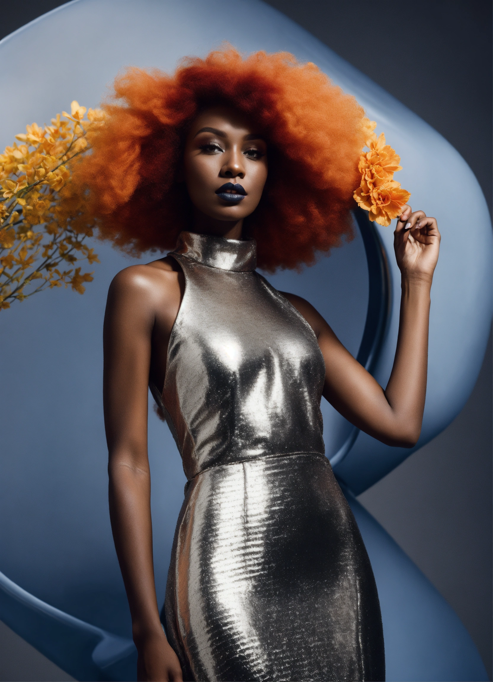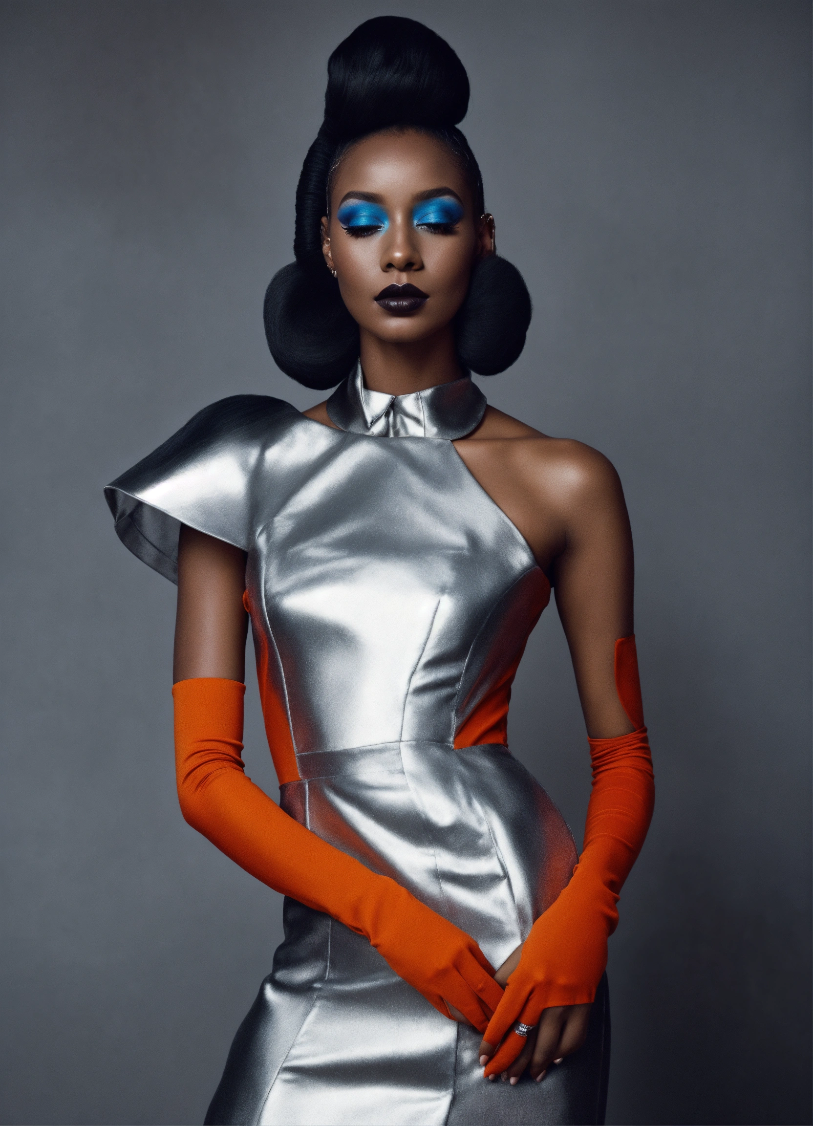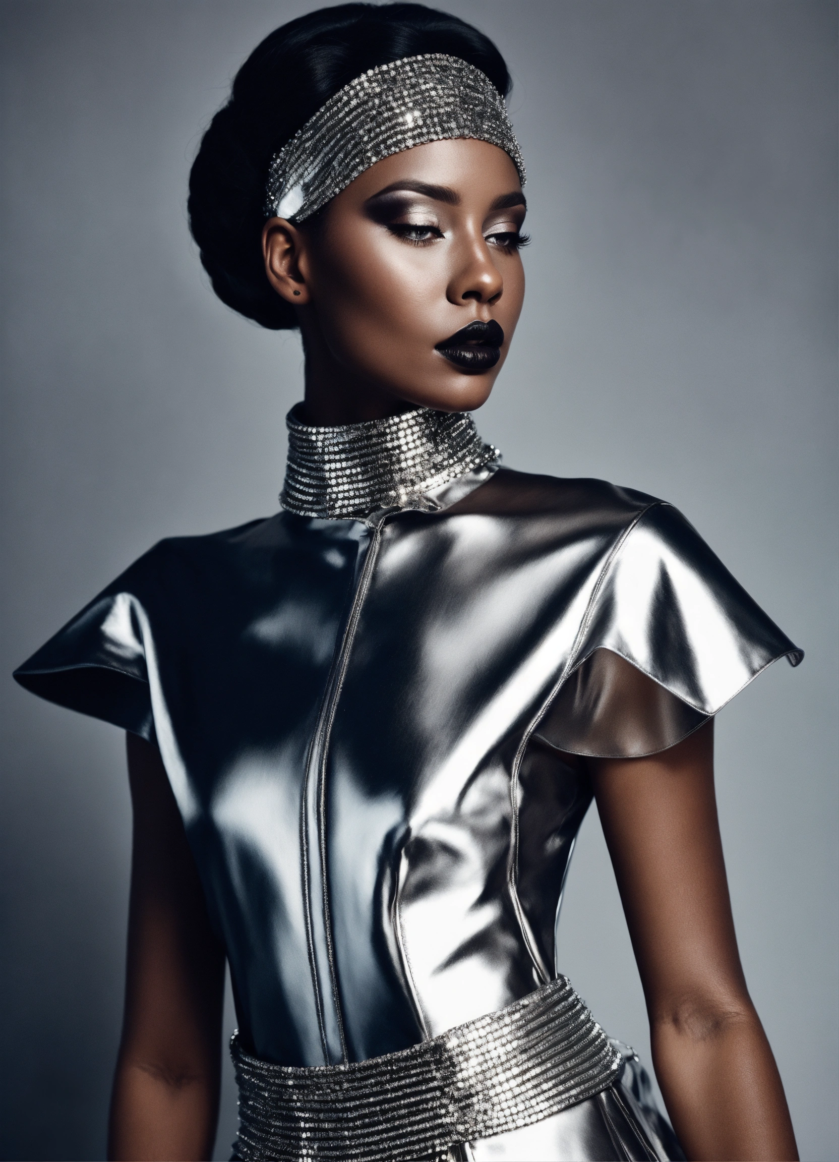 Avante garde high fashion beauty editorial, carmel complexion size 9 black woman dress in silver by flora borsi, style by flora borsi, bold, bright coolers, conceptual bob style hair, ((flora borsi))