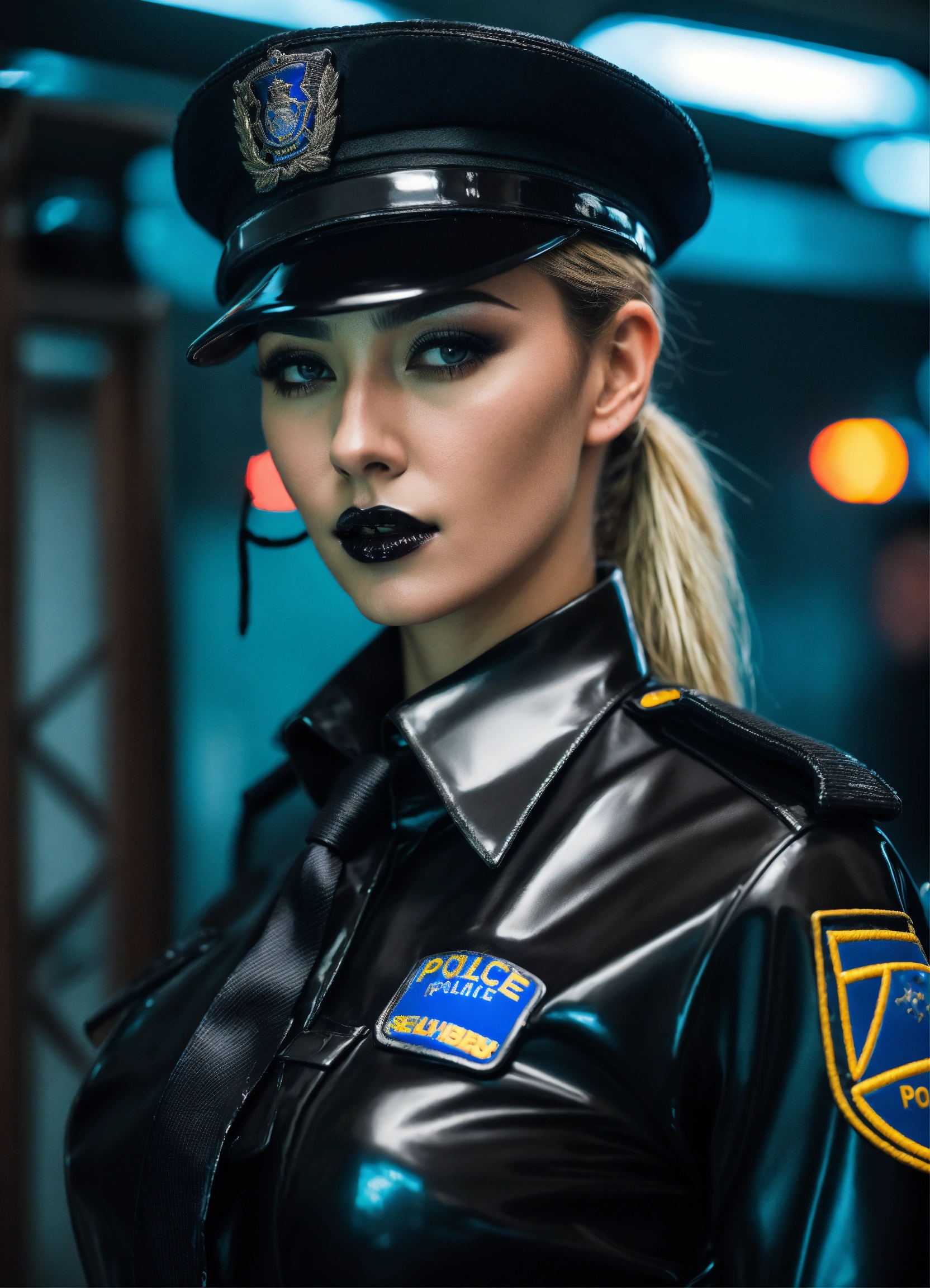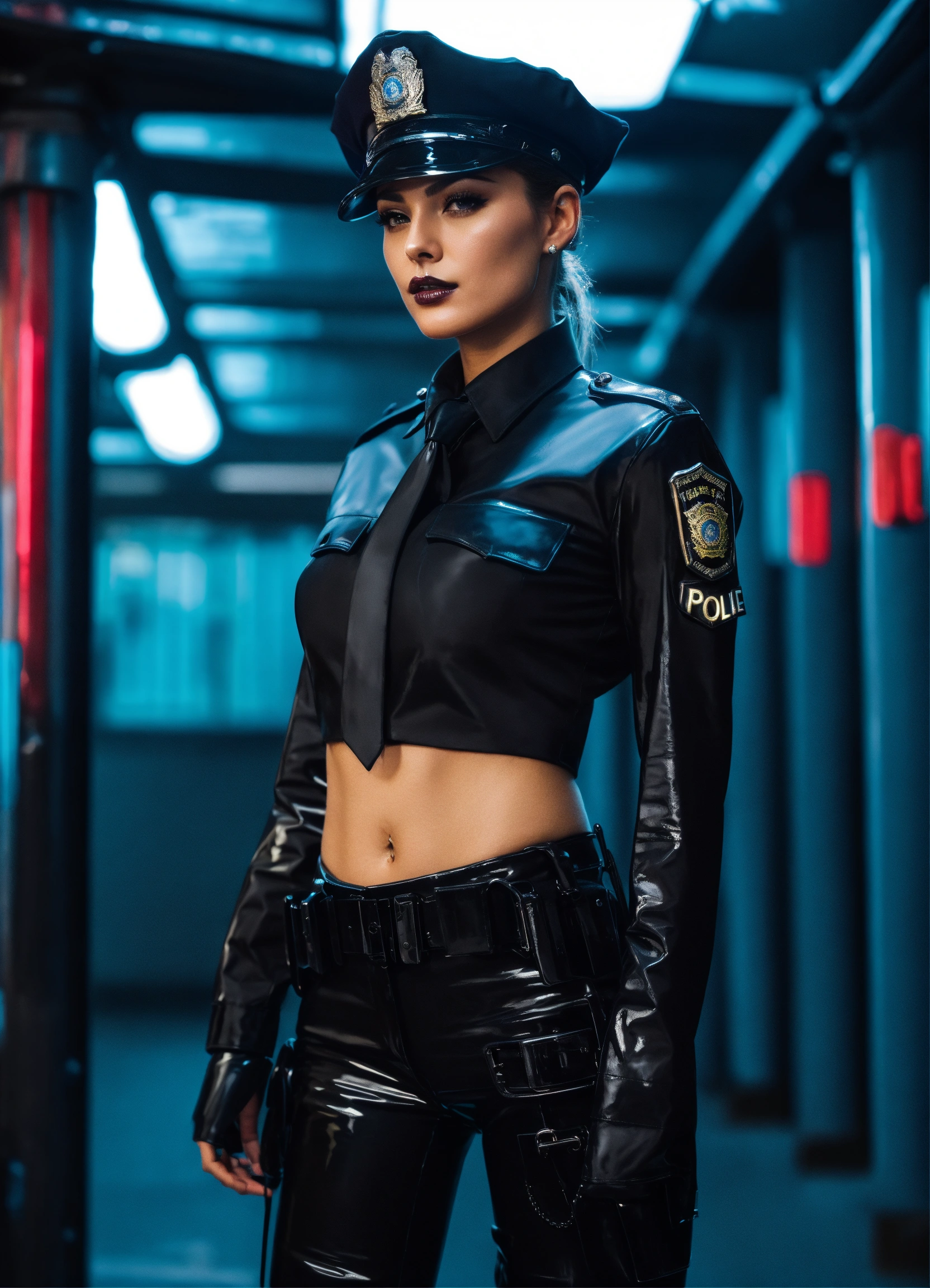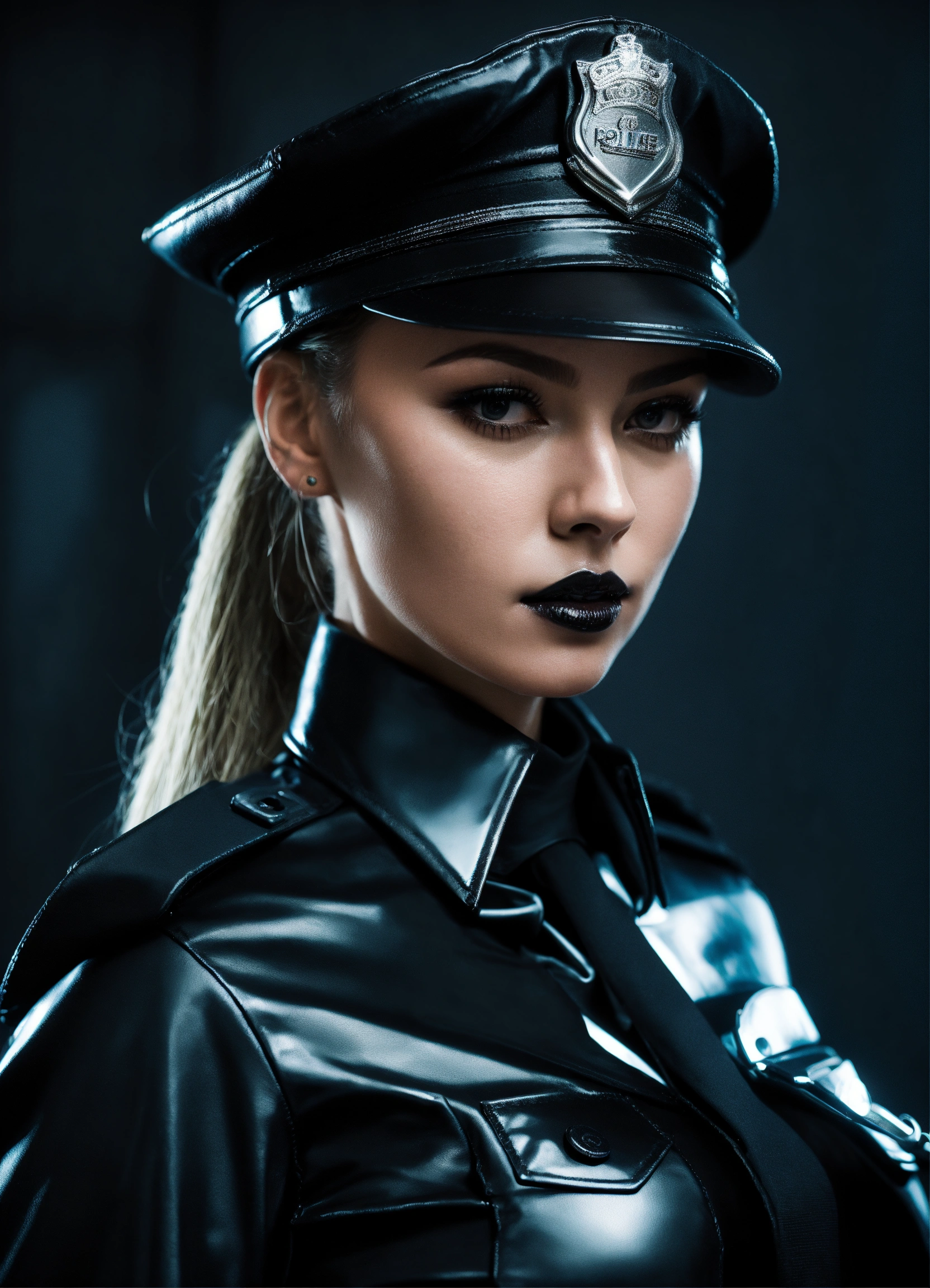 Cyberpunk, stunning french seductress woman fashion model, straight high ponytail black, black pvc officer police uniform, officer shirt and necktie, black pvc police cap, prison