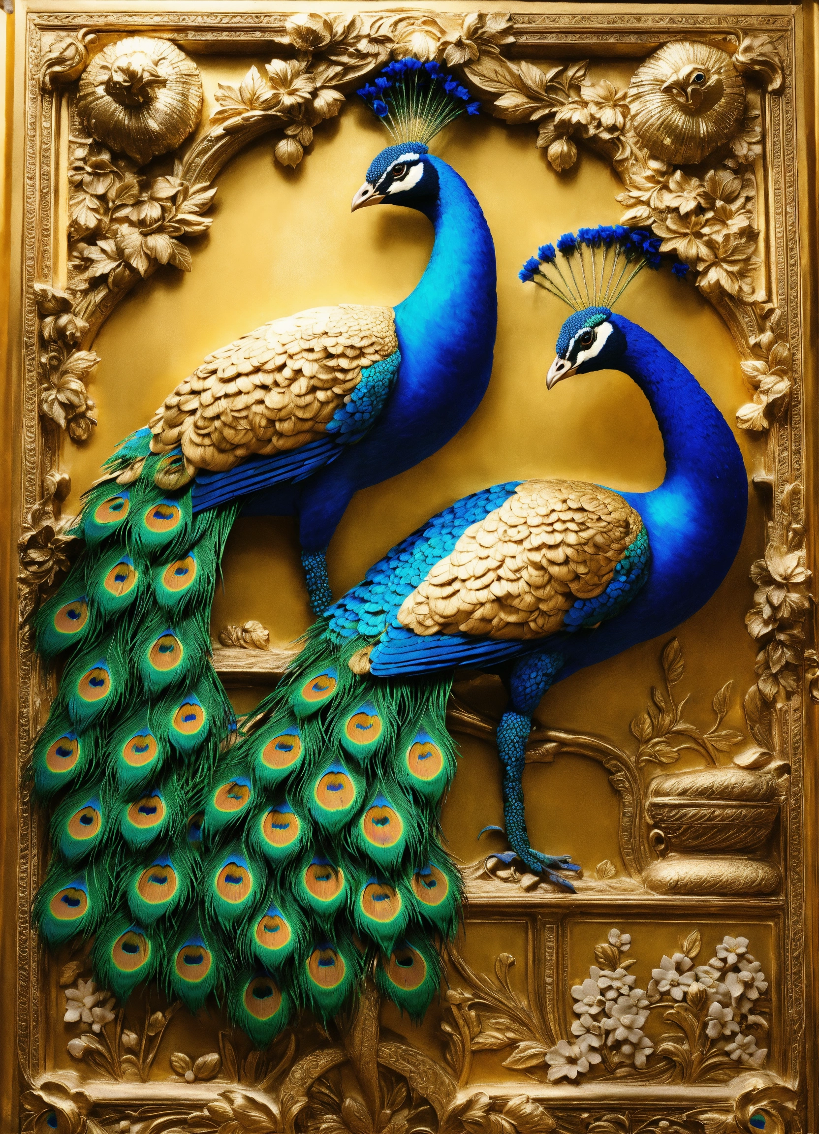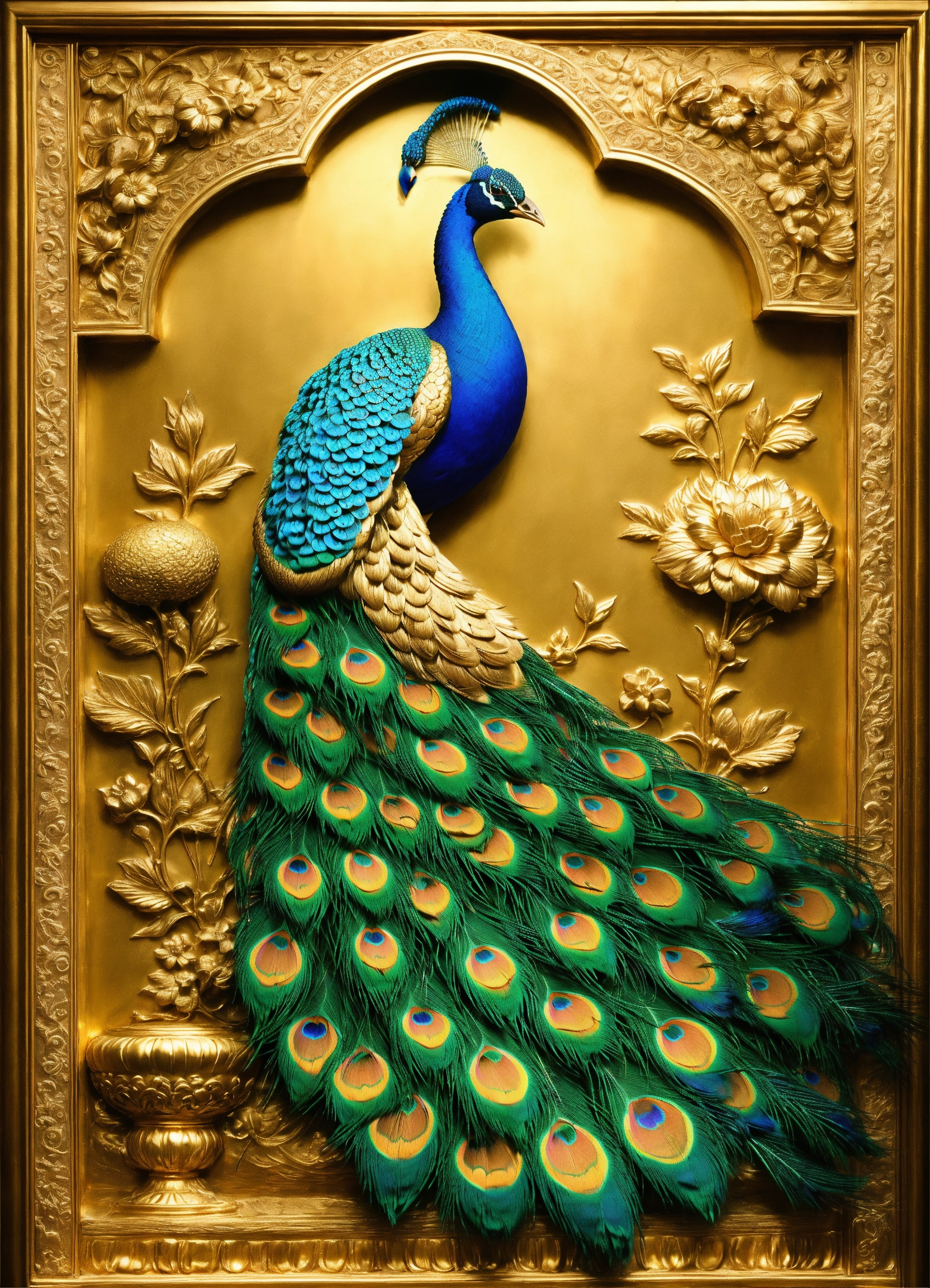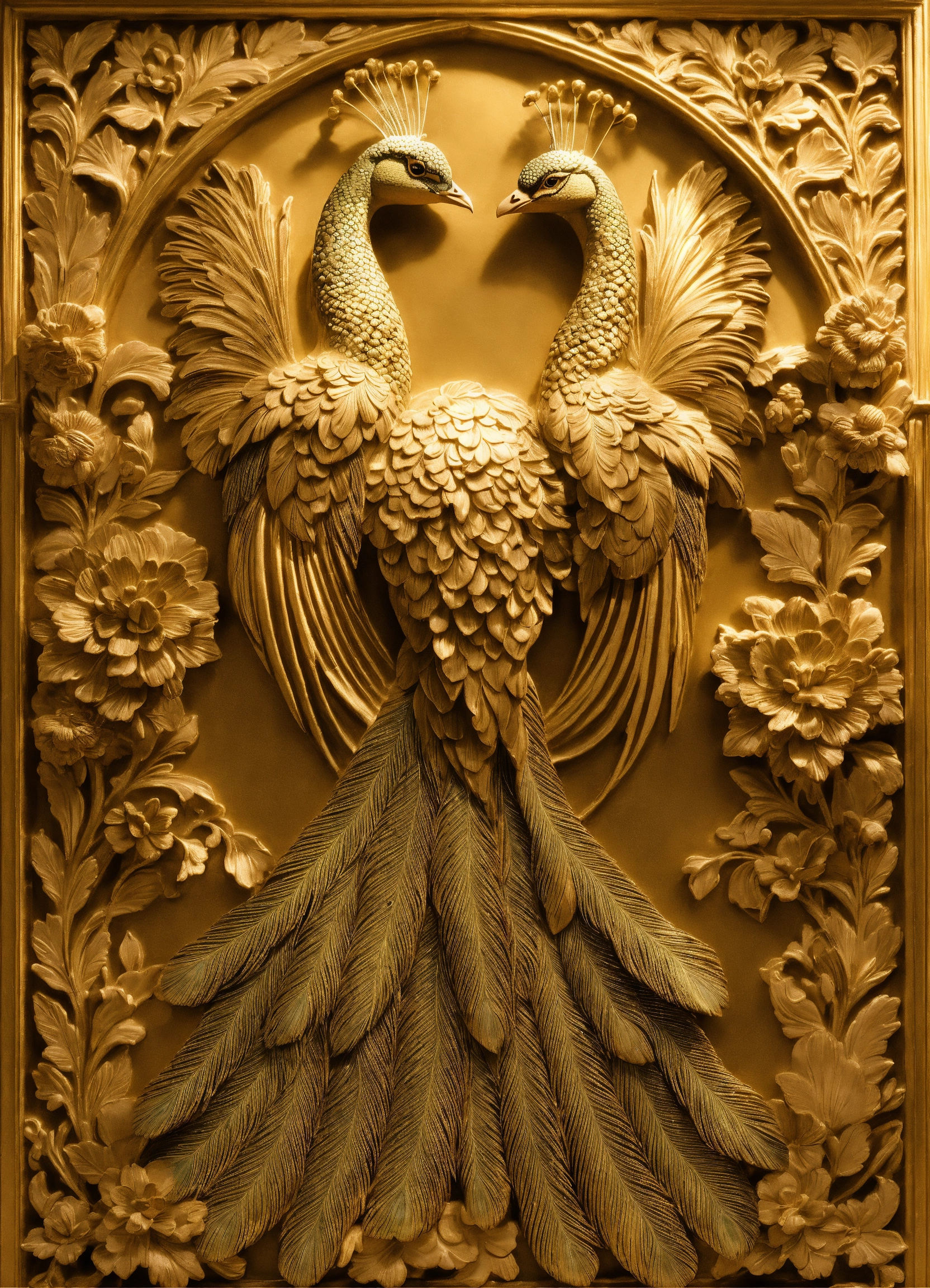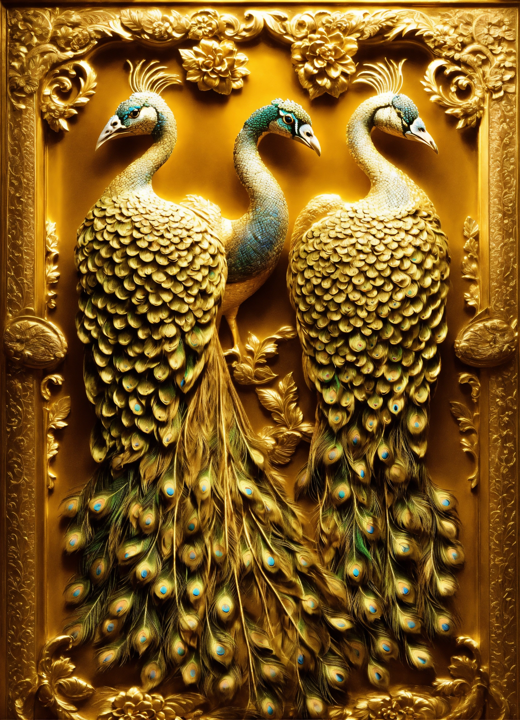 Relief, plaster, 4k, volume, high detail, sculpture, plants, the background is golden, smooth, gypsum, bas-relief, center, decorative pattern, classical ornament, motif, symmetry, flowers, buds, blooming buds, highly detailed volumetric plaster work, exotic flowers, bas-relief of flowers, painting, beautiful composition, peacock with an open tail, a pair of peacocks, the golden ratio, the big picture, the open tail is beautiful, female peacock, male peacock, the composition is beautiful, male's open tail