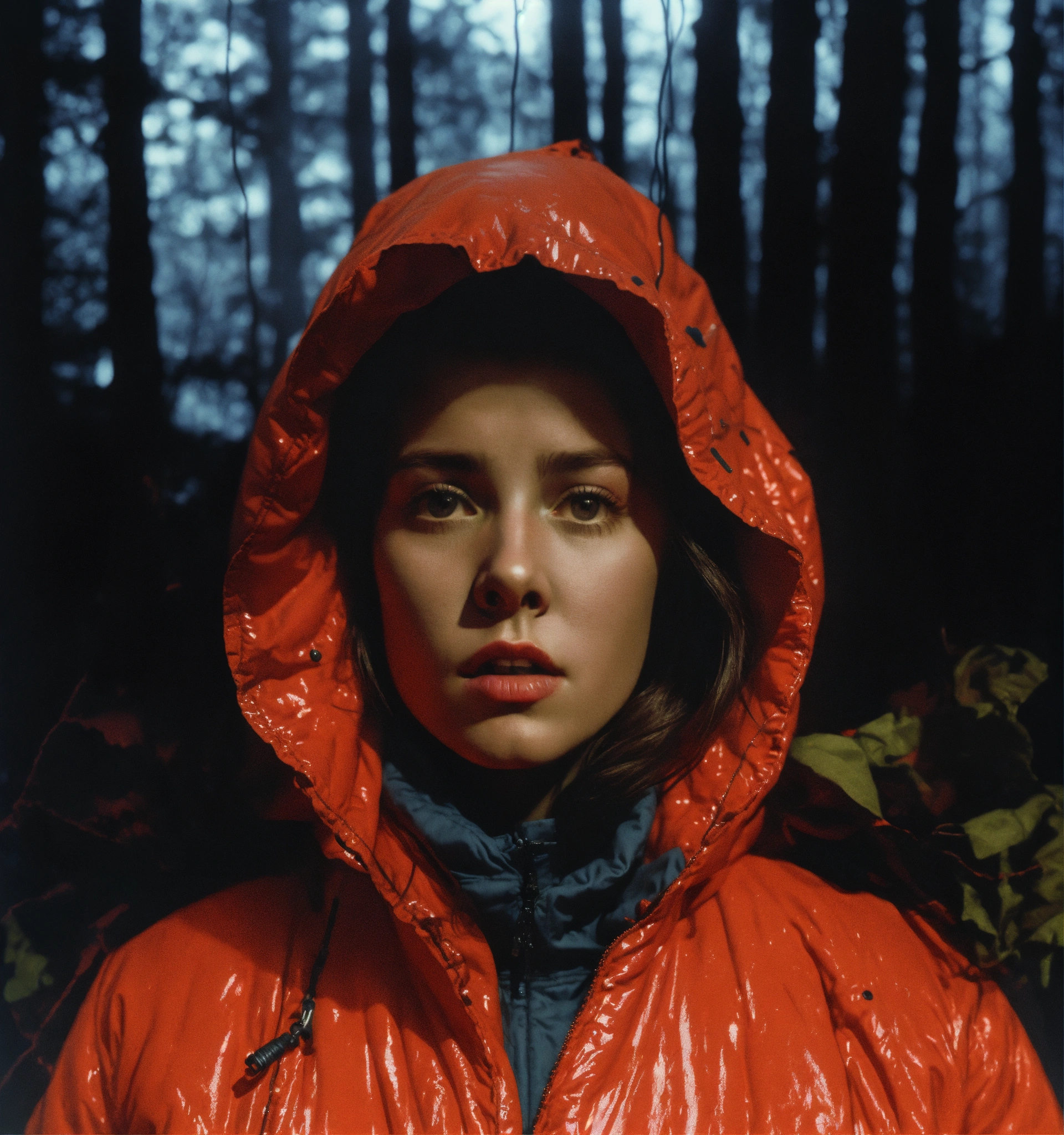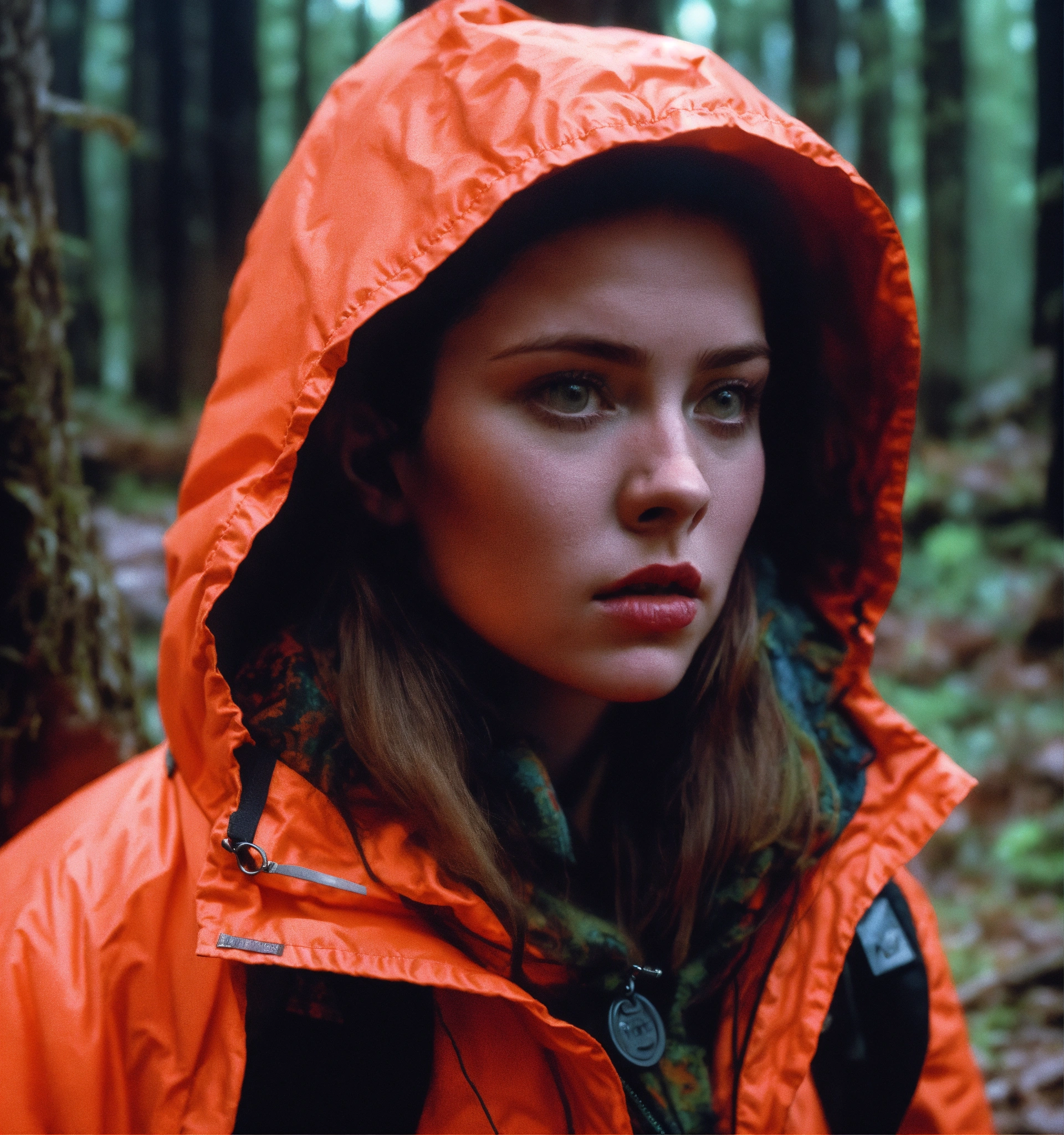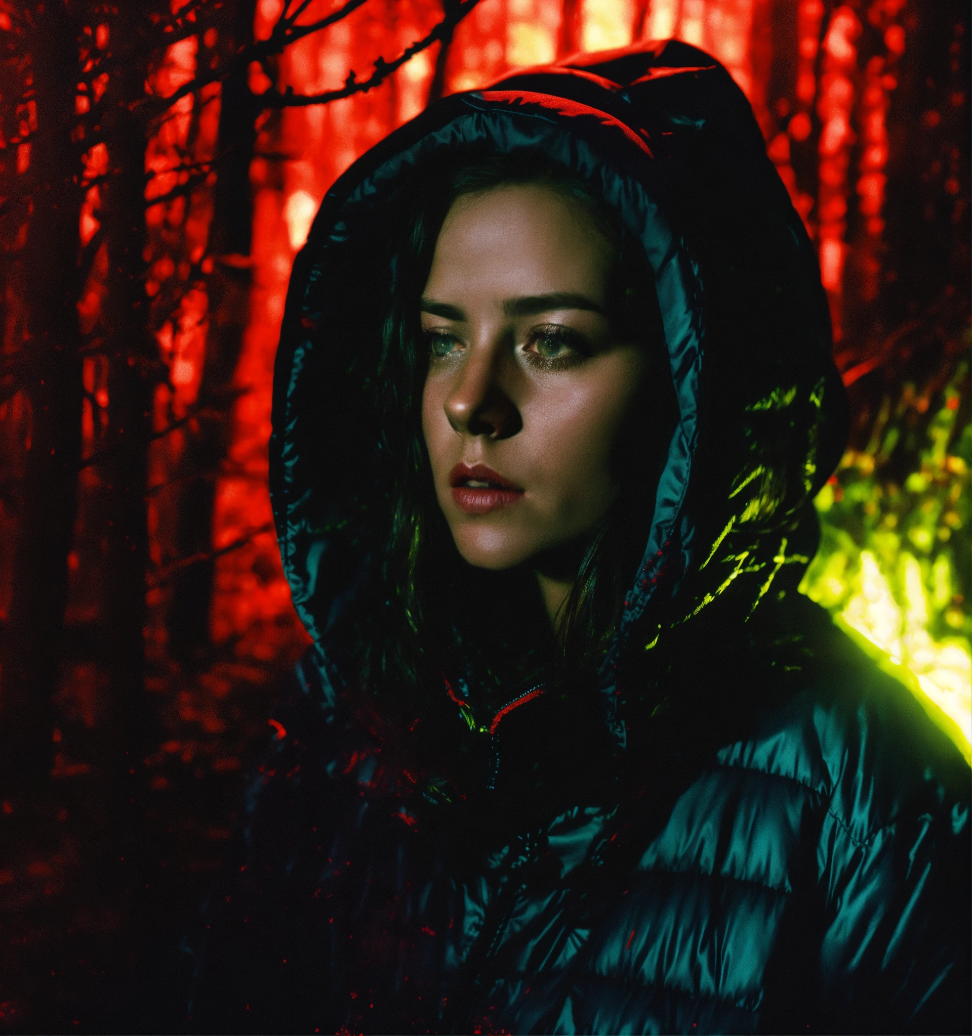 Detailed film still portrait of ellie kedward in the blair witch project, found footage panavision, neon, reflective puffy coat, grainy picture, decorated with traditional gritty filmography, inceoglu dragan bibin hans thoma greg rutkowski alexandros pyromallis nekro, illustrated, ugly face, fine details, realistic shaded, fine