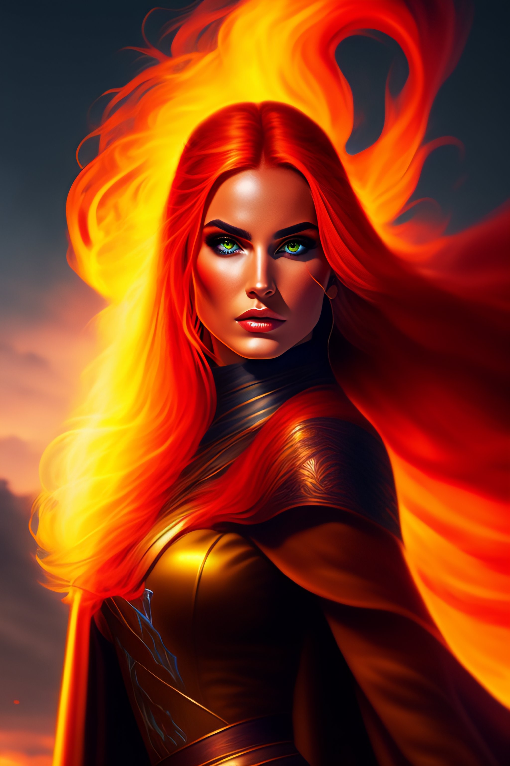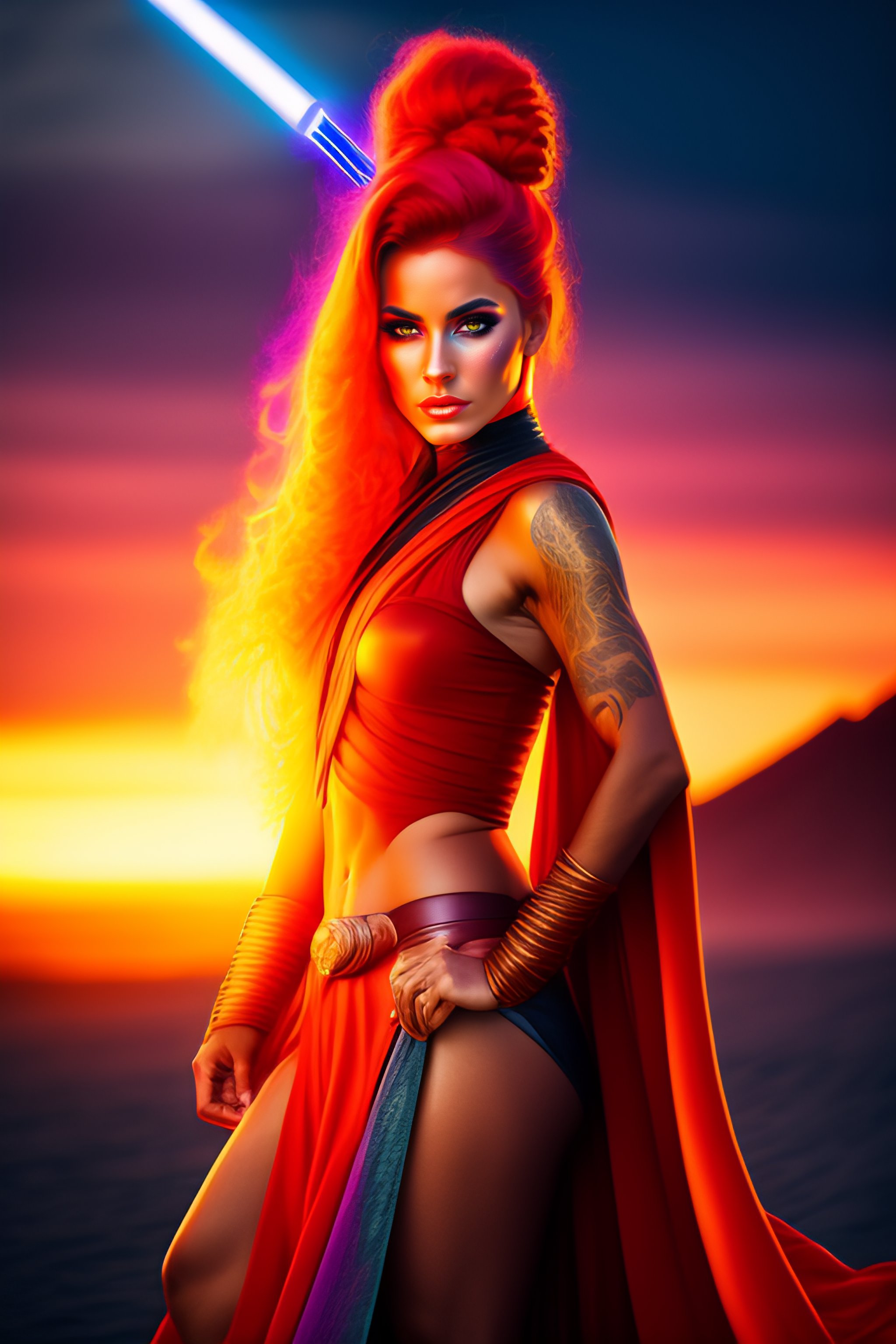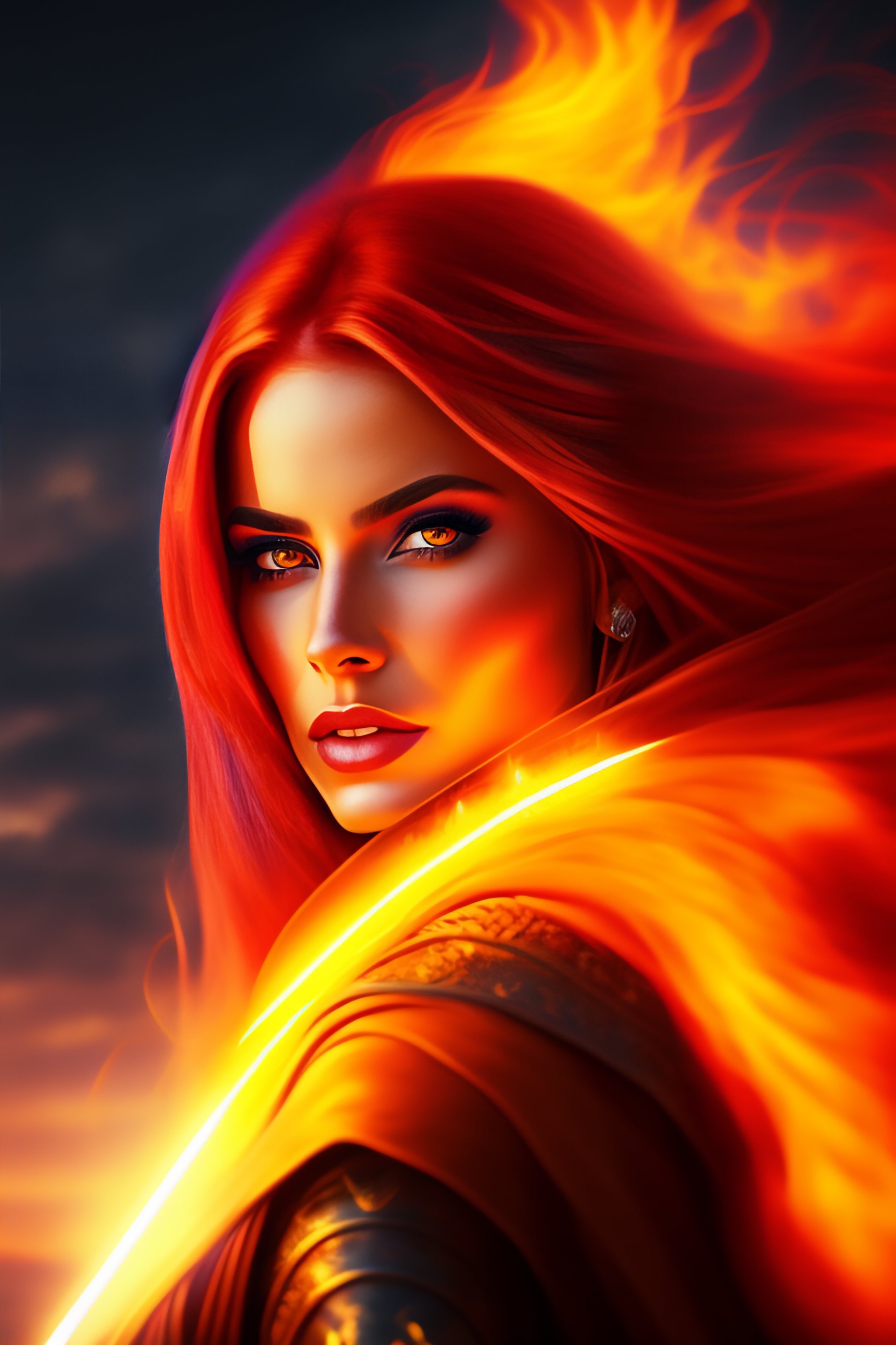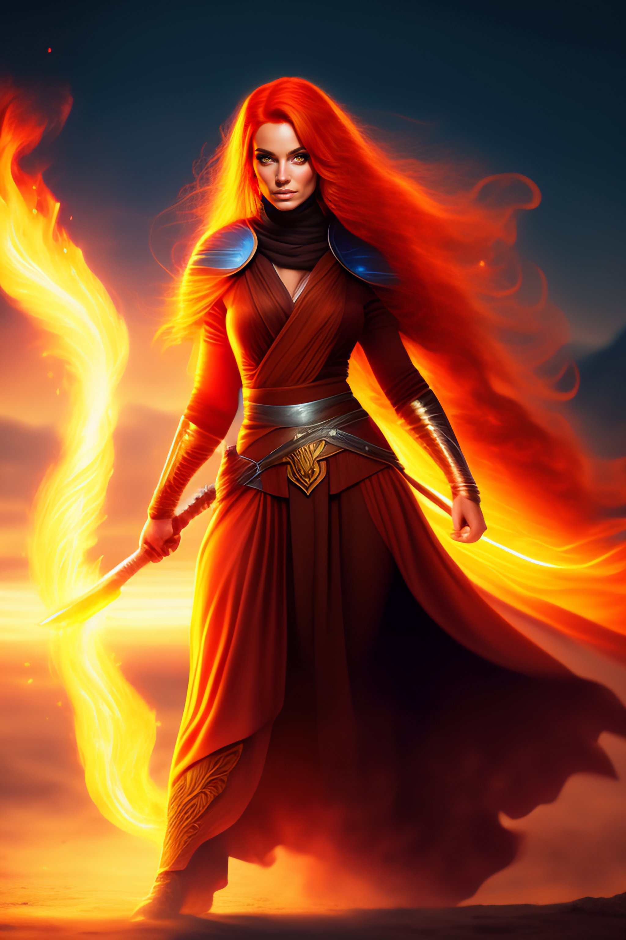 Jedi woman in cartoon style, flaming hair, beautiful, witch fighting daemon, sunset light, fire background, adult