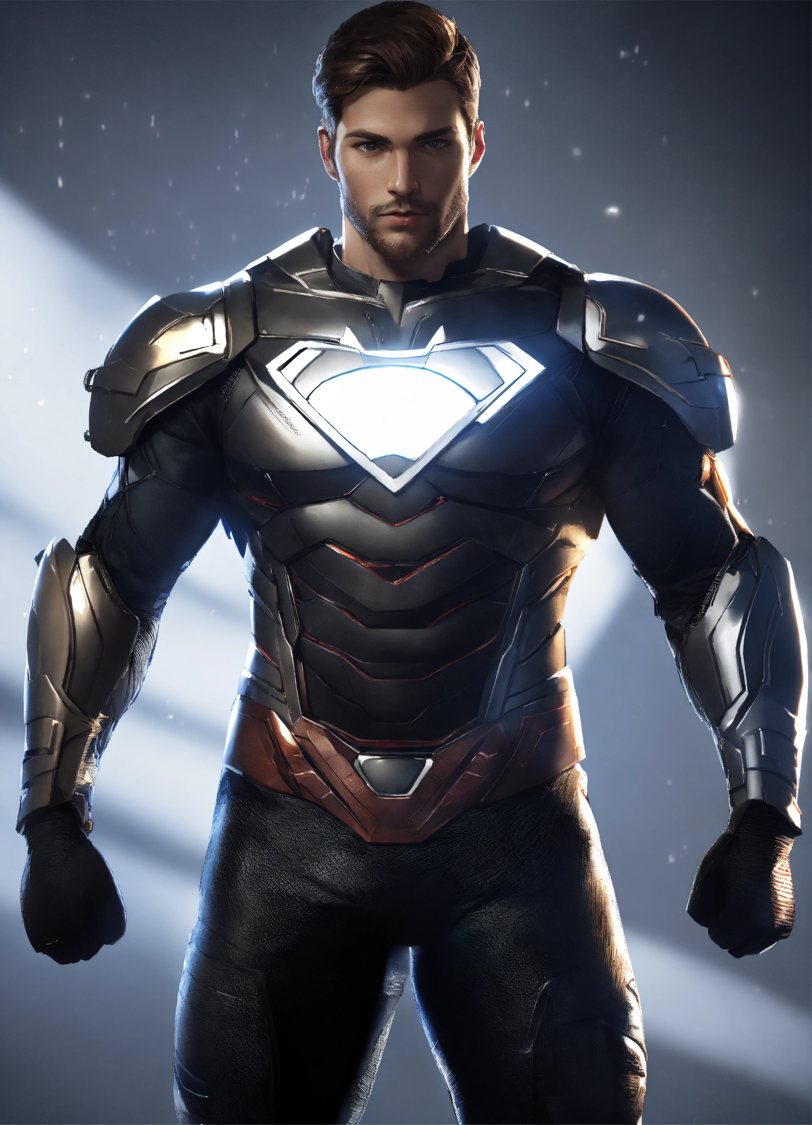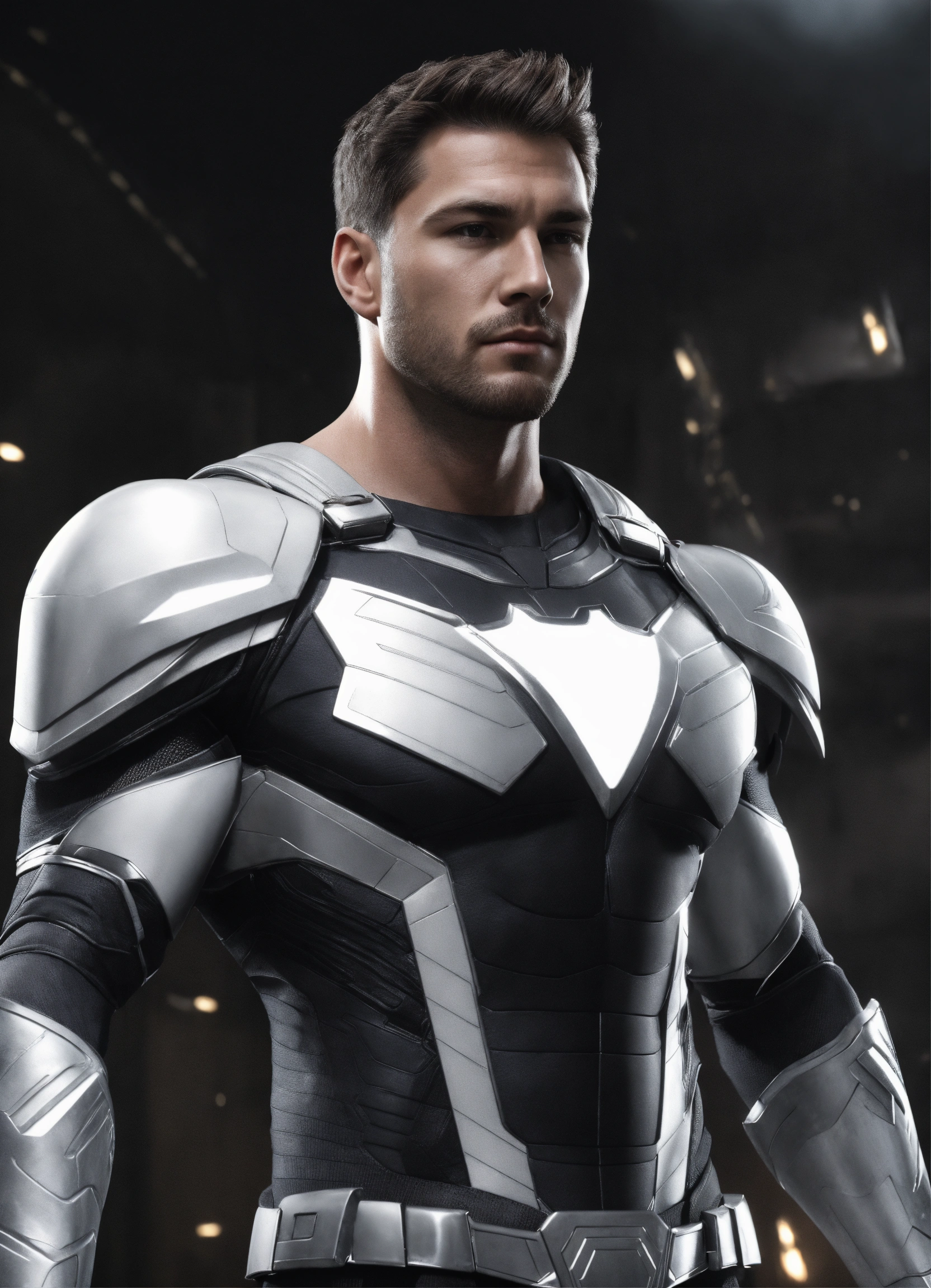 Superhero style, superhero, male, 4k, realistic, shown face, expressed face, detailed, full body shown, white man, superhero body, body with superhero armor, only one person, full body shown, showing whole body, without symbols on chest, armor black and white, no emblems, clear chest, 2 people, male and female, man, woman, male, female