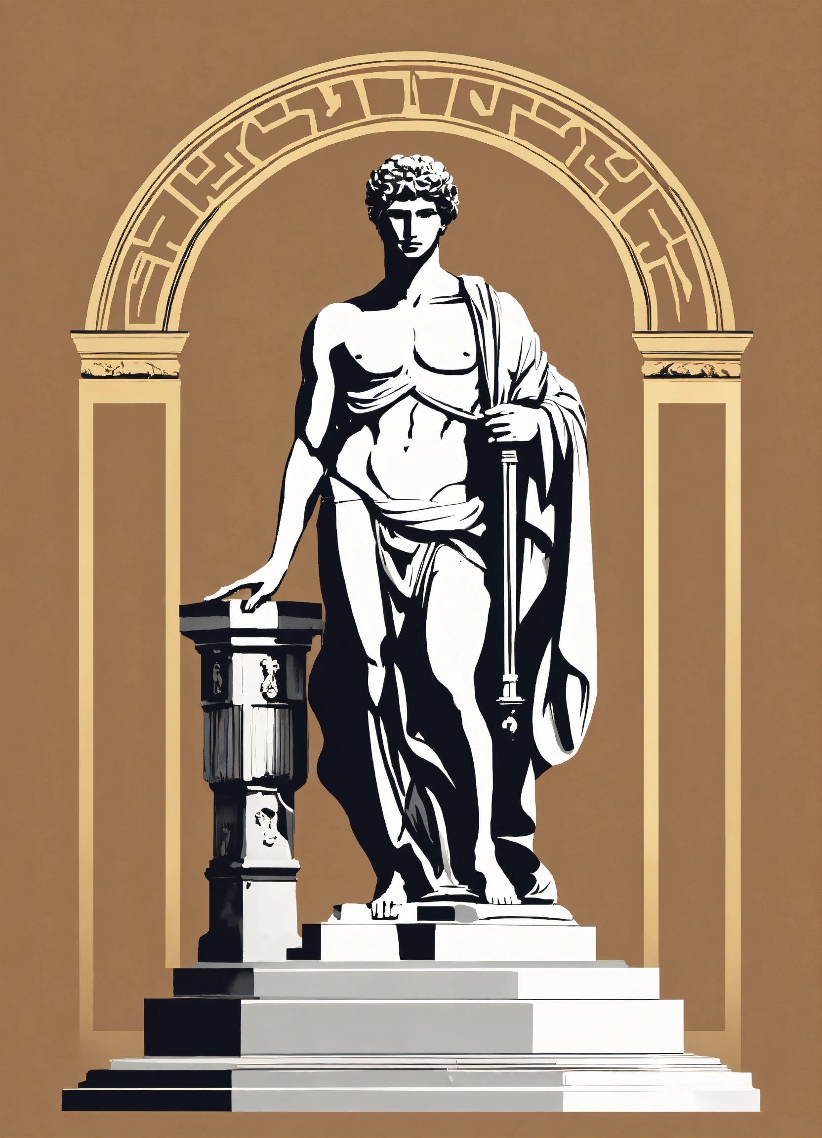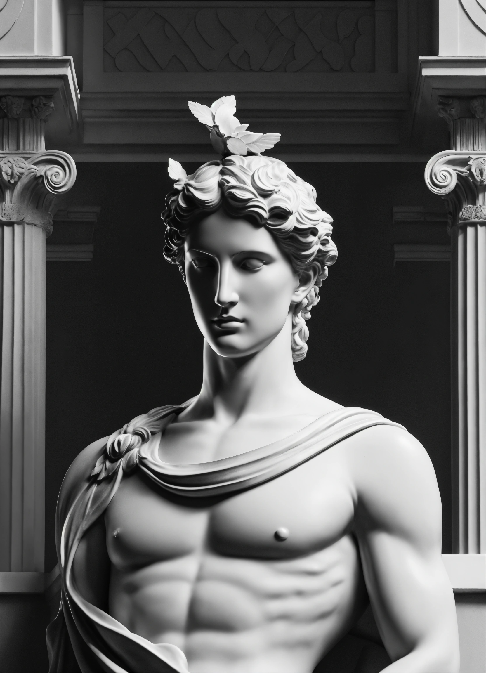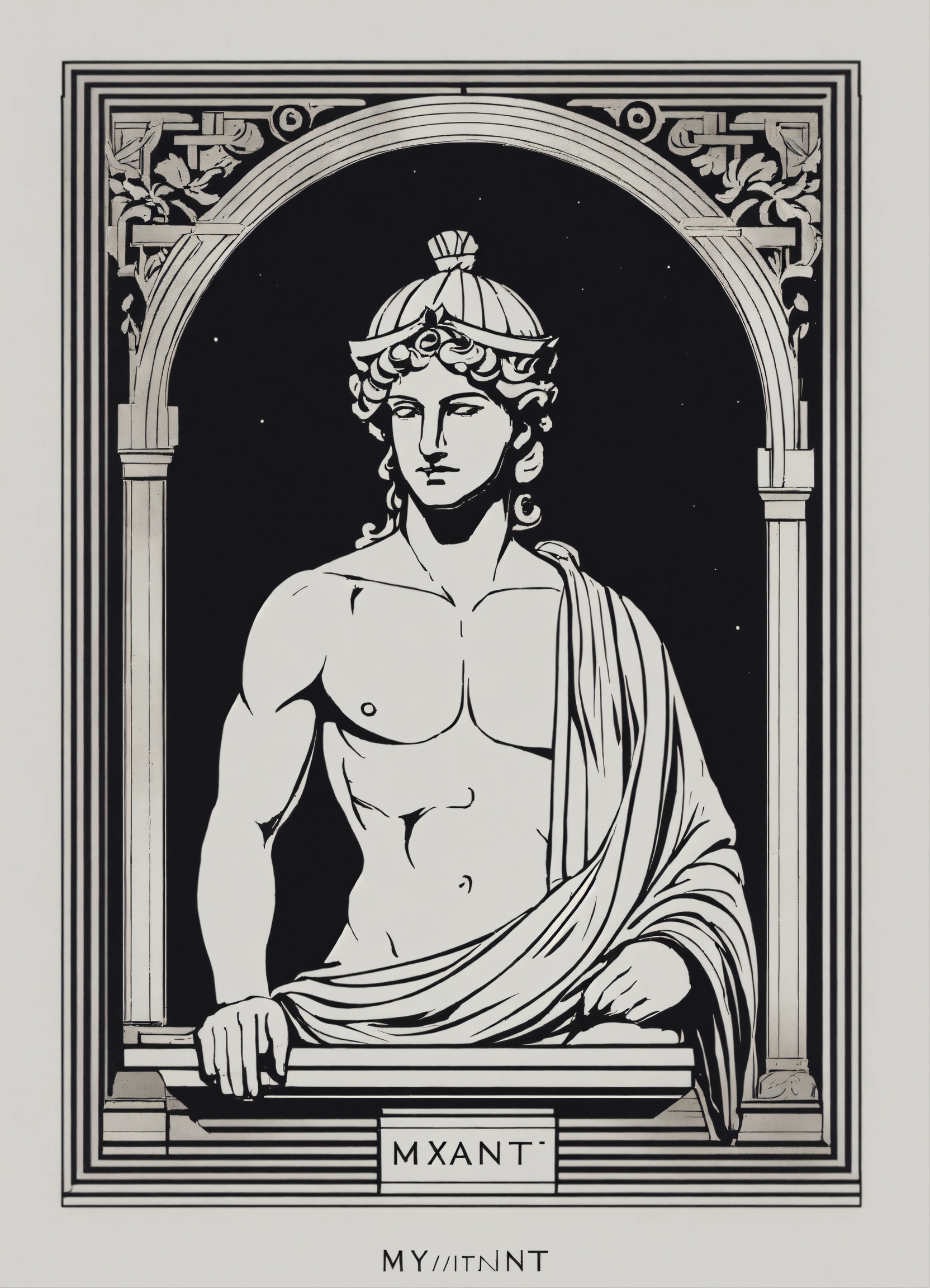 Create a sleek logo for the upscale fashion brand 'myxnt, ' inspired by greek mythology. keep it as minimalist as apple's logo, with a touch of mythic elegance. merge classic greek elements into a simple yet iconic design that mirrors the brand's fusion of sophistication and ancient allure." with a greek god on it. black and white symple icon of a statue with muscels