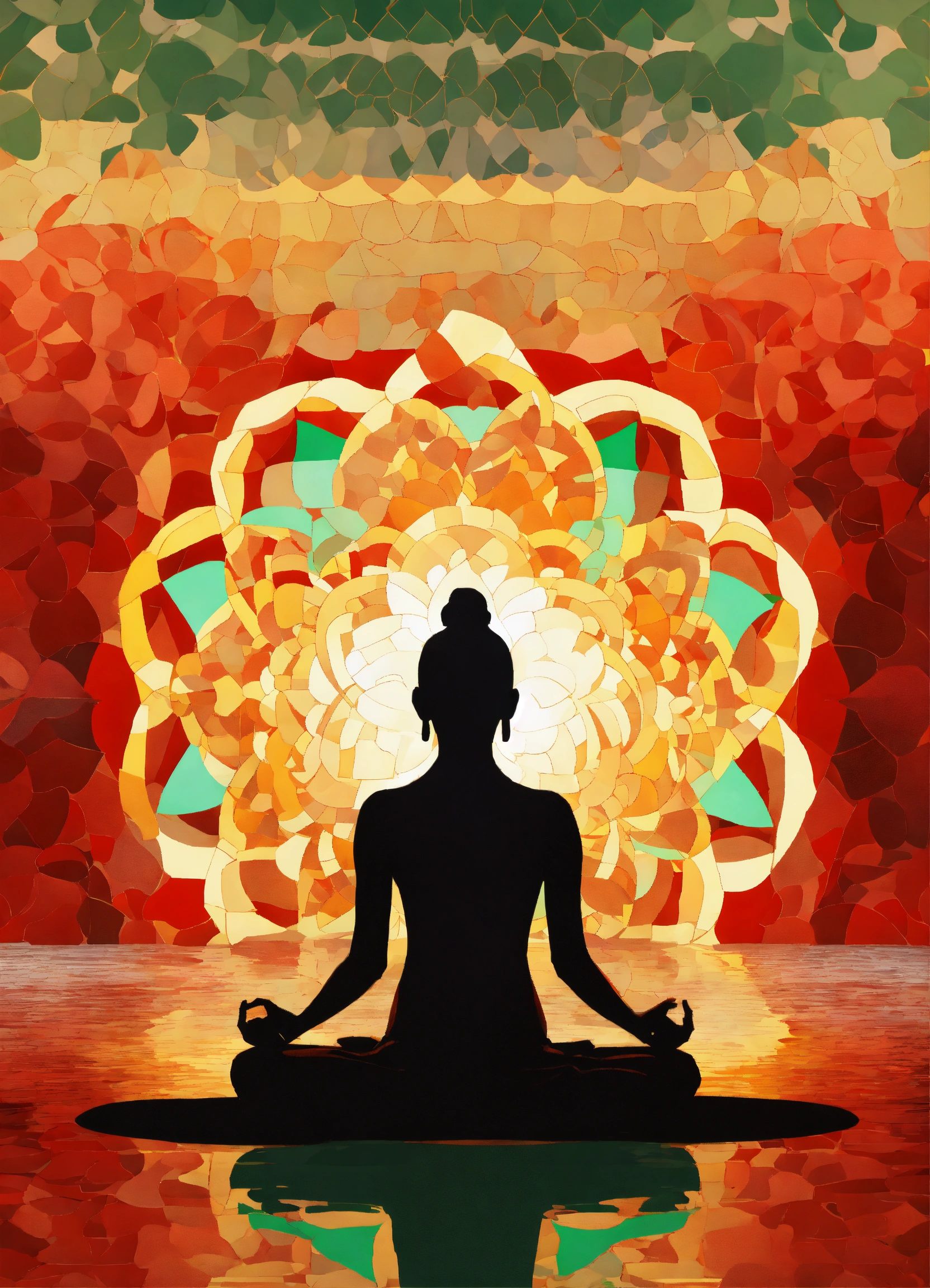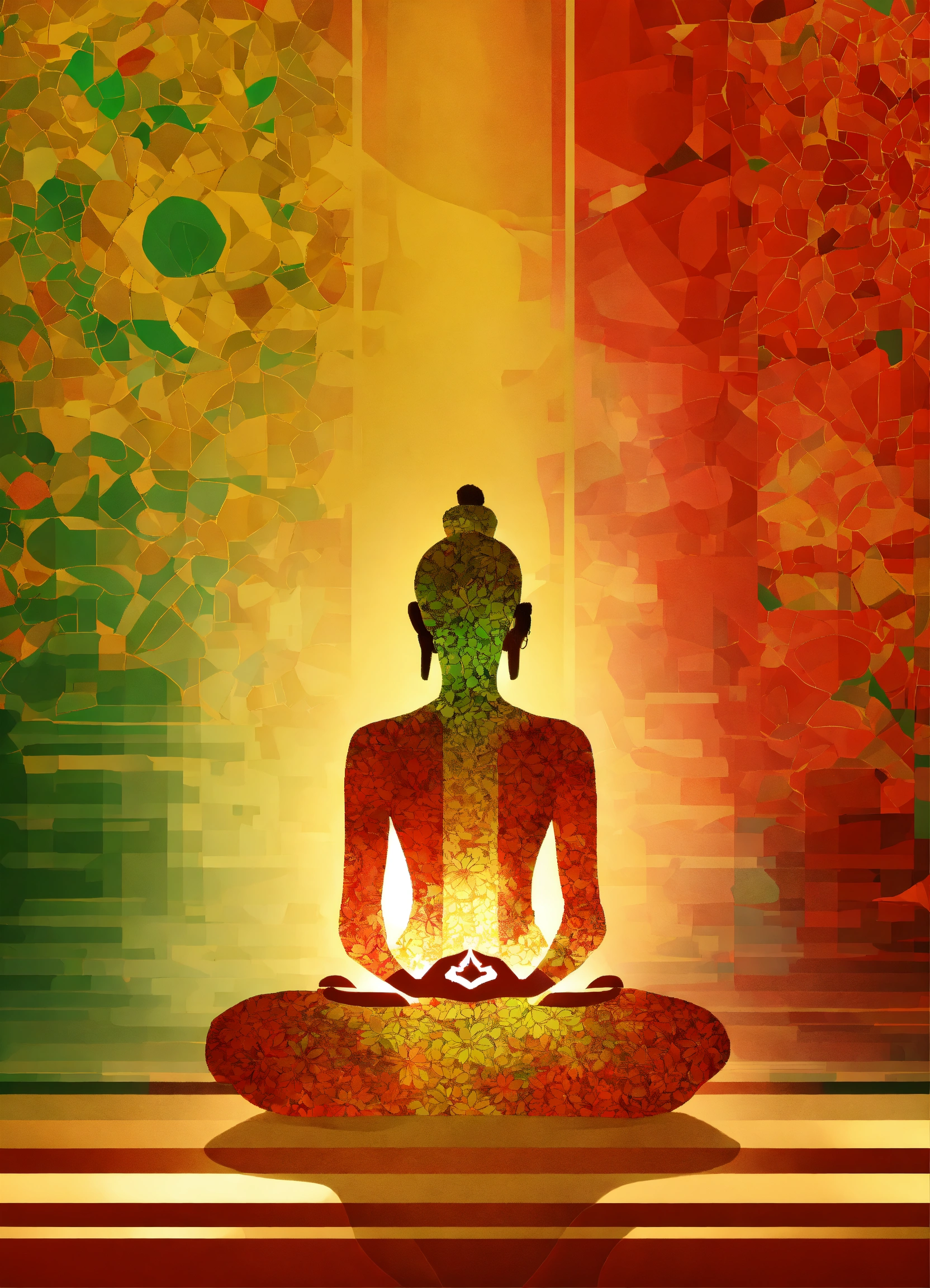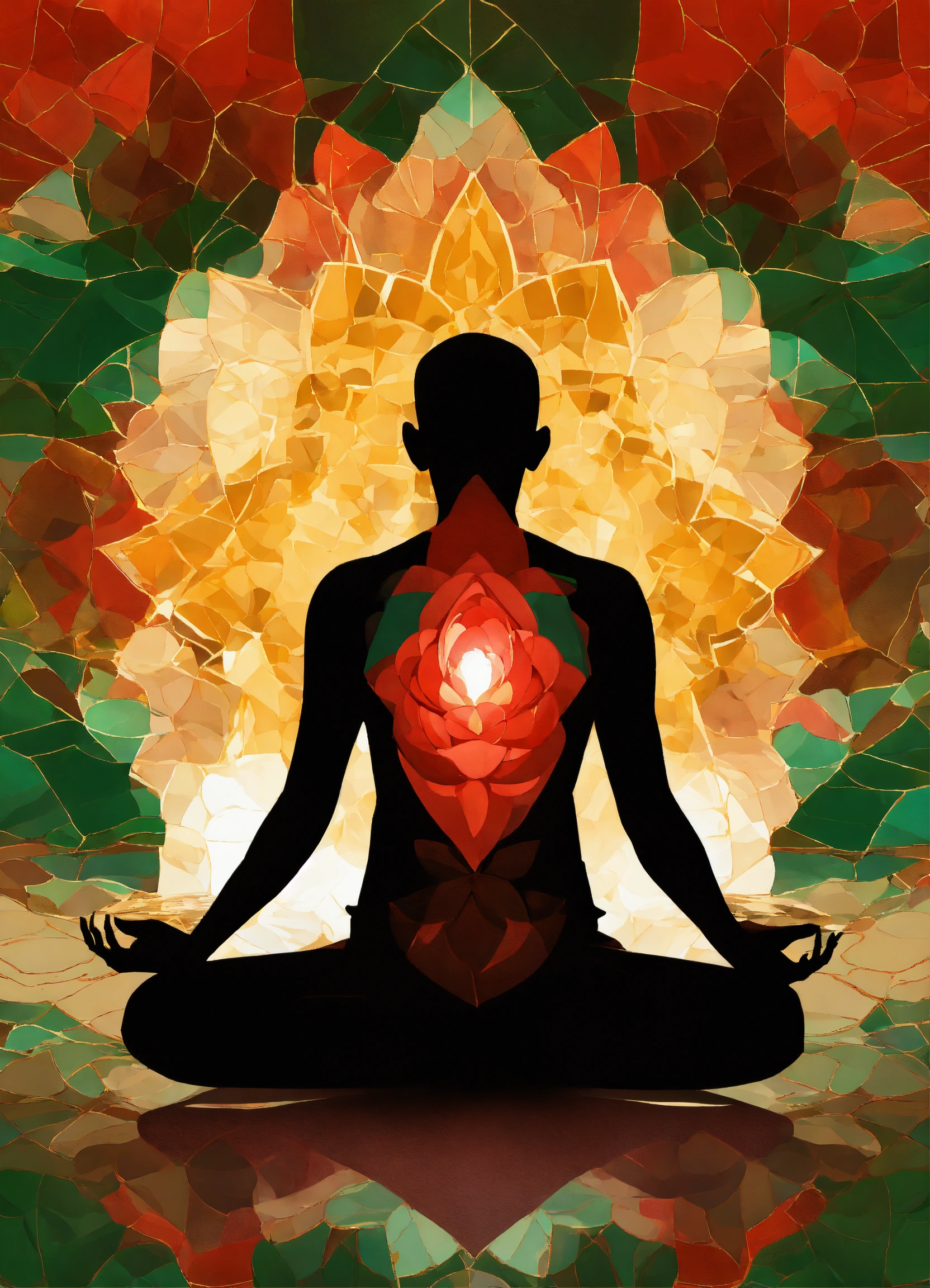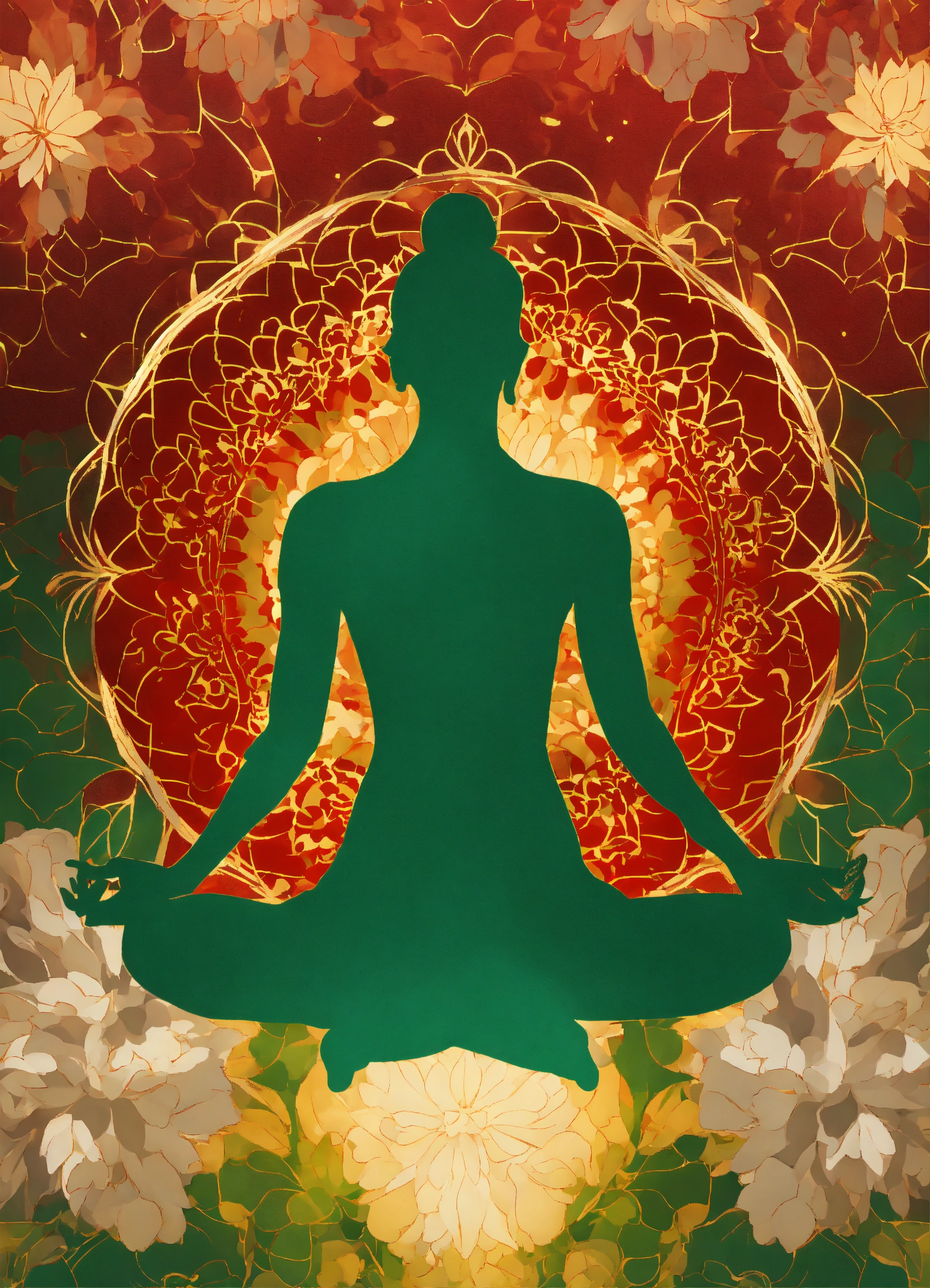 Generate an image of a silhouette seated in a lotus position, facing sideways, against an abstract background in traditional new year colors (red, green, gold, and silver)