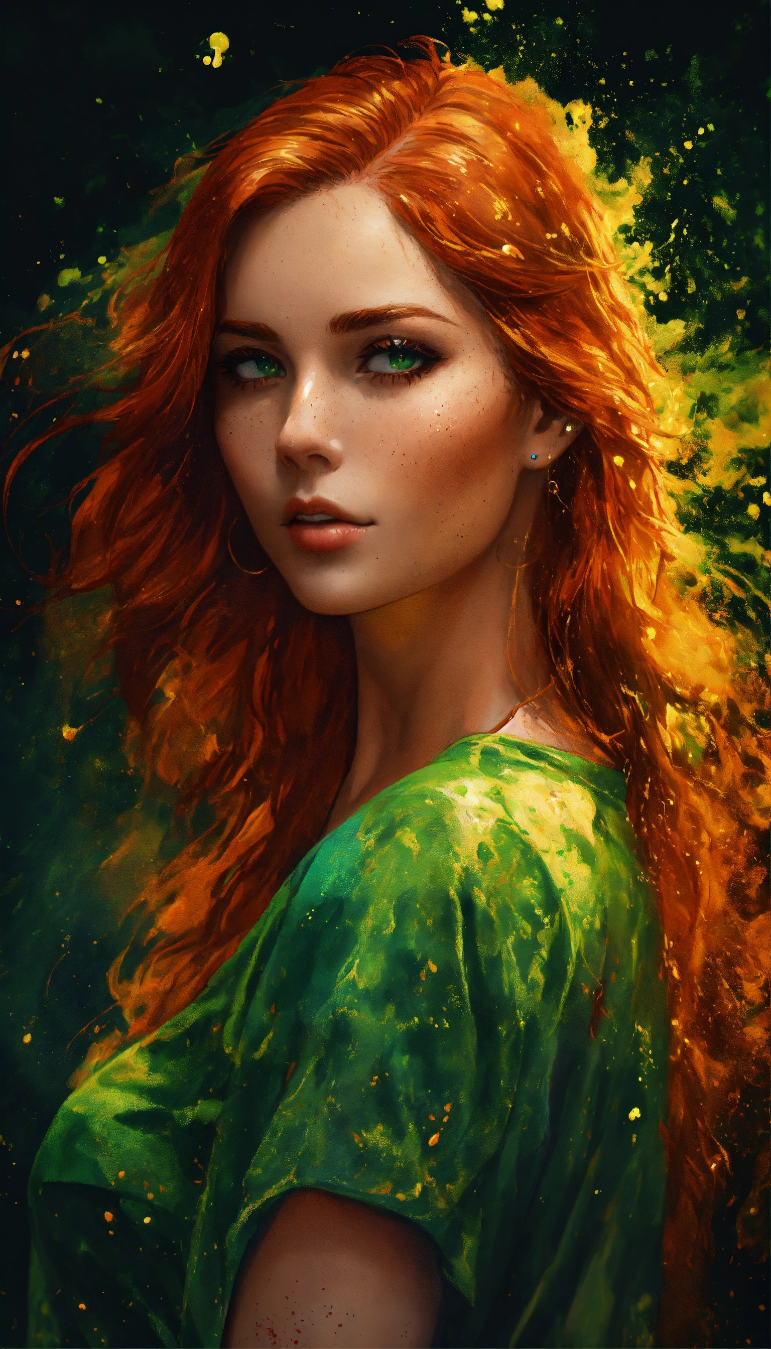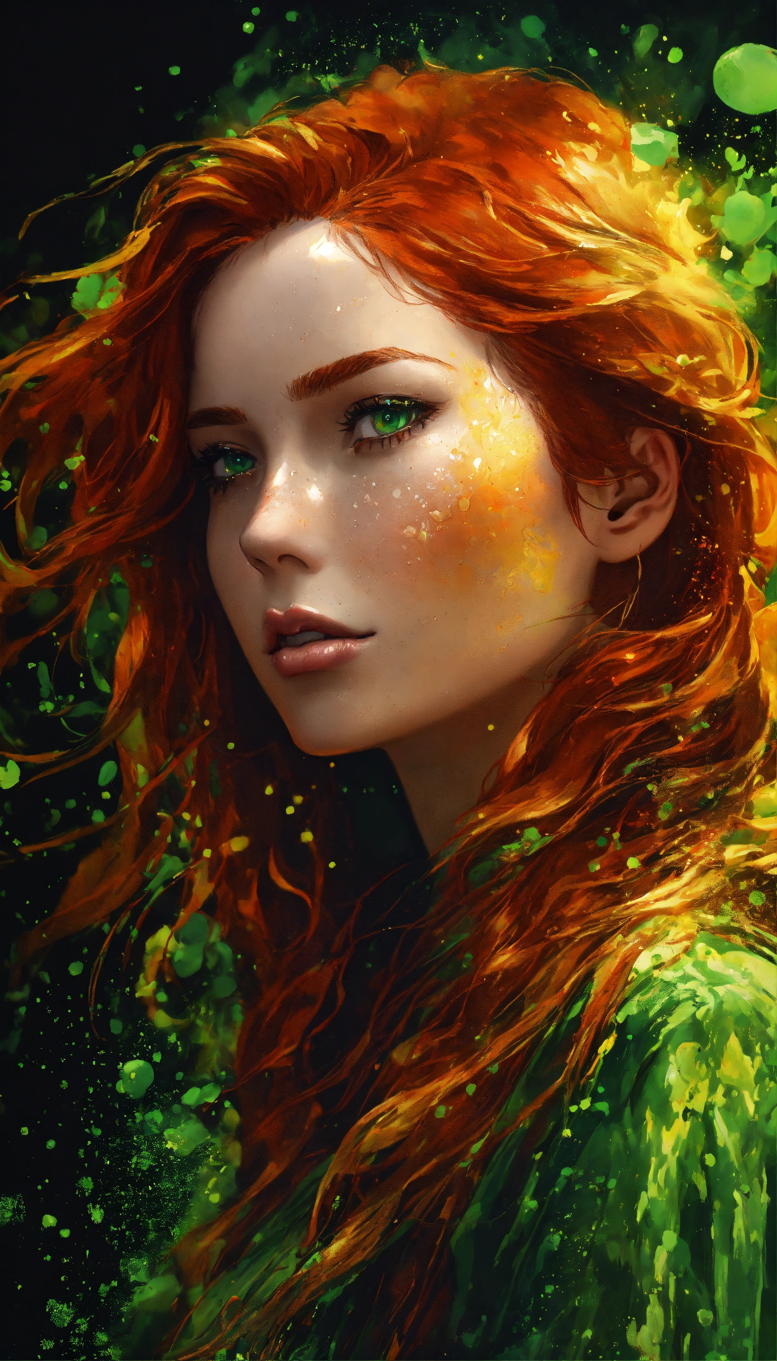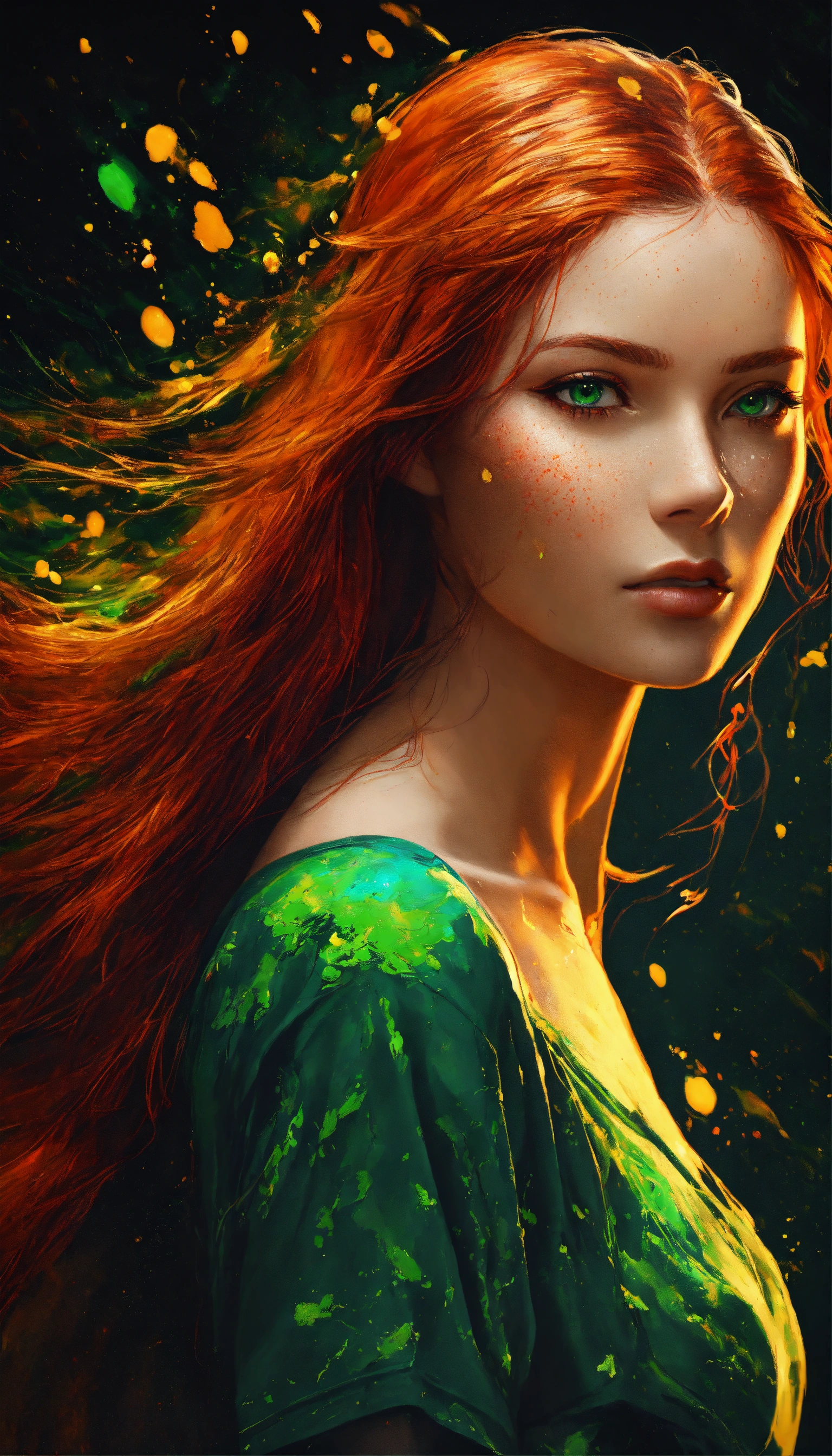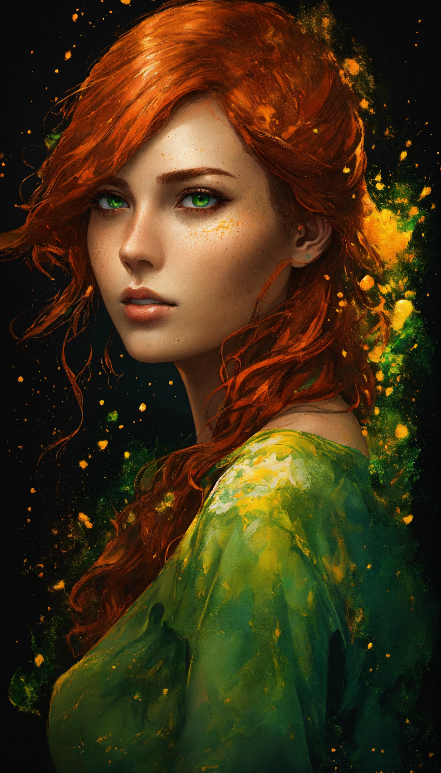 A beautiful red head woman with green eyes looking back over her shoulder at you, waist up shot, hyperdetailed, tee-shirt design, line art, black background, ultra detailed artistic, detailed gorgeous character, natural skin, water splash, colour splash art, fire and ice, splatter, black ink, liquid melting, dreamy, glowing, glamour, glimmer, shadows, oil on canvas, brush strokes, smooth, ultra high definition, 8k, unreal engine 5, ultra sharp focus, intricate artwork masterpiece, ominous, golden ratio, highly detailed, vibrant, production cinematic character render, ultra high quality model