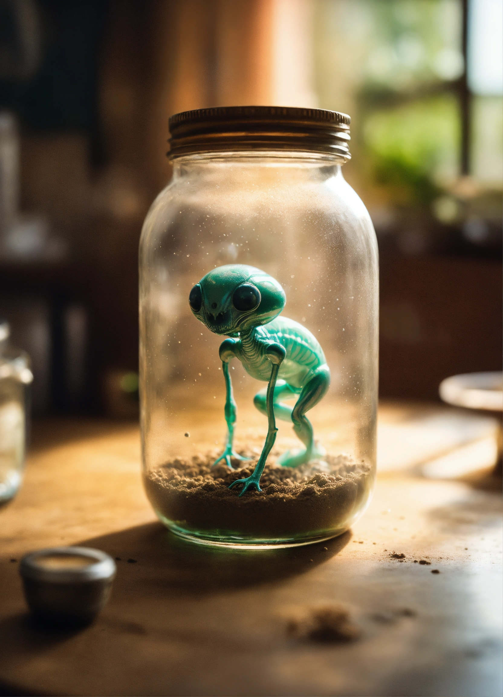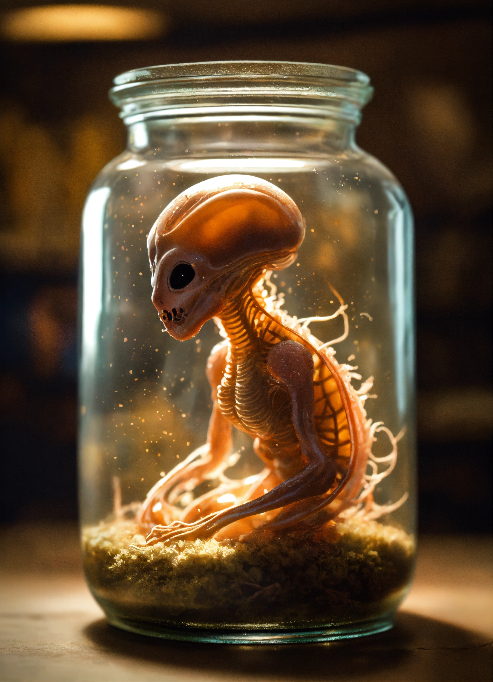 A professional, high quality photograph of an alien embryo trapped in a glass jar in the style of yoshitaka amano, on a table with a dusty surface, chaotic, a masterpiece, depth of field, subtractive lighting, panorama, add details, pastel colors.