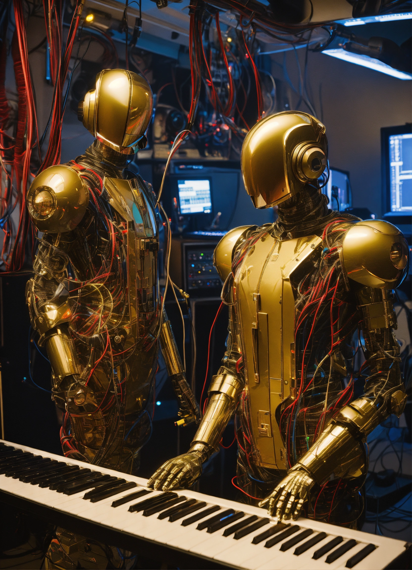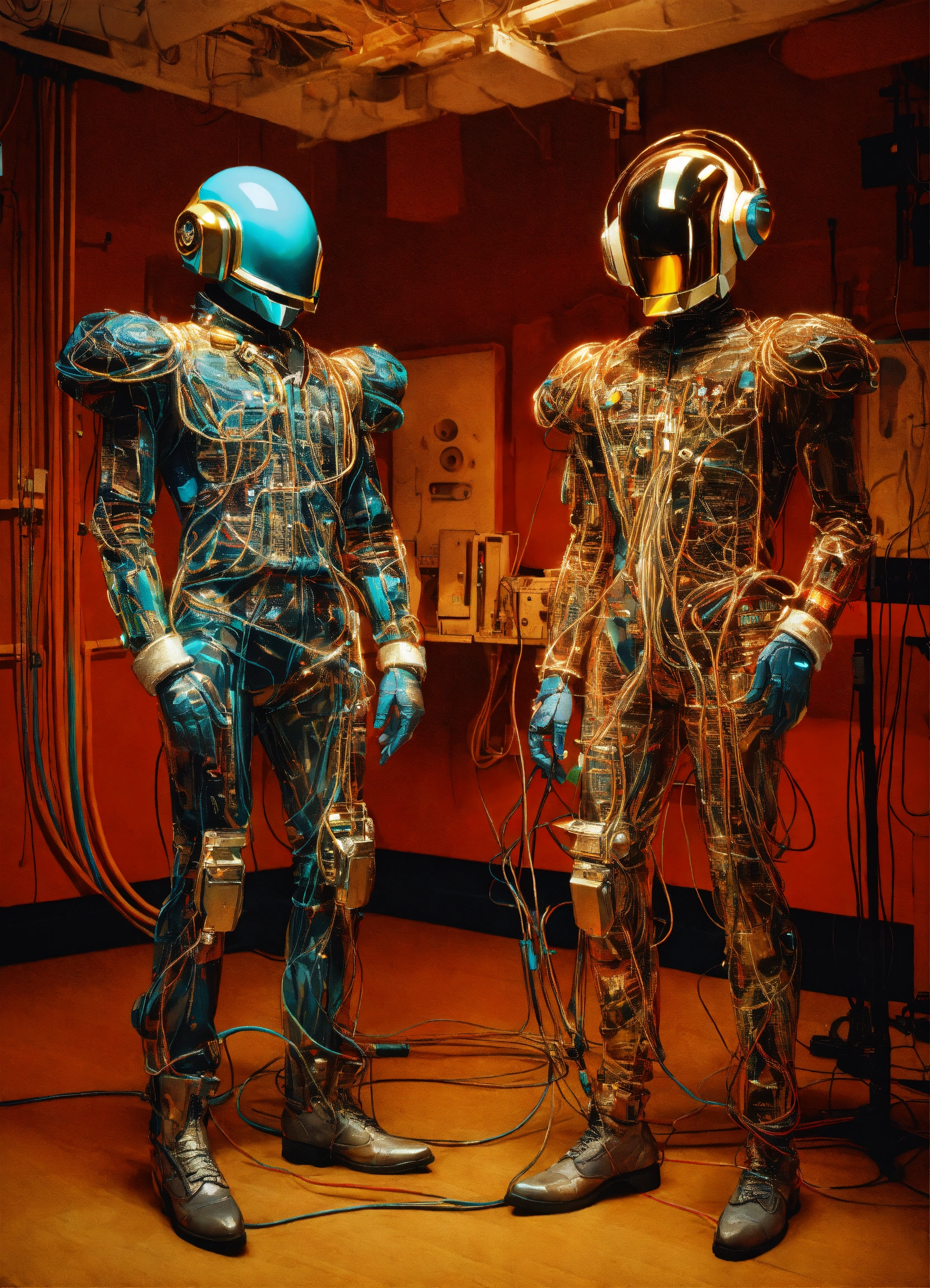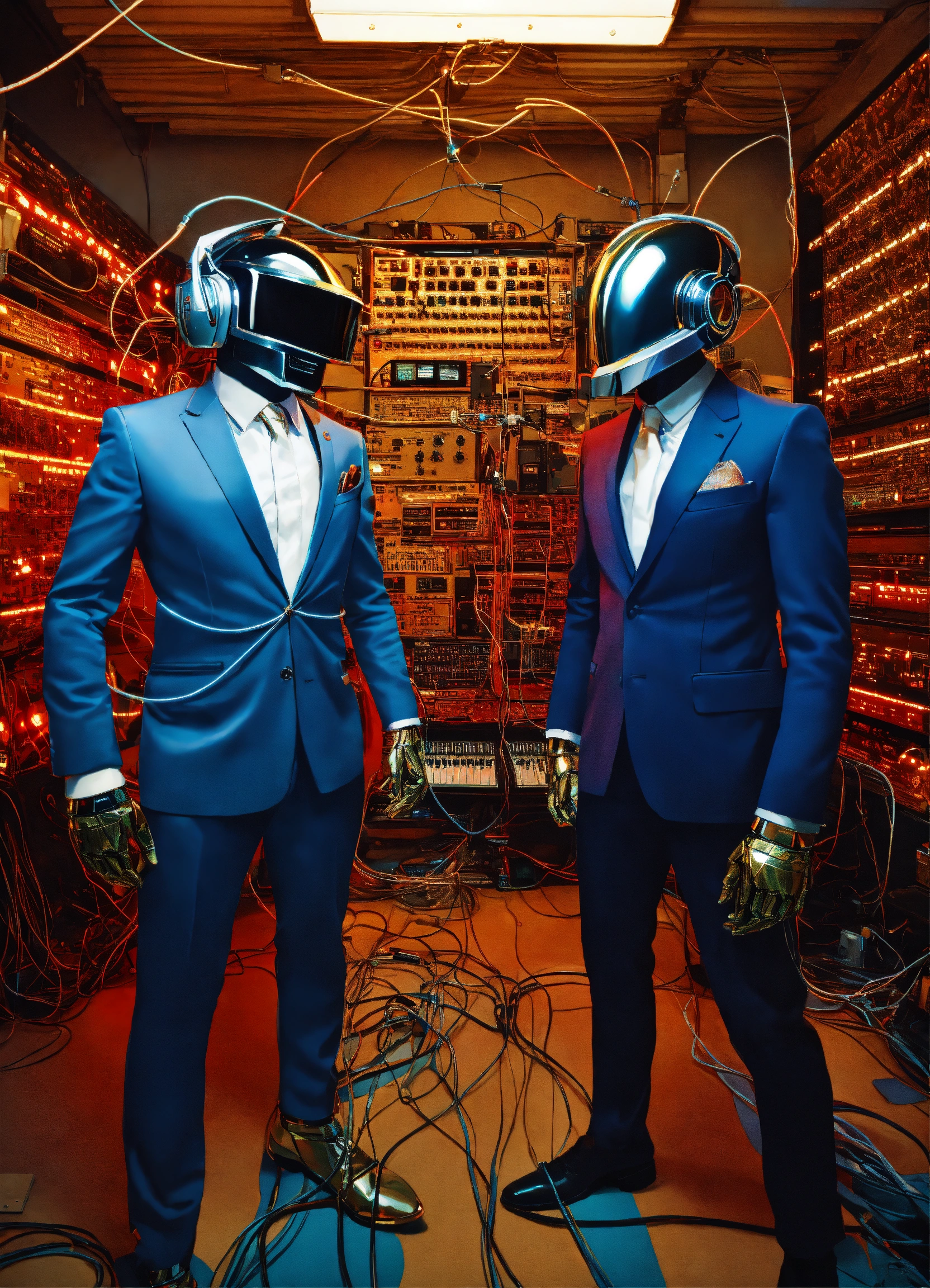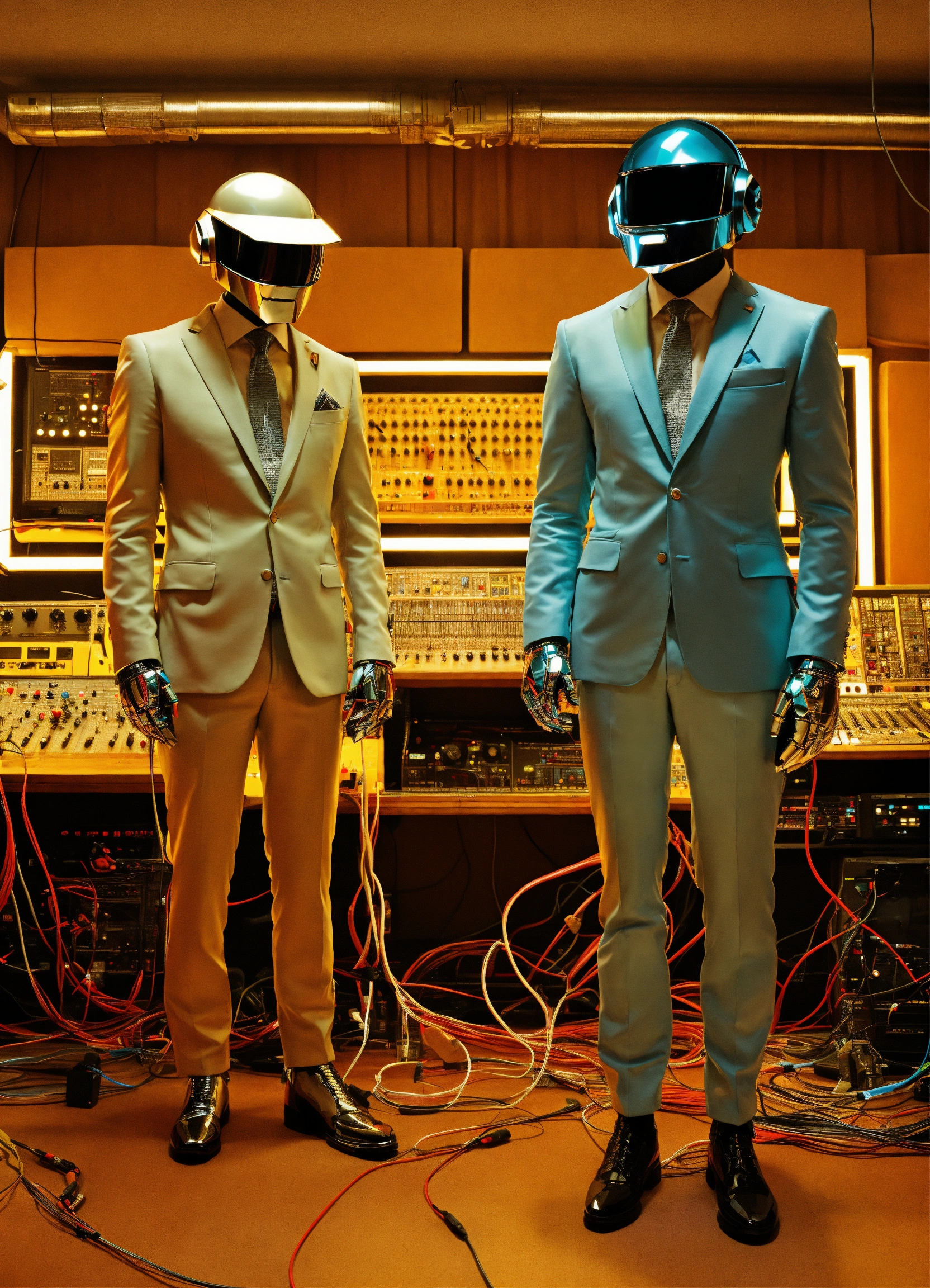 Body portrait photography, the two daft punk robots dressed in suits, in a music studio full of cables and wires and led, 80 degree view, art by sergio lopez, natalie shau, james jean and salvador dali
