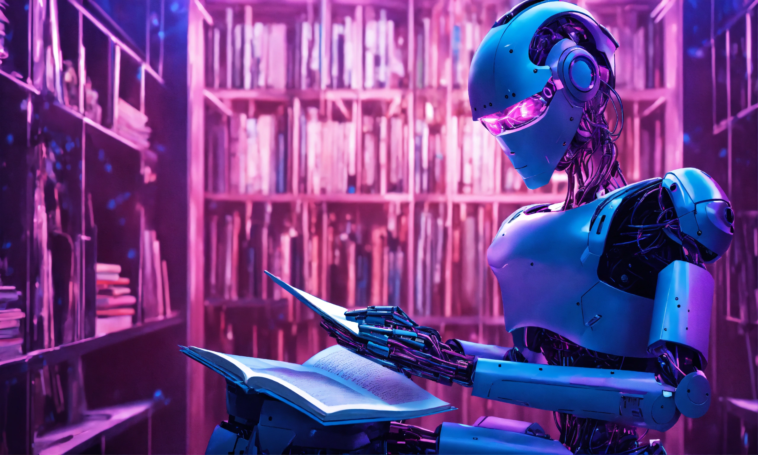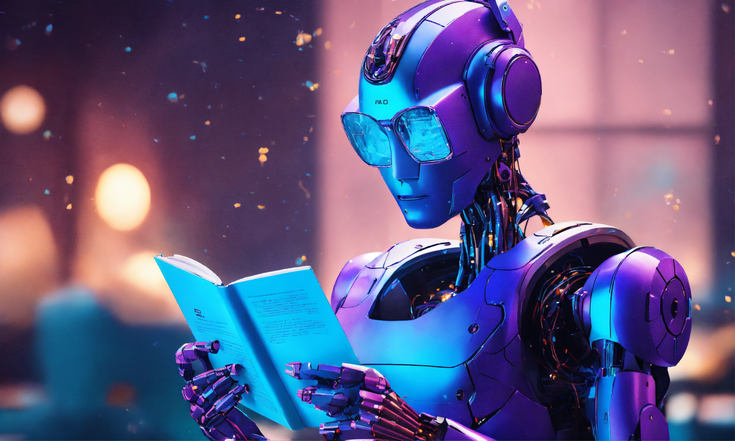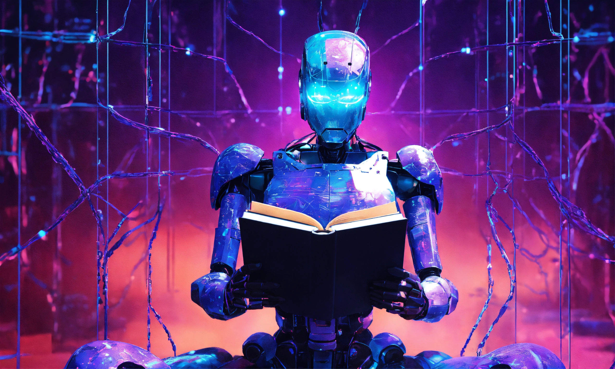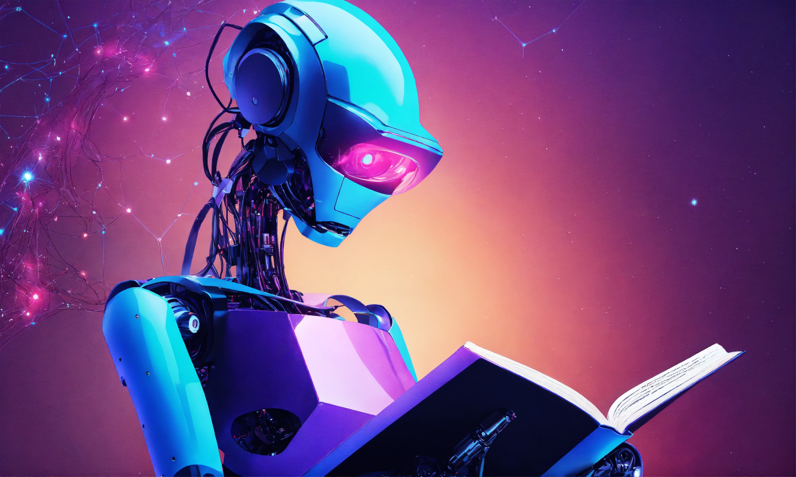 A blue and purple neural network background with an ai robot reading a book