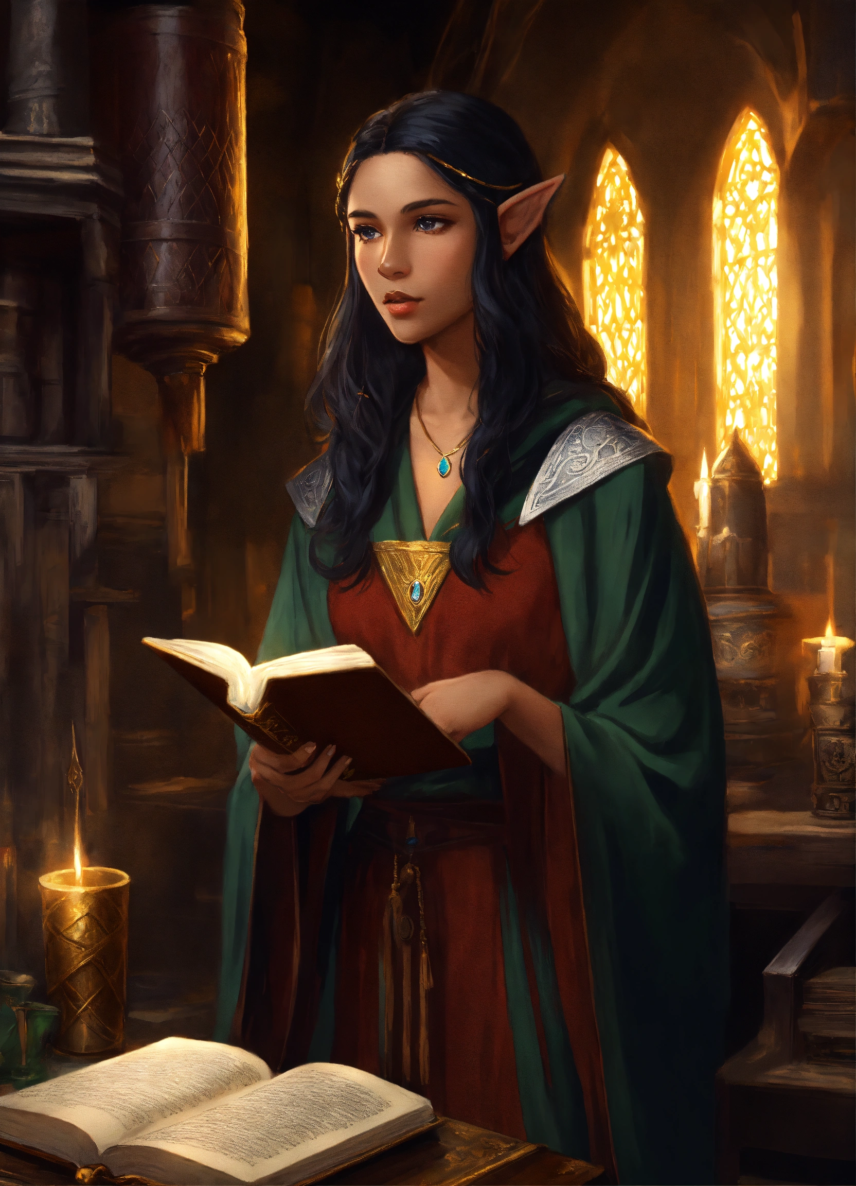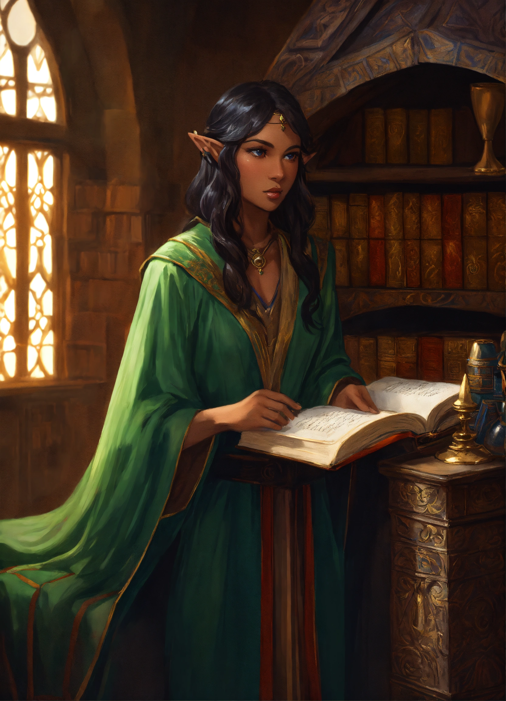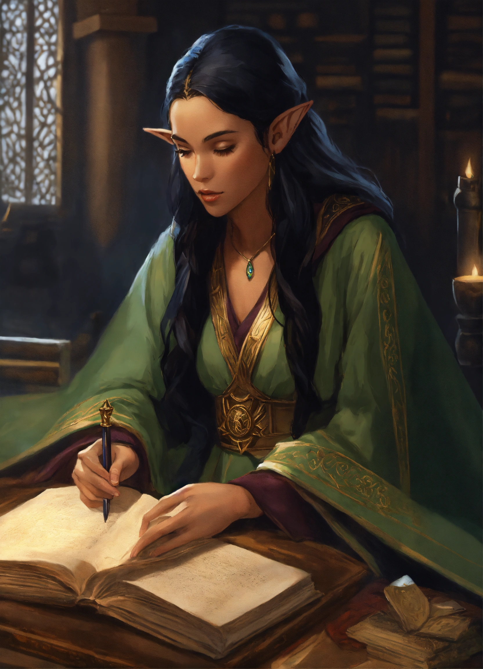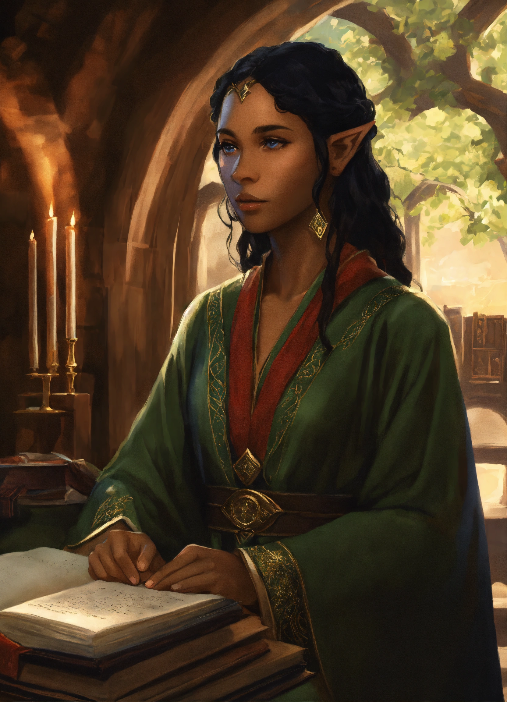 Elf woman, short ears, journey, dark complexion, black hair, robe, scribes' chamber, scholar, lord of the rings
