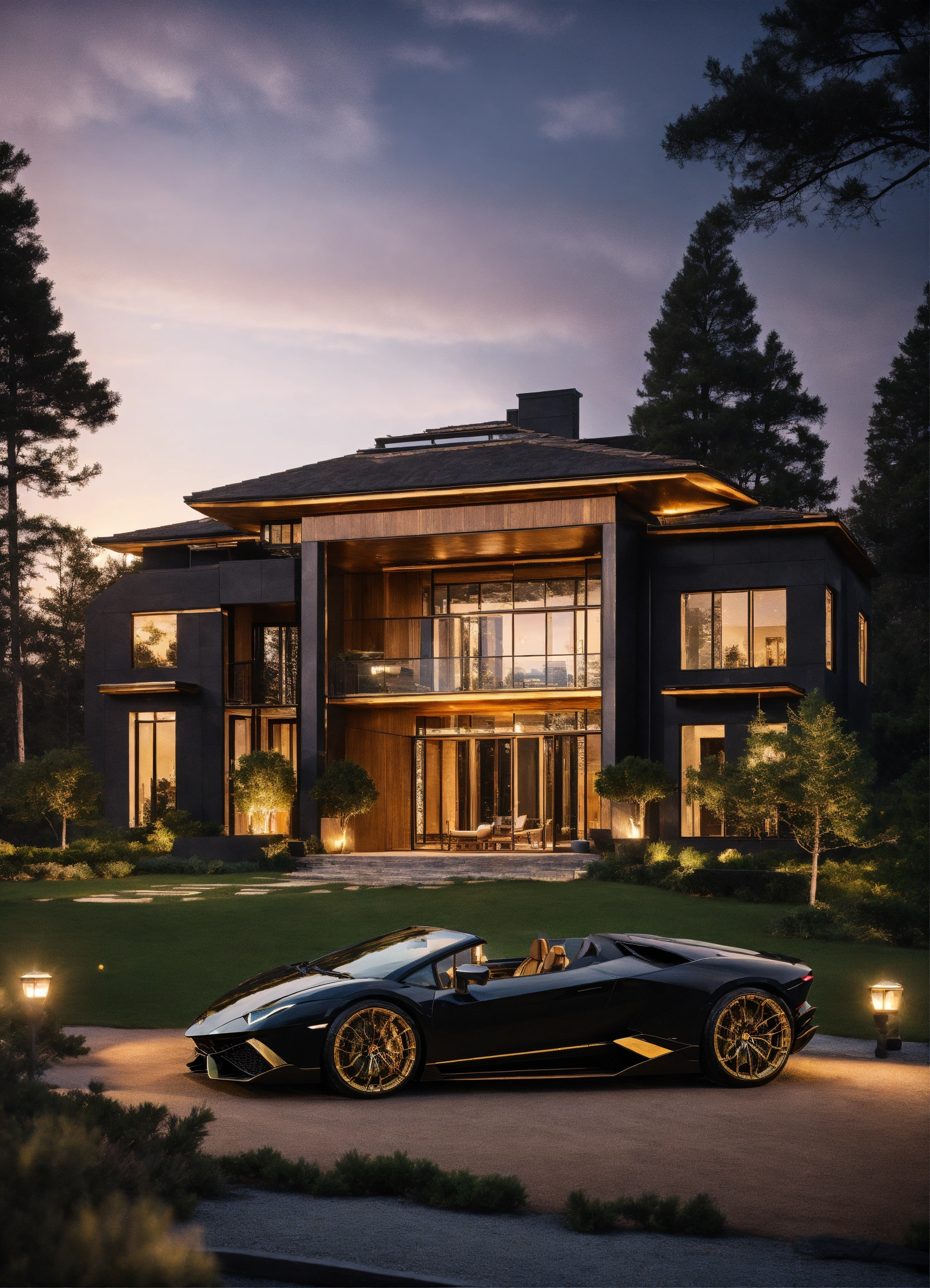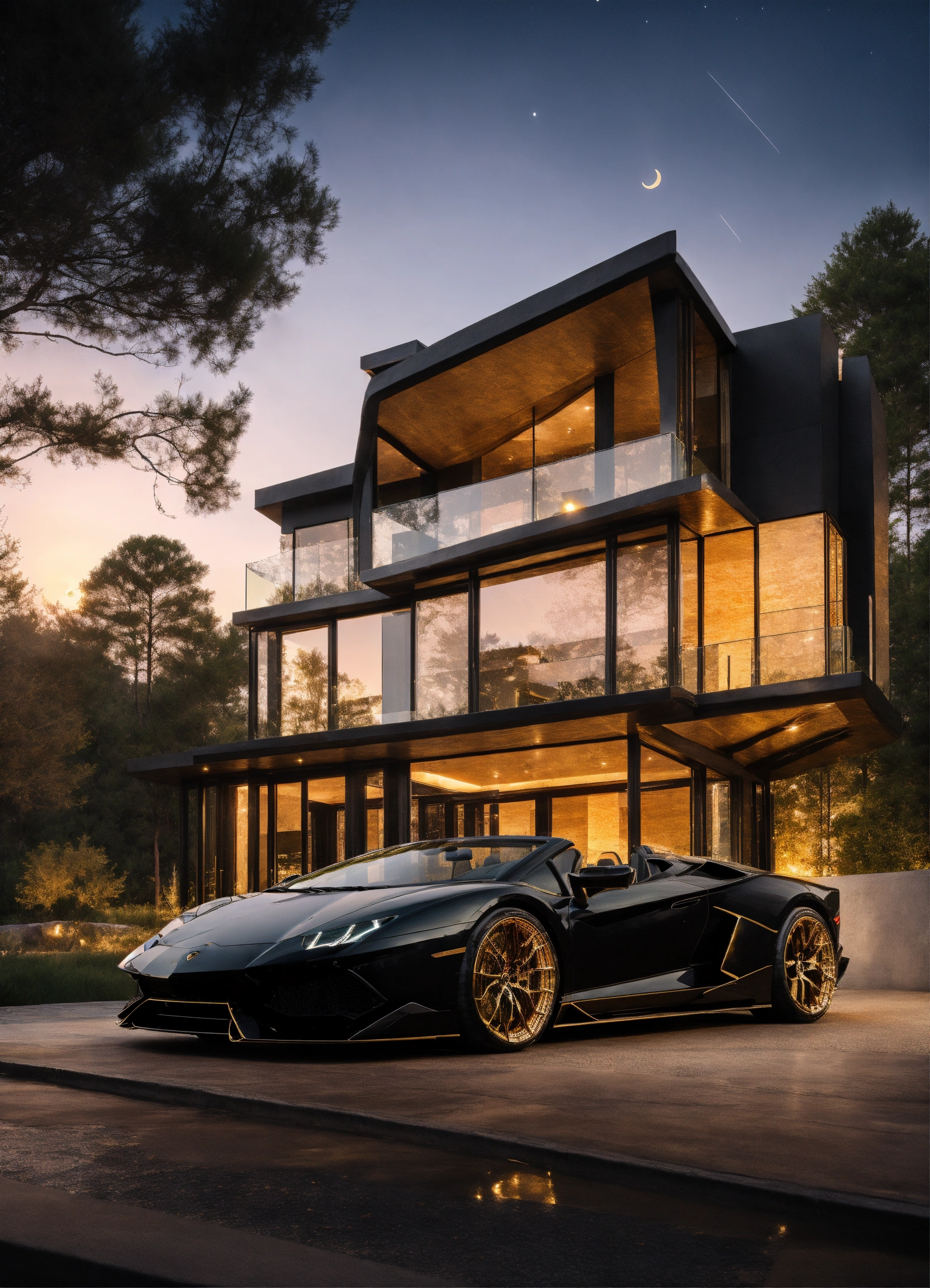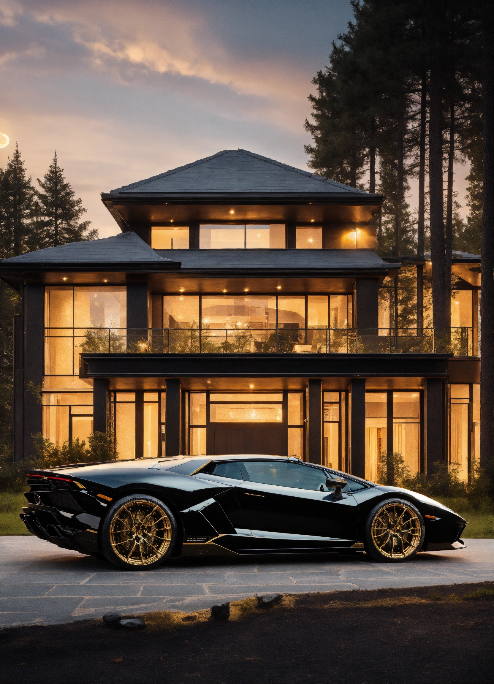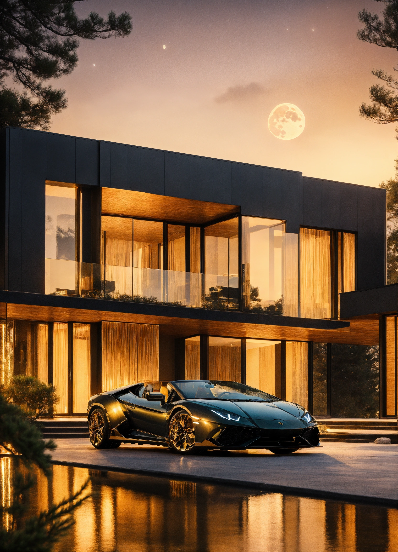 2023 lamborghini hurricane convertible black and gold trim with modern contemporary mansion with pine trees landscape and golden moonlight background
