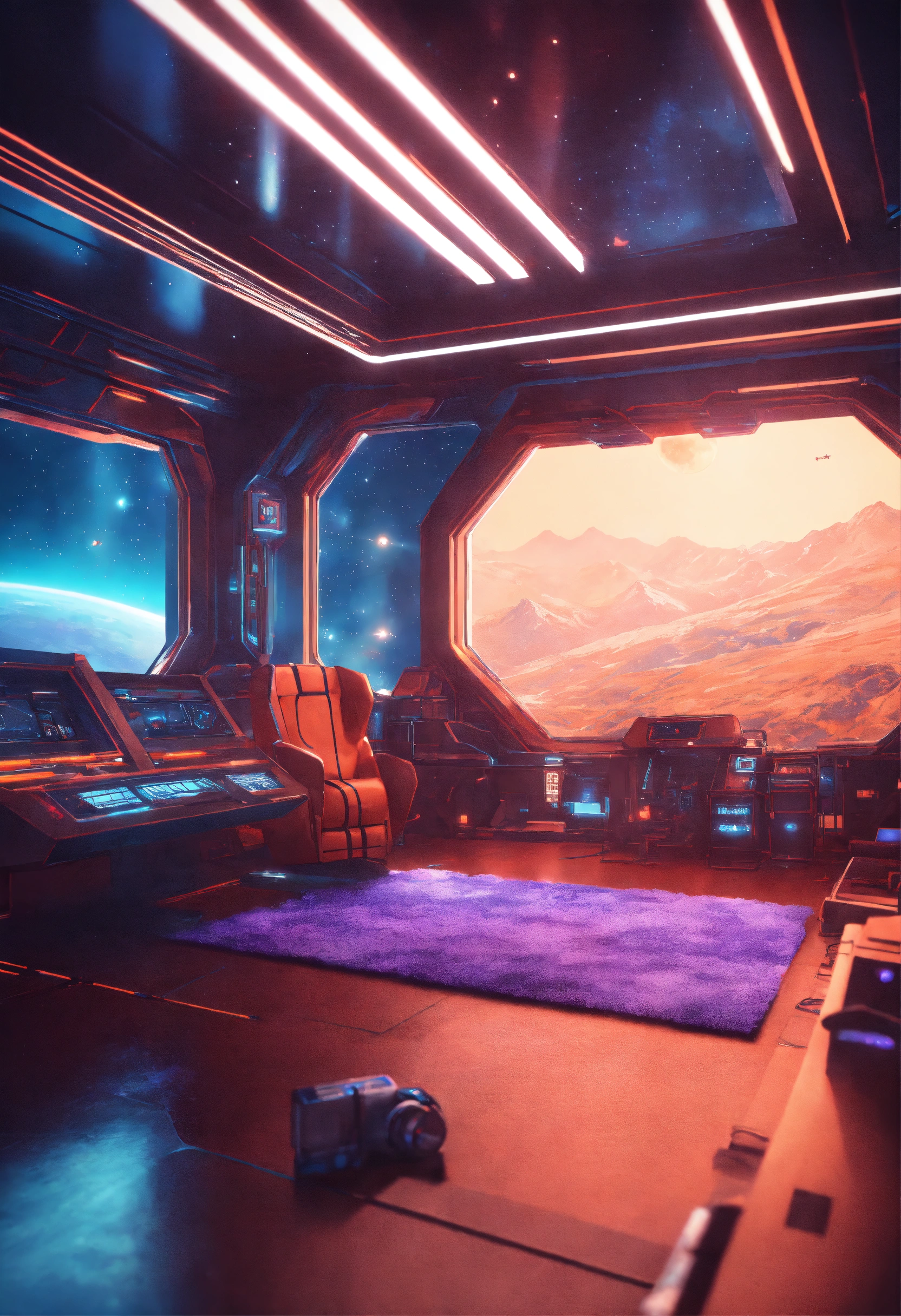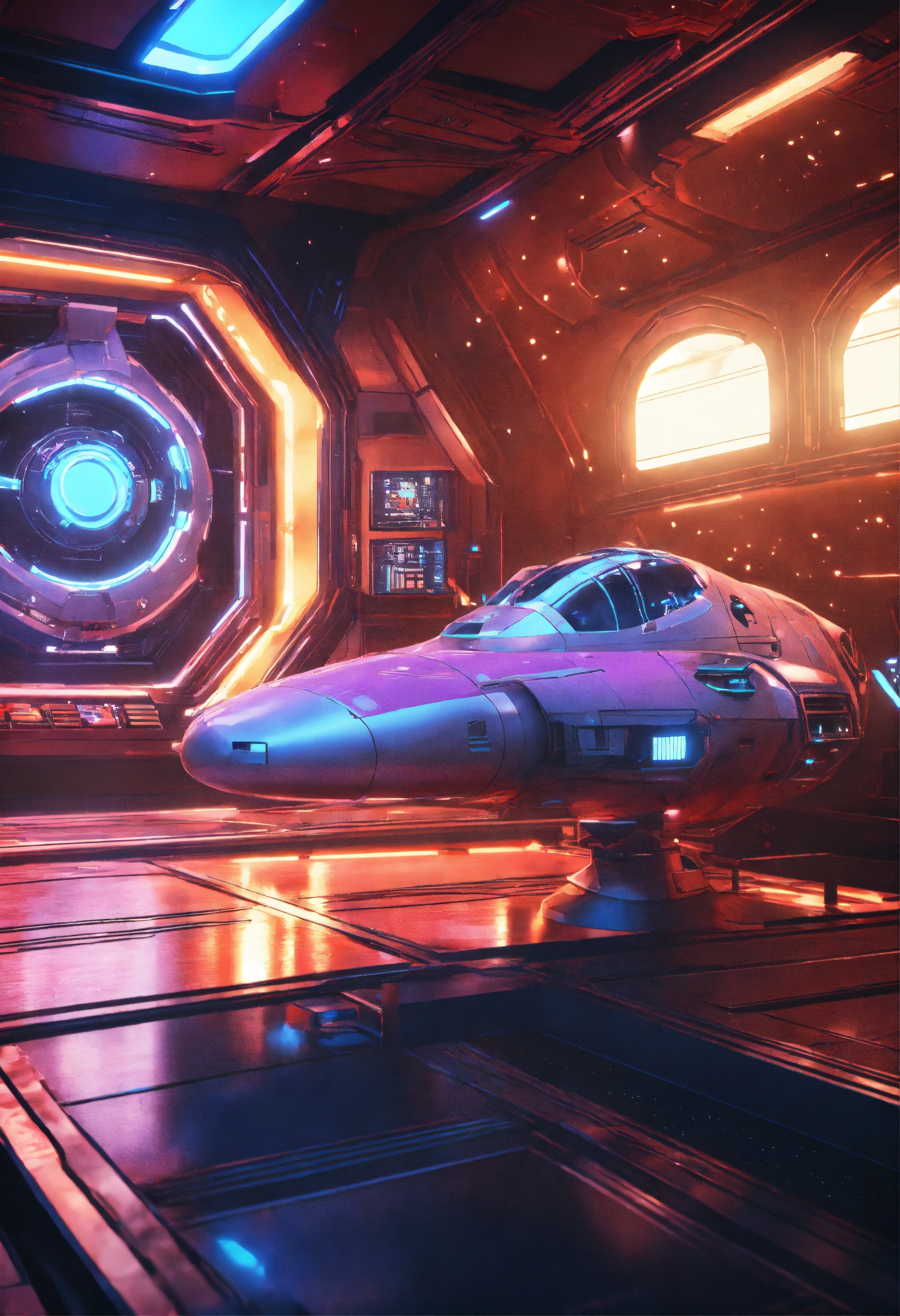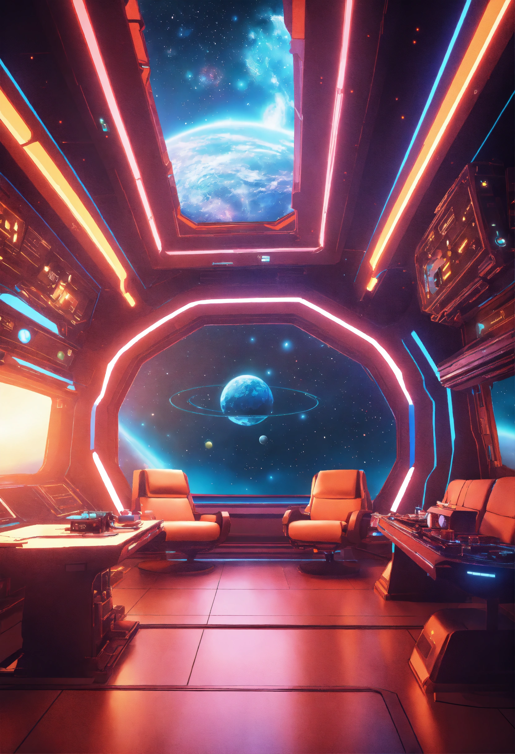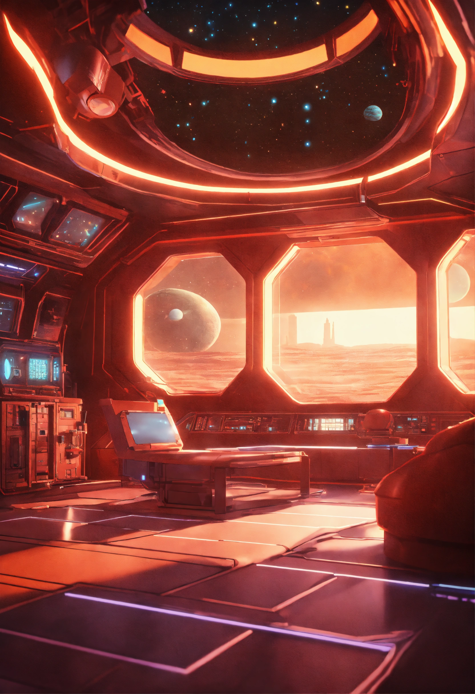 Space composition in sci-fi style, anime style interior of a spaceship in the background, retro rendering, 8k.