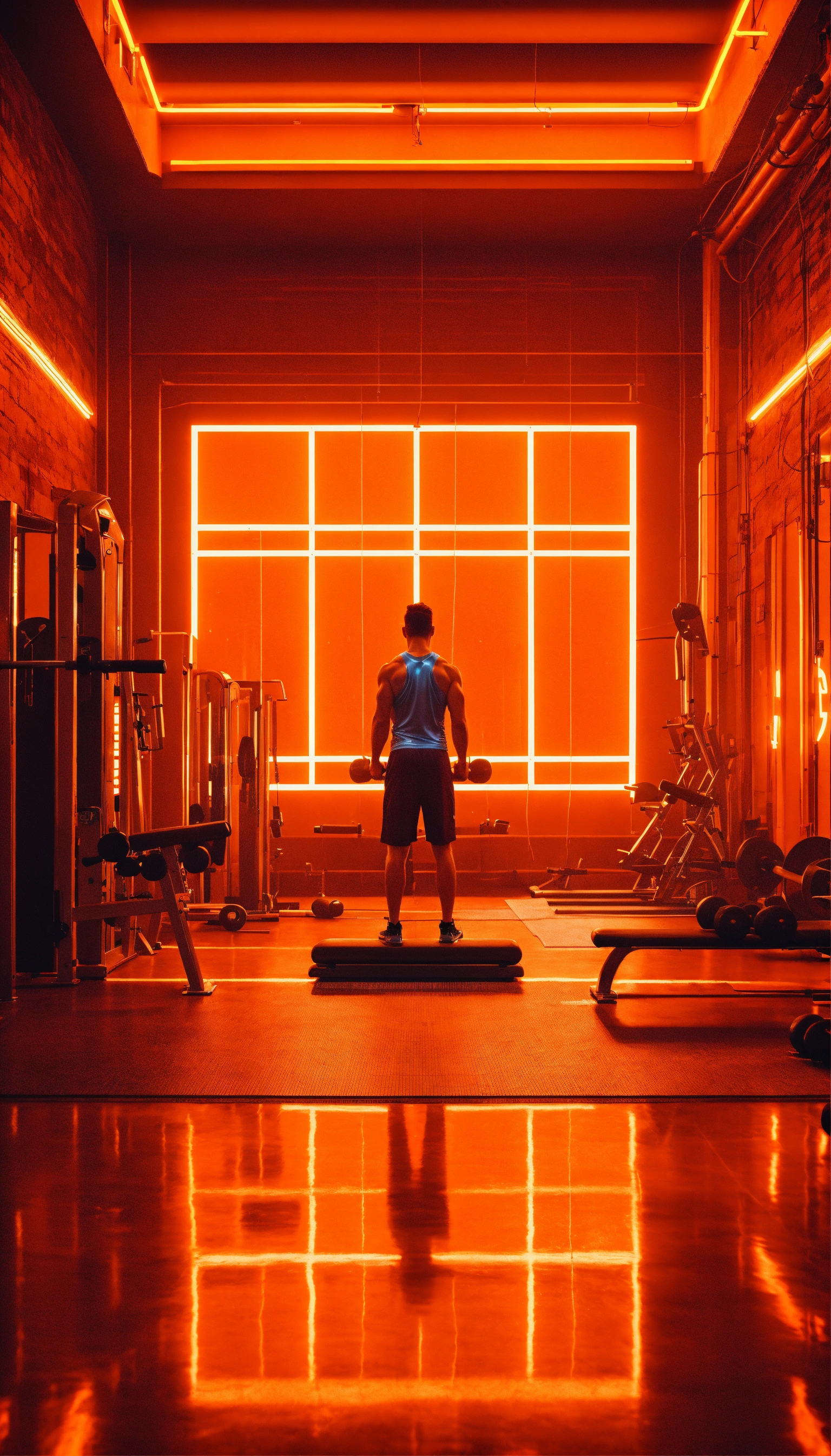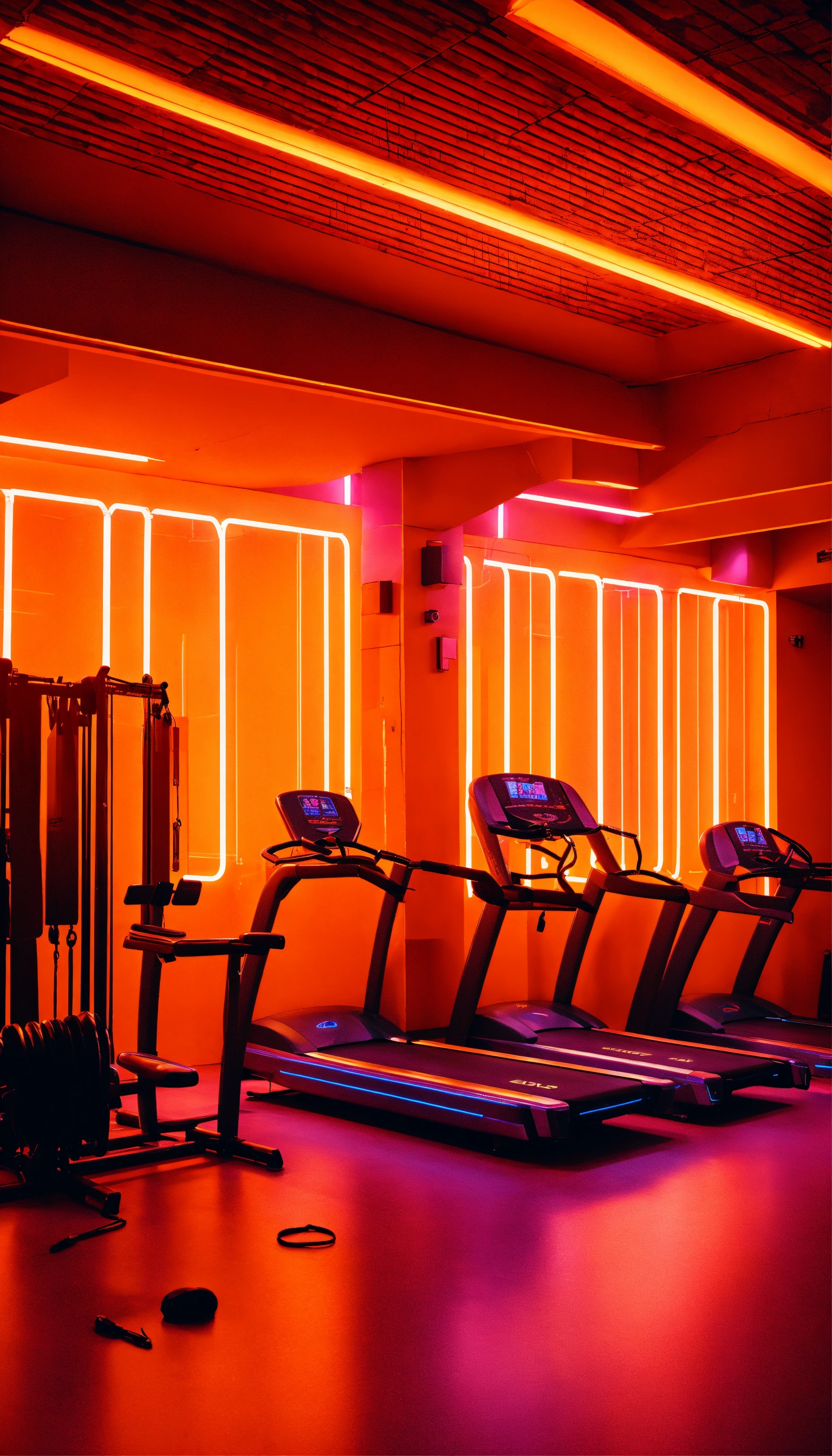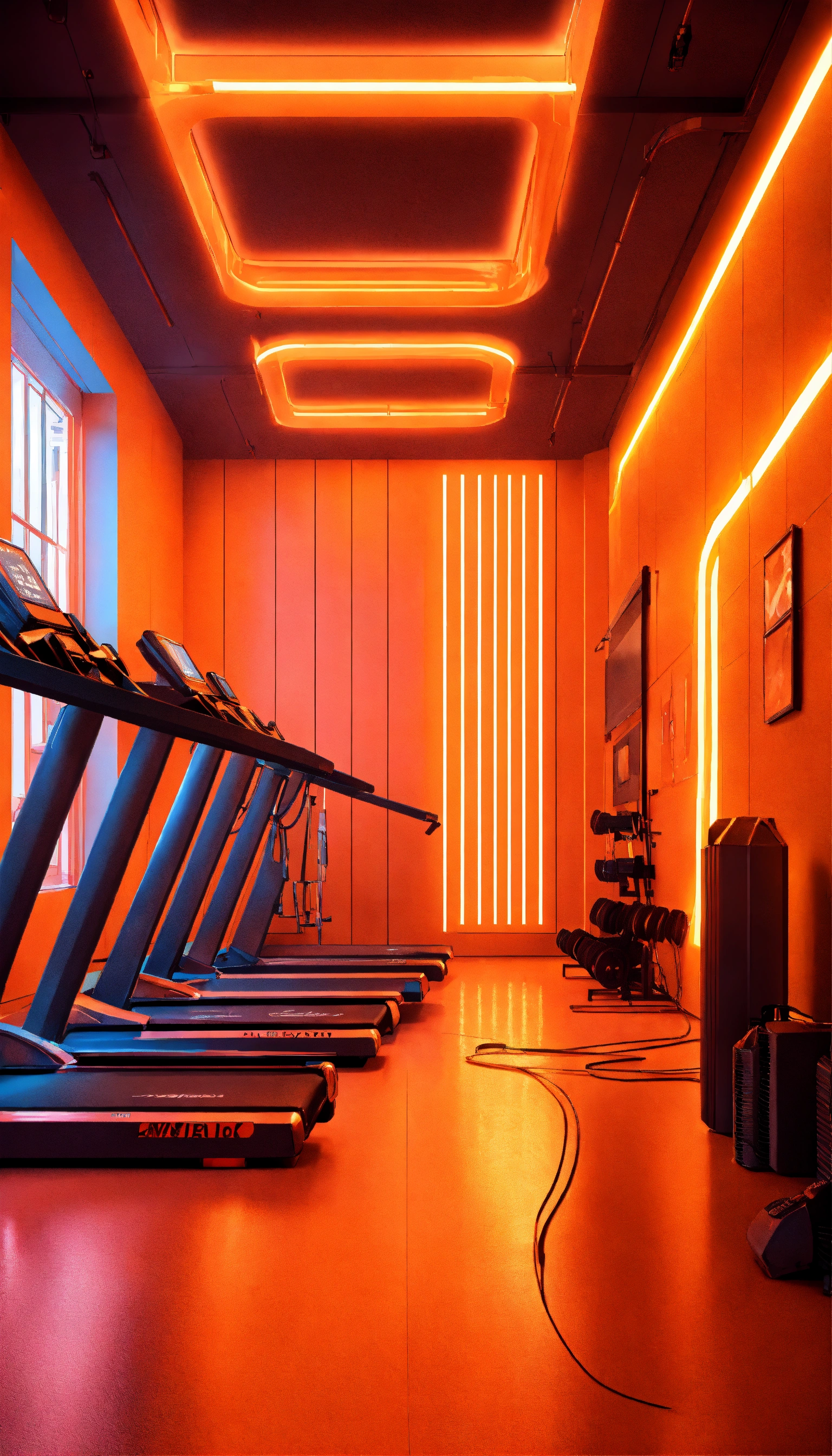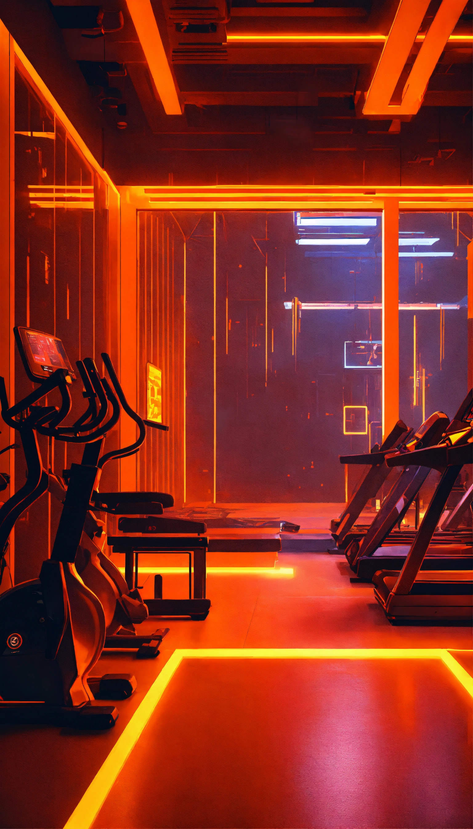 Gym interior in a cyberpunk futuristic orange setting with neon orange light