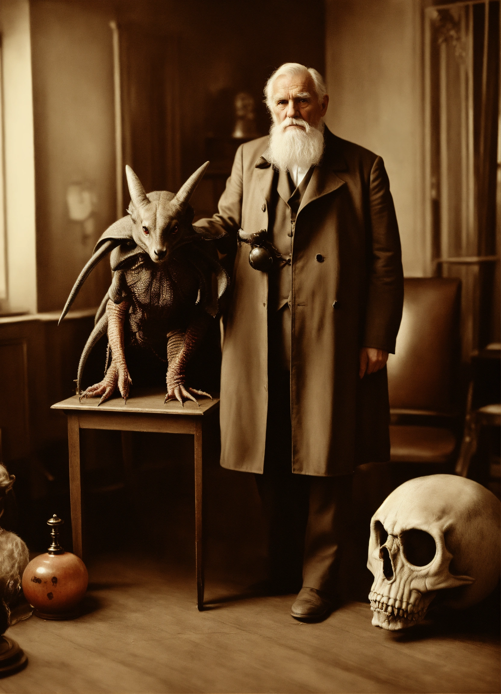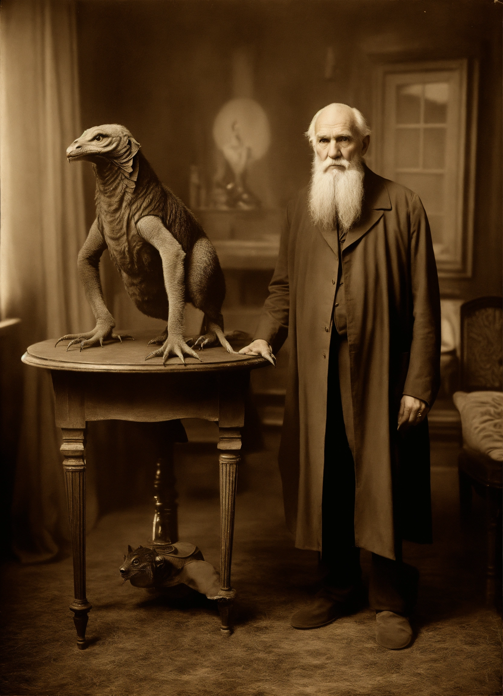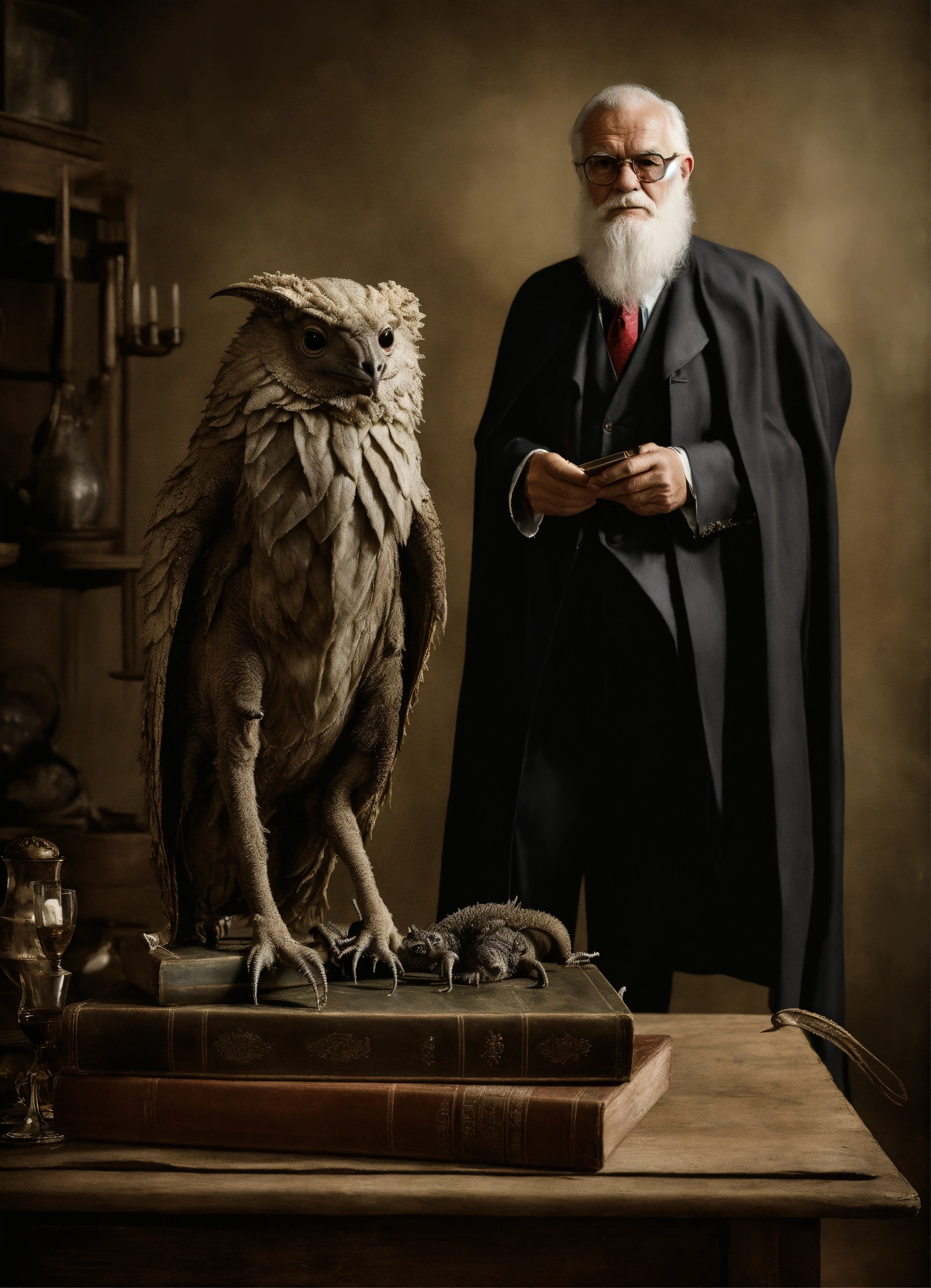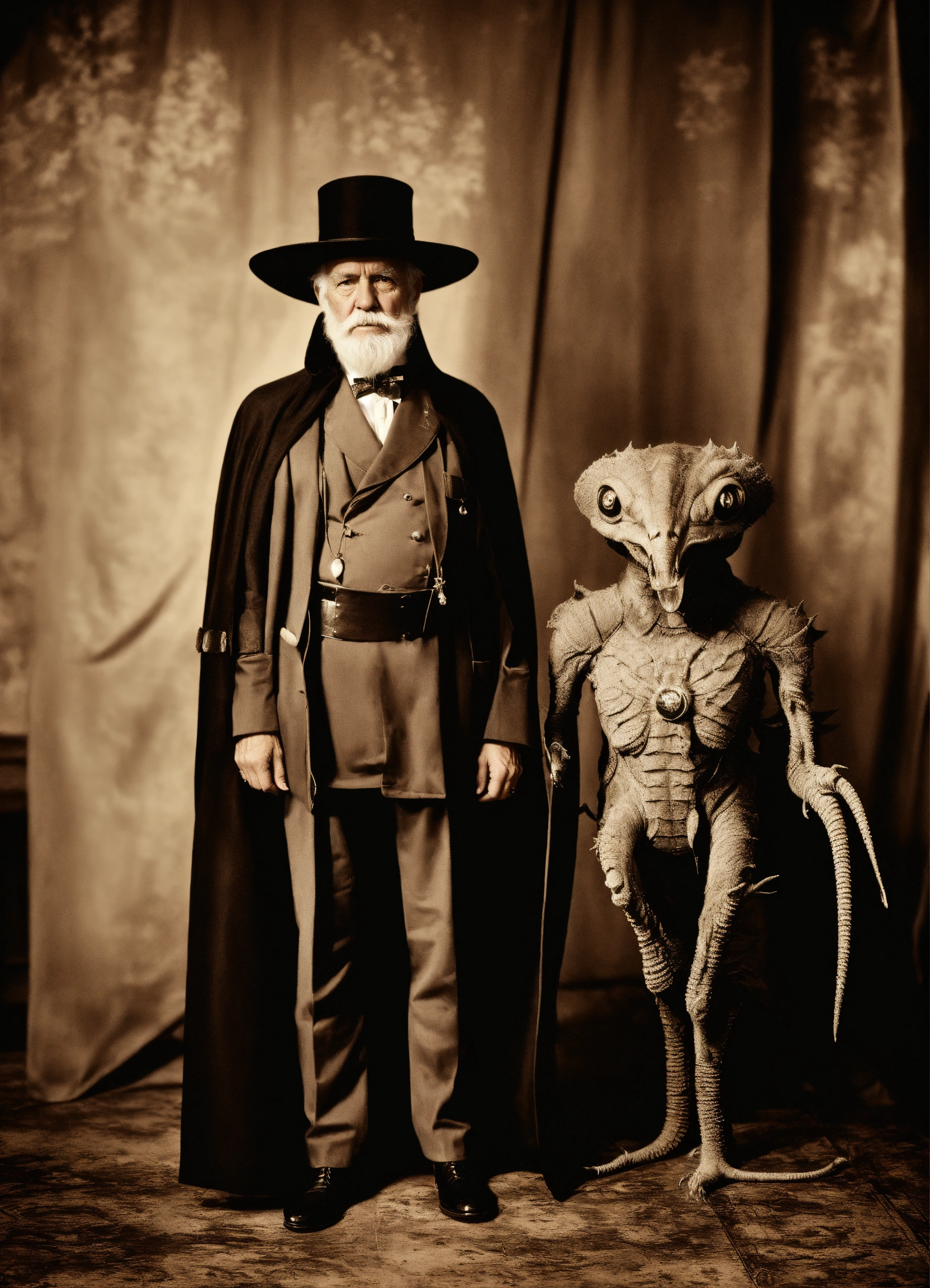 Old man wearing a superhero costume standing next to anstrange creature, in the style of contemporary vintage photography, necronomicon illustrations, tabletop photography, 1890, hyperrealistic animal portraits, ghostly presence, whirring contrivances