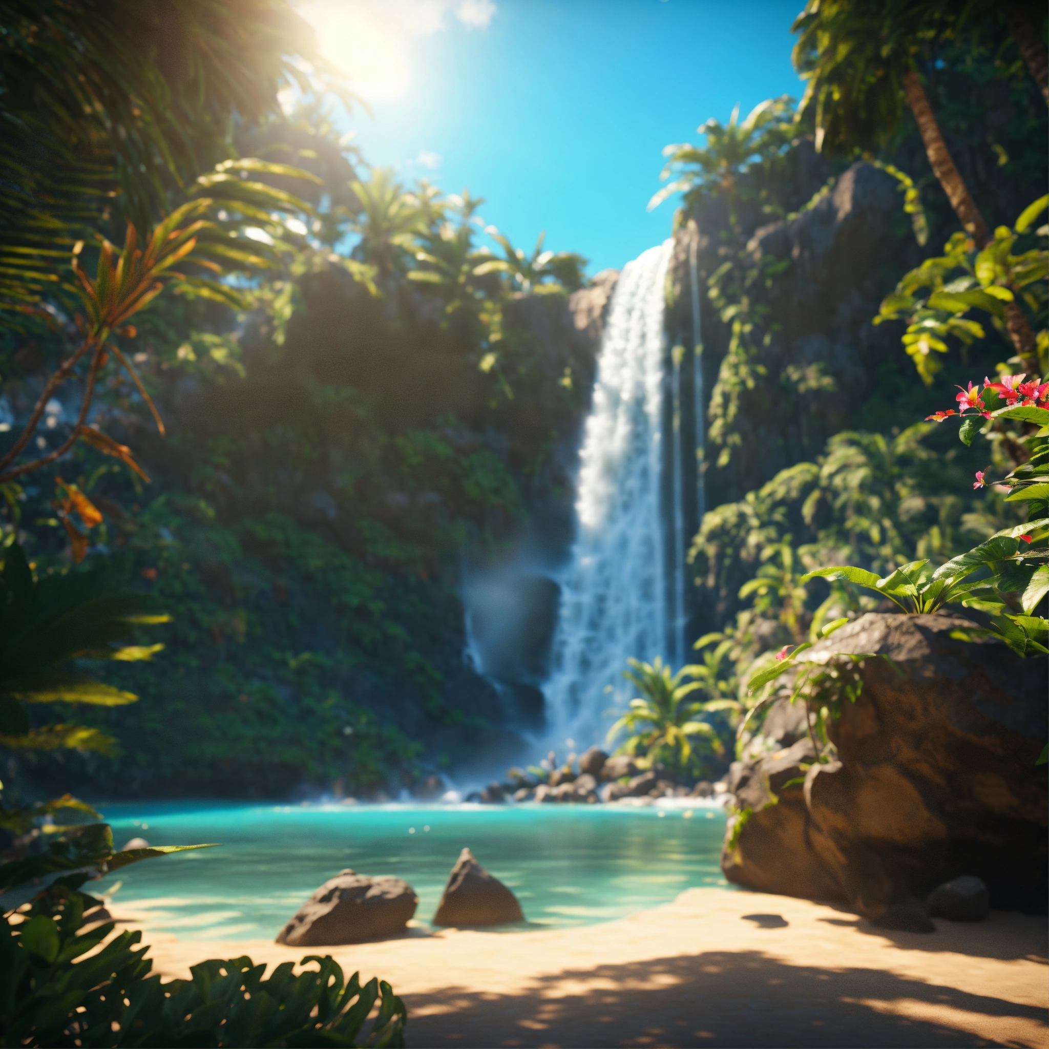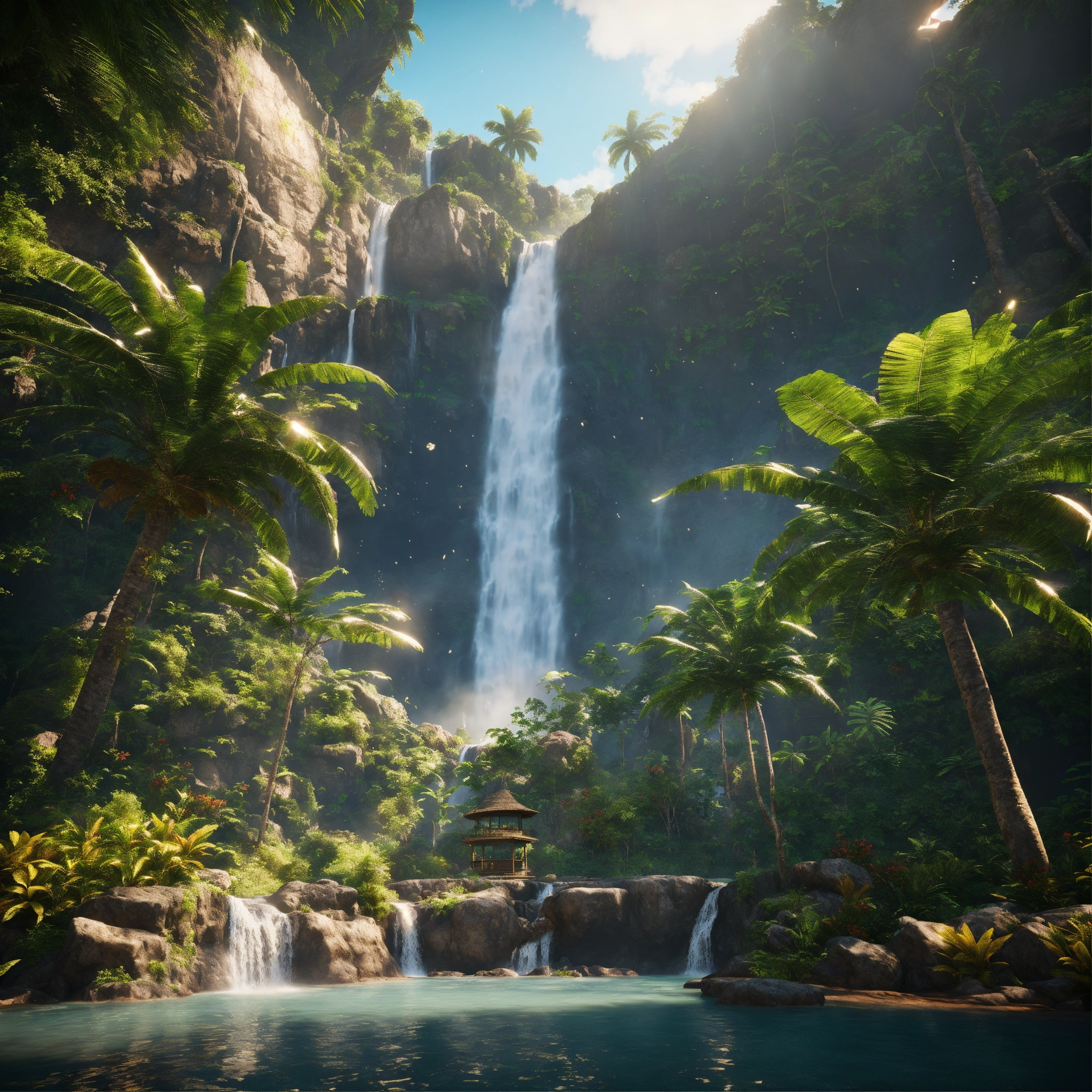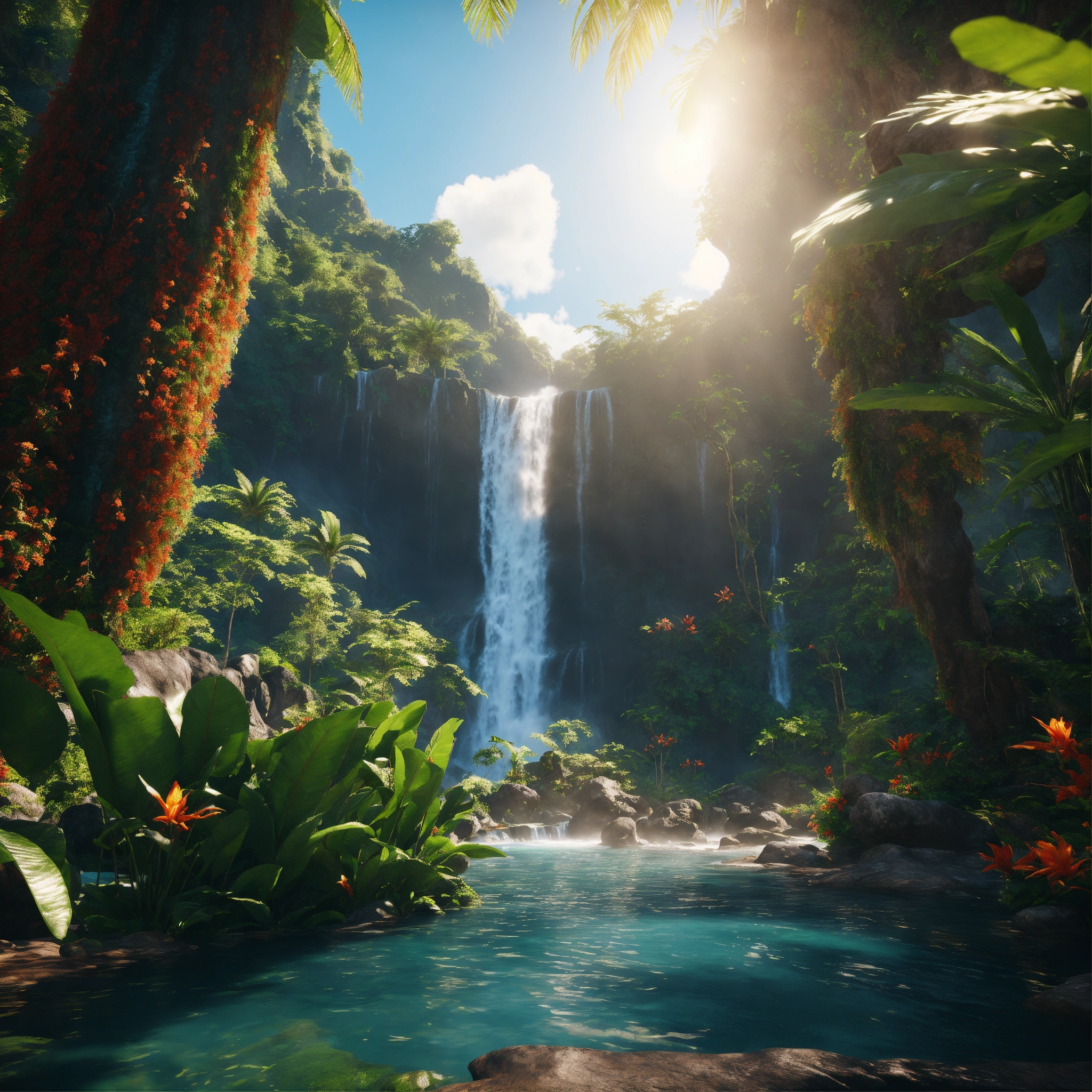 Vast tropical paradise, tropical flora, with magical waterfall, cinematic style, high detail, hr, realistic physics, photorealistic, mid-day, bright clear sky, unreal engine, hdr, 8k