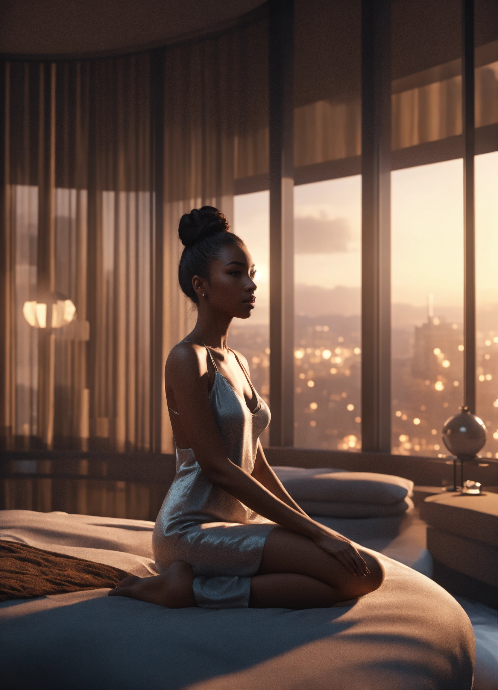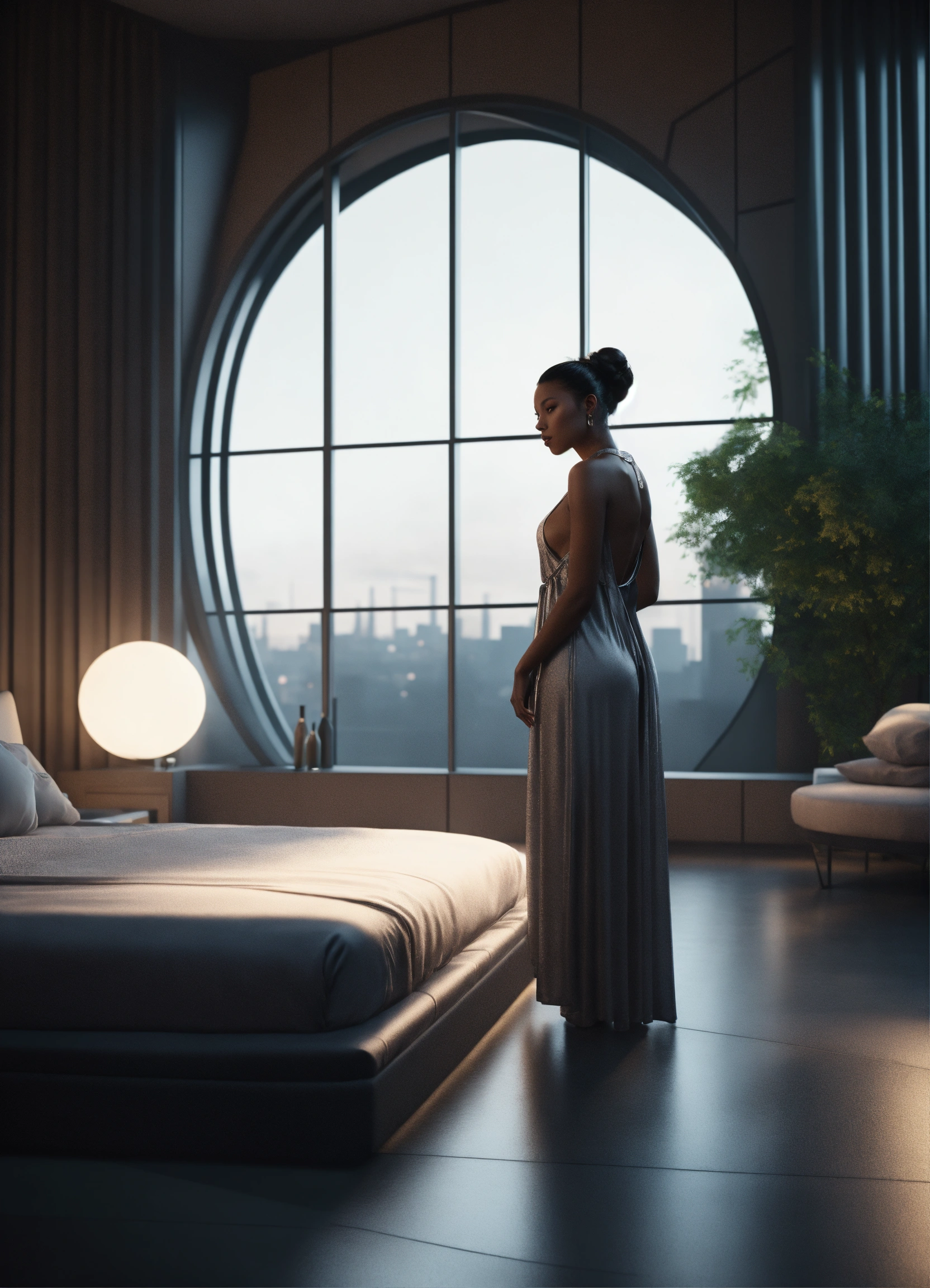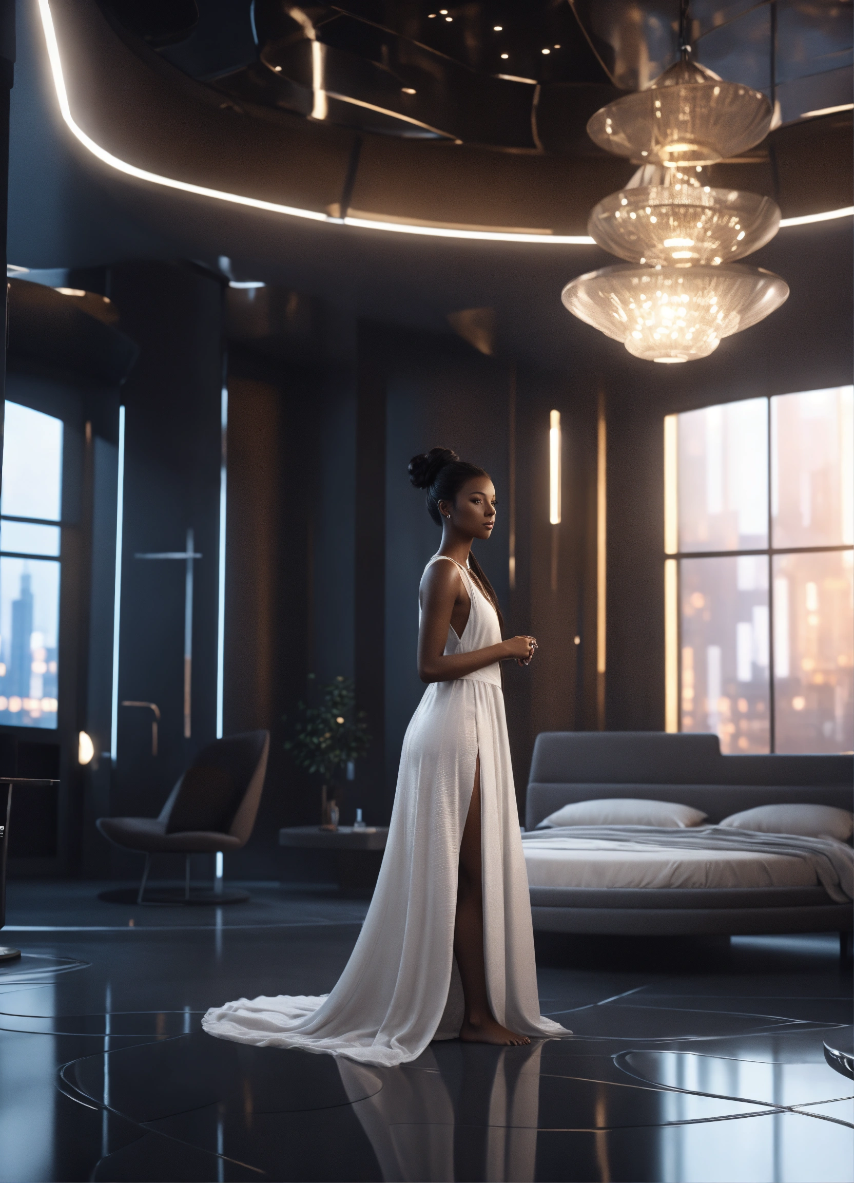 30 years old, dark skin female, and long dark hair on bun, wide hips, dressed in night gown, barefoot, in large upscale futuristic bedroom. bright monochrome furnishings large round windows, serious demeanor, 8k, unreal engine.