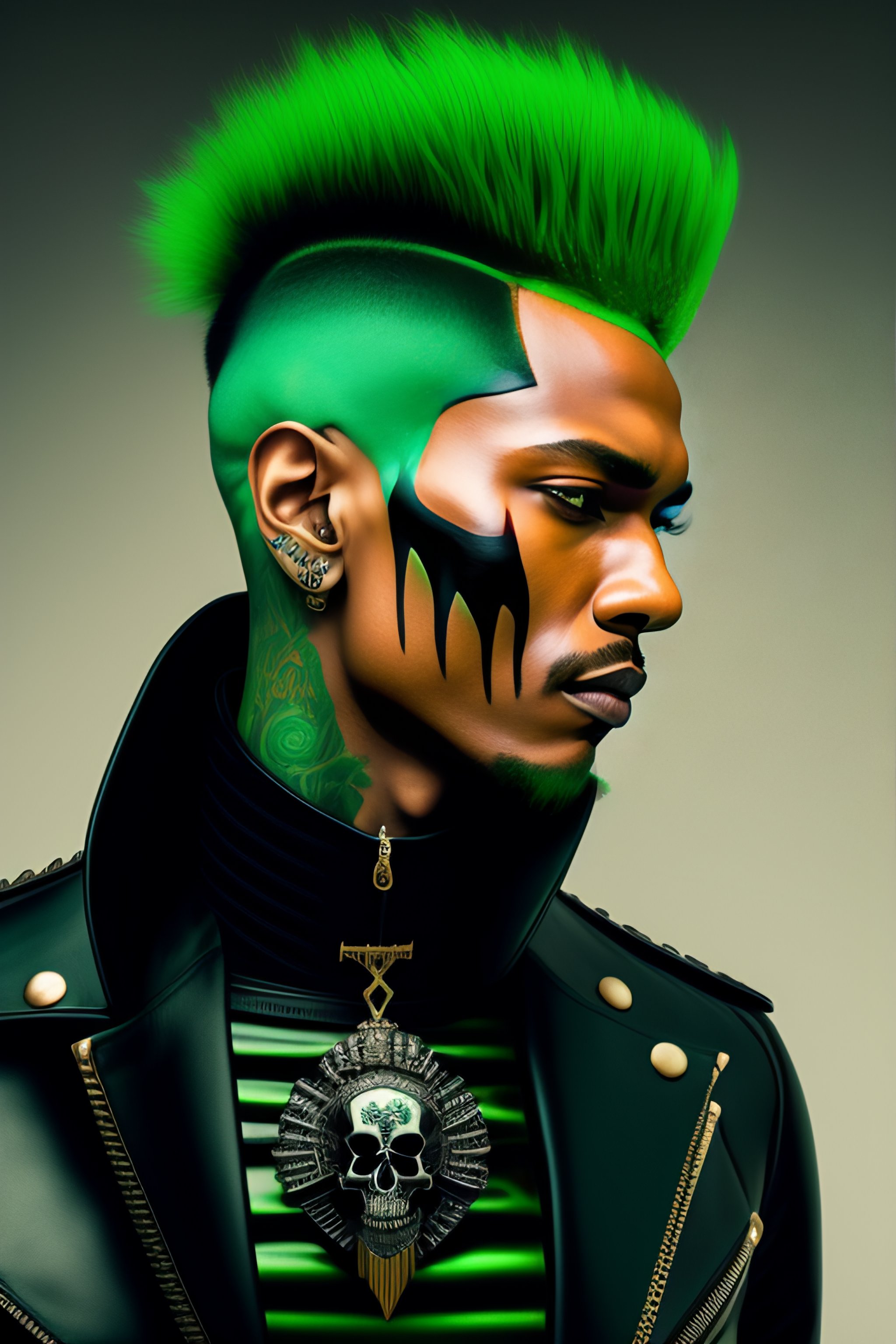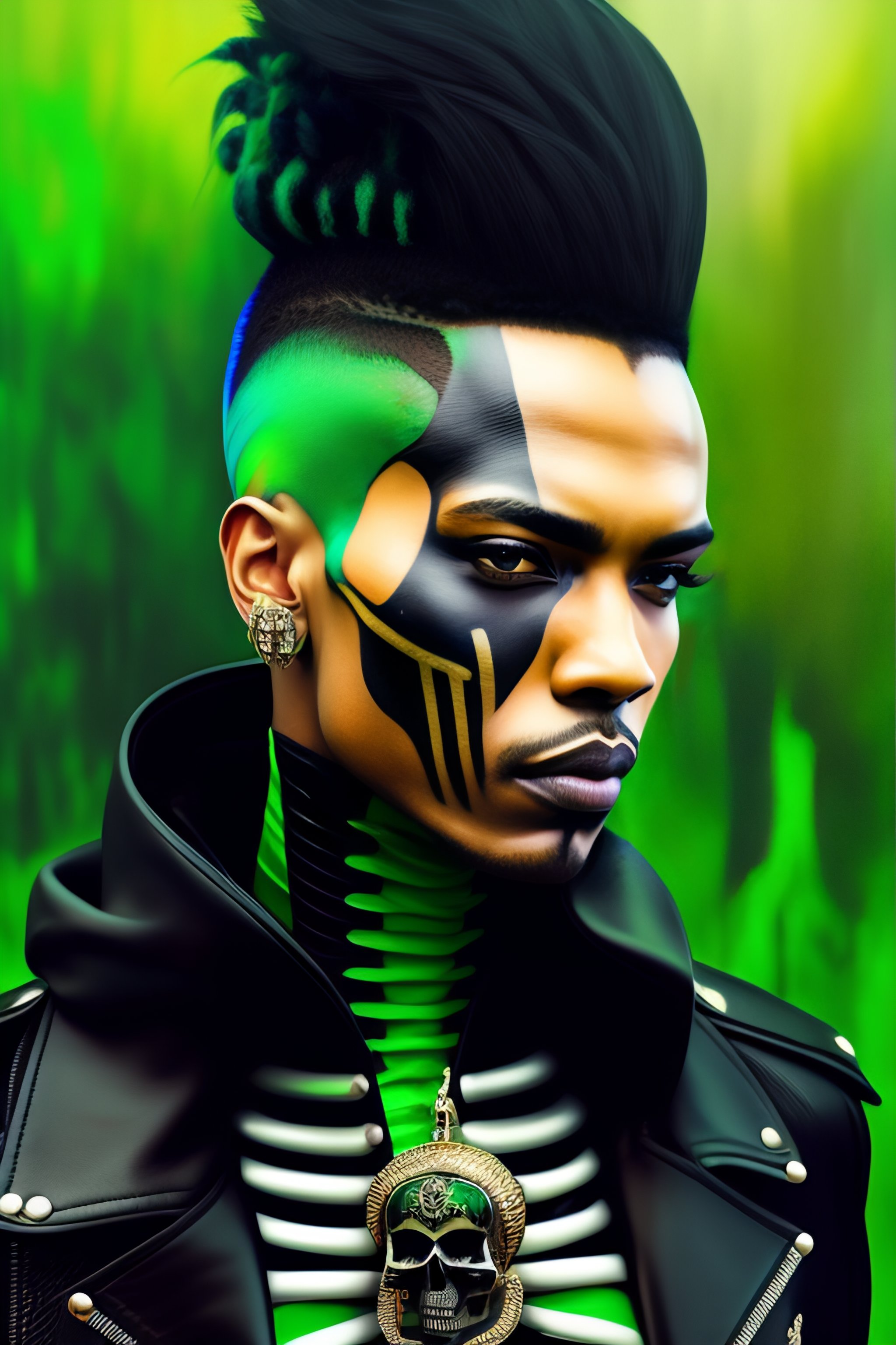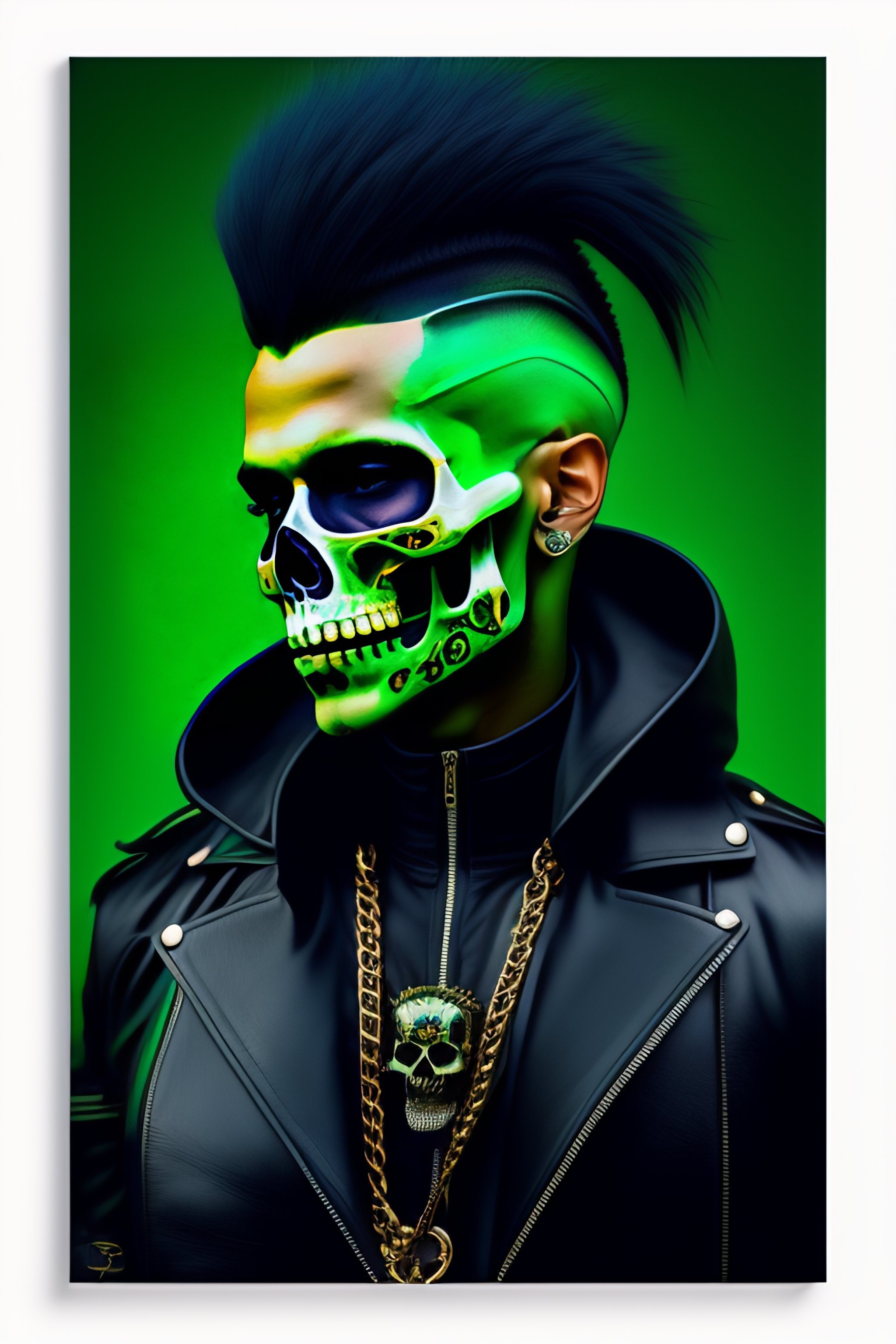 Hyper detailed fine art portrait of skeleton punk with skull head, green color mohawk haircut, he wears a long black leather raincoat and anarchy symbol on his chest