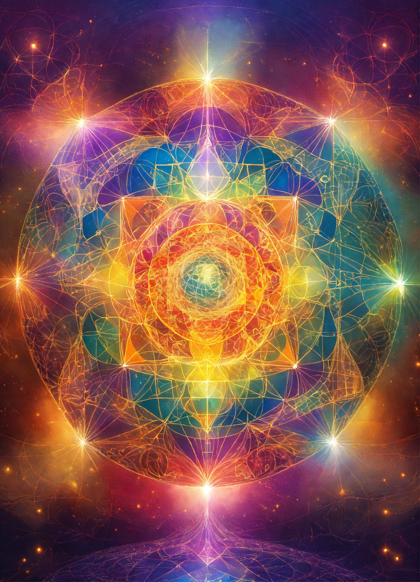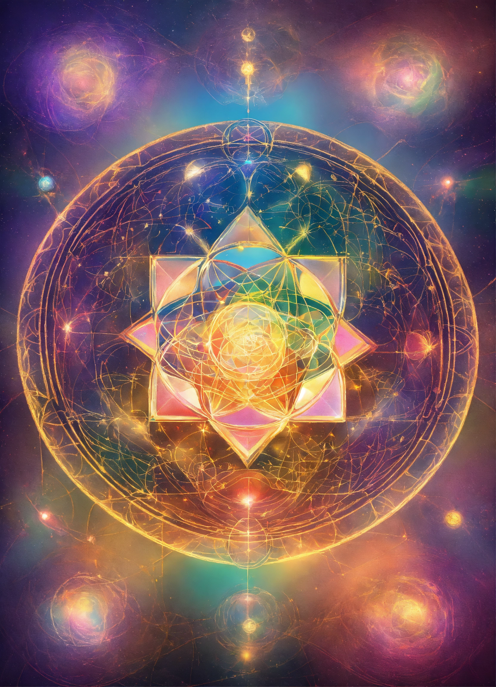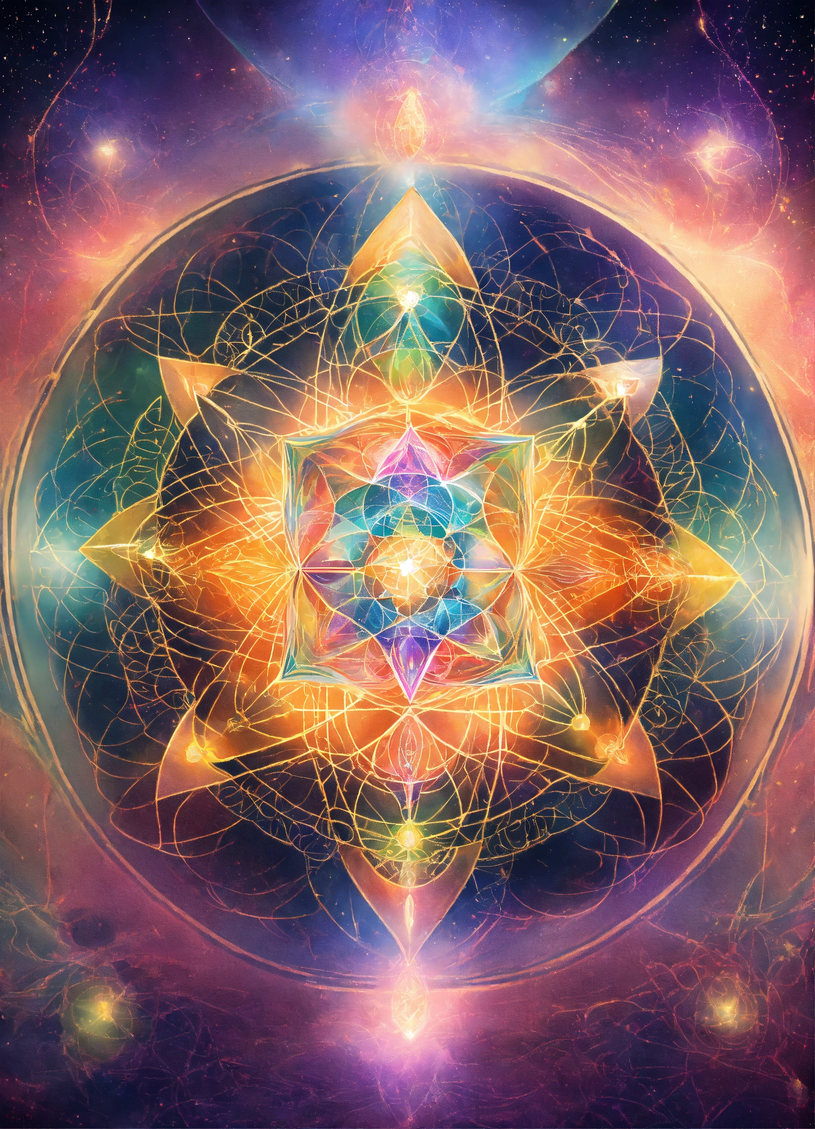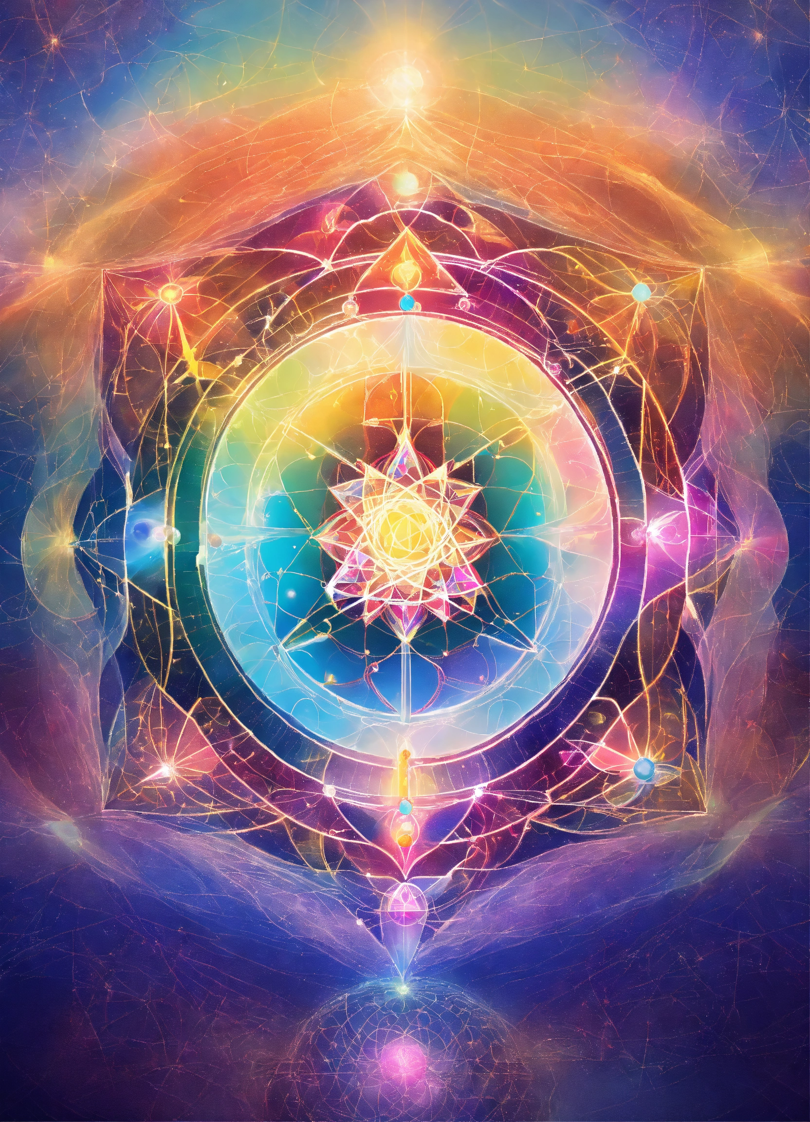 Activation communication symbole, adn, connected to other universes, to the invisible worlds, pastel colors, shades multicolors, shinning light, sacred geometry