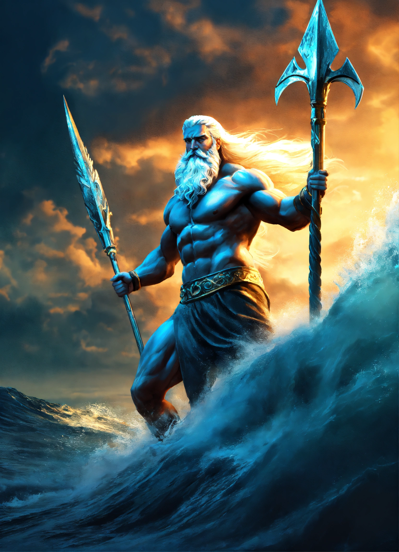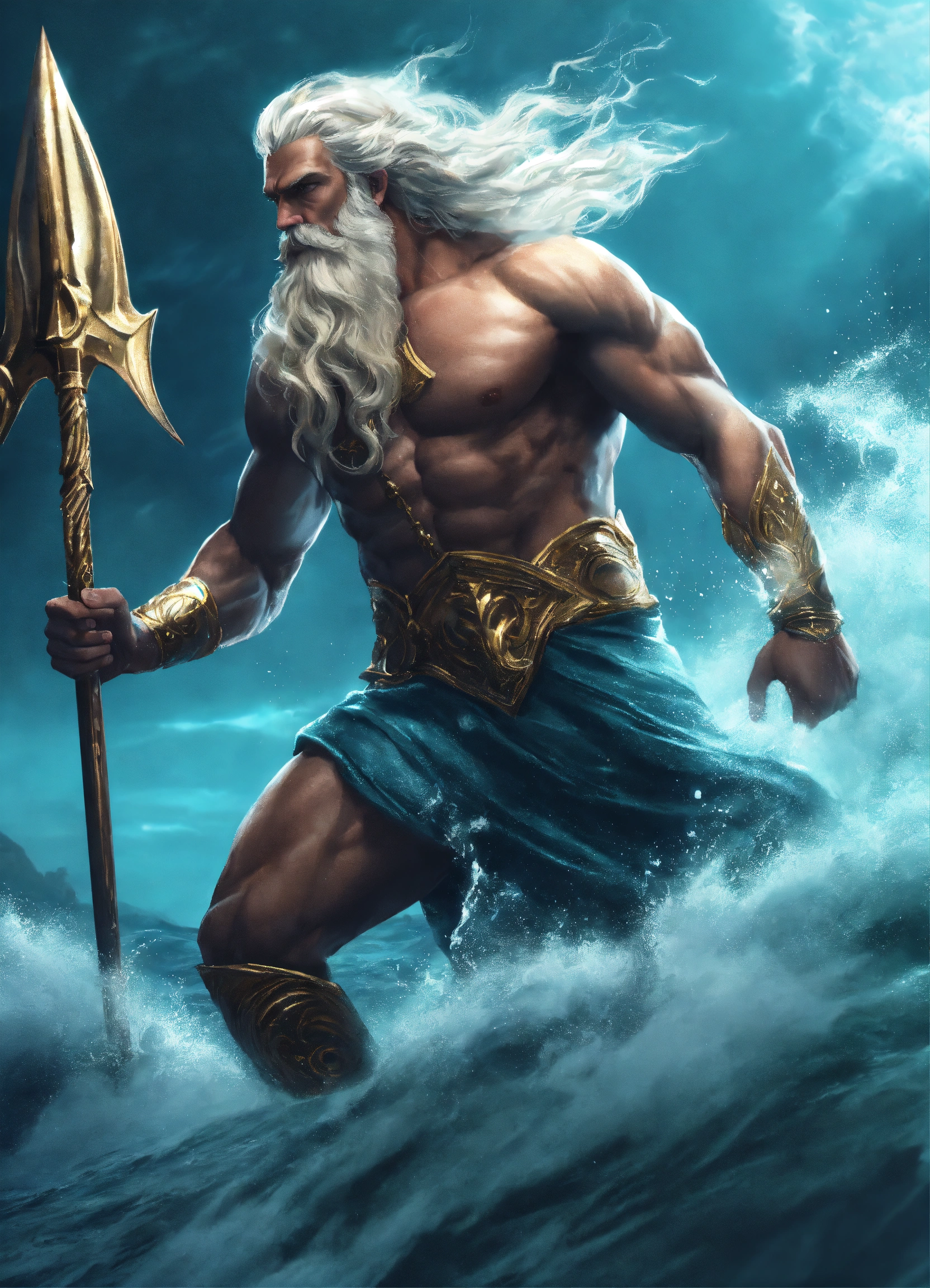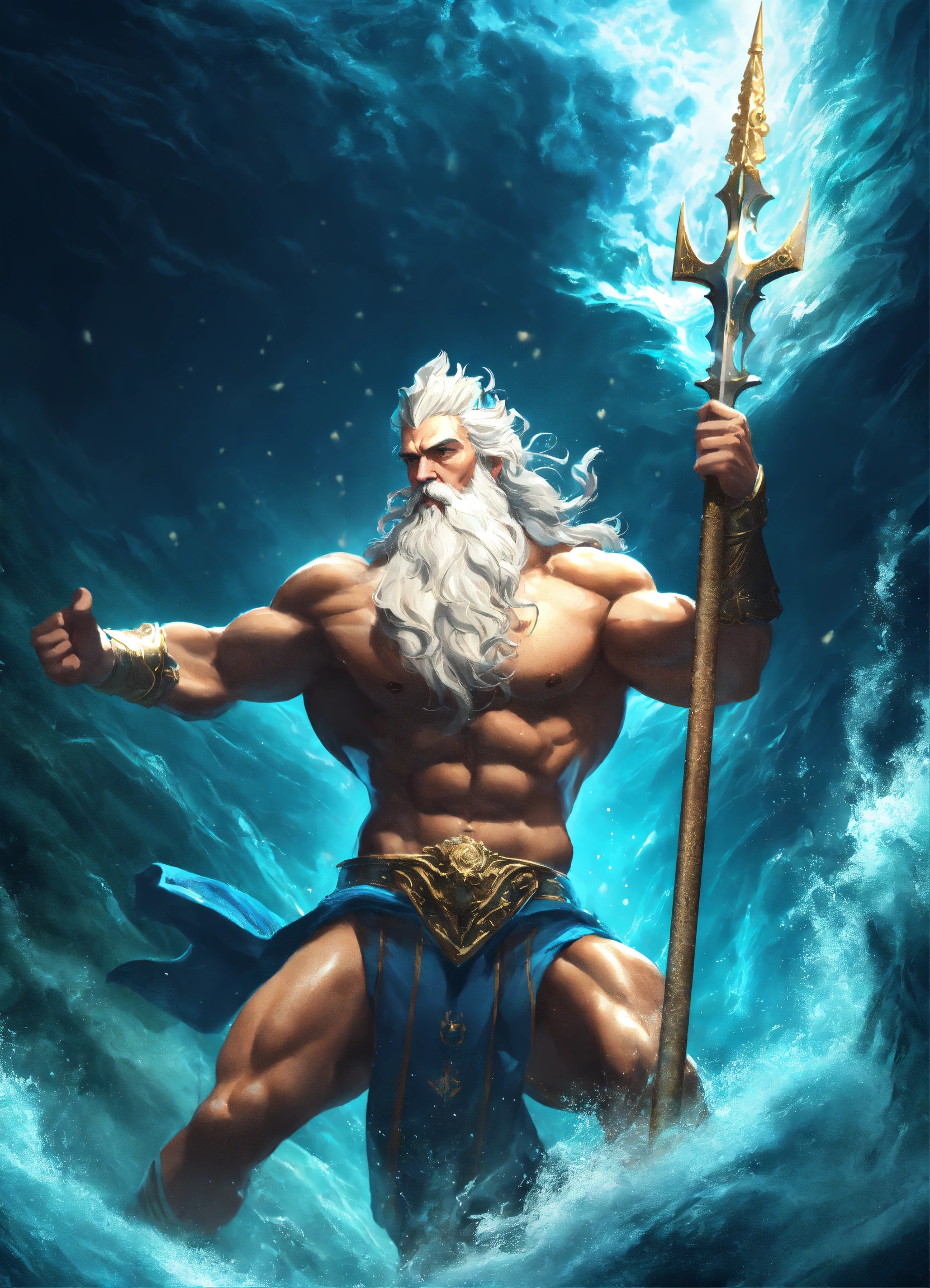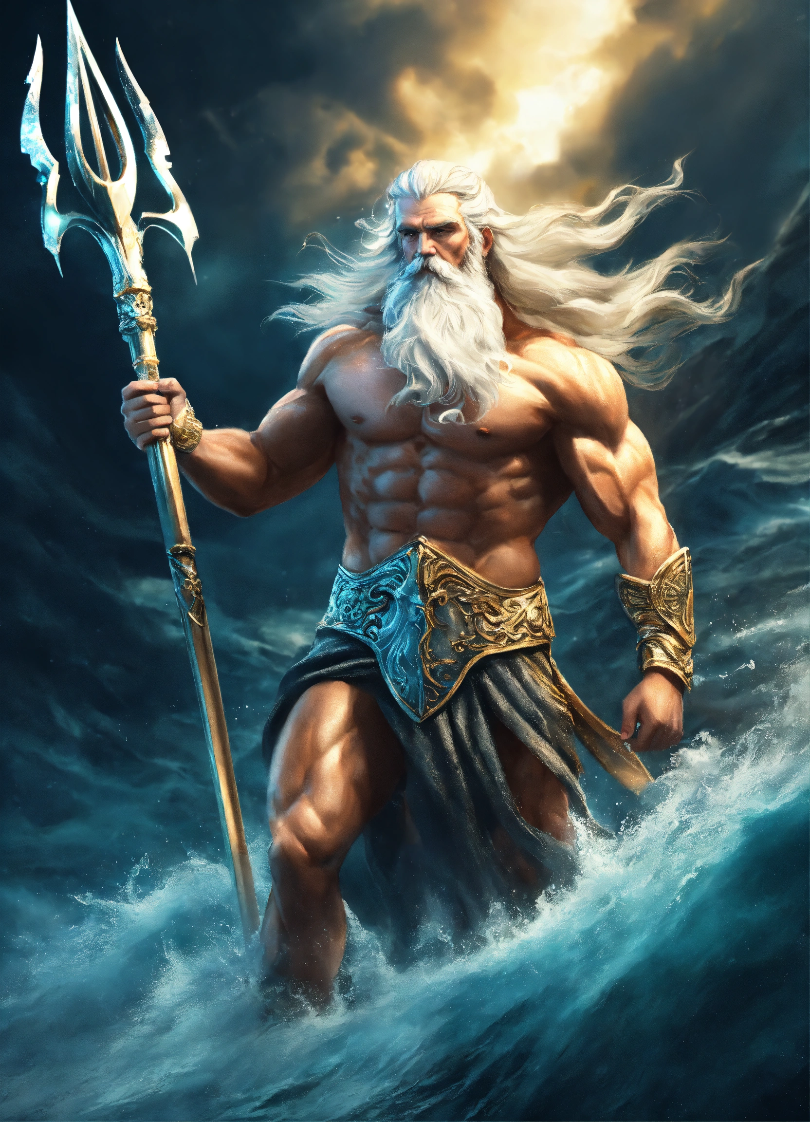 Poseidon in profile, god poseidon emerging from a raging hip-deep sea, harpooning his trident like a javelin thrower, thunder, fighting stance, realistic, hd style white beard and long white hair, muscle, 4k