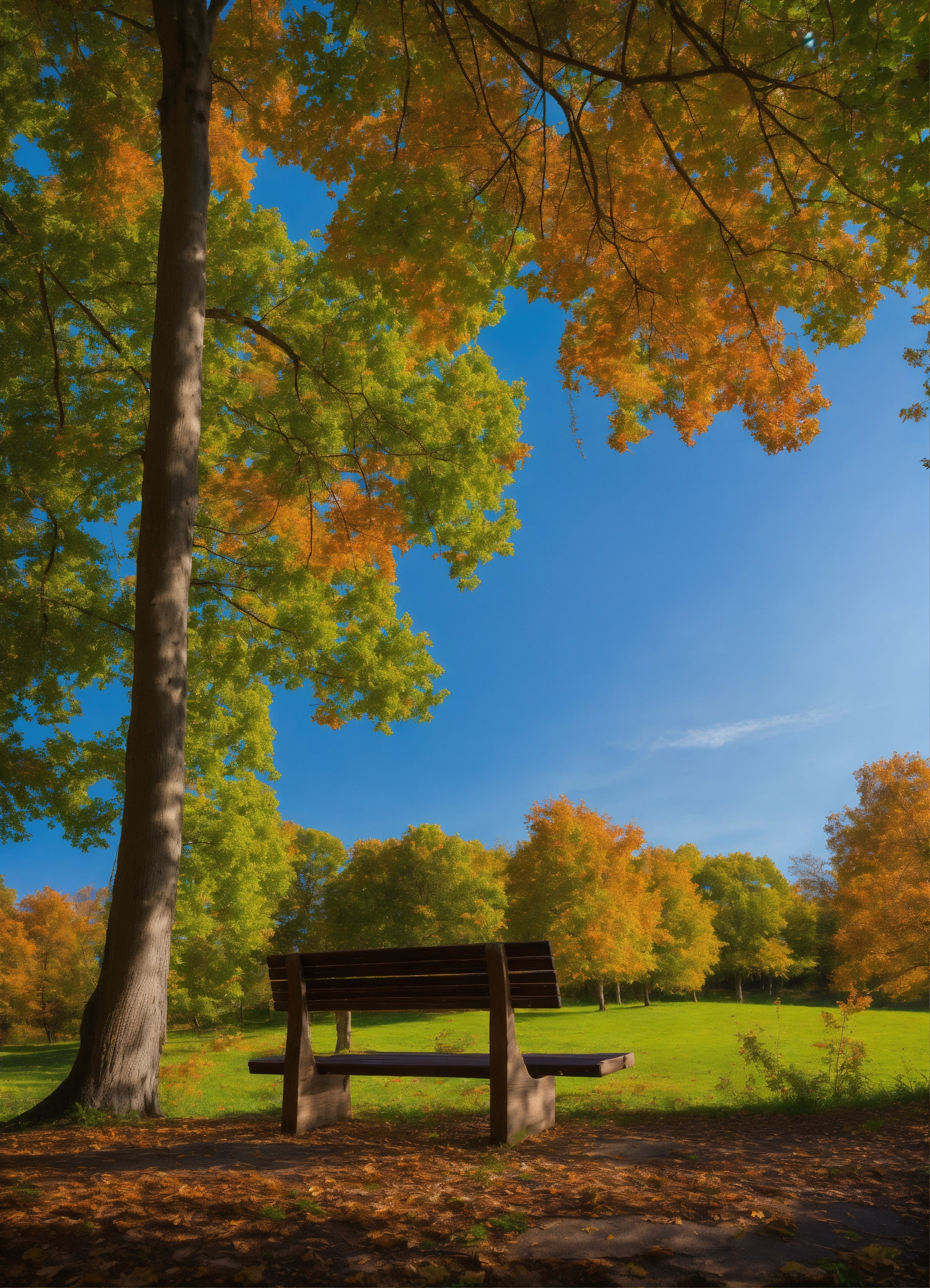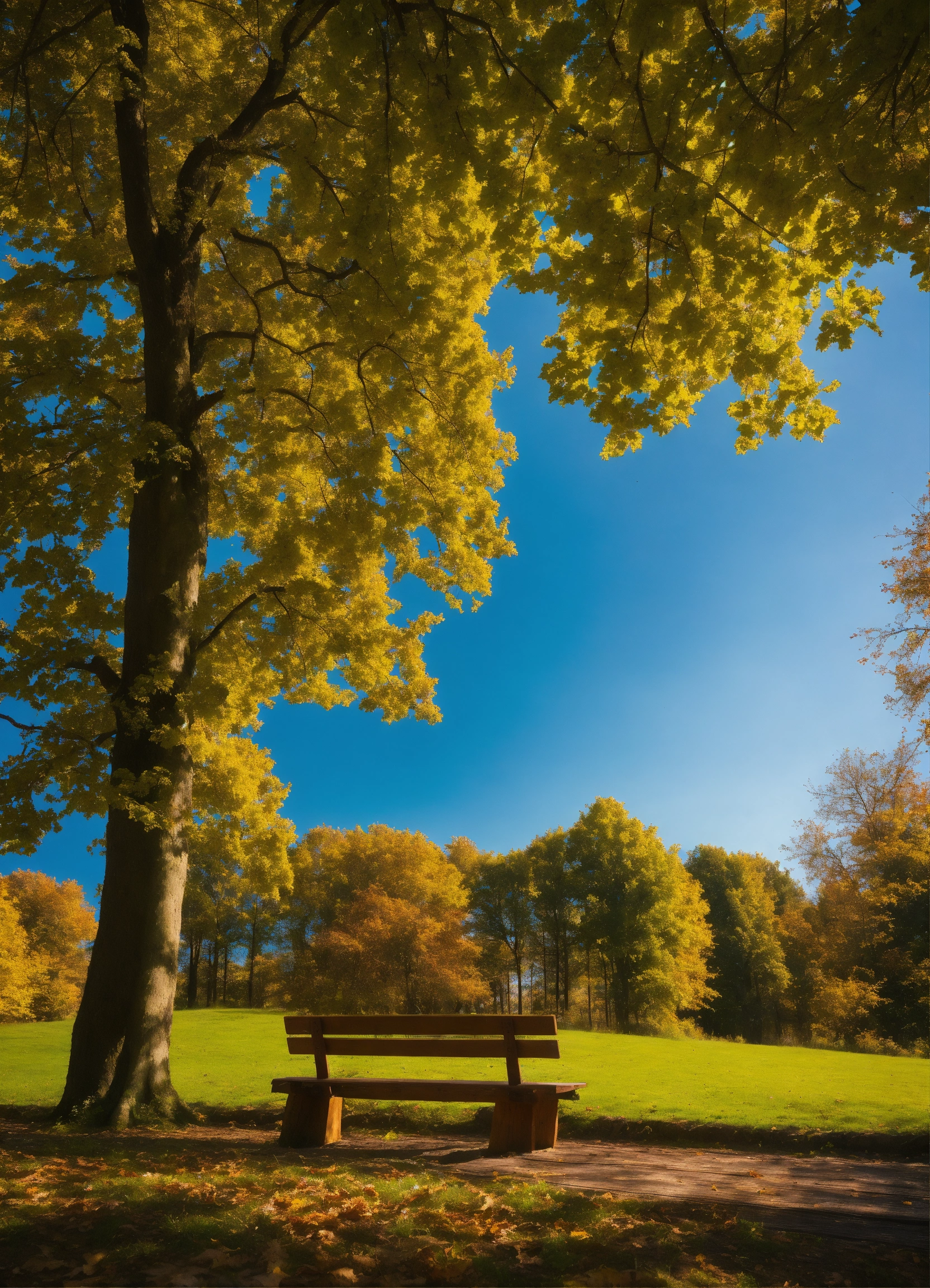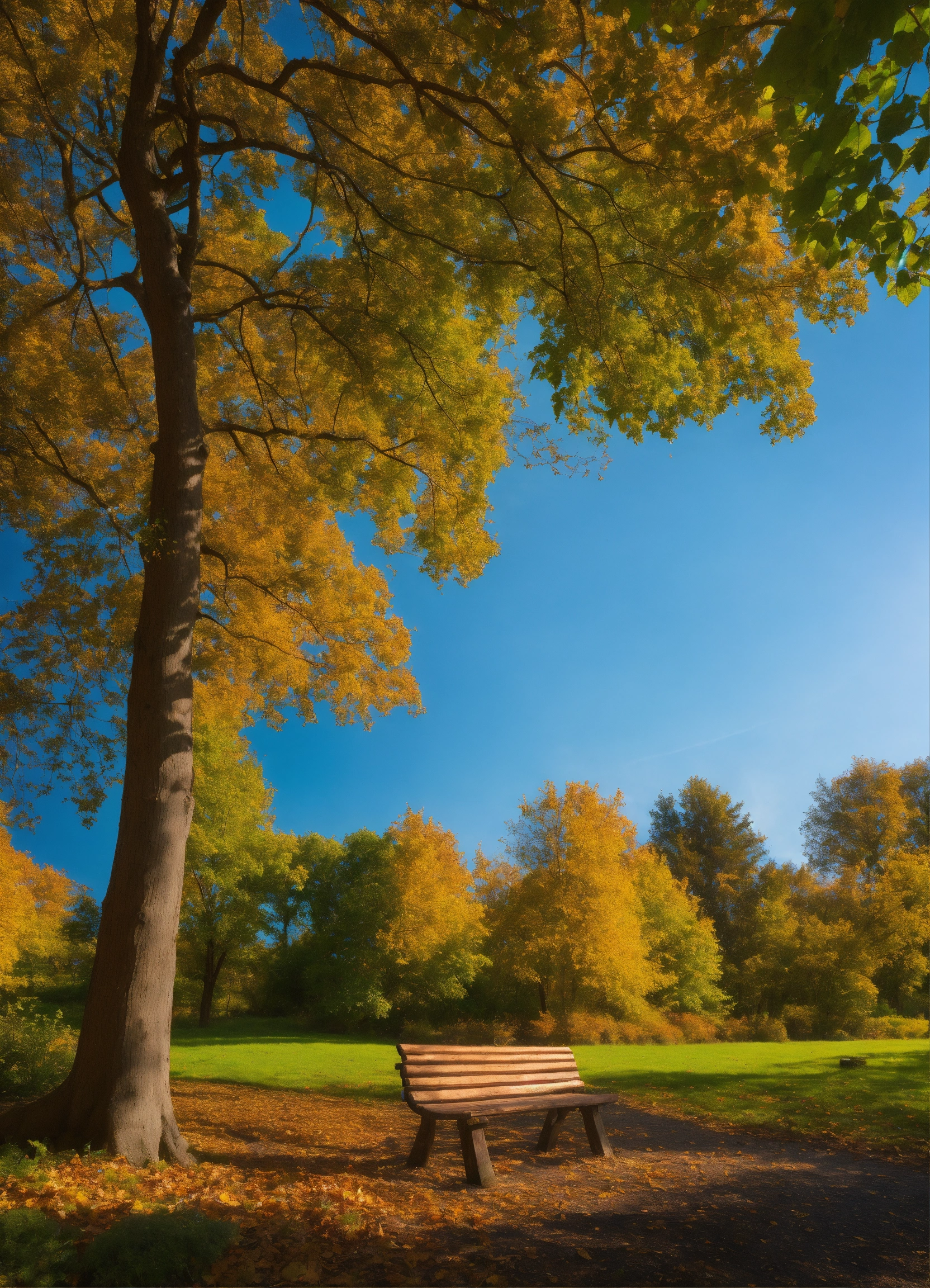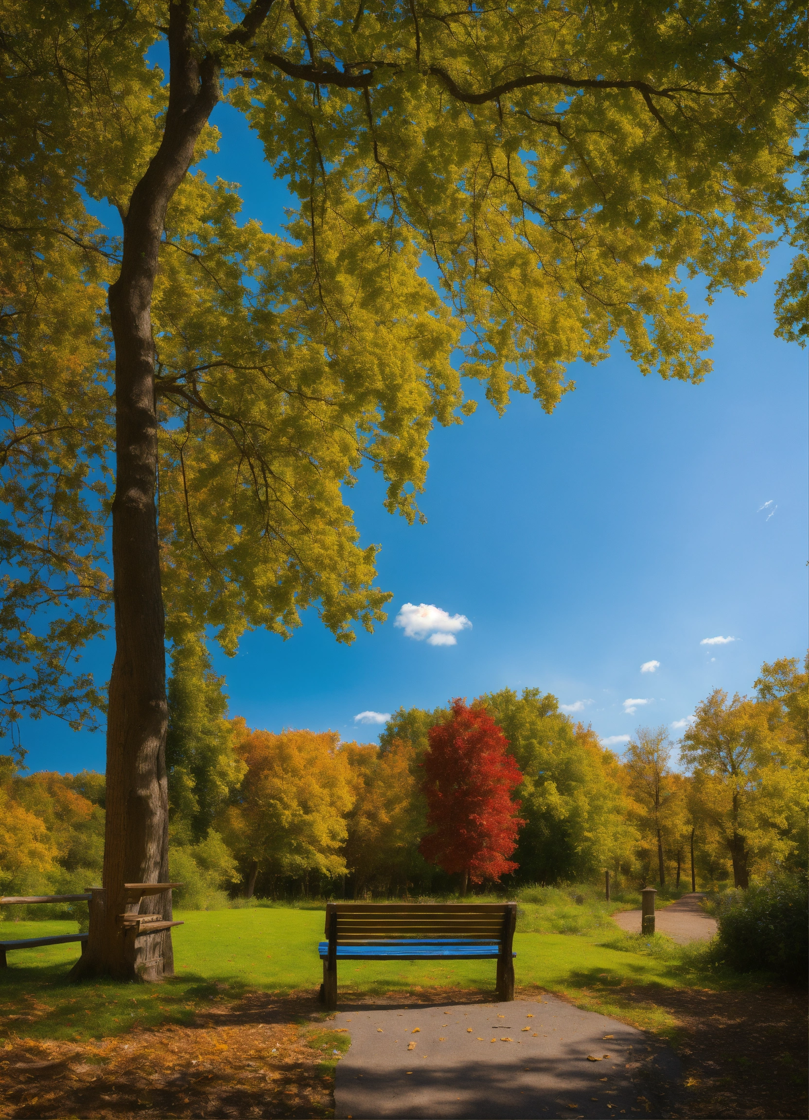 Blue sky calming trees with beautiful leaves a wooden bench on the right of the picture
