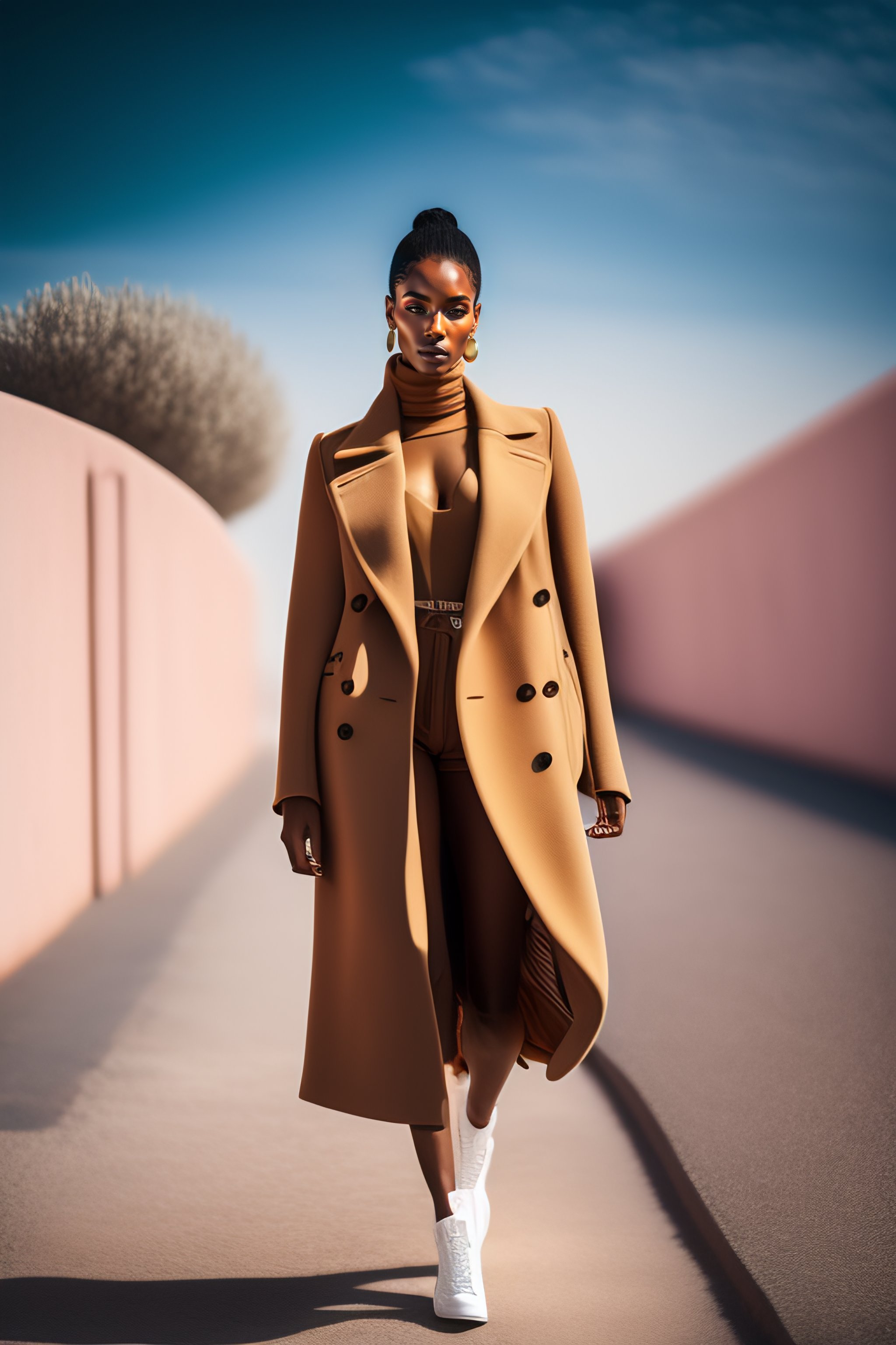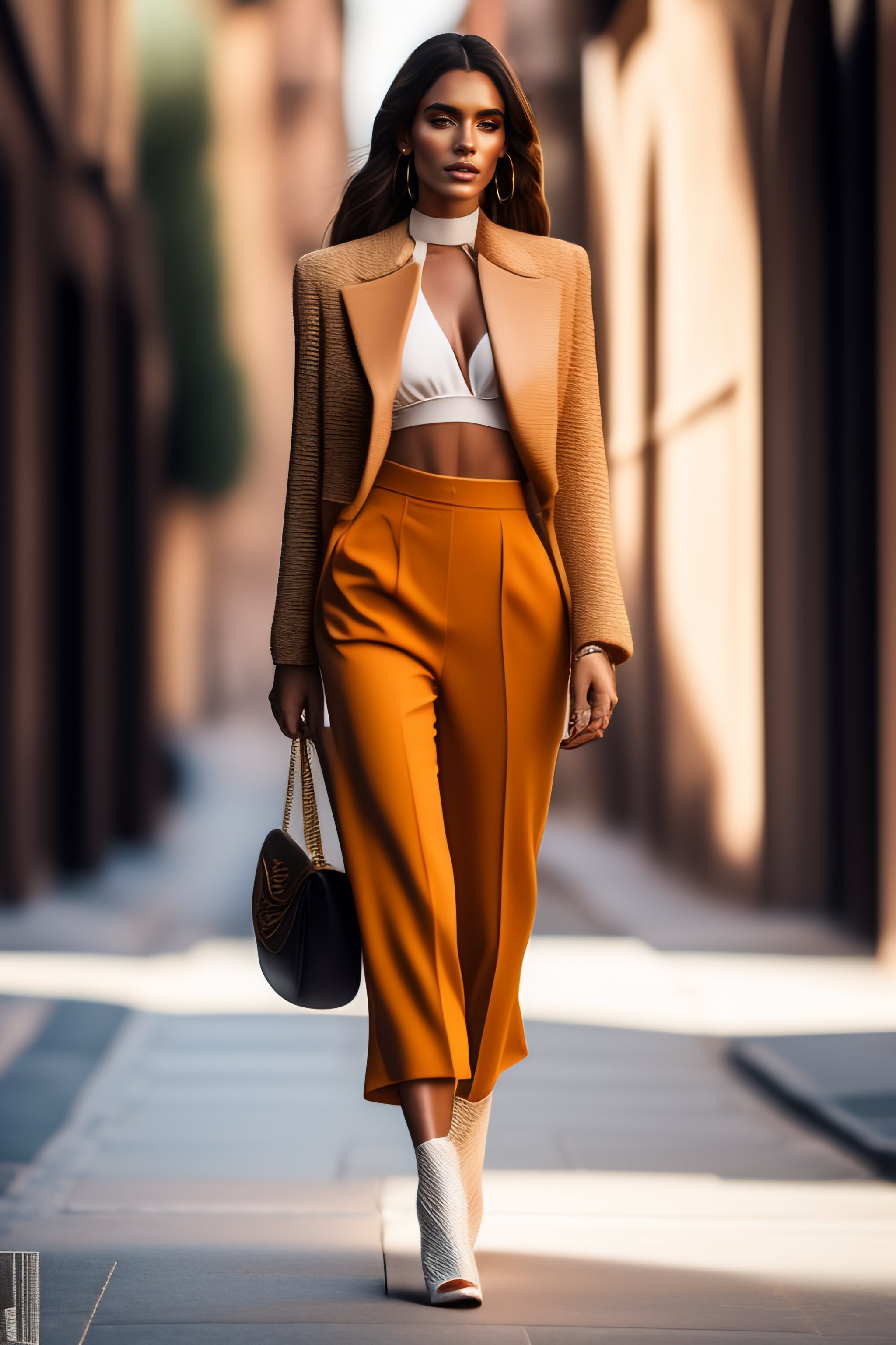 Full body studio portrait of spanish model wearing street style outfit, natural textured skin, real textured clothing, well defined hands, walking pose, hyper realistic, natural light, fashion magazine, depth of field, iso 400, photorealistic, 8k