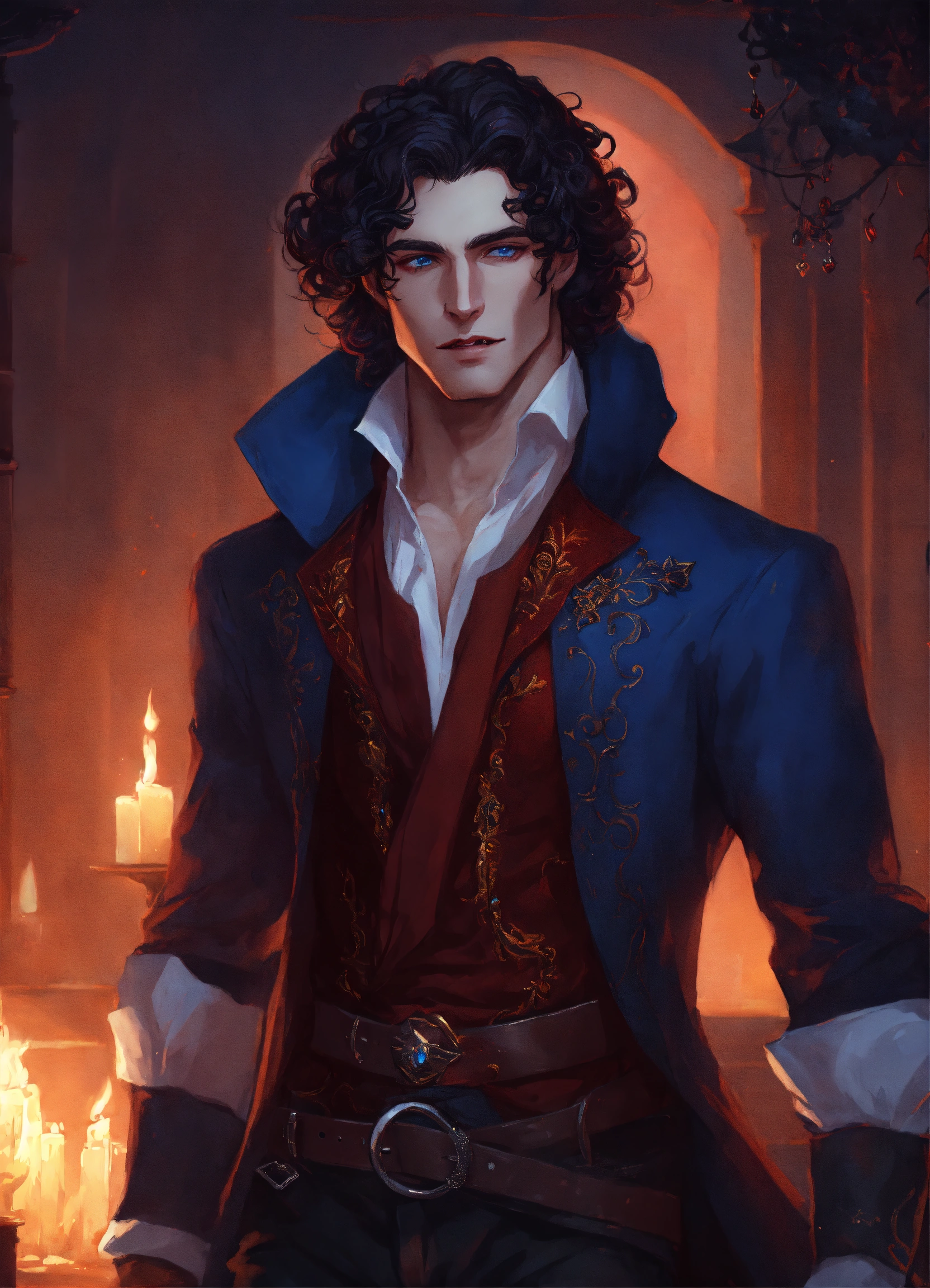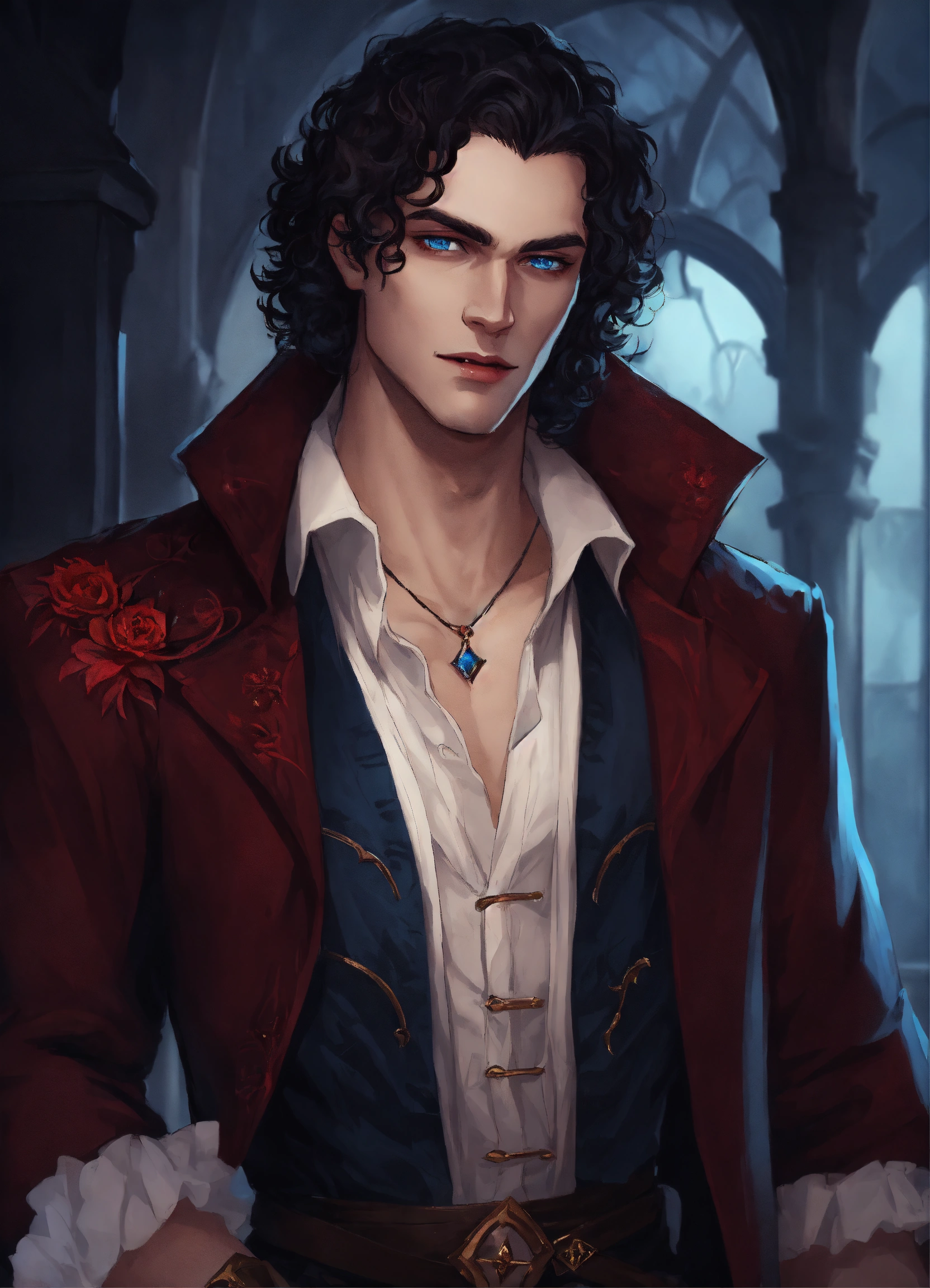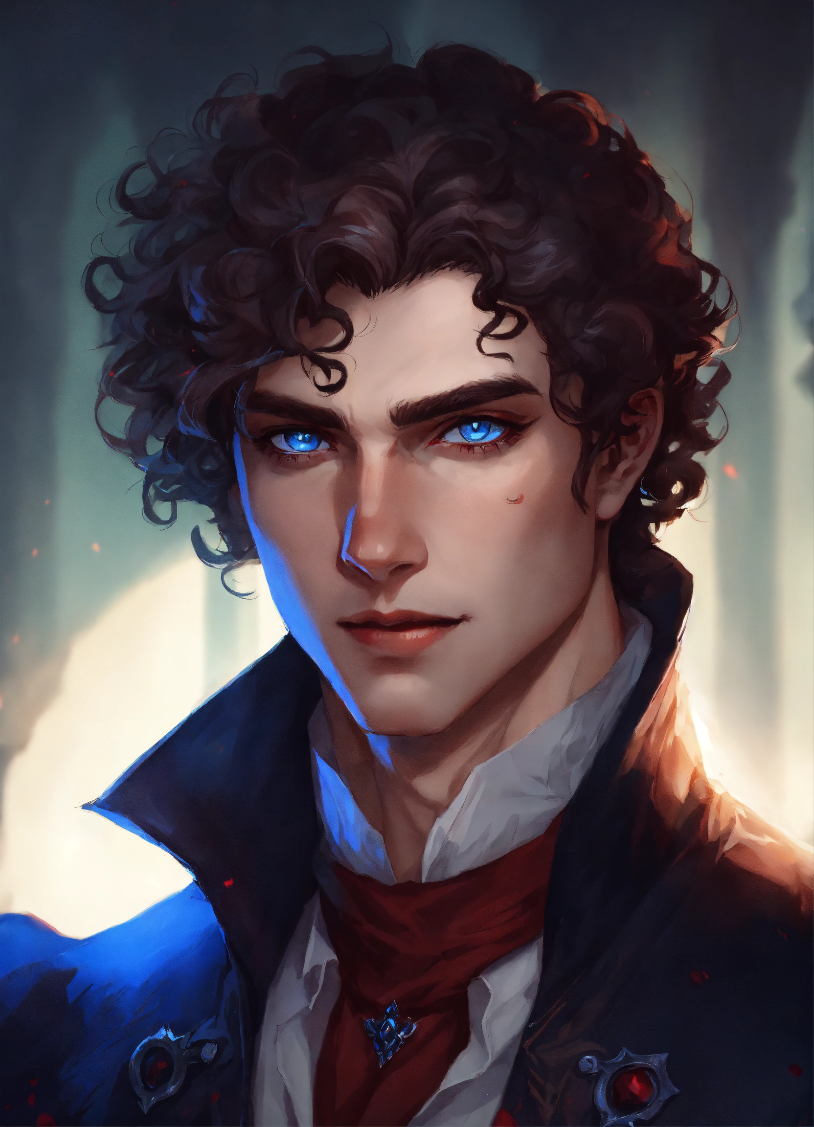 A handsome vampire man with dark curly hair and blue eyes dnd character art