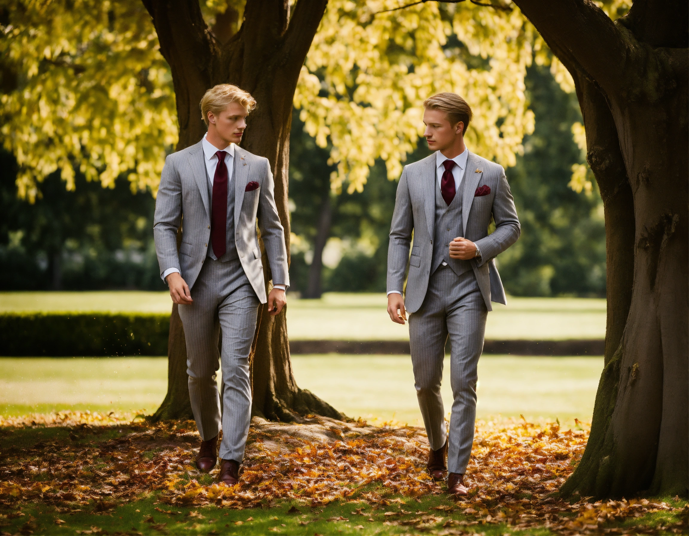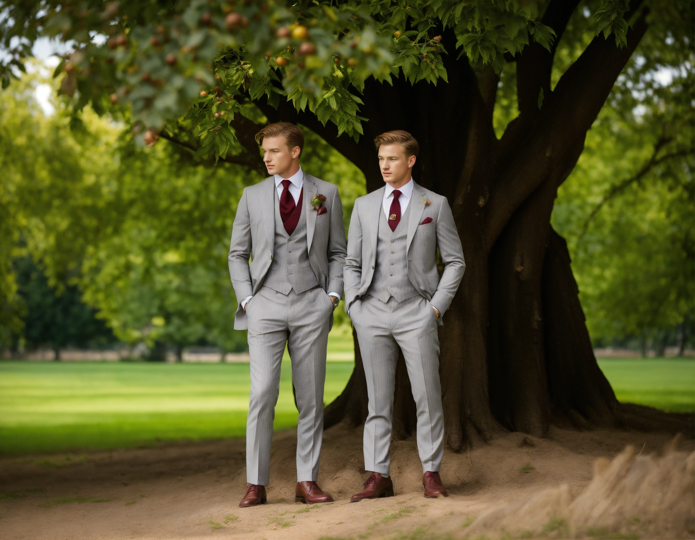 Two young blonde gentlemen in light grey pinstripe vested suit, burgundy club tie, hiding from each other under a chestnut tree