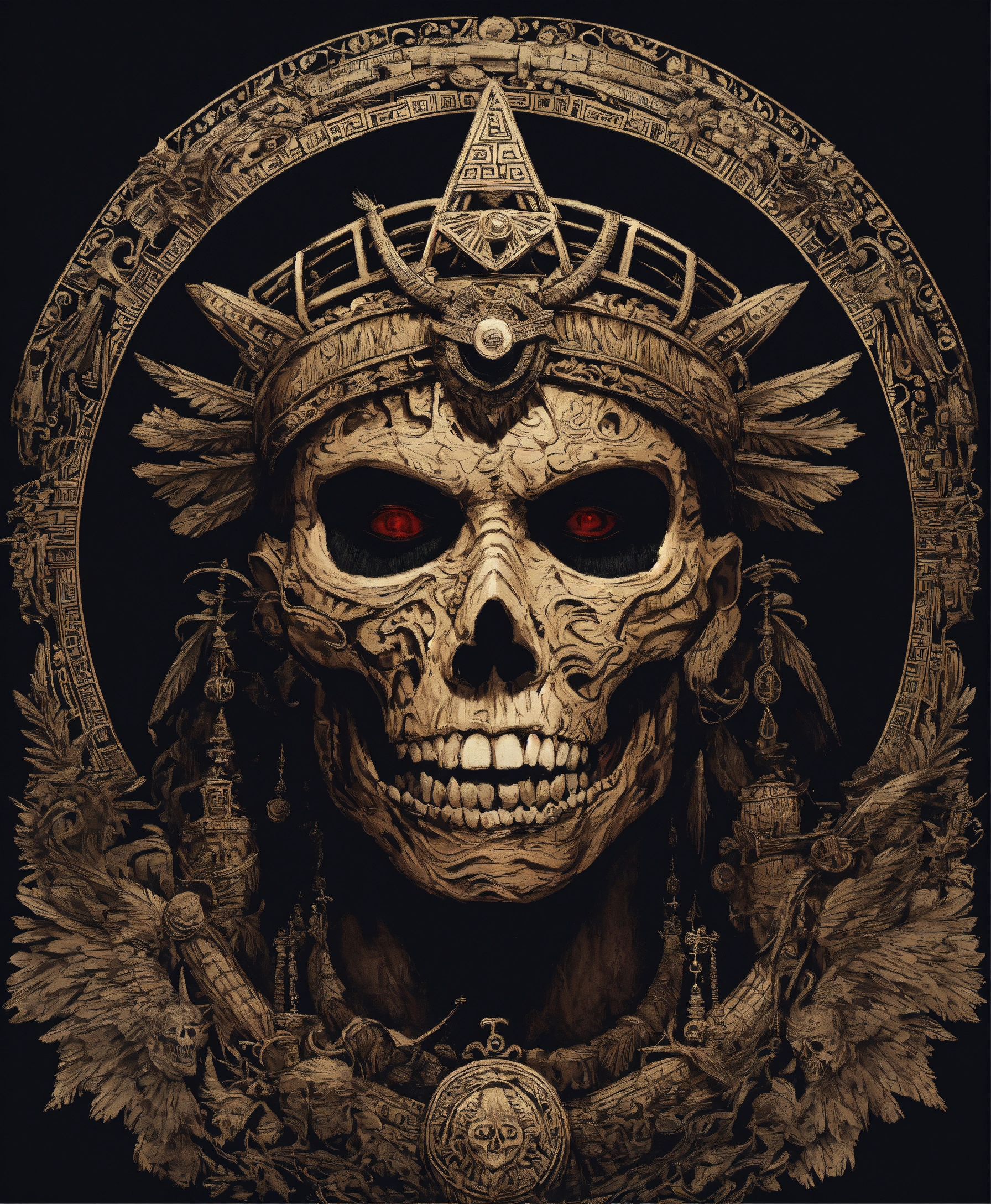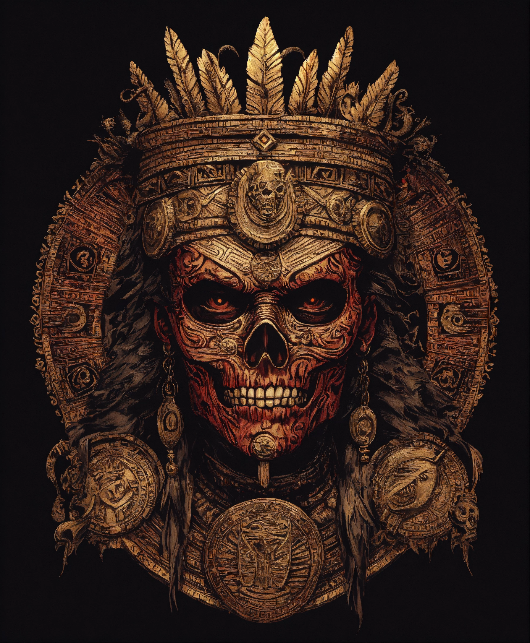 Satanic symbols, angry azteca mummy zombie face, crown, crow, strange, creepy, scary, thriller, fear, highly detailed, tshirt design, black background