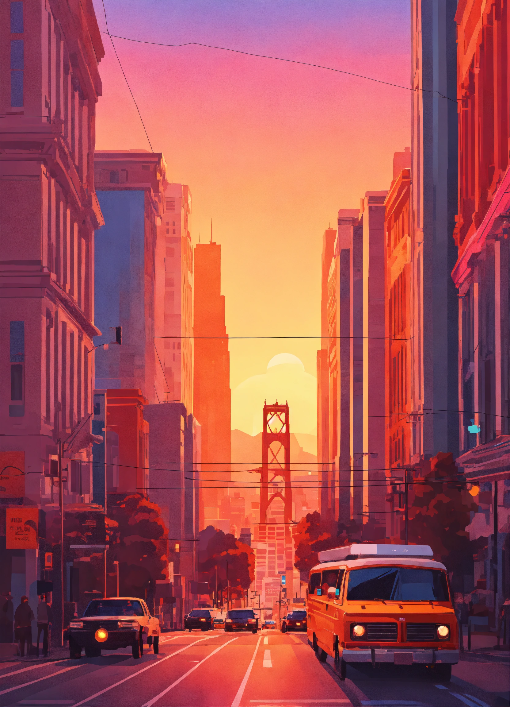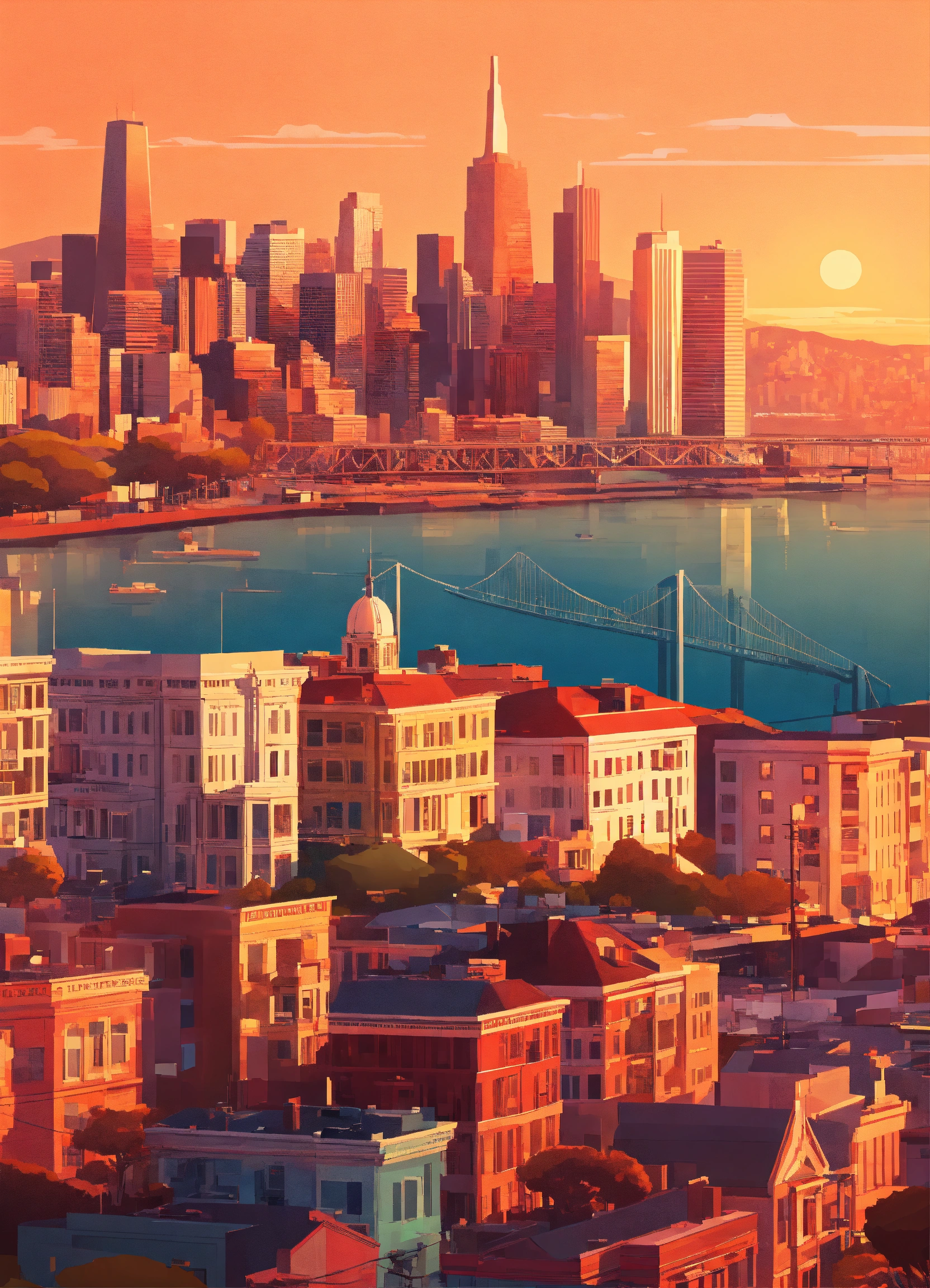 San francisco downtown, sunset, flat design poster, not too complex, modern, 4k, epic composition, flat vector art illustration, very realistic, vibrant colours, long shot