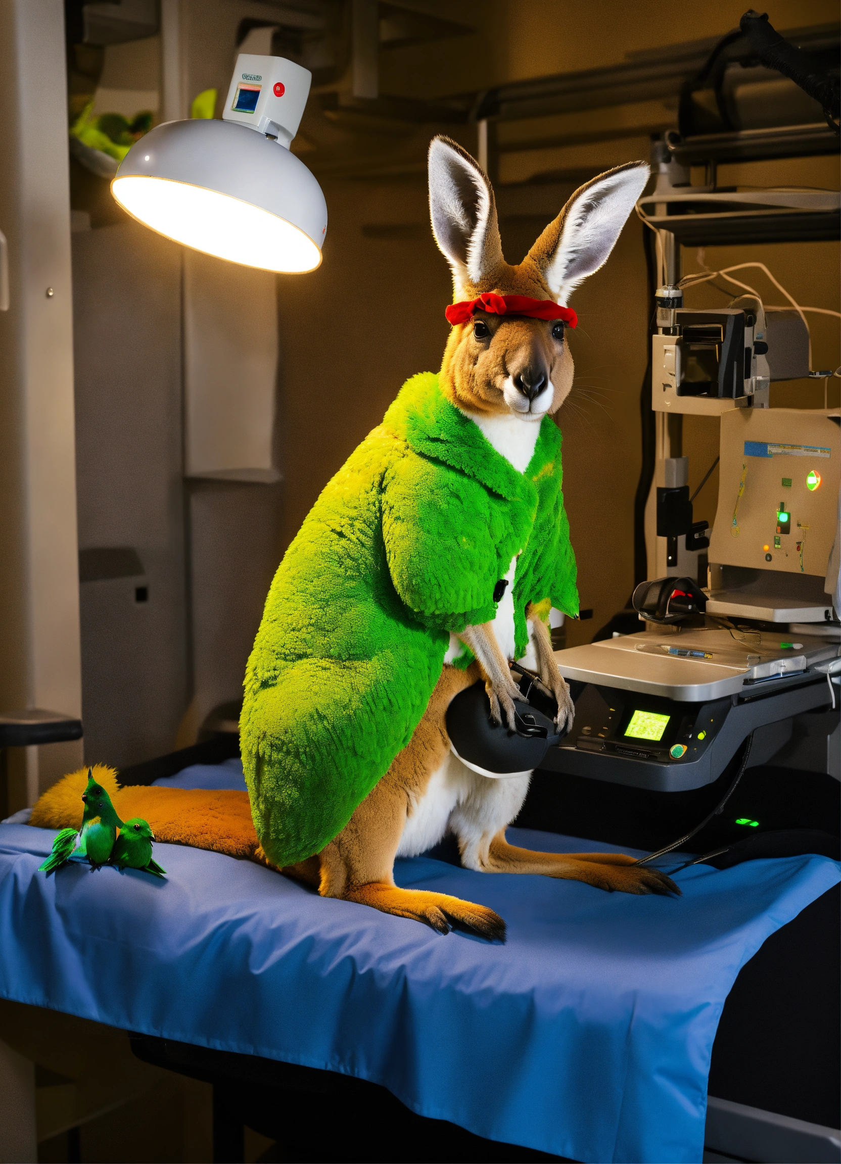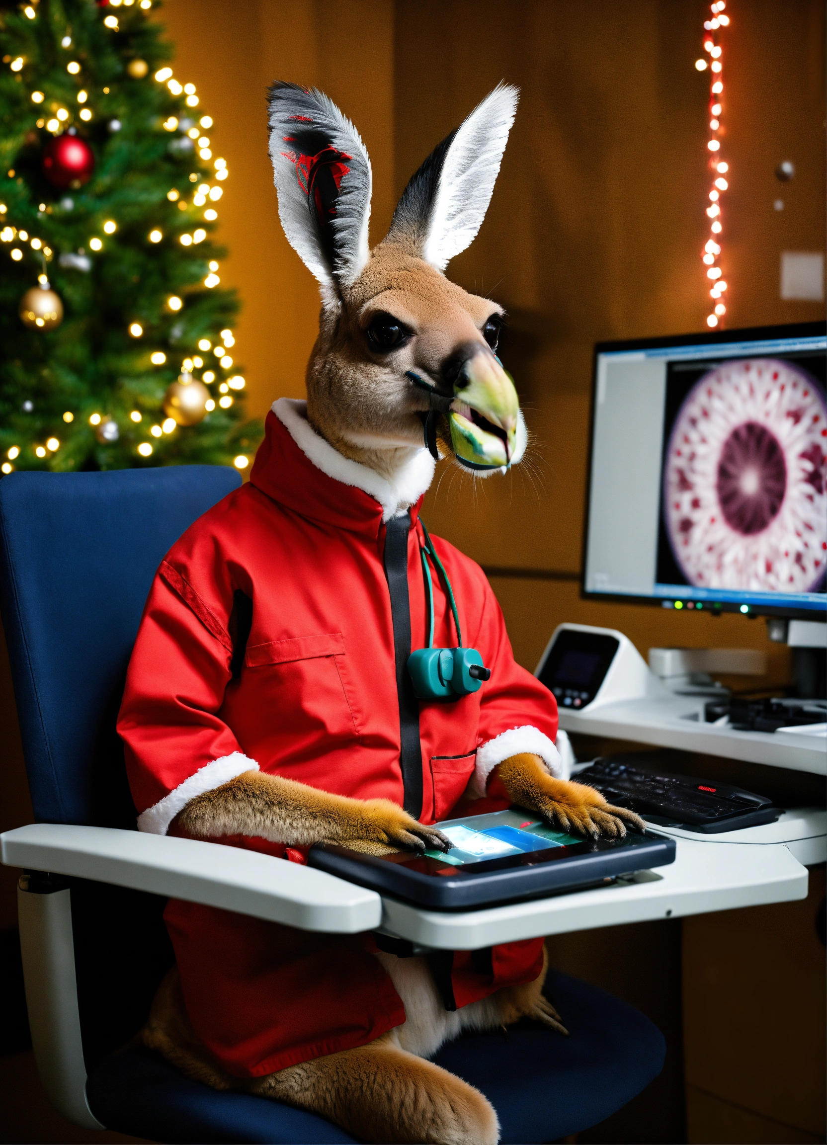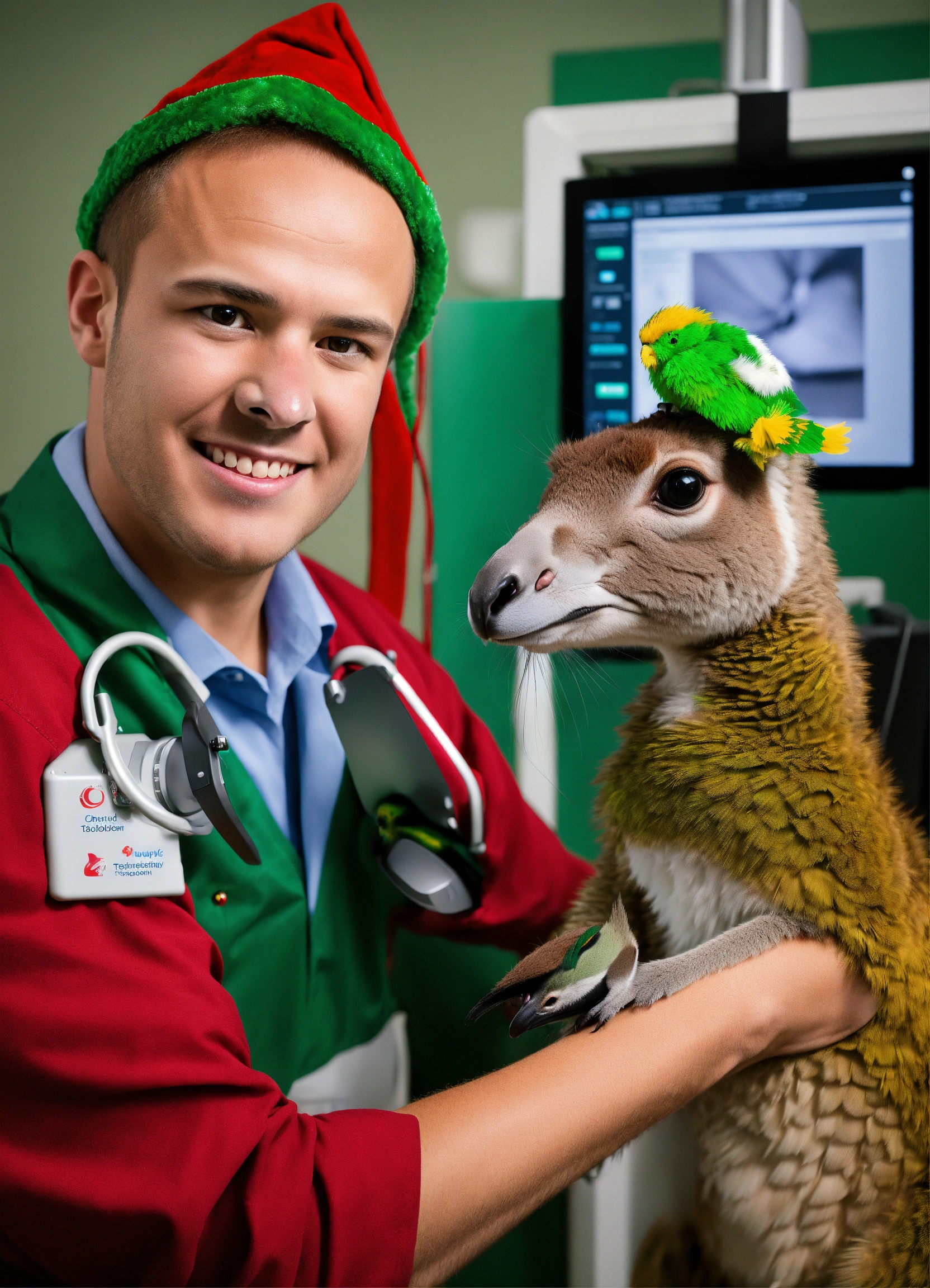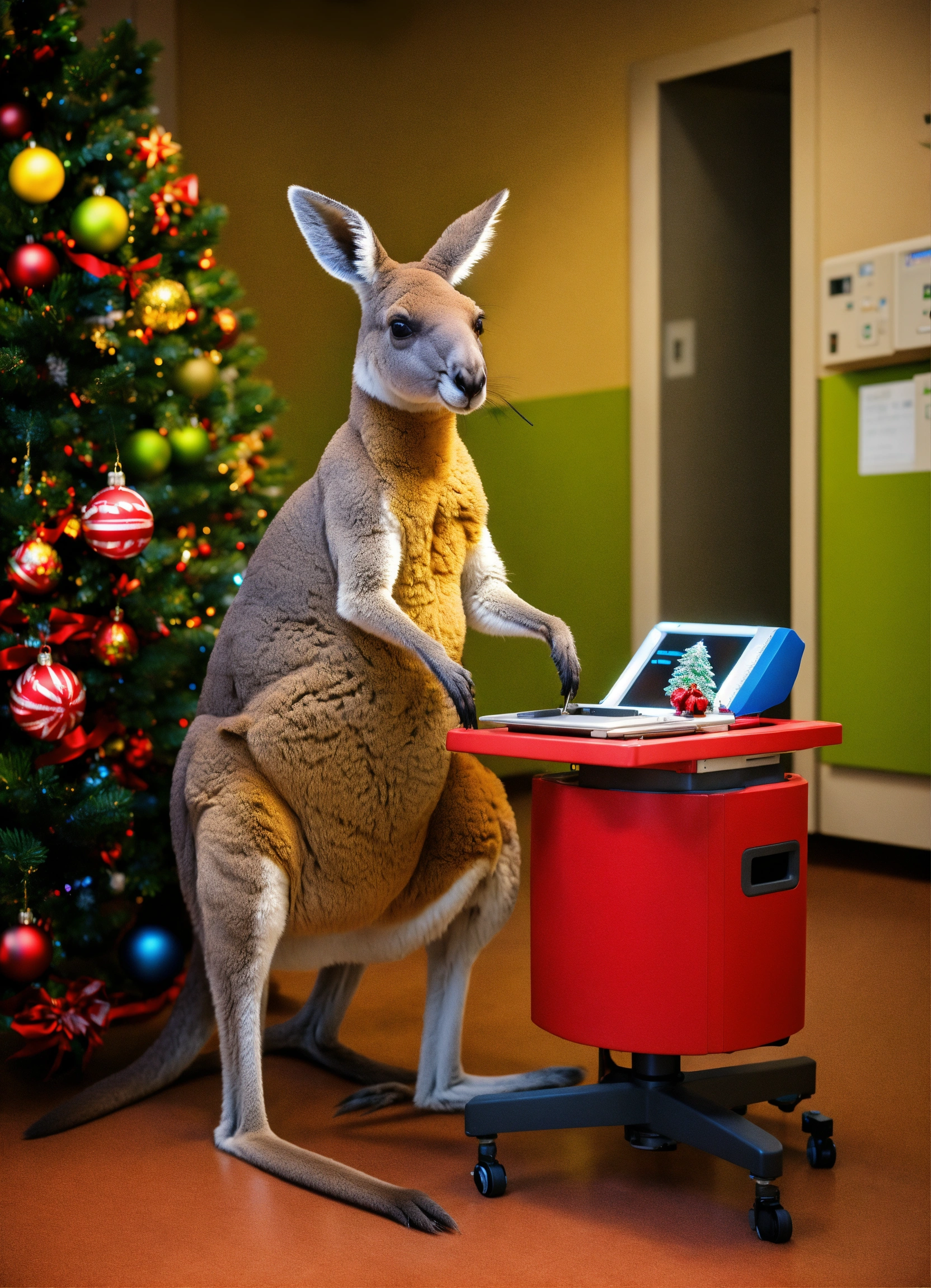 Phot realistic kangaroo employed as a ct technologist with a ct scanner dressed for xmas with his kiwi (bird) work friend