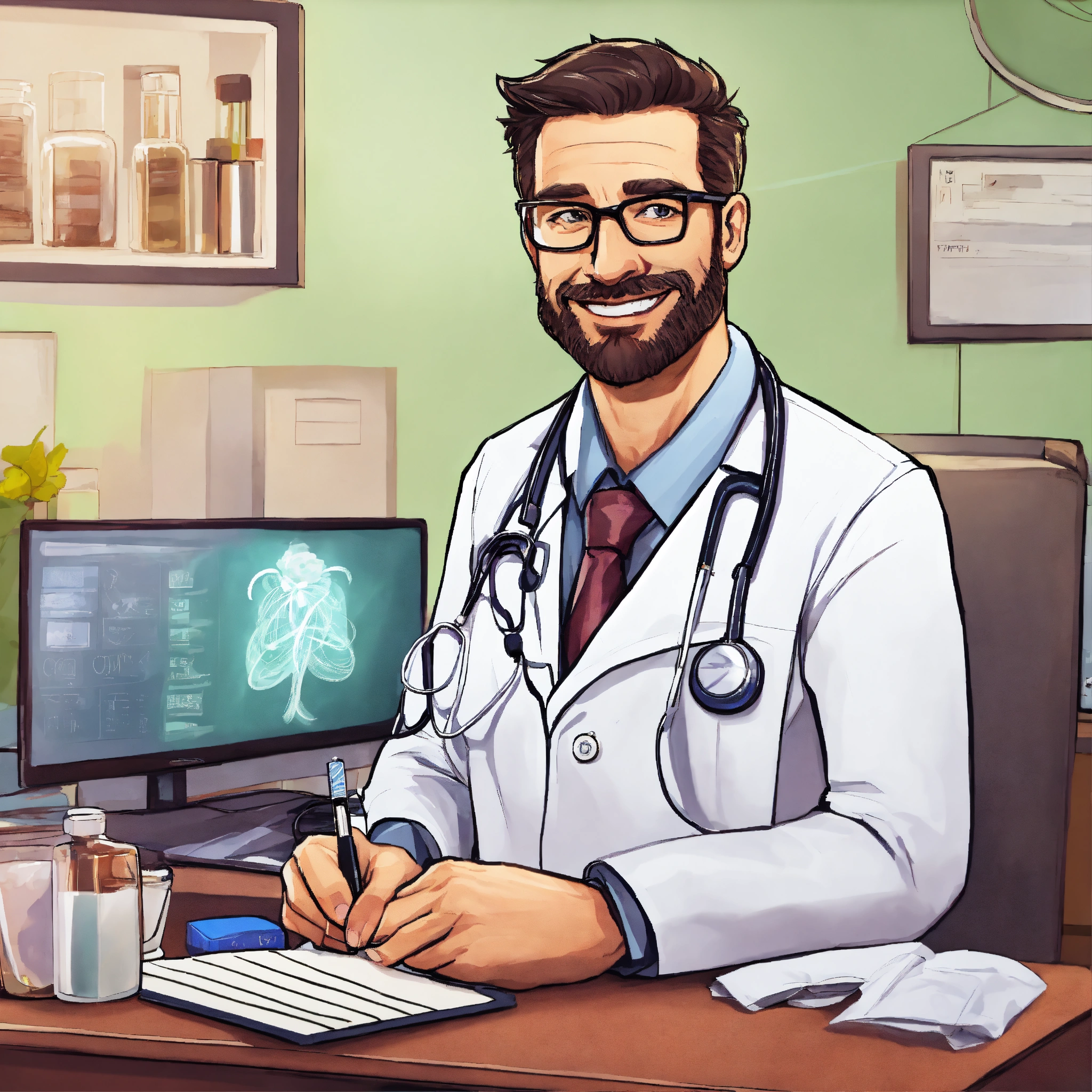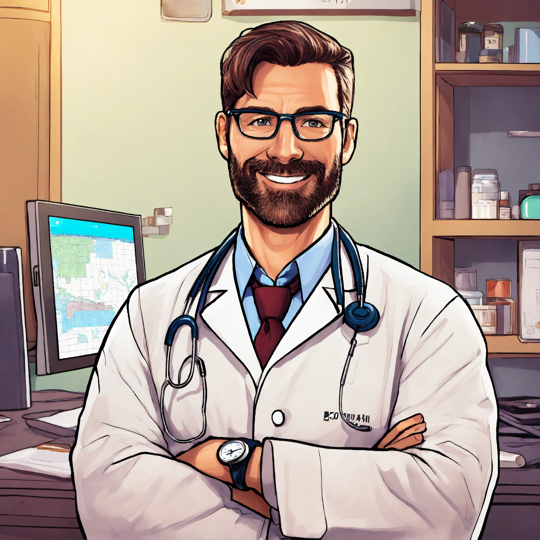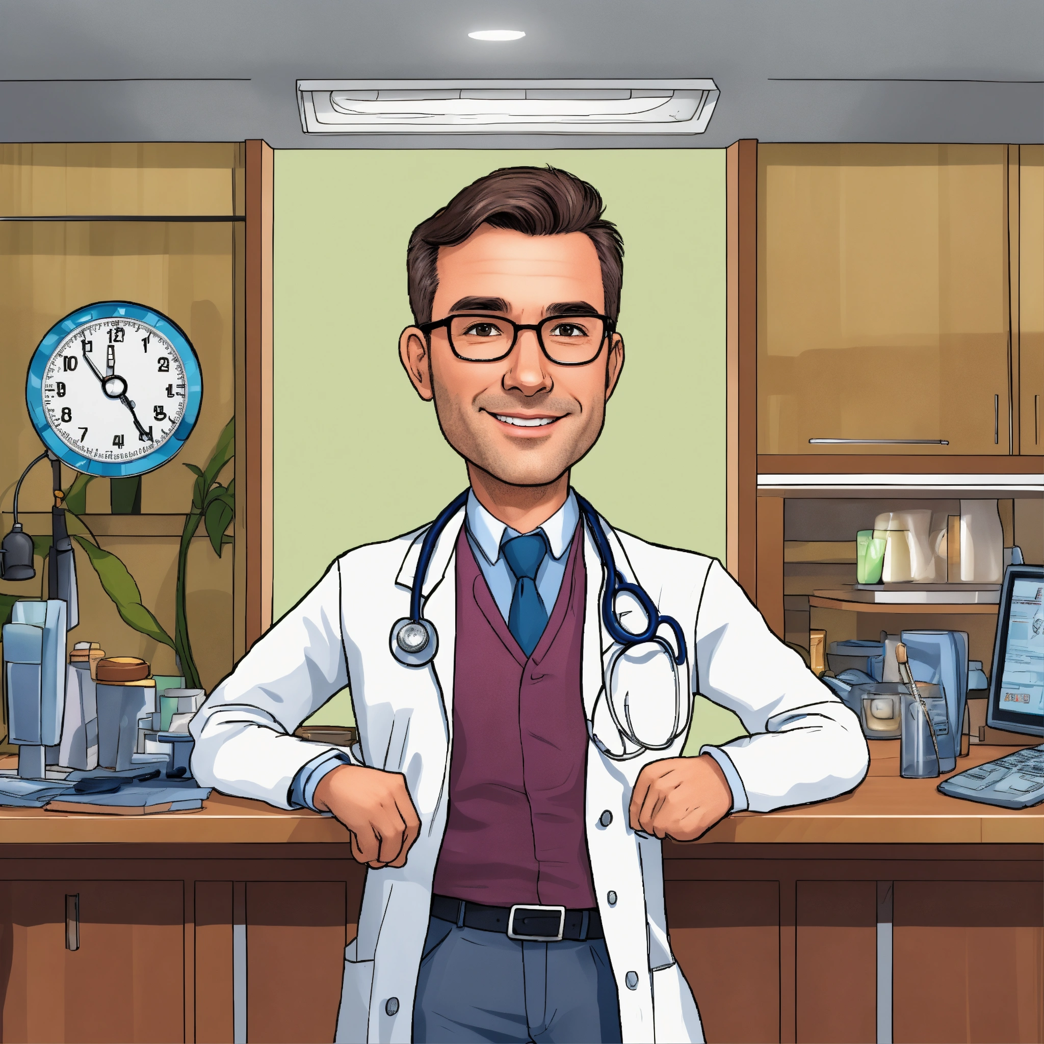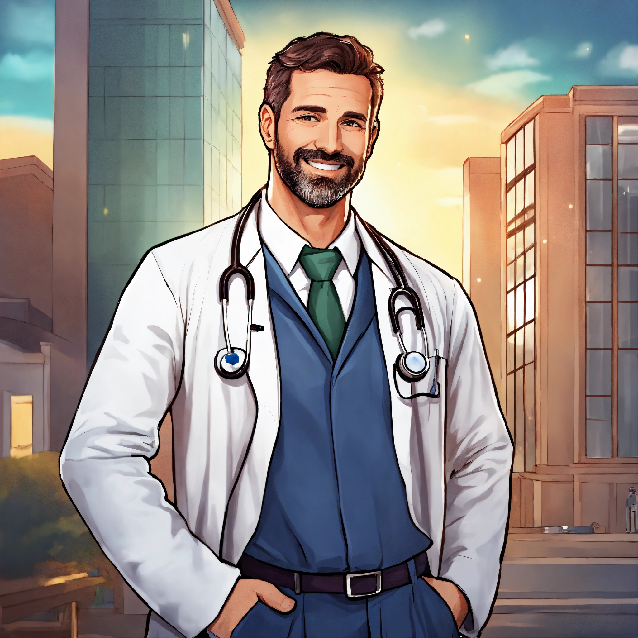 Make a cartoon of a handsome 40 years old doctor