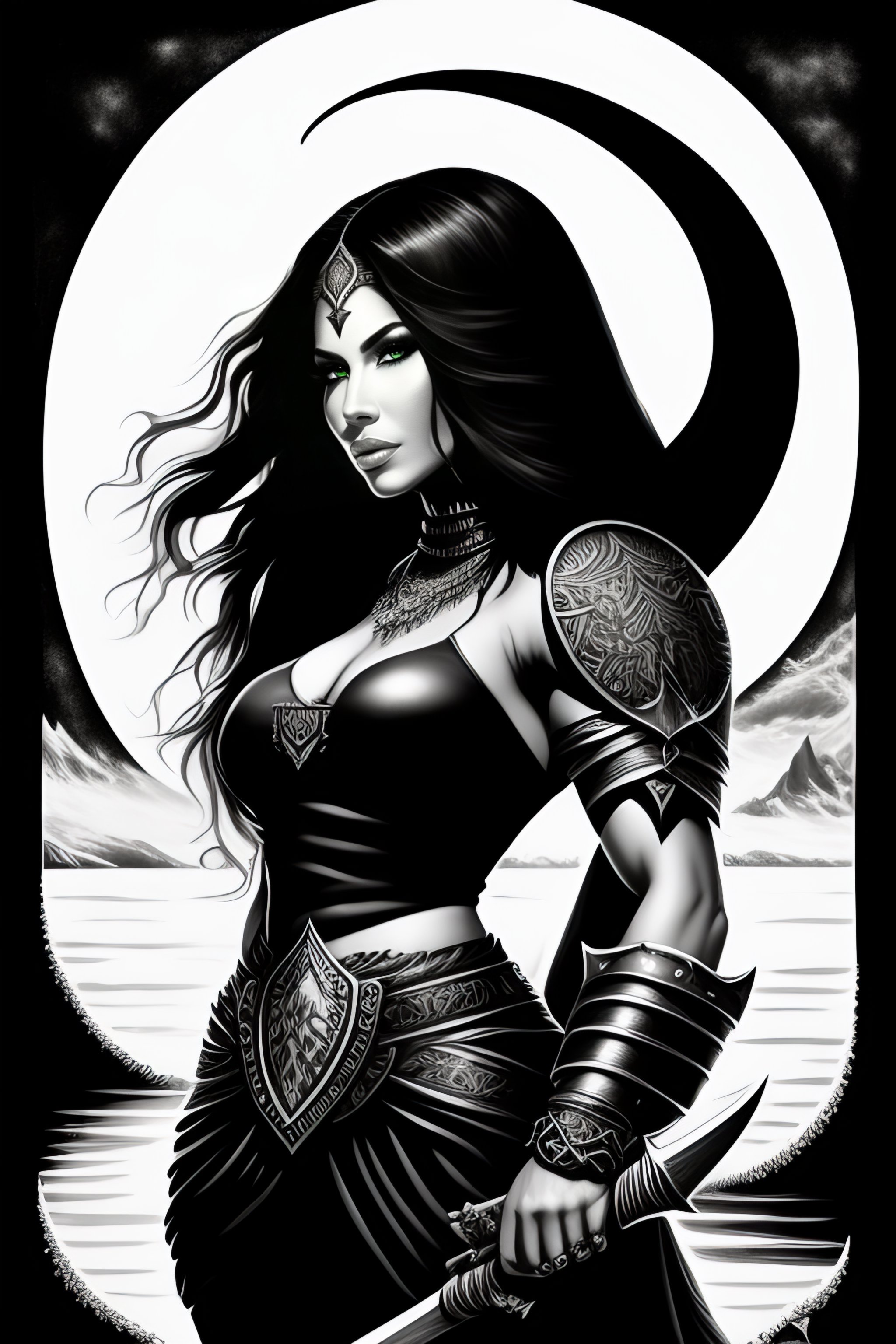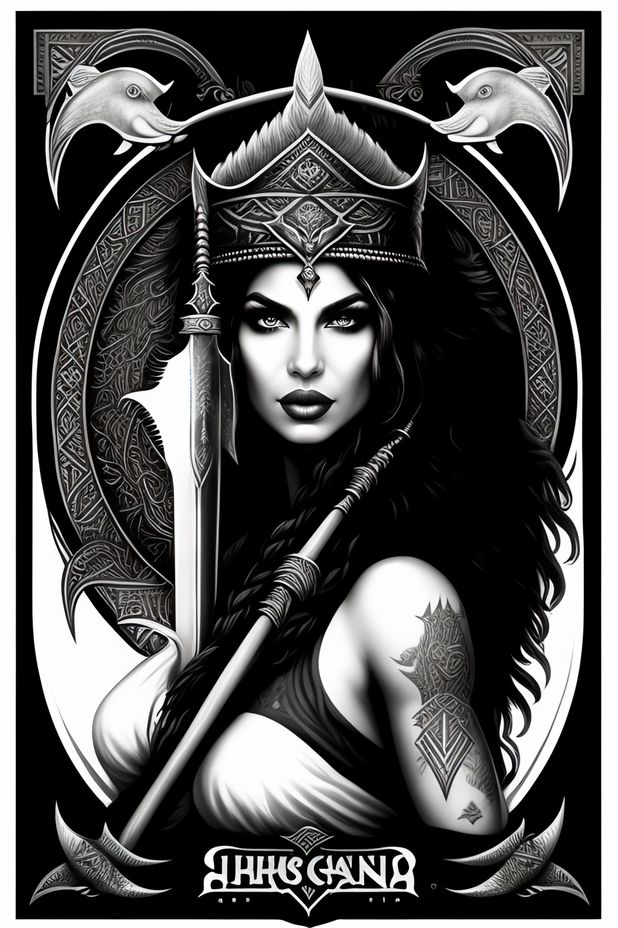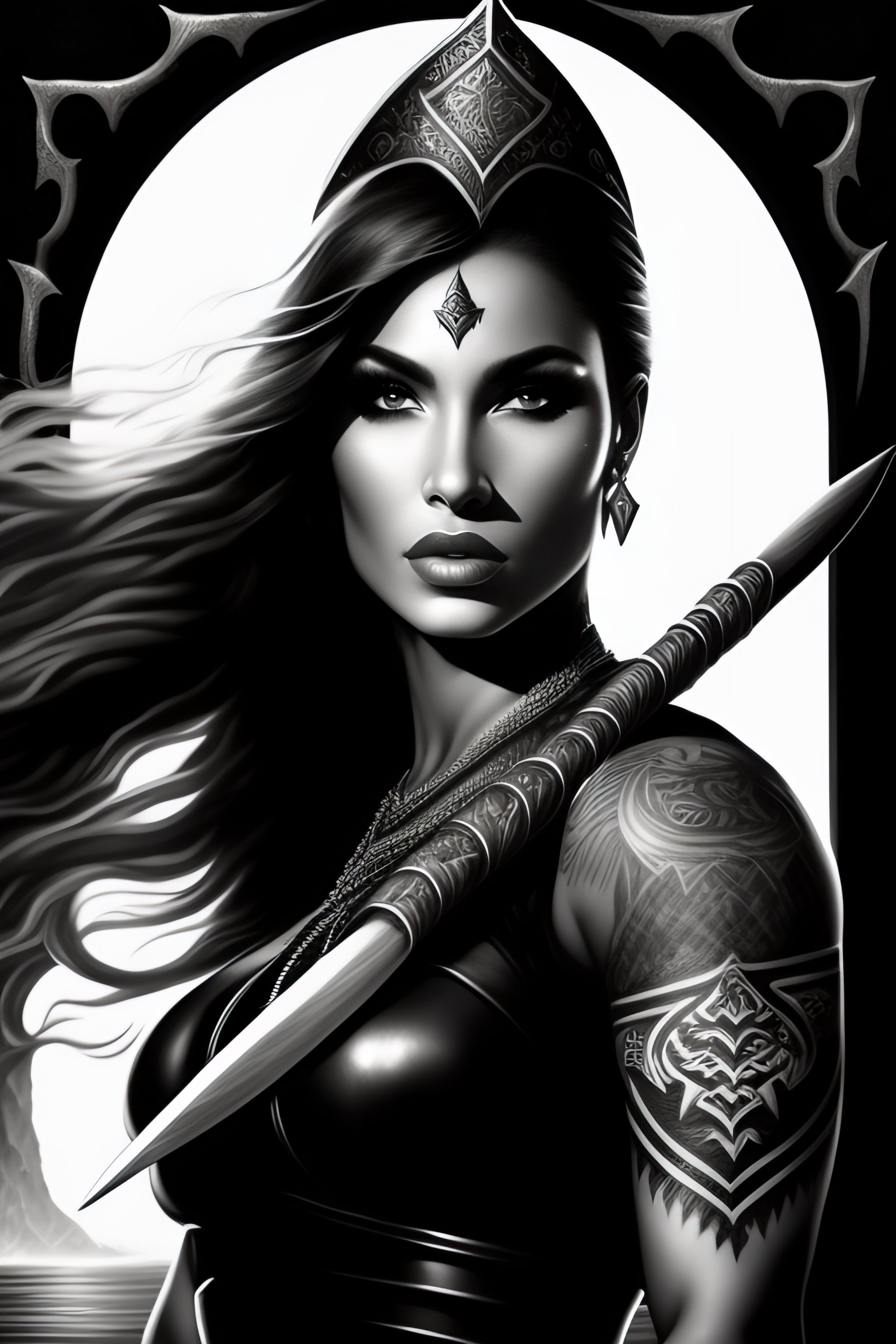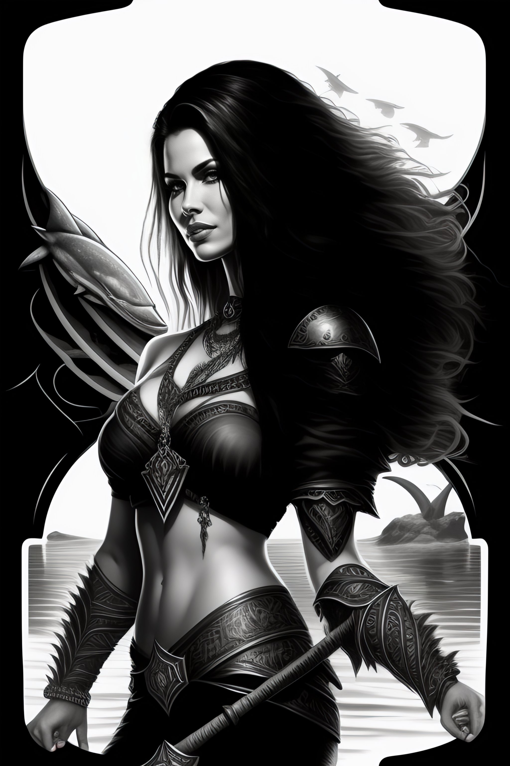 A black and white drawing of a woman holding a spear, a tattoo, inspired by chris rahn, sumatraism, sharks surfacing from the lake, heavy metal tshirt design, key is on the center of image, league of legends character, shark teeth, merged, epic beard, loosely cropped, hybrid human/tank
